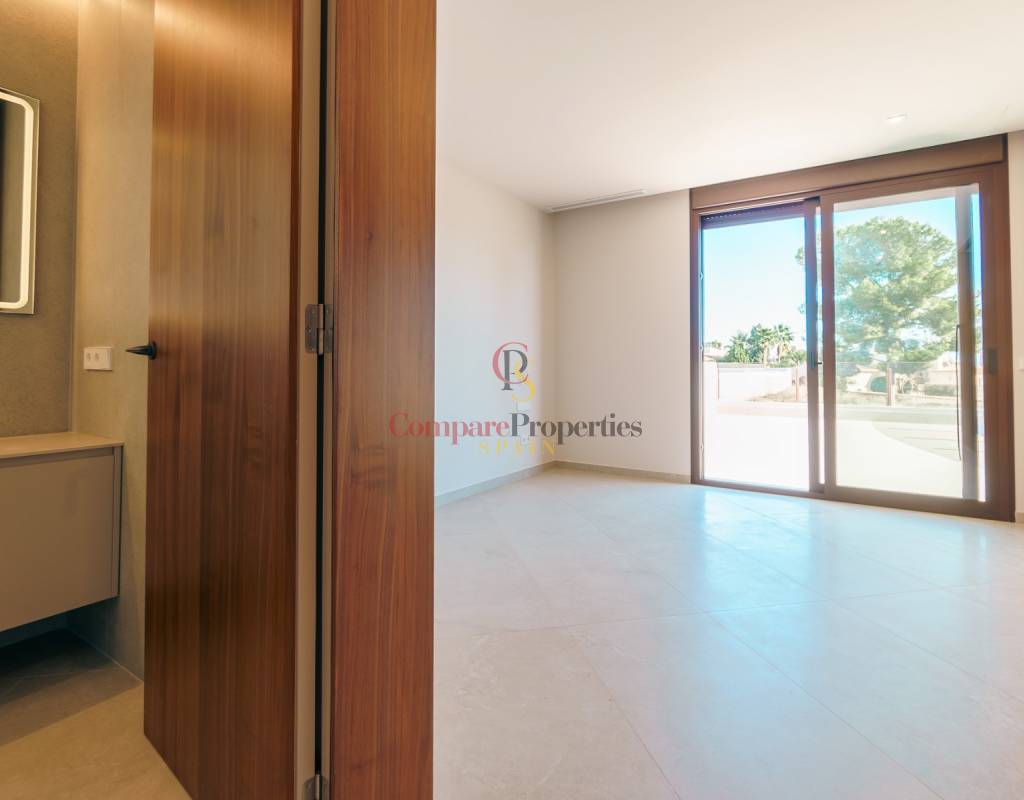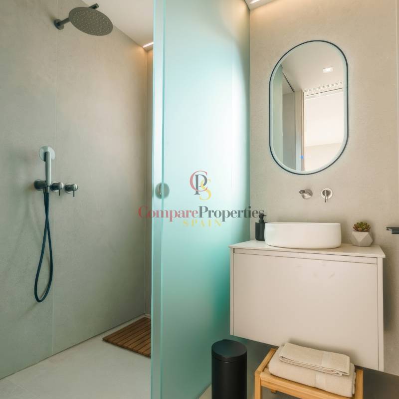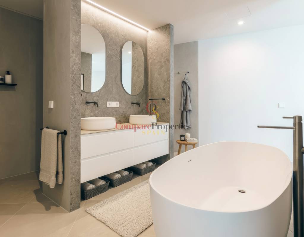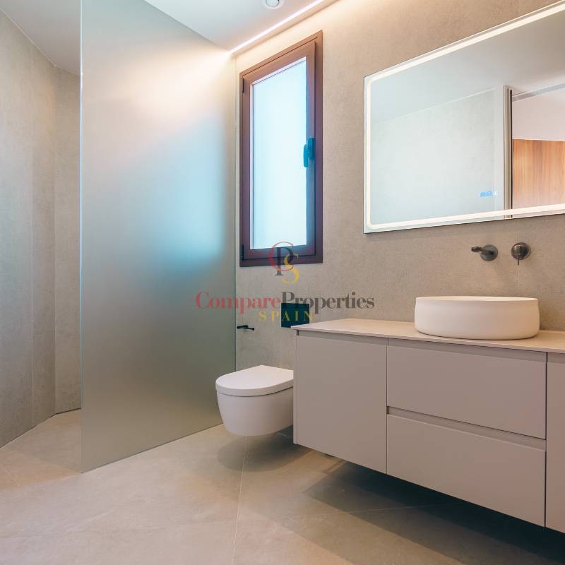 La maison dispose de 5 chambres en suite et de 6 salles de bain, avec des matériaux tons pierre, un éclairage d’ambiance et des douches à l’italienne. La suite principale comprend une baignoire indépendante et un double lavabo.