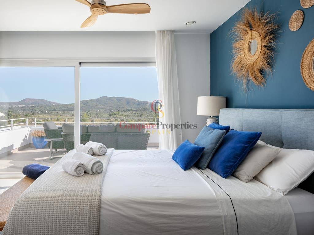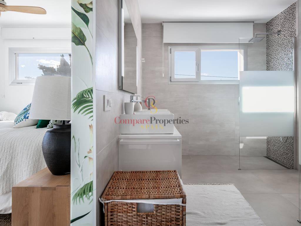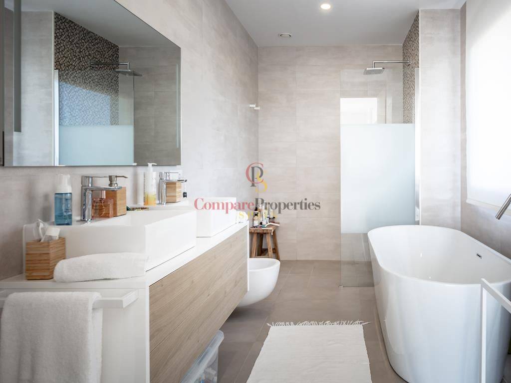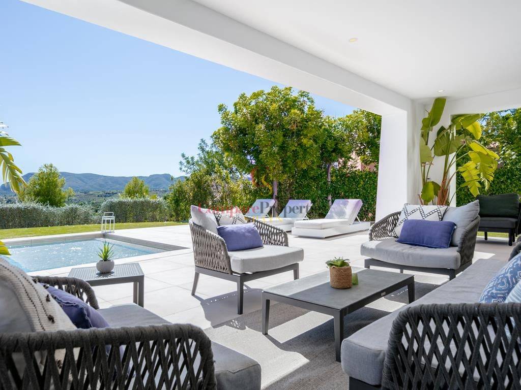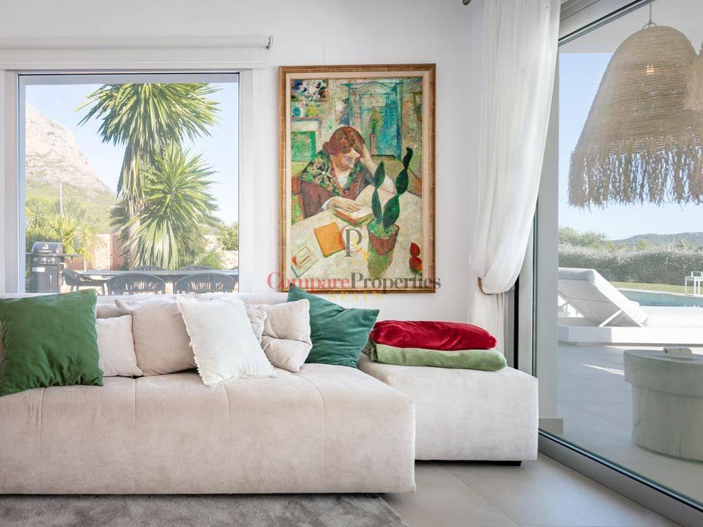 Villa moderne à Jávea, dans le secteur du Montgó, construite en 2019 sur une parcelle de 1 511 m². Cette villa de standing de 327 m², dont la décoration a été réalisée par la renommée Jessica Bataille, s\'organise sur deux niveaux. Au rez-de-chaussée se trouvent un salon-salle à manger, une cuisine ouverte avec un espace buanderie, une chambre avec salle de bain en suite et des toilettes. À l\'étage, trois chambres avec salles de bain en suite donnent accès à une vaste terrasse avec un espace lounge pour profiter des belles vues sur la vallée, exposée au sud.