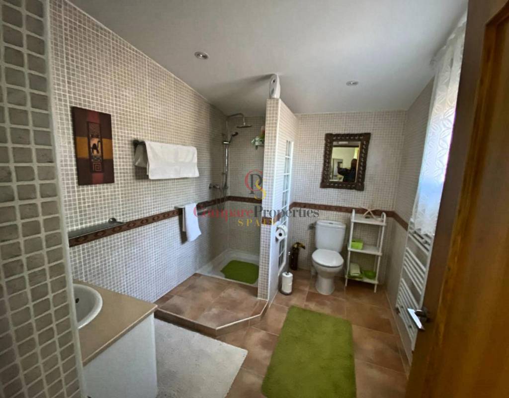 Aan de linker zijde van het huis bevinden de drie ruim bemeten slaapkamers, twee met badkamer en-suite, en een badkamer voor gasten. Het huis beschikt over centrale verwarming en airconditioning. Tevens een groot dakterras met een prachtig uitzicht over de schitterende omgeving.
