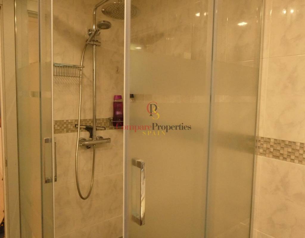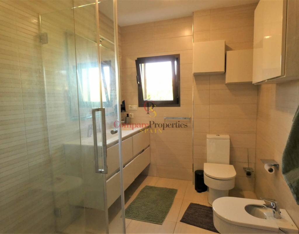 Op de 1e verdieping zijn nog 3 slaapkamers, waarbij de hoofd slaapkamer een separate ruimte biedt voor een babykamer of kleding ruimte. Er bevindt zich nog een badkamer en een ruim balkonterras waarvan met prachtig zeezicht heeft en uitzicht op de Peñon de Ifach.