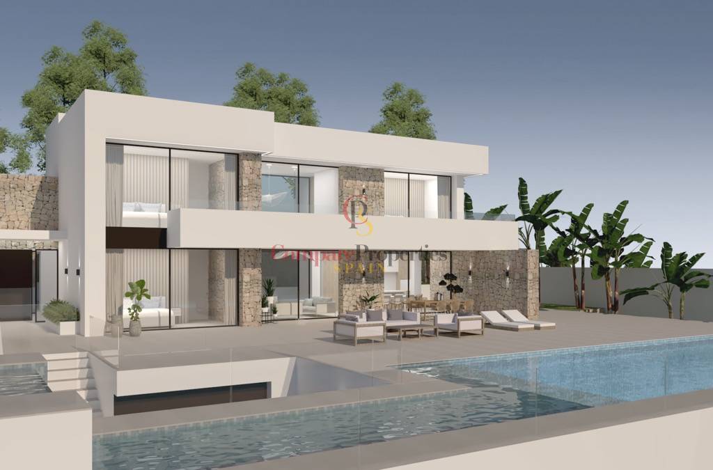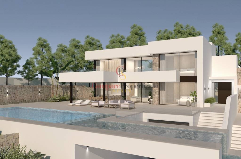 Rechtstreeks van de bouwer, 14 16 maanden voor de bouw na de bouwvergunning. Nieuw gebouwde moderne design luxe villa met uitzicht op de bergen te koop in Moraira. Villa gebouwd op een perceel van 1.500 m², verdeeld over 3 verdiepingen, met 1020 m² gebouwd, verdeeld in 4 slaapkamers met badkamer en suite, 4 badkamers, 1 toilet, volledig uitgeruste open keuken, open woonkamer met dubbele hoogte met directe toegang tot het terras met en zwembad.