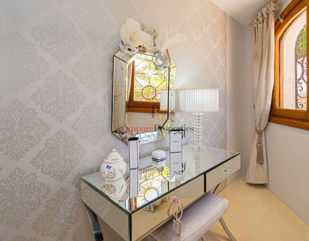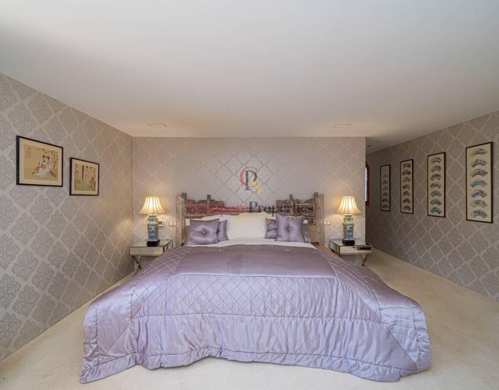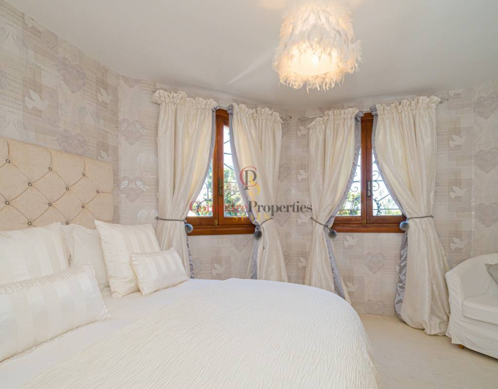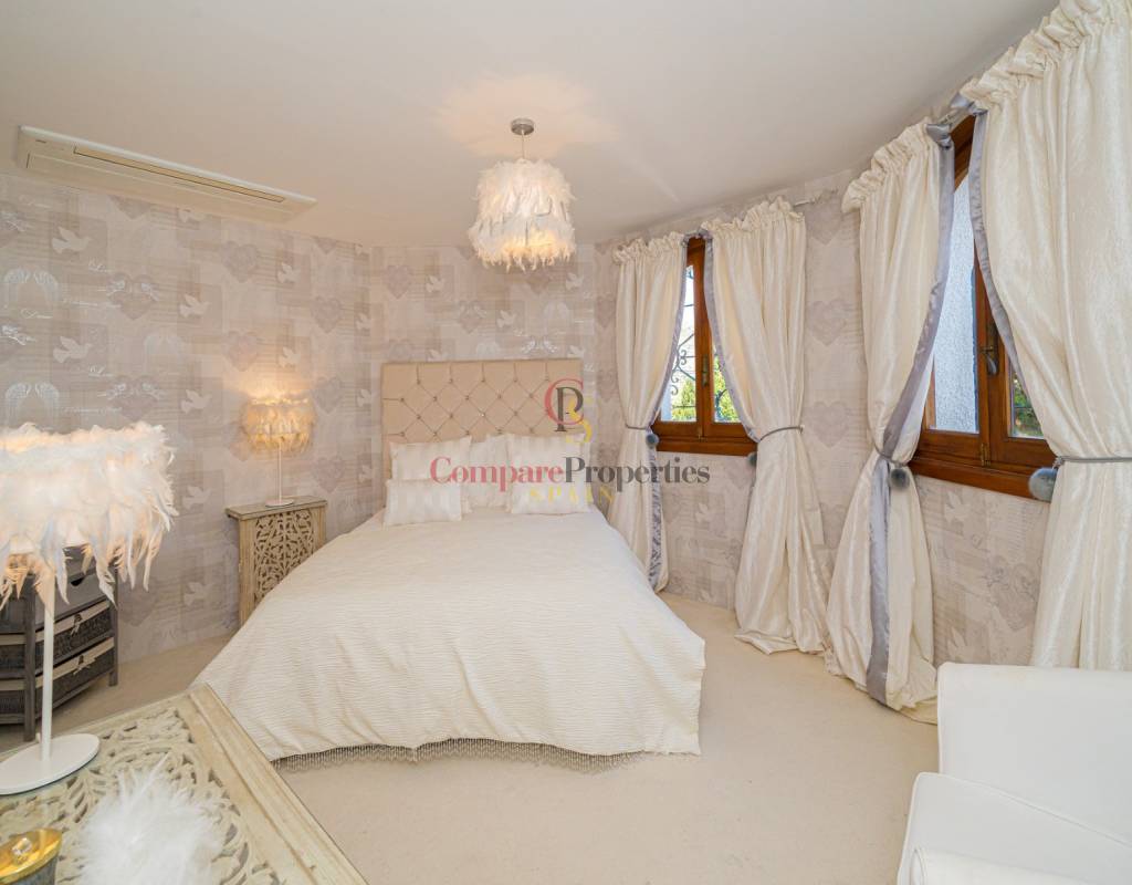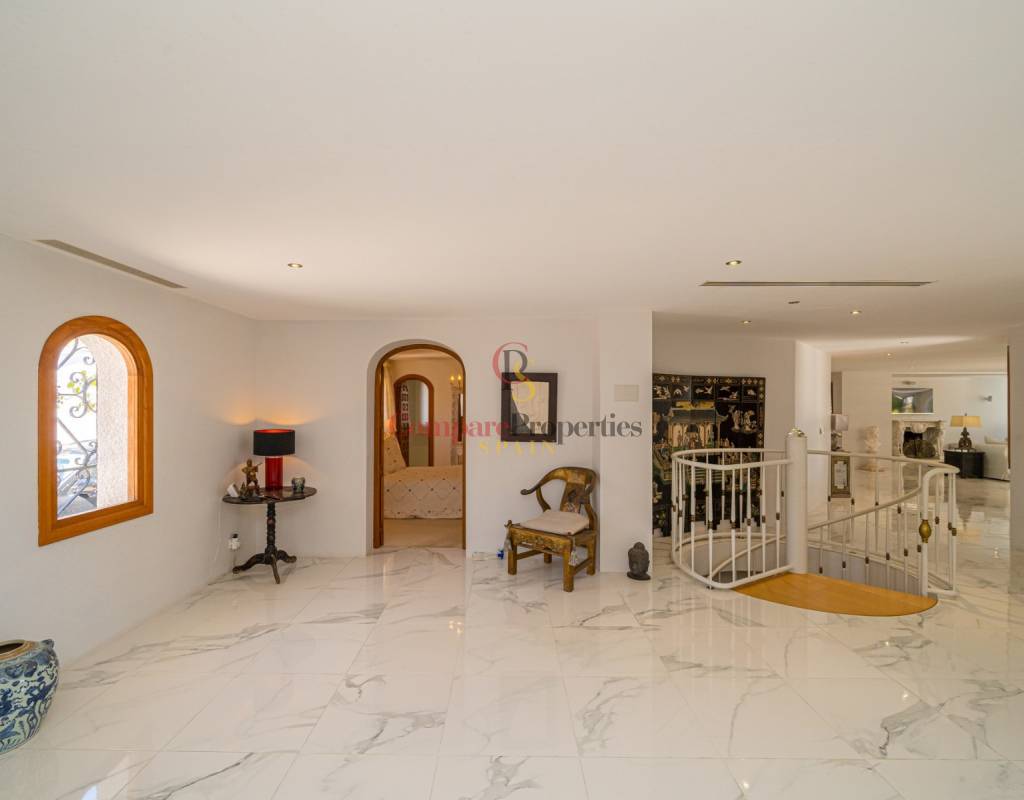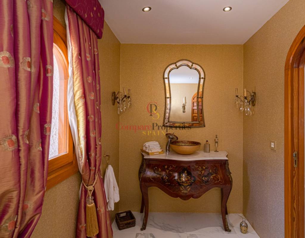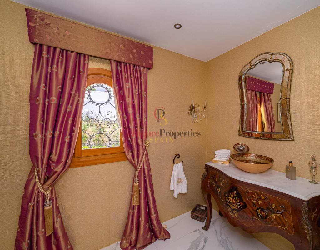 Deze prachtige villa ligt in een rustige woonstraat op slechts een klein eindje rijden van het prachtige strand van El Portet en het stadscentrum en de jachthaven van Moraira. De villa ligt op een groot perceel en is verdeeld over twee ruime niveaus.Vanaf het moment dat je de villa binnenkomt door de antieke voordeuren word je meegenomen op een interieurreis met themakamers, prachtige kleuren, zorgvuldig gekozen meubels en in het algemeen een flair die alleen door een select groepje mensen kan worden gecreëerd.Je komt binnen in een vorstelijke entree met een vleugelpiano en een groot gewelfd raam met uitzicht over het zwembad en de zee, de grootte van deze kamer wordt geaccentueerd door het gebruik van witte marmeren tegels in de hele woonkamer.Aan de rechterkant is het gastentoilet dat is ingericht in Franse stijl met een sierlijke wastafel.In de uiterst rechtse hoek van de entree is de master bedroom vleugel, die bestaat uit een grote kleedkamer met een prachtige spiegel afwerking kaptafel en sierlijke spiegel, verder naar beneden in deze prive-gang is de prachtige, ruime master badkamer met een grote walk-in douche, een verklaring sierlijke Italiaanse marmeren slipper bad, een super moderne wastafel en een grote exotische spiegel. Aan het einde van de gang is de grote slaapkamer, een weelderige kamer met veel ruimte, een luxe bed, een televisie/zithoek en een deur die leidt naar het zwembadterras.Terug naar de linkerkant van de entree vind je slaapkamer 2, deze mooie kamer straalt comfort uit en is gehuld in wit en beige met verweerd geschilderd meubilair. De en-suite badkamer heeft een modern badmeubel en een grote inloopdouche met zwarte bak en tegels achter de douchetoren. Het woongedeelte loopt van de entree over in een groot woon-eetgedeelte, eerst is er een hoge tafel met krukken die perfect bij de ingang van de keuken staan, zodat je kunt socializen met de chef-kok van de avond terwijl je geniet van een glas van je favoriete drankje en van het uitzicht op zee, allemaal tegelijk. De keuken is prachtig, witte kasten gemengd met witte deurpanelen en witte Silestone werkbladen, de apparatuur is van Bosch, een genot voor koks, en inclusief een koffiezetapparaat. De keuken is afgewerkt met glazen mozaïektegels en een prachtige spiegel. Net buiten de keuken is een muur bijna gevuld met een dramatische spiegel. De ontspannende loungeruimte is gecentreerd rond een prachtige marmeren open haard. Aan het einde van de kamer is de grote eethoek die baadt in het licht en gewelfde ramen heeft die uitkijken over de vallei naar de zee bij El Portet en verder, hier vind je ook een deur die leidt naar het terras bij het zwembad.Het gastengedeelte beneden is toegankelijk via een wenteltrap vanaf de ingang boven of via een aparte deur vanuit de tuin. Hier vind je een zeer ruime woonkamer, met dezelfde marmeren tegels als op de bovenverdieping, gedomineerd door een opvallende abstracte muurschildering van een leeuw. Aan het eind van de woonkamer is er een deur naar een grote open naya met uitzicht op zee. Naast de woonkamer is een ruim kantoor dat indien nodig ook als slaapkamer 6 kan worden gebruikt. De eerste tweepersoonsslaapkamer is ingericht met zachte tinten en heeft een kleedkamer en een eigen badkamer met douche en wastafel. Op het einde van een korte gang zijn er nog twee slaapkamers, de eerste is een mooie slaapkamer met twee aparte bedden met gordijnen die alle muren bedekken en een kaptafel met spiegels en door een deur met spiegels vind je een en-suite badkamer met douche en wastafel. De laatste slaapkamer is de grootste, met een prachtig hemelbed, spiegelkasten aan de voorkant en een prachtige en-suite badkamer met jacuzzi met een gespiegeld badpaneel en een modern badmeubel. Onderaan de wenteltrap is er een opvallende verhoogde vitrine.Het terras bij het zwembad ligt op hetzelfde niveau als de hoofdverdieping, aan 3 kanten omgeven door een sierlijke open naya, aan de vierde kant is een open zithoek en het uitzicht op zee. Verderop het terras vind je de wasruimte, een geweldige volledig ingerichte zomerkeuken en een open naya om overdekt te dineren, als je liever buiten eet is er ook een eetterras. Een paar treden lager vind je nog een schaduwrijke zithoek en een hot tub-terras met uitzicht op zee. Nog een paar treden verder kom je bij een natuurstenen gebouw waar je de wijnkelder vindt, natuurstenen vloeren en muren met cementeffect en sfeerverlichting vormen de perfecte omgeving voor de terracotta wijnrekken en natuurlijk een proeftafel. De rest van de tuin heeft volwassen planten en bomen, fruitbomen en palmen, een gazebo, een decoratief stenen terras en een droge rivierbedding compleet met brug en grote dierensculpturen.De omheinde ingang van de villa biedt parkeergelegenheid voor meerdere voertuigen en een dubbele garage met elektrische deuren en er is ook een voetgangerspoort aan de zijkant van de villa waar gasten of familie die beneden verblijven binnen kunnen komen zonder hun gastheren te storen.- Belangrijke punten:- Gebouwd 1978- Gerenoveerd door de huidige eigenaren 2018- Centrale airconditioning warm/koud in het hele huis- Warm water op zonne-energie- Alarm- Glasvezel internet en satelliet televisie beschikbaar- Marmeren tegels in het hele woongedeelte- Alle slaapkamers hebben vloerbedekking- Dubbele beglazing met luiken en muggenhorren- Jaarlijkse belastingen 3182€- Over de aankoop van sommige meubels kan worden onderhandeld met de eigenaren- Deze zeer speciale villa moet gezien worden om volledig tot zijn recht te komen, neem contact met ons op om je bezoek te regelen.- Helemaal onderaan deze woning is er een extra perceel dat ook te koop zal zijn.- Afstanden: - 2,2km naar het stadscentrum- 2,4 km van het strand en restaurants van El Portet- 5,7km naar een golfbaan- 9,5 km van de snelweg naar Benissa- 63 minuten rijden naar het vliegveld van Alicante- 80 minuten rijden naar vliegveld Valencia- Aarzel niet om contact met ons op te nemen voor meer informatie.