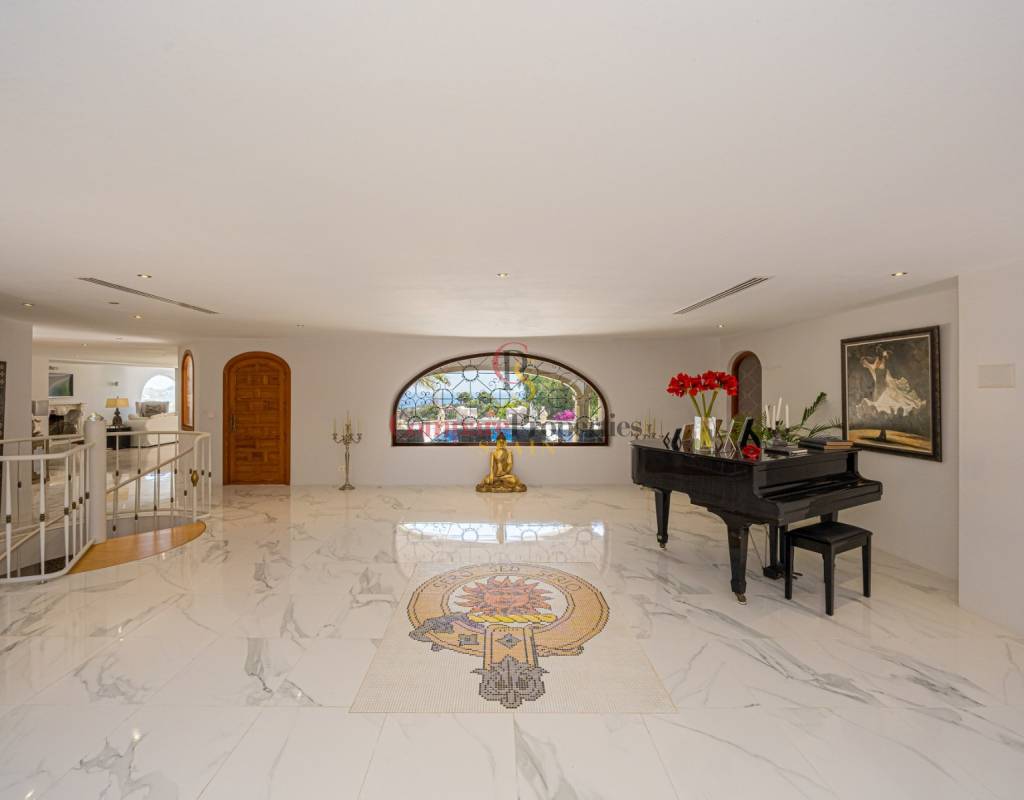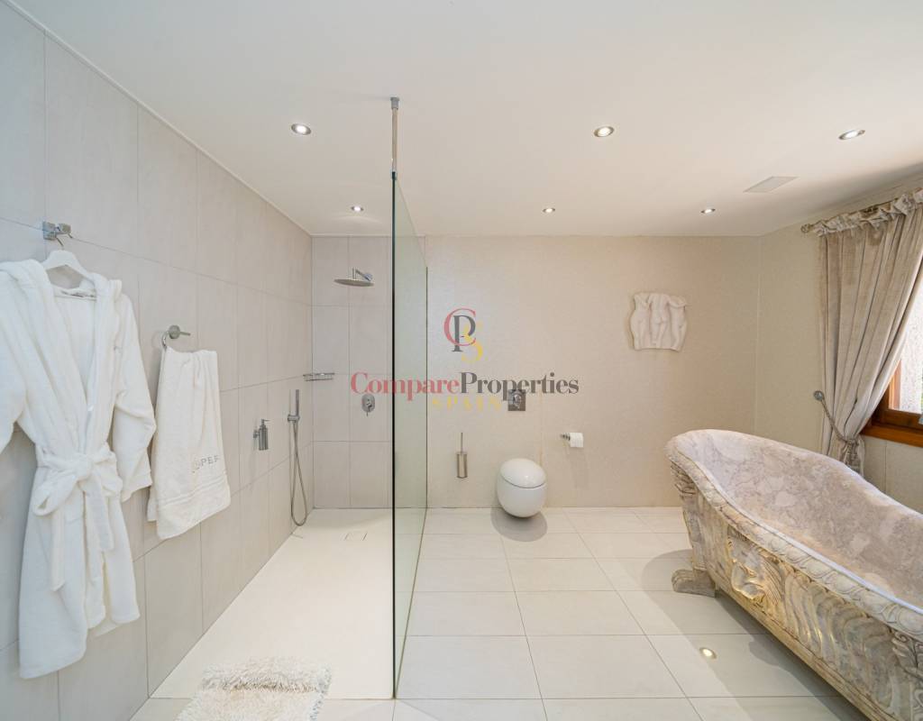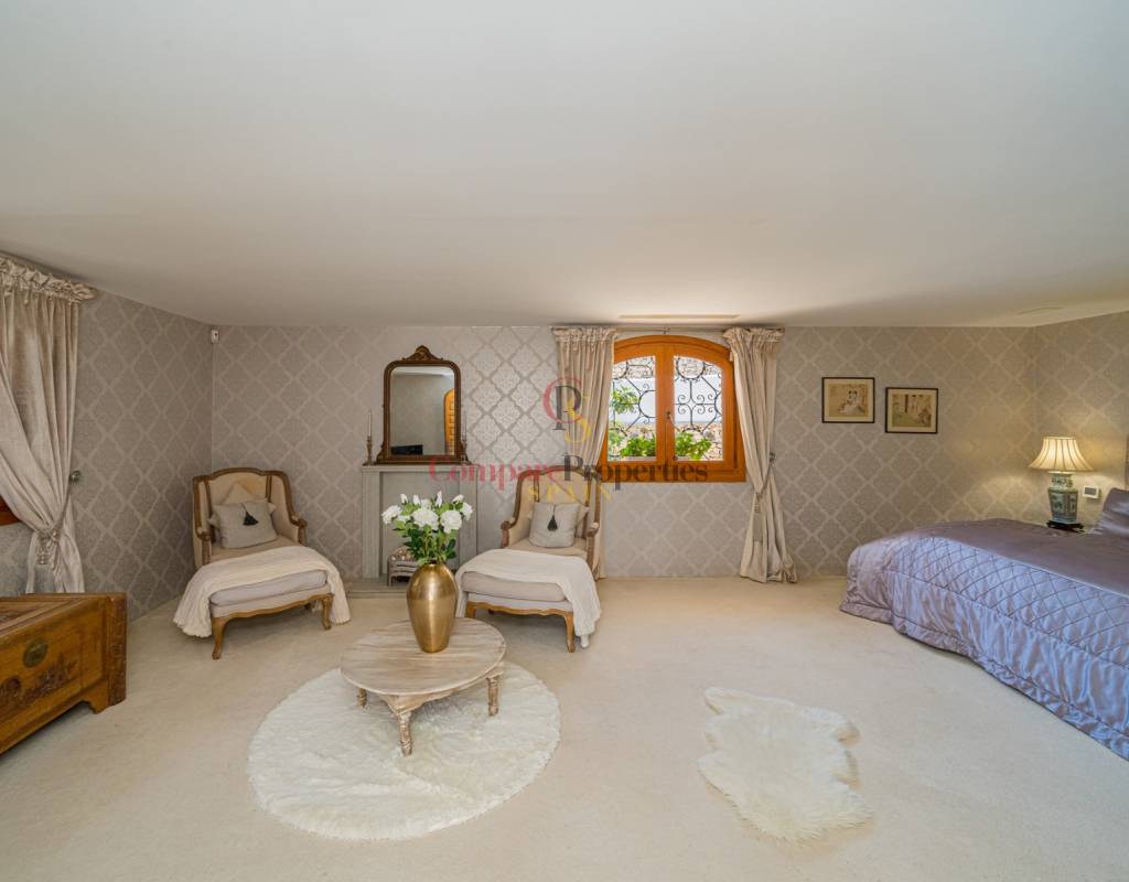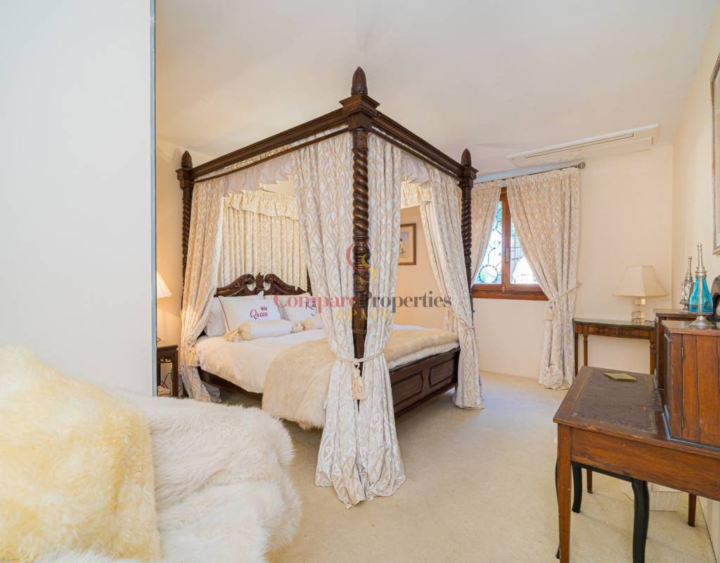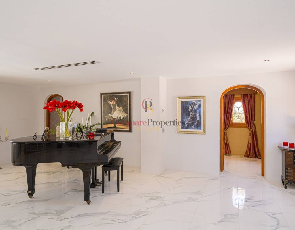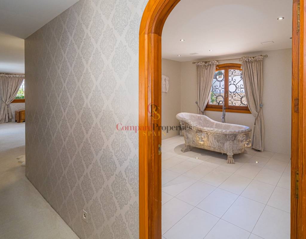 Deze prachtige villa ligt in een rustige woonstraat op slechts een klein eindje rijden van het prachtige strand van El Portet en het stadscentrum en de jachthaven van Moraira. De villa ligt op een groot perceel en is verdeeld over twee ruime niveaus.Vanaf het moment dat je de villa binnenkomt door de antieke voordeuren word je meegenomen op een interieurreis met themakamers, prachtige kleuren, zorgvuldig gekozen meubels en in het algemeen een flair die alleen door een select groepje mensen kan worden gecreëerd.Je komt binnen in een vorstelijke entree met een vleugelpiano en een groot gewelfd raam met uitzicht over het zwembad en de zee, de grootte van deze kamer wordt geaccentueerd door het gebruik van witte marmeren tegels in de hele woonkamer.Aan de rechterkant is het gastentoilet dat is ingericht in Franse stijl met een sierlijke wastafel.In de uiterst rechtse hoek van de entree is de master bedroom vleugel, die bestaat uit een grote kleedkamer met een prachtige spiegel afwerking kaptafel en sierlijke spiegel, verder naar beneden in deze prive-gang is de prachtige, ruime master badkamer met een grote walk-in douche, een verklaring sierlijke Italiaanse marmeren slipper bad, een super moderne wastafel en een grote exotische spiegel. Aan het einde van de gang is de grote slaapkamer, een weelderige kamer met veel ruimte, een luxe bed, een televisie/zithoek en een deur die leidt naar het zwembadterras.Terug naar de linkerkant van de entree vind je slaapkamer 2, deze mooie kamer straalt comfort uit en is gehuld in wit en beige met verweerd geschilderd meubilair. De en-suite badkamer heeft een modern badmeubel en een grote inloopdouche met zwarte bak en tegels achter de douchetoren. Het woongedeelte loopt van de entree over in een groot woon-eetgedeelte, eerst is er een hoge tafel met krukken die perfect bij de ingang van de keuken staan, zodat je kunt socializen met de chef-kok van de avond terwijl je geniet van een glas van je favoriete drankje en van het uitzicht op zee, allemaal tegelijk. De keuken is prachtig, witte kasten gemengd met witte deurpanelen en witte Silestone werkbladen, de apparatuur is van Bosch, een genot voor koks, en inclusief een koffiezetapparaat. De keuken is afgewerkt met glazen mozaïektegels en een prachtige spiegel. Net buiten de keuken is een muur bijna gevuld met een dramatische spiegel. De ontspannende loungeruimte is gecentreerd rond een prachtige marmeren open haard. Aan het einde van de kamer is de grote eethoek die baadt in het licht en gewelfde ramen heeft die uitkijken over de vallei naar de zee bij El Portet en verder, hier vind je ook een deur die leidt naar het terras bij het zwembad.Het gastengedeelte beneden is toegankelijk via een wenteltrap vanaf de ingang boven of via een aparte deur vanuit de tuin. Hier vind je een zeer ruime woonkamer, met dezelfde marmeren tegels als op de bovenverdieping, gedomineerd door een opvallende abstracte muurschildering van een leeuw. Aan het eind van de woonkamer is er een deur naar een grote open naya met uitzicht op zee. Naast de woonkamer is een ruim kantoor dat indien nodig ook als slaapkamer 6 kan worden gebruikt. De eerste tweepersoonsslaapkamer is ingericht met zachte tinten en heeft een kleedkamer en een eigen badkamer met douche en wastafel. Op het einde van een korte gang zijn er nog twee slaapkamers, de eerste is een mooie slaapkamer met twee aparte bedden met gordijnen die alle muren bedekken en een kaptafel met spiegels en door een deur met spiegels vind je een en-suite badkamer met douche en wastafel. De laatste slaapkamer is de grootste, met een prachtig hemelbed, spiegelkasten aan de voorkant en een prachtige en-suite badkamer met jacuzzi met een gespiegeld badpaneel en een modern badmeubel. Onderaan de wenteltrap is er een opvallende verhoogde vitrine.Het terras bij het zwembad ligt op hetzelfde niveau als de hoofdverdieping, aan 3 kanten omgeven door een sierlijke open naya, aan de vierde kant is een open zithoek en het uitzicht op zee. Verderop het terras vind je de wasruimte, een geweldige volledig ingerichte zomerkeuken en een open naya om overdekt te dineren, als je liever buiten eet is er ook een eetterras. Een paar treden lager vind je nog een schaduwrijke zithoek en een hot tub-terras met uitzicht op zee. Nog een paar treden verder kom je bij een natuurstenen gebouw waar je de wijnkelder vindt, natuurstenen vloeren en muren met cementeffect en sfeerverlichting vormen de perfecte omgeving voor de terracotta wijnrekken en natuurlijk een proeftafel. De rest van de tuin heeft volwassen planten en bomen, fruitbomen en palmen, een gazebo, een decoratief stenen terras en een droge rivierbedding compleet met brug en grote dierensculpturen.De omheinde ingang van de villa biedt parkeergelegenheid voor meerdere voertuigen en een dubbele garage met elektrische deuren en er is ook een voetgangerspoort aan de zijkant van de villa waar gasten of familie die beneden verblijven binnen kunnen komen zonder hun gastheren te storen.- Belangrijke punten:- Gebouwd 1978- Gerenoveerd door de huidige eigenaren 2018- Centrale airconditioning warm/koud in het hele huis- Warm water op zonne-energie- Alarm- Glasvezel internet en satelliet televisie beschikbaar- Marmeren tegels in het hele woongedeelte- Alle slaapkamers hebben vloerbedekking- Dubbele beglazing met luiken en muggenhorren- Jaarlijkse belastingen 3182€- Over de aankoop van sommige meubels kan worden onderhandeld met de eigenaren- Deze zeer speciale villa moet gezien worden om volledig tot zijn recht te komen, neem contact met ons op om je bezoek te regelen.- Helemaal onderaan deze woning is er een extra perceel dat ook te koop zal zijn.- Afstanden: - 2,2km naar het stadscentrum- 2,4 km van het strand en restaurants van El Portet- 5,7km naar een golfbaan- 9,5 km van de snelweg naar Benissa- 63 minuten rijden naar het vliegveld van Alicante- 80 minuten rijden naar vliegveld Valencia- Aarzel niet om contact met ons op te nemen voor meer informatie.