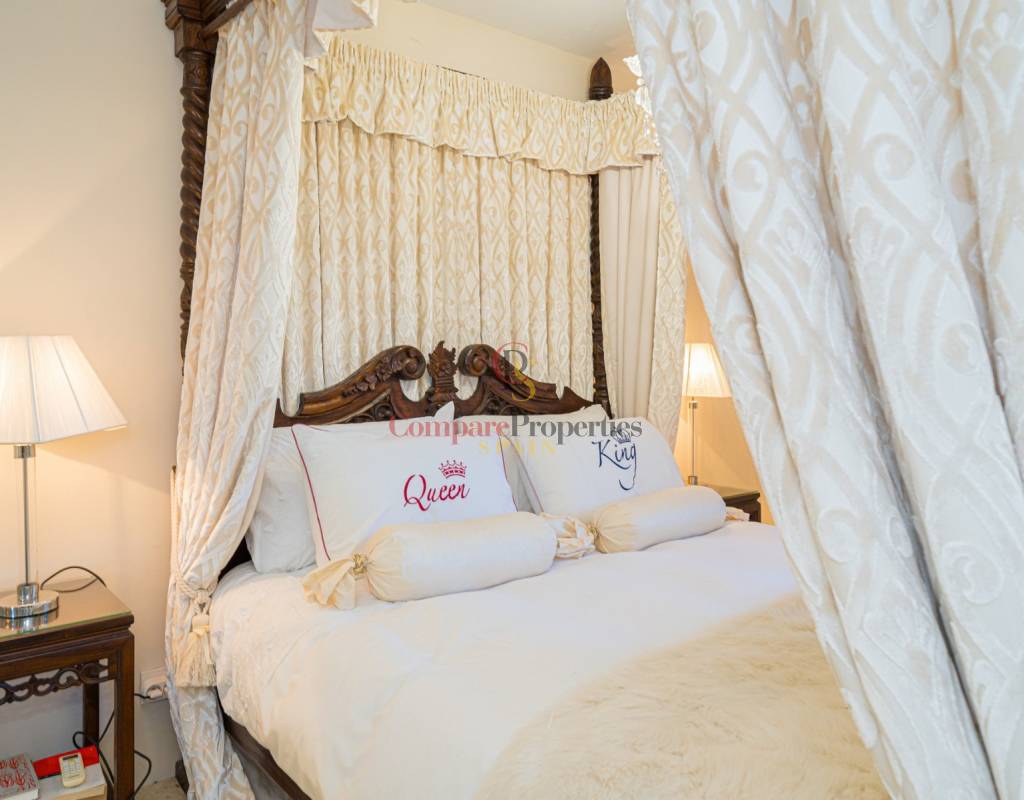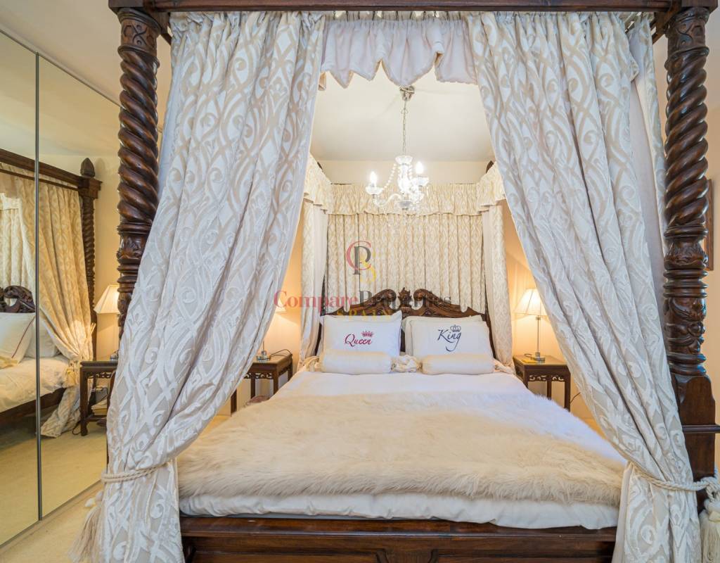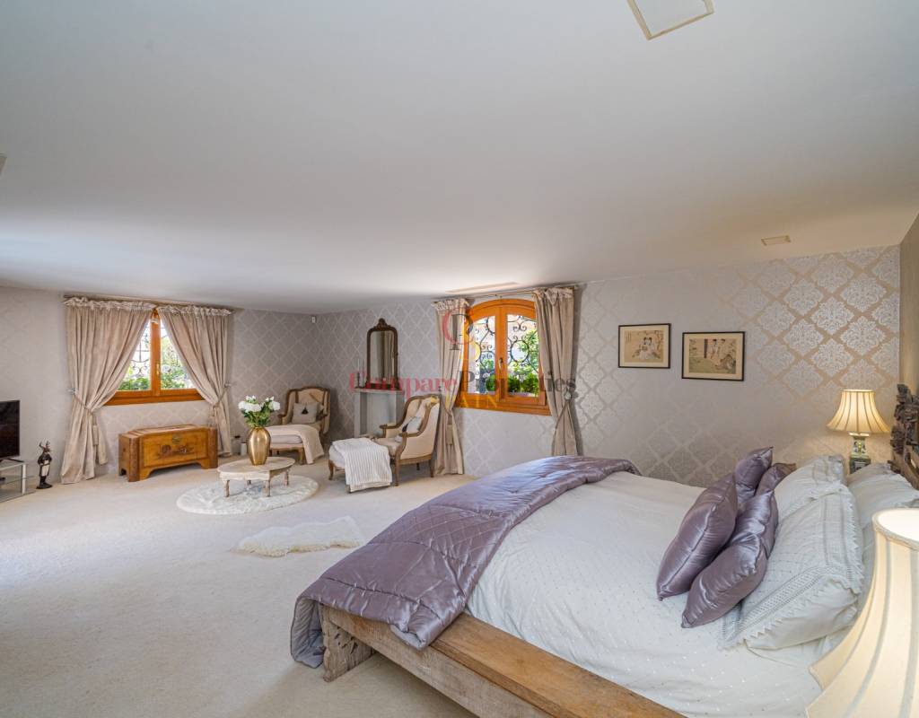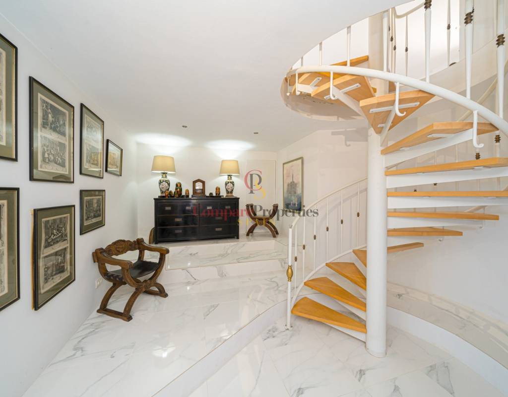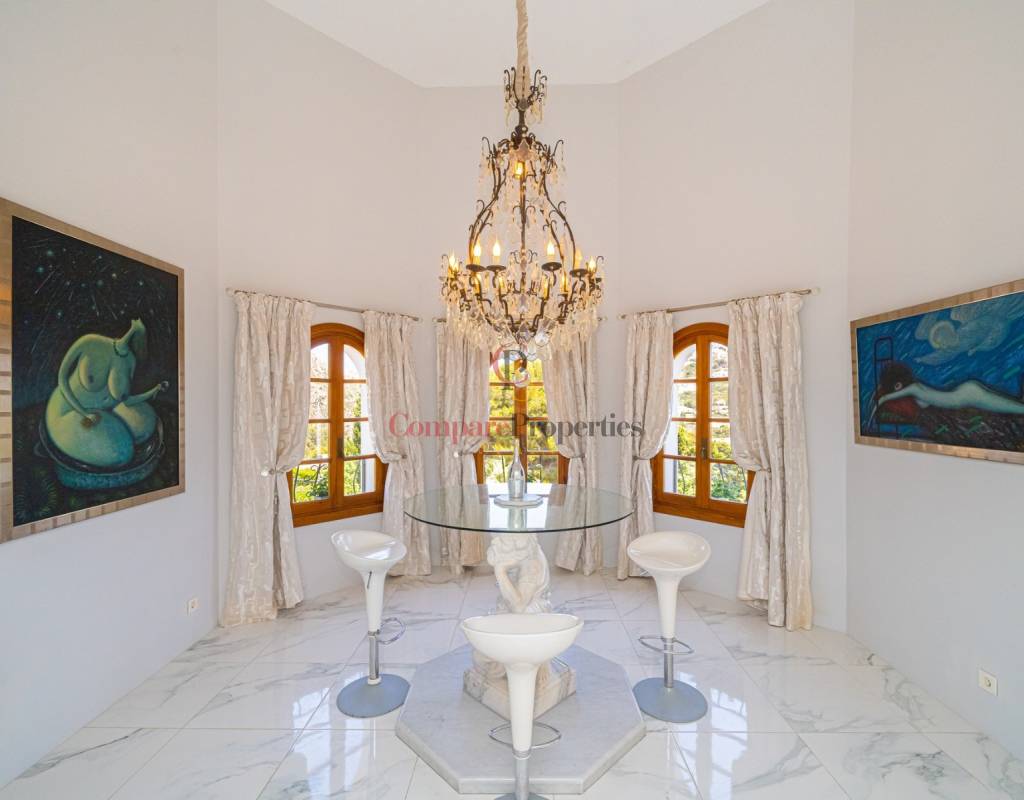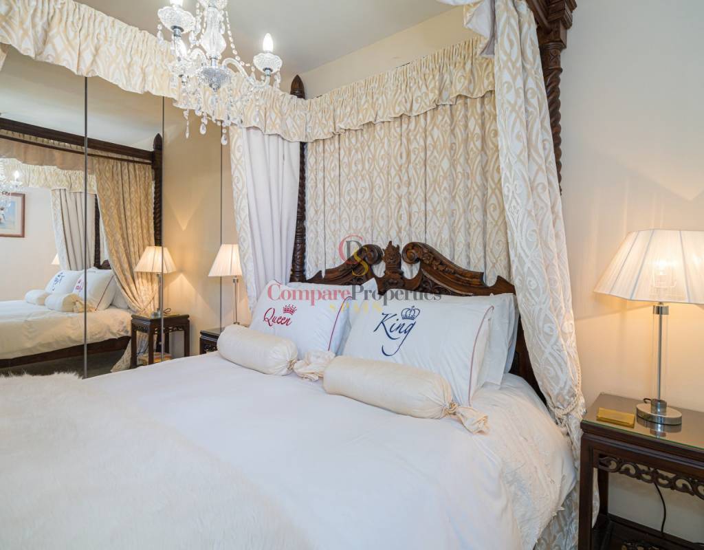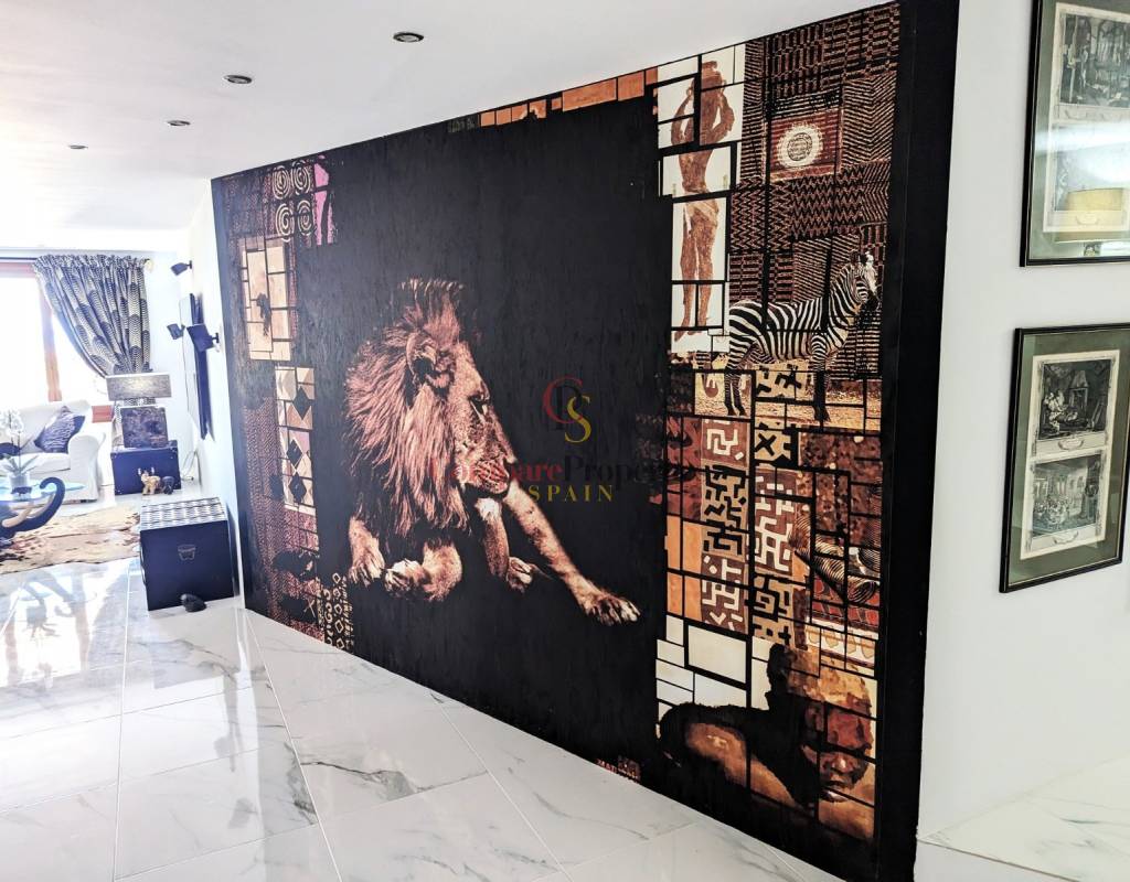 Deze prachtige villa ligt in een rustige woonstraat op slechts een klein eindje rijden van het prachtige strand van El Portet en het stadscentrum en de jachthaven van Moraira. De villa ligt op een groot perceel en is verdeeld over twee ruime niveaus.Vanaf het moment dat je de villa binnenkomt door de antieke voordeuren word je meegenomen op een interieurreis met themakamers, prachtige kleuren, zorgvuldig gekozen meubels en in het algemeen een flair die alleen door een select groepje mensen kan worden gecreëerd.Je komt binnen in een vorstelijke entree met een vleugelpiano en een groot gewelfd raam met uitzicht over het zwembad en de zee, de grootte van deze kamer wordt geaccentueerd door het gebruik van witte marmeren tegels in de hele woonkamer.Aan de rechterkant is het gastentoilet dat is ingericht in Franse stijl met een sierlijke wastafel.In de uiterst rechtse hoek van de entree is de master bedroom vleugel, die bestaat uit een grote kleedkamer met een prachtige spiegel afwerking kaptafel en sierlijke spiegel, verder naar beneden in deze prive-gang is de prachtige, ruime master badkamer met een grote walk-in douche, een verklaring sierlijke Italiaanse marmeren slipper bad, een super moderne wastafel en een grote exotische spiegel. Aan het einde van de gang is de grote slaapkamer, een weelderige kamer met veel ruimte, een luxe bed, een televisie/zithoek en een deur die leidt naar het zwembadterras.Terug naar de linkerkant van de entree vind je slaapkamer 2, deze mooie kamer straalt comfort uit en is gehuld in wit en beige met verweerd geschilderd meubilair. De en-suite badkamer heeft een modern badmeubel en een grote inloopdouche met zwarte bak en tegels achter de douchetoren. Het woongedeelte loopt van de entree over in een groot woon-eetgedeelte, eerst is er een hoge tafel met krukken die perfect bij de ingang van de keuken staan, zodat je kunt socializen met de chef-kok van de avond terwijl je geniet van een glas van je favoriete drankje en van het uitzicht op zee, allemaal tegelijk. De keuken is prachtig, witte kasten gemengd met witte deurpanelen en witte Silestone werkbladen, de apparatuur is van Bosch, een genot voor koks, en inclusief een koffiezetapparaat. De keuken is afgewerkt met glazen mozaïektegels en een prachtige spiegel. Net buiten de keuken is een muur bijna gevuld met een dramatische spiegel. De ontspannende loungeruimte is gecentreerd rond een prachtige marmeren open haard. Aan het einde van de kamer is de grote eethoek die baadt in het licht en gewelfde ramen heeft die uitkijken over de vallei naar de zee bij El Portet en verder, hier vind je ook een deur die leidt naar het terras bij het zwembad.Het gastengedeelte beneden is toegankelijk via een wenteltrap vanaf de ingang boven of via een aparte deur vanuit de tuin. Hier vind je een zeer ruime woonkamer, met dezelfde marmeren tegels als op de bovenverdieping, gedomineerd door een opvallende abstracte muurschildering van een leeuw. Aan het eind van de woonkamer is er een deur naar een grote open naya met uitzicht op zee. Naast de woonkamer is een ruim kantoor dat indien nodig ook als slaapkamer 6 kan worden gebruikt. De eerste tweepersoonsslaapkamer is ingericht met zachte tinten en heeft een kleedkamer en een eigen badkamer met douche en wastafel. Op het einde van een korte gang zijn er nog twee slaapkamers, de eerste is een mooie slaapkamer met twee aparte bedden met gordijnen die alle muren bedekken en een kaptafel met spiegels en door een deur met spiegels vind je een en-suite badkamer met douche en wastafel. De laatste slaapkamer is de grootste, met een prachtig hemelbed, spiegelkasten aan de voorkant en een prachtige en-suite badkamer met jacuzzi met een gespiegeld badpaneel en een modern badmeubel. Onderaan de wenteltrap is er een opvallende verhoogde vitrine.Het terras bij het zwembad ligt op hetzelfde niveau als de hoofdverdieping, aan 3 kanten omgeven door een sierlijke open naya, aan de vierde kant is een open zithoek en het uitzicht op zee. Verderop het terras vind je de wasruimte, een geweldige volledig ingerichte zomerkeuken en een open naya om overdekt te dineren, als je liever buiten eet is er ook een eetterras. Een paar treden lager vind je nog een schaduwrijke zithoek en een hot tub-terras met uitzicht op zee. Nog een paar treden verder kom je bij een natuurstenen gebouw waar je de wijnkelder vindt, natuurstenen vloeren en muren met cementeffect en sfeerverlichting vormen de perfecte omgeving voor de terracotta wijnrekken en natuurlijk een proeftafel. De rest van de tuin heeft volwassen planten en bomen, fruitbomen en palmen, een gazebo, een decoratief stenen terras en een droge rivierbedding compleet met brug en grote dierensculpturen.De omheinde ingang van de villa biedt parkeergelegenheid voor meerdere voertuigen en een dubbele garage met elektrische deuren en er is ook een voetgangerspoort aan de zijkant van de villa waar gasten of familie die beneden verblijven binnen kunnen komen zonder hun gastheren te storen.- Belangrijke punten:- Gebouwd 1978- Gerenoveerd door de huidige eigenaren 2018- Centrale airconditioning warm/koud in het hele huis- Warm water op zonne-energie- Alarm- Glasvezel internet en satelliet televisie beschikbaar- Marmeren tegels in het hele woongedeelte- Alle slaapkamers hebben vloerbedekking- Dubbele beglazing met luiken en muggenhorren- Jaarlijkse belastingen 3182€- Over de aankoop van sommige meubels kan worden onderhandeld met de eigenaren- Deze zeer speciale villa moet gezien worden om volledig tot zijn recht te komen, neem contact met ons op om je bezoek te regelen.- Helemaal onderaan deze woning is er een extra perceel dat ook te koop zal zijn.- Afstanden: - 2,2km naar het stadscentrum- 2,4 km van het strand en restaurants van El Portet- 5,7km naar een golfbaan- 9,5 km van de snelweg naar Benissa- 63 minuten rijden naar het vliegveld van Alicante- 80 minuten rijden naar vliegveld Valencia- Aarzel niet om contact met ons op te nemen voor meer informatie.