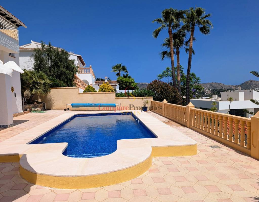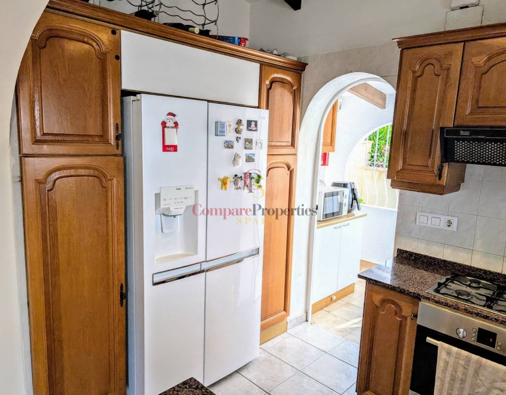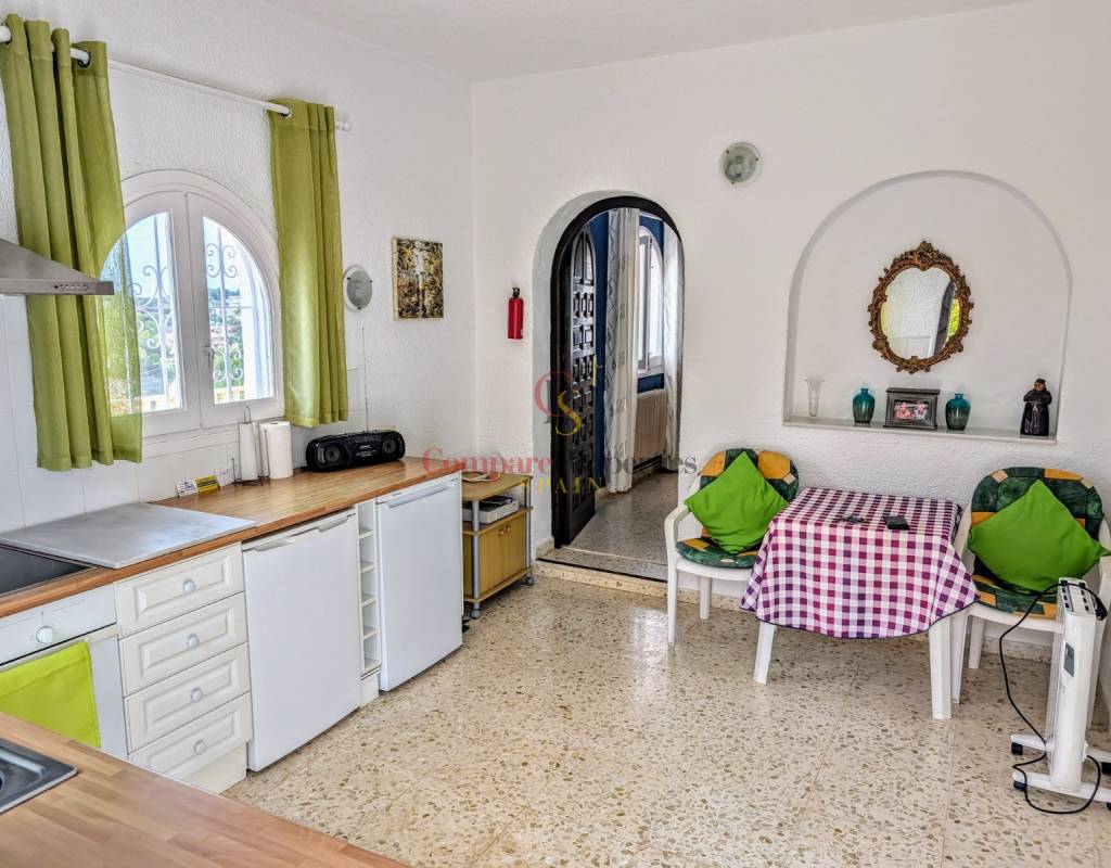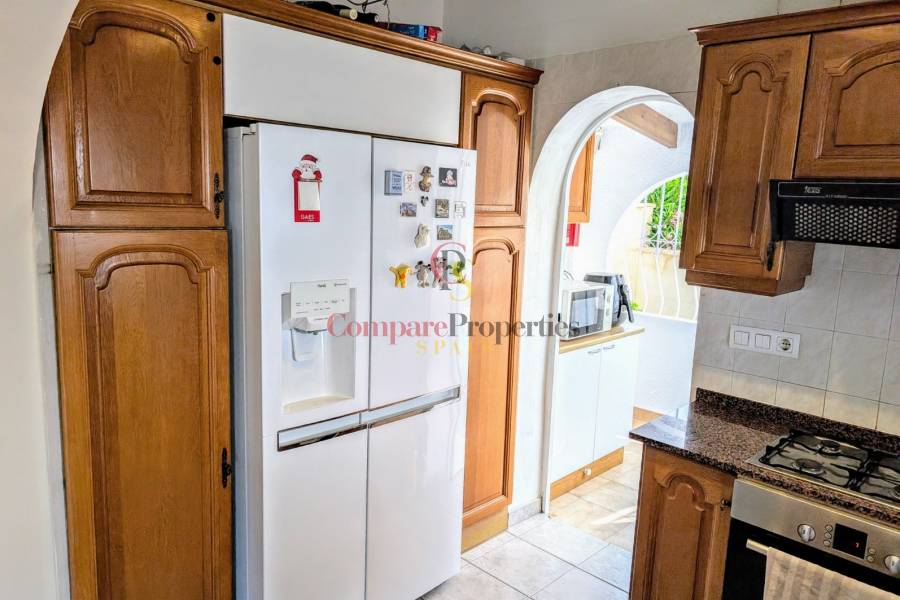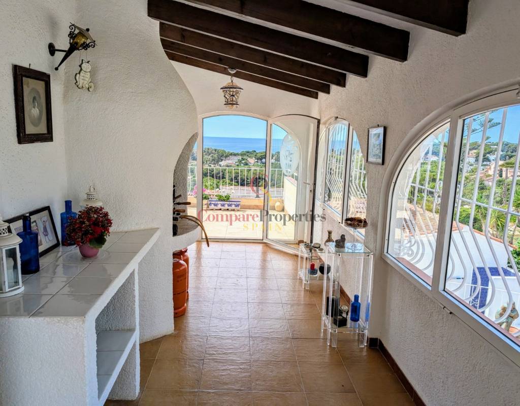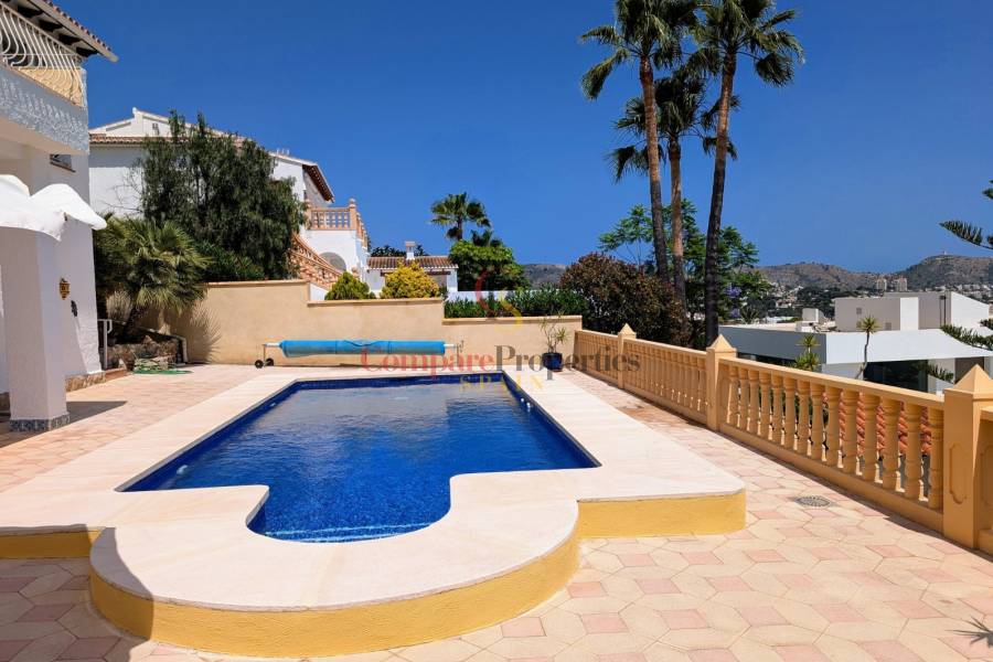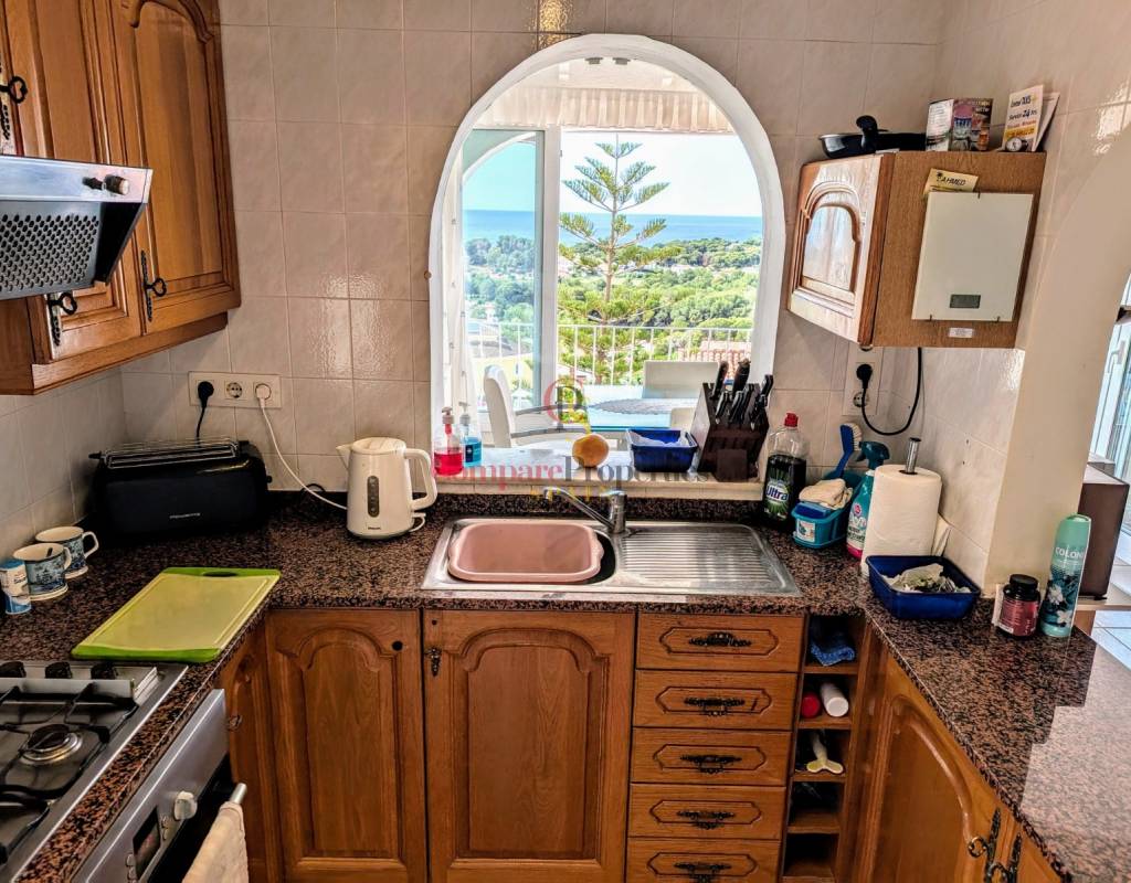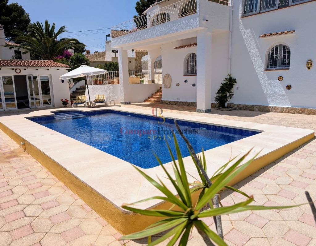 Deze villa in traditionele stijl ligt op een bevoorrechte locatie met prachtig uitzicht op zee, maar toch op slechts 3 minuten rijden van het strand en het stadscentrum. De villa is verdeeld over twee aparte verdiepingen en ligt op een hellend perceel in een rustige woonstraat. Het huis heeft twee toegangsdeuren voor auto's, een leidt naar een carport met parkeerruimte voor twee extra auto's en de andere naar een garage met parkeerruimte voor drie of vier extra auto's. Vanuit de hoger gelegen parkeerruimte kun je naar de garage. Vanaf de hogere parkeerplaats is het slechts vijf treden naar de hoofdingang van de villa of de ingang naar de keuken. Je komt de villa binnen via een beglaasde naya met een traditionele barbecue en vervolgens op een open terras met een open naya vanwaar je kunt genieten van het prachtige uitzicht. Vanuit de naya kom je in de eetkamer waar je kunt zitten en genieten van het uitzicht op zee dat zich uitstrekt over de baai. Vanaf hier kom je in de woonkamer, die een hoekopen haard heeft en aan de rechterkant een open keuken met eiken eenheden en granieten werkbladen, en uitzicht op zee vanaf het aanrecht! Vanuit de keuken is er toegang tot een glazen bijgebouw en een pad naar de parkeerplaats. Vanuit de woonkamer leidt een kleine hal naar een tweepersoonsslaapkamer, een badkamer en de ouderslaapkamer. De benedenverdieping heeft een aparte toegang, je komt binnen in een ruime keuken/eetkamer, links is een grote tweepersoonsslaapkamer en rechts is een gerenoveerde badkamer met inloopdouche, badmeubel en verwarmd handdoekenrek. Via een deur in de badkamer kom je in de enorme bijkeuken/werkplaats/garage en via een deur aan de rechterkant kom je in nog twee grote opslagruimtes. Vanaf de benedenverdieping leiden een paar treden je naar het grote, gedeeltelijk overdekte zwembadterras met een zwembad van 8 x 4 m met Romeinse treden, een zwembaddouche en een grote zomerkeuken met dubbele deuren. Een paar treden naar beneden leiden naar de lager gelegen tuin met wijnranken, sinaasappel-, citroen-, olijf- en nespirobomen. Er is ook een overdekte houtopslag en een zeer grote pompruimte voor het zwembad, die tevens dienst doet als werkplaats. De villa wordt omringd door een gemakkelijk te onderhouden tuin met veel volwassen planten, bomen en palmen.- Belangrijkste punten:- Gebouwd in 1978- Gebouw: 300m2+/-- Terrein: 800m2- Huidige eigenaren sinds 2005- Adembenemend uitzicht zonder op de top van een berg te staan- Centrale verwarming op olie- Airconditioning in grote slaapkamer- Nieuwe centrale verwarmingsketel 2024- Gerenoveerd zwembad 2023- Alleen Franse ramen met dubbele beglazing- Internet beschikbaar- Elektriciteit 5,5kw- Jaarlijkse belastingen 994,04€ (taxe foncière en taxe d'ordures ménagères)- De vorm van deze villa biedt de nieuwe eigenaar een gemakkelijk renovatieproject.- Afstanden :- Strand en centrum 1.5km- Jachthaven 2.1km- Golfbaan 2.5km- Snelweg naar Benissa 8.9km- Een niet te missen kans!