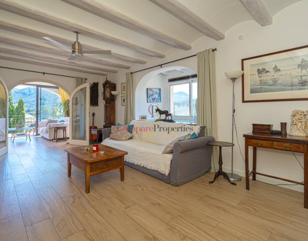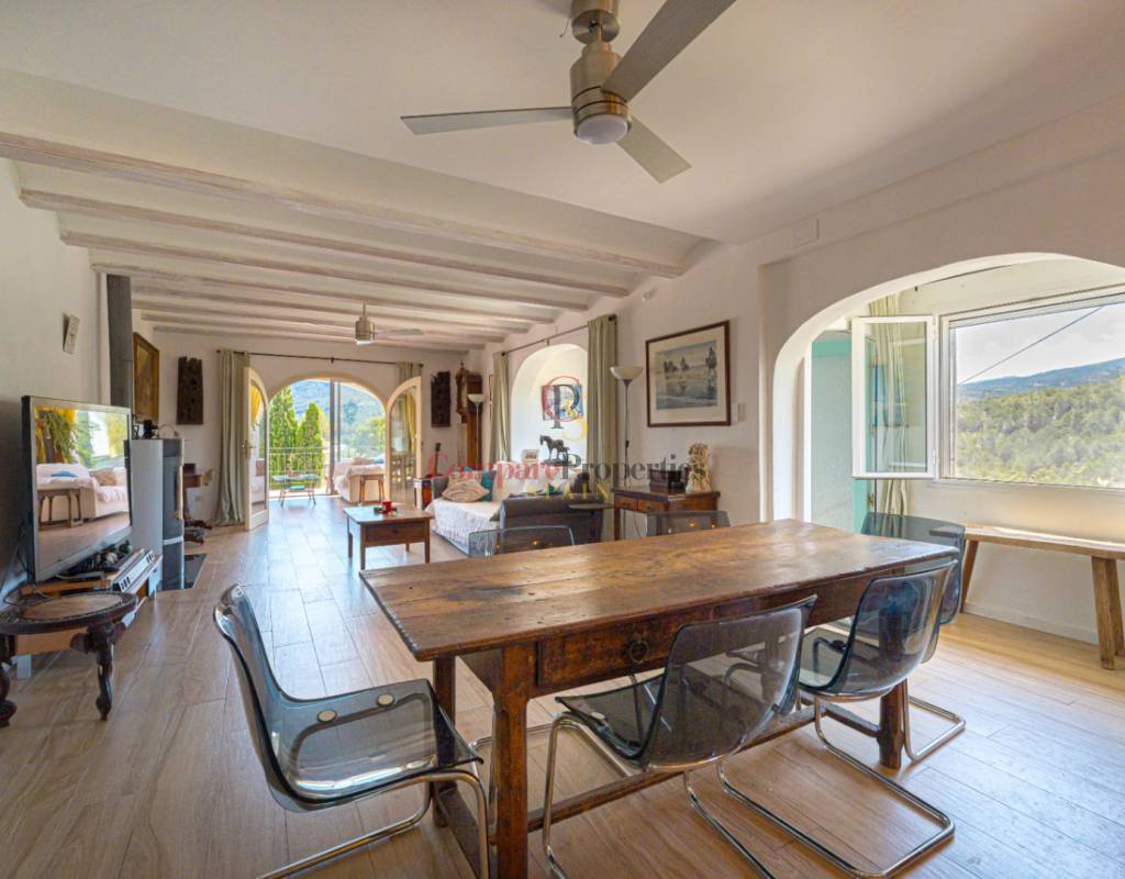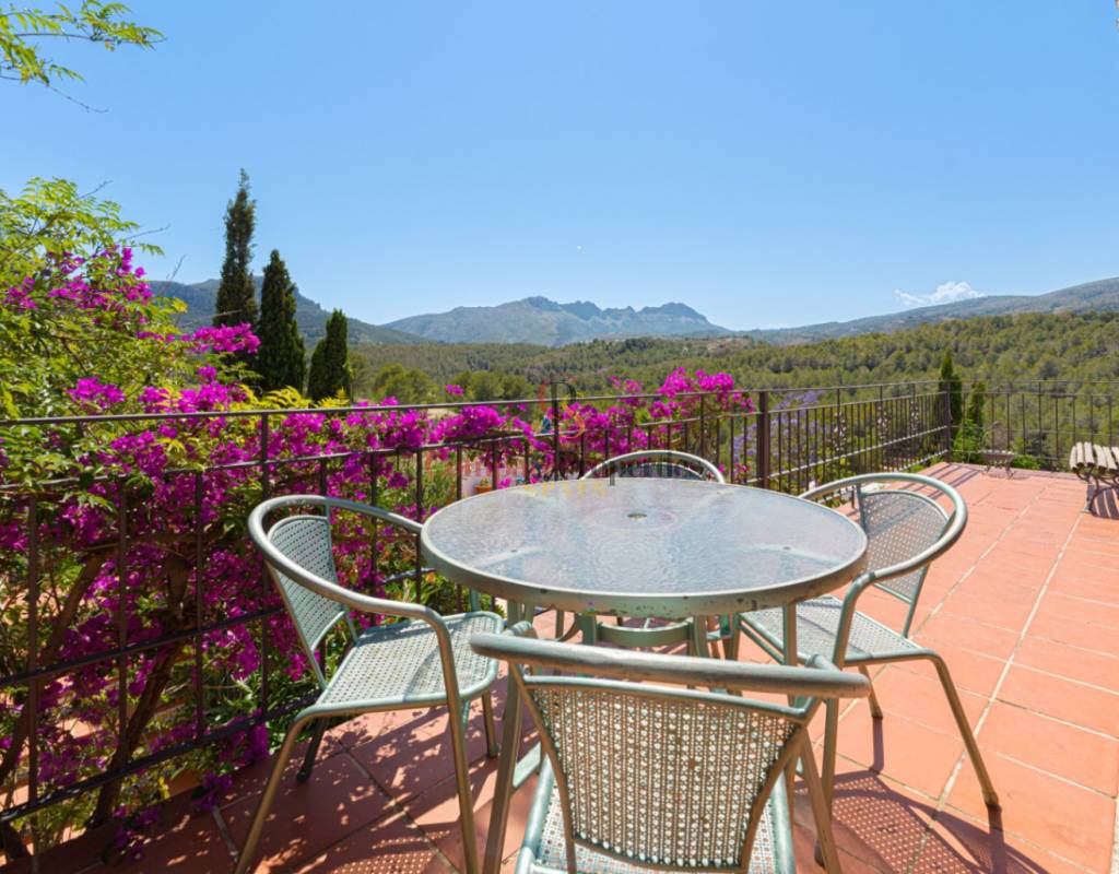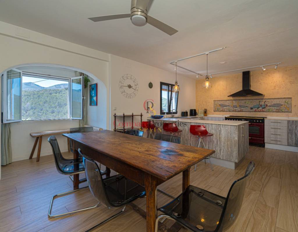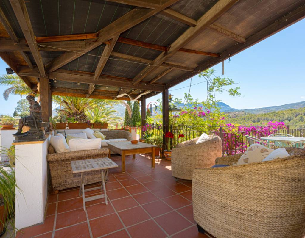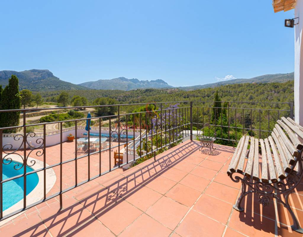 Prachtige vrijstaande landelijke woning op het zuiden met spectaculair uitzicht op de bergen, gelegen op een zeer rustige locatie op het platteland, maar toch op slechts 10 minuten rijden van de steden Benissa en Calpe. Deze unieke woning in finca-stijl heeft een rustieke charme en is recentelijk gemoderniseerd met ruime accommodatie, bestaande uit een open overdekte chill-out naya met dubbele openslaande deuren naar een glazen overdekte naya met hoge balkenplafonds, een houtkachel, twee plafondventilatoren, grote schuifdeuren naar een open zonneterras met prachtig panoramisch uitzicht op de bergen op het zuiden, een grote lichte en luchtige open woonkamer van 90 m² met eethoek met houtkachel, houten balkenplafonds, twee plafondventilatoren en een volledig ingerichte keuken met aga-fornuis en ontbijtbar. Een gang leidt naar twee tweepersoonsslaapkamers en een familiedouche. Een trap leidt naar de master bedroom suite, met schuine plafonds, een ensuite badkamer met een bad en een aparte inloopdouche, en extra grote opslagruimtes. Vanuit de woonkamer leidt een interne trap naar beneden naar een zelfstandig appartement met twee slaapkamers, een familiedouche, een volledig ingerichte keuken en een chill-out eetkamer, met openslaande deuren naar een eigen overdekte naya die leidt naar het zonneterras bij het zwembad. Buiten vindt u een prachtig niervormig zwembad met een groot zonneterras en een barbecuecasita. Het prachtige perceel van 4389 m² heeft een werkplaats/opslagruimte, twee privéopritten, één met een dubbele garage en de andere met een dubbele carport, en voldoende parkeergelegenheid voor een wagenpark of campers. Het pand heeft stallen met een vlakke weide voor paarden en is de ideale uitvalsbasis om te paardrijden of met de hond te wandelen door het prachtige landschap. Het pand is voorzien van dubbele beglazing, centrale verwarming met olieradiatoren en zou een perfecte permanente gezinswoning zijn. Deze woning heeft veel bijzondere kenmerken en biedt een werkelijk spectaculair uitzicht op het zuiden. Om de rustige en vredige omgeving ten volle te kunnen waarderen, is een persoonlijke bezichtiging essentieel.