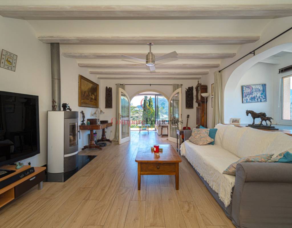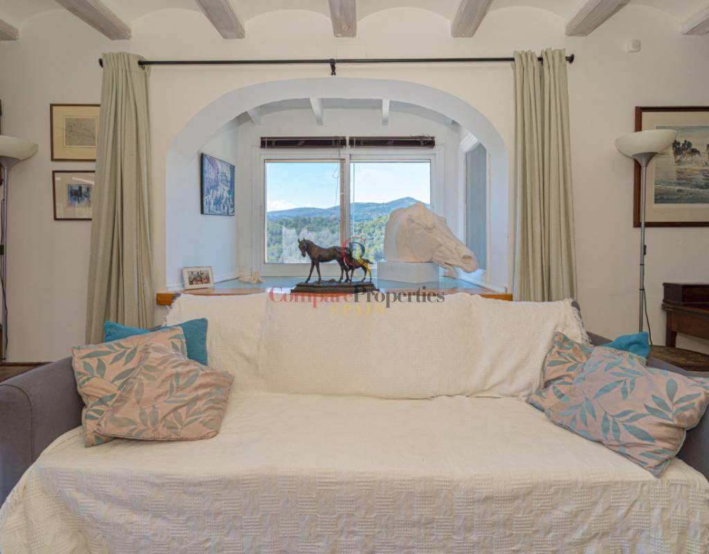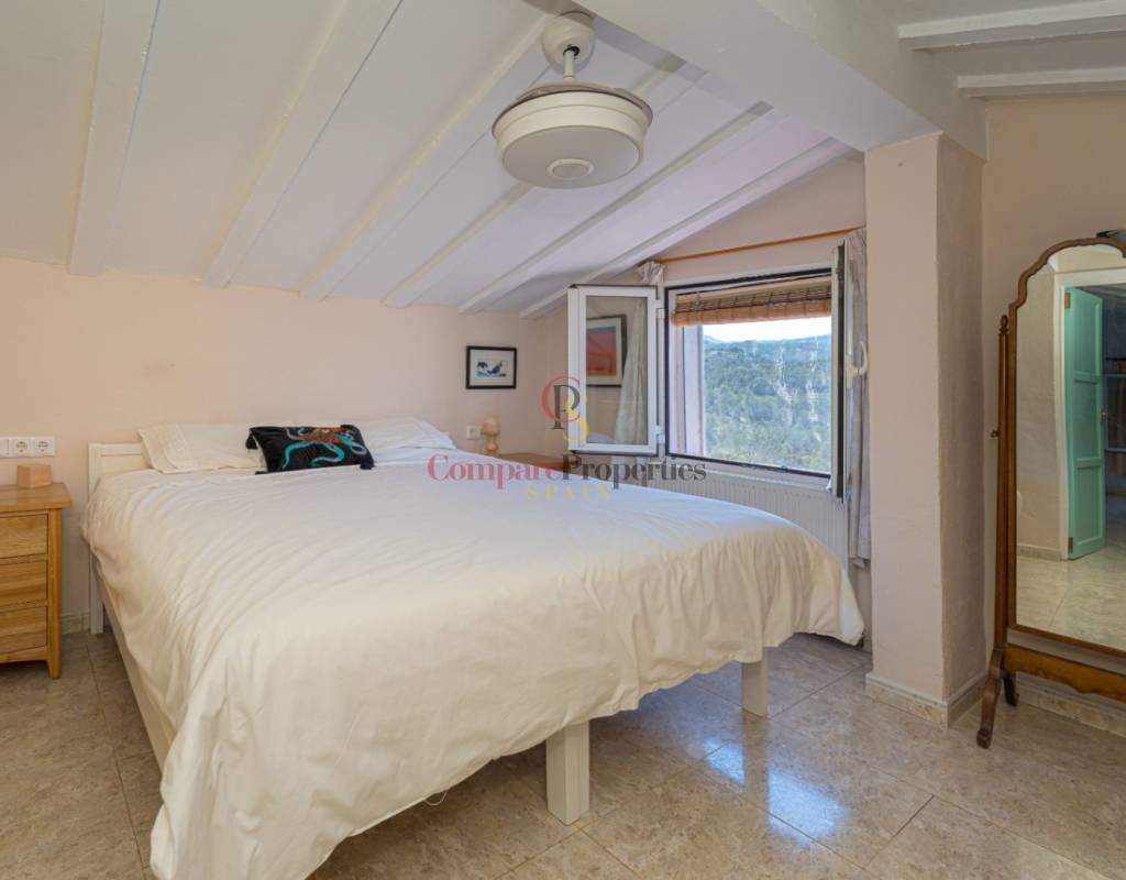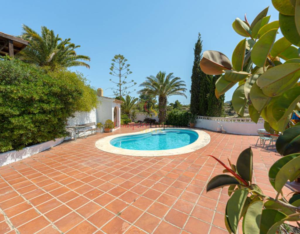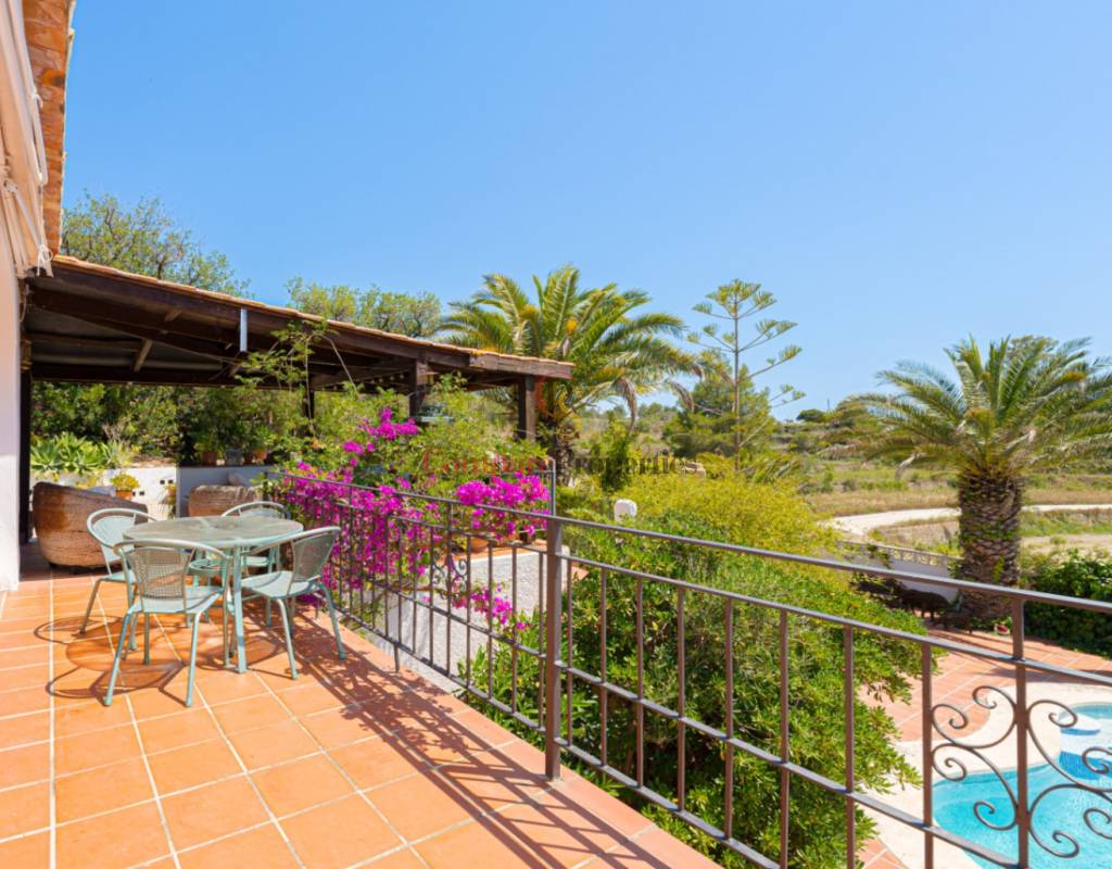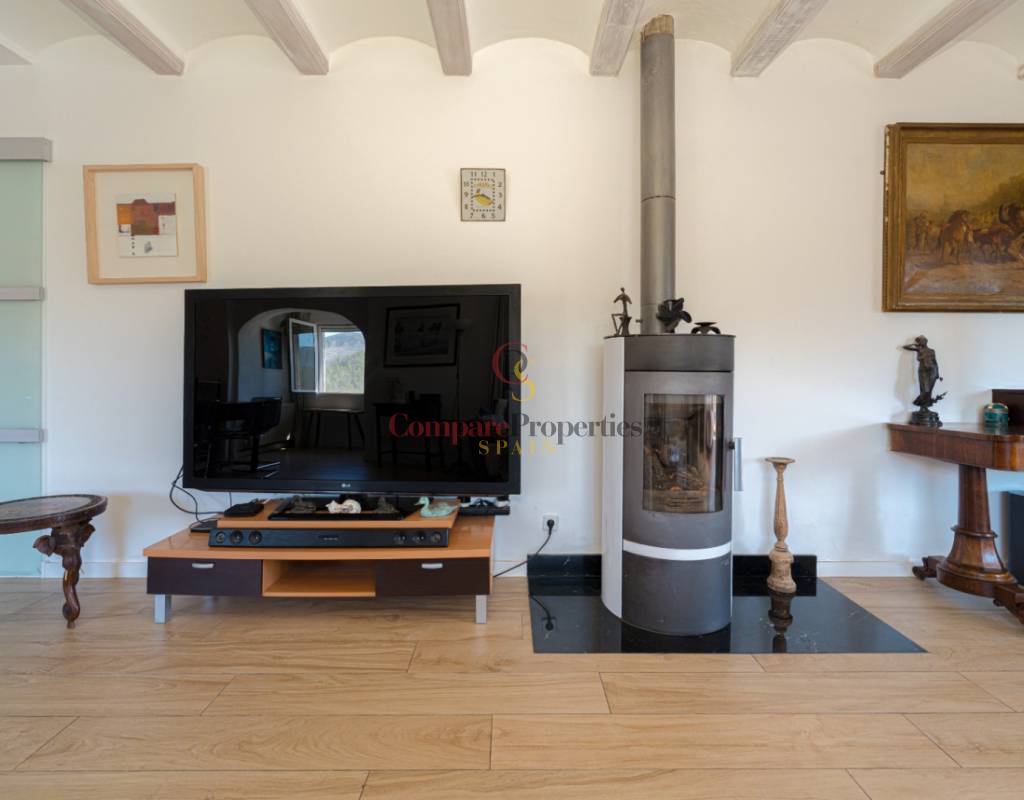 Prachtige vrijstaande landelijke woning op het zuiden met spectaculair uitzicht op de bergen, gelegen op een zeer rustige locatie op het platteland, maar toch op slechts 10 minuten rijden van de steden Benissa en Calpe. Deze unieke woning in finca-stijl heeft een rustieke charme en is recentelijk gemoderniseerd met ruime accommodatie, bestaande uit een open overdekte chill-out naya met dubbele openslaande deuren naar een glazen overdekte naya met hoge balkenplafonds, een houtkachel, twee plafondventilatoren, grote schuifdeuren naar een open zonneterras met prachtig panoramisch uitzicht op de bergen op het zuiden, een grote lichte en luchtige open woonkamer van 90 m² met eethoek met houtkachel, houten balkenplafonds, twee plafondventilatoren en een volledig ingerichte keuken met aga-fornuis en ontbijtbar. Een gang leidt naar twee tweepersoonsslaapkamers en een familiedouche. Een trap leidt naar de master bedroom suite, met schuine plafonds, een ensuite badkamer met een bad en een aparte inloopdouche, en extra grote opslagruimtes. Vanuit de woonkamer leidt een interne trap naar beneden naar een zelfstandig appartement met twee slaapkamers, een familiedouche, een volledig ingerichte keuken en een chill-out eetkamer, met openslaande deuren naar een eigen overdekte naya die leidt naar het zonneterras bij het zwembad. Buiten vindt u een prachtig niervormig zwembad met een groot zonneterras en een barbecuecasita. Het prachtige perceel van 4389 m² heeft een werkplaats/opslagruimte, twee privéopritten, één met een dubbele garage en de andere met een dubbele carport, en voldoende parkeergelegenheid voor een wagenpark of campers. Het pand heeft stallen met een vlakke weide voor paarden en is de ideale uitvalsbasis om te paardrijden of met de hond te wandelen door het prachtige landschap. Het pand is voorzien van dubbele beglazing, centrale verwarming met olieradiatoren en zou een perfecte permanente gezinswoning zijn. Deze woning heeft veel bijzondere kenmerken en biedt een werkelijk spectaculair uitzicht op het zuiden. Om de rustige en vredige omgeving ten volle te kunnen waarderen, is een persoonlijke bezichtiging essentieel.