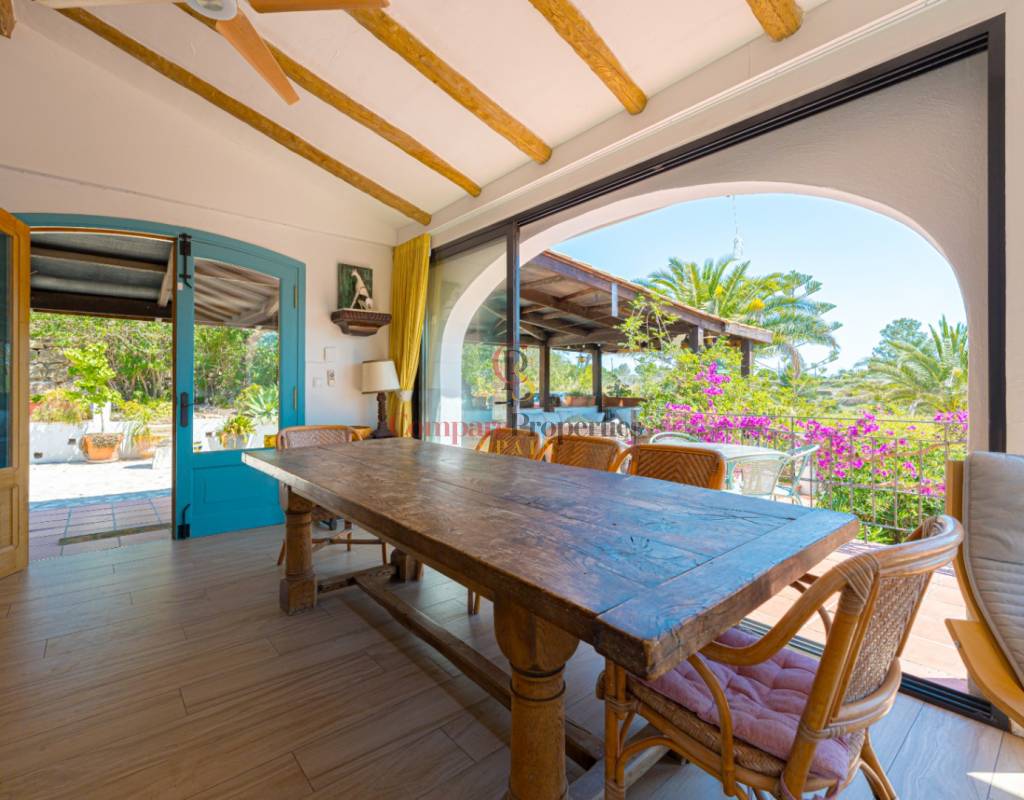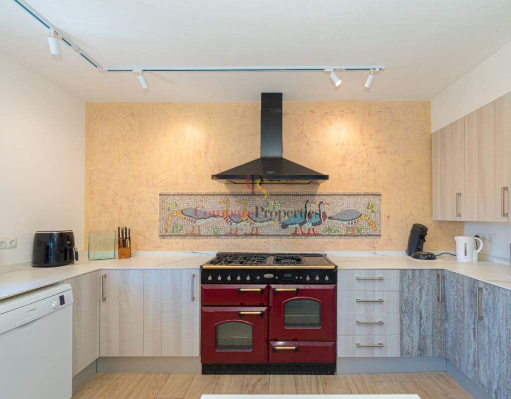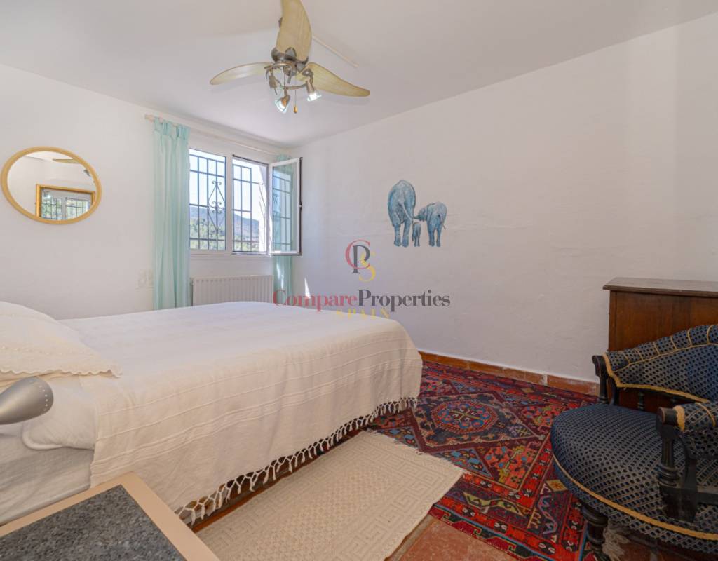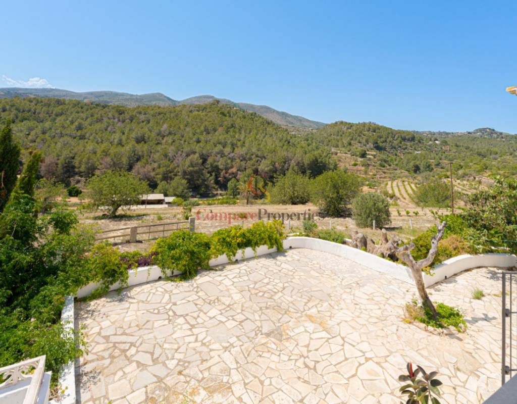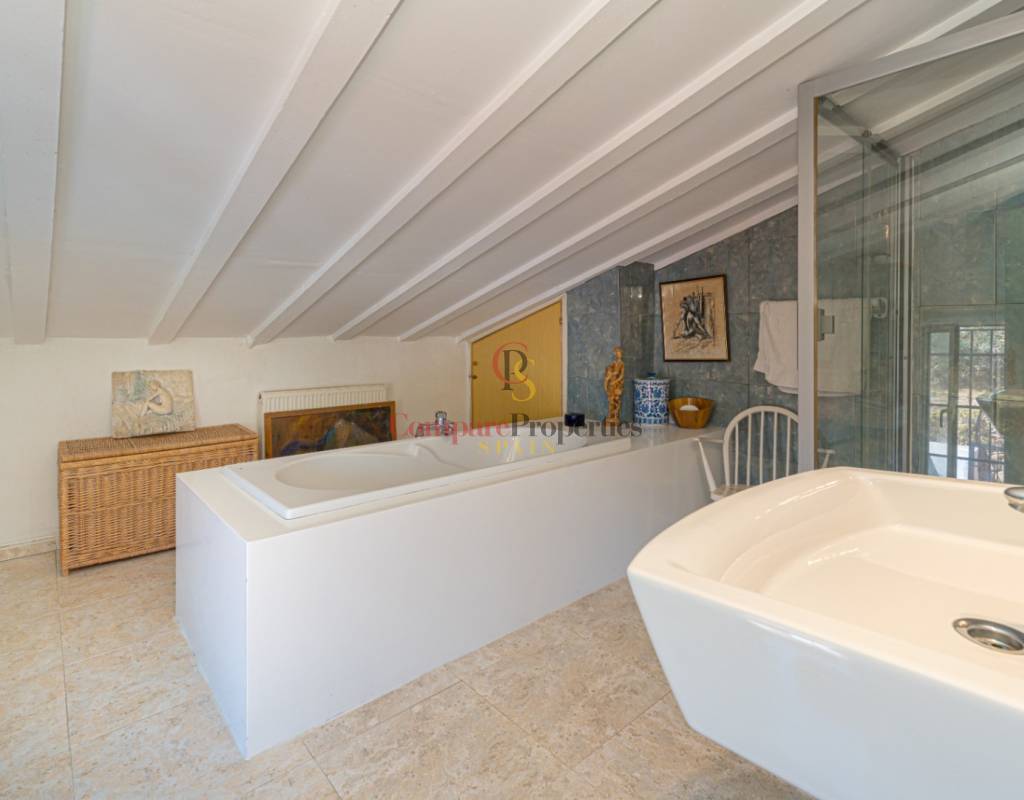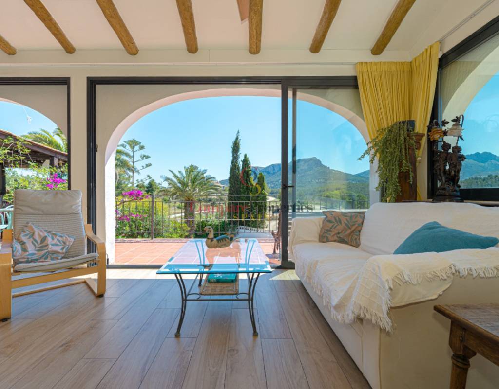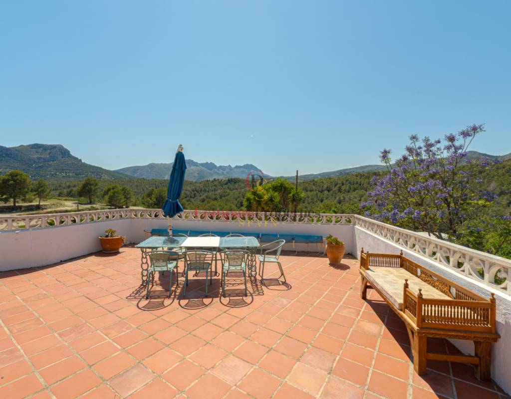 Prachtige vrijstaande landelijke woning op het zuiden met spectaculair uitzicht op de bergen, gelegen op een zeer rustige locatie op het platteland, maar toch op slechts 10 minuten rijden van de steden Benissa en Calpe. Deze unieke woning in finca-stijl heeft een rustieke charme en is recentelijk gemoderniseerd met ruime accommodatie, bestaande uit een open overdekte chill-out naya met dubbele openslaande deuren naar een glazen overdekte naya met hoge balkenplafonds, een houtkachel, twee plafondventilatoren, grote schuifdeuren naar een open zonneterras met prachtig panoramisch uitzicht op de bergen op het zuiden, een grote lichte en luchtige open woonkamer van 90 m² met eethoek met houtkachel, houten balkenplafonds, twee plafondventilatoren en een volledig ingerichte keuken met aga-fornuis en ontbijtbar. Een gang leidt naar twee tweepersoonsslaapkamers en een familiedouche. Een trap leidt naar de master bedroom suite, met schuine plafonds, een ensuite badkamer met een bad en een aparte inloopdouche, en extra grote opslagruimtes. Vanuit de woonkamer leidt een interne trap naar beneden naar een zelfstandig appartement met twee slaapkamers, een familiedouche, een volledig ingerichte keuken en een chill-out eetkamer, met openslaande deuren naar een eigen overdekte naya die leidt naar het zonneterras bij het zwembad. Buiten vindt u een prachtig niervormig zwembad met een groot zonneterras en een barbecuecasita. Het prachtige perceel van 4389 m² heeft een werkplaats/opslagruimte, twee privéopritten, één met een dubbele garage en de andere met een dubbele carport, en voldoende parkeergelegenheid voor een wagenpark of campers. Het pand heeft stallen met een vlakke weide voor paarden en is de ideale uitvalsbasis om te paardrijden of met de hond te wandelen door het prachtige landschap. Het pand is voorzien van dubbele beglazing, centrale verwarming met olieradiatoren en zou een perfecte permanente gezinswoning zijn. Deze woning heeft veel bijzondere kenmerken en biedt een werkelijk spectaculair uitzicht op het zuiden. Om de rustige en vredige omgeving ten volle te kunnen waarderen, is een persoonlijke bezichtiging essentieel.