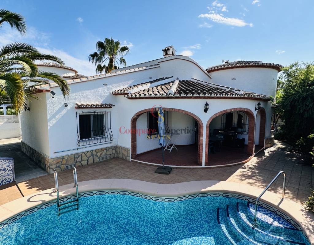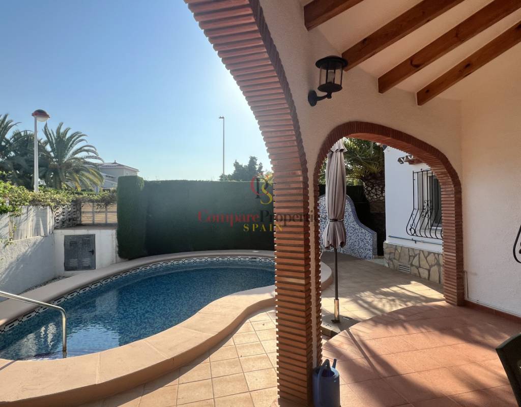Prachtig gelegen villa met zwembad, 3 slaapkamers, 2 badkamers, ca. 120 m² woonoppervlak op één niveau, drempelloos en rolstoelvriendelijk, perceel van 402 m², centrale verwarming, airco, ingerichte keuken, inbouwkasten, houtkachel, PVC-ramen met dubbel glas en rolluiken, aparte eetkamer, buitendouche, parkeerplaats, aansluiting op het riool, overdekt terras, wasruimte, enz.