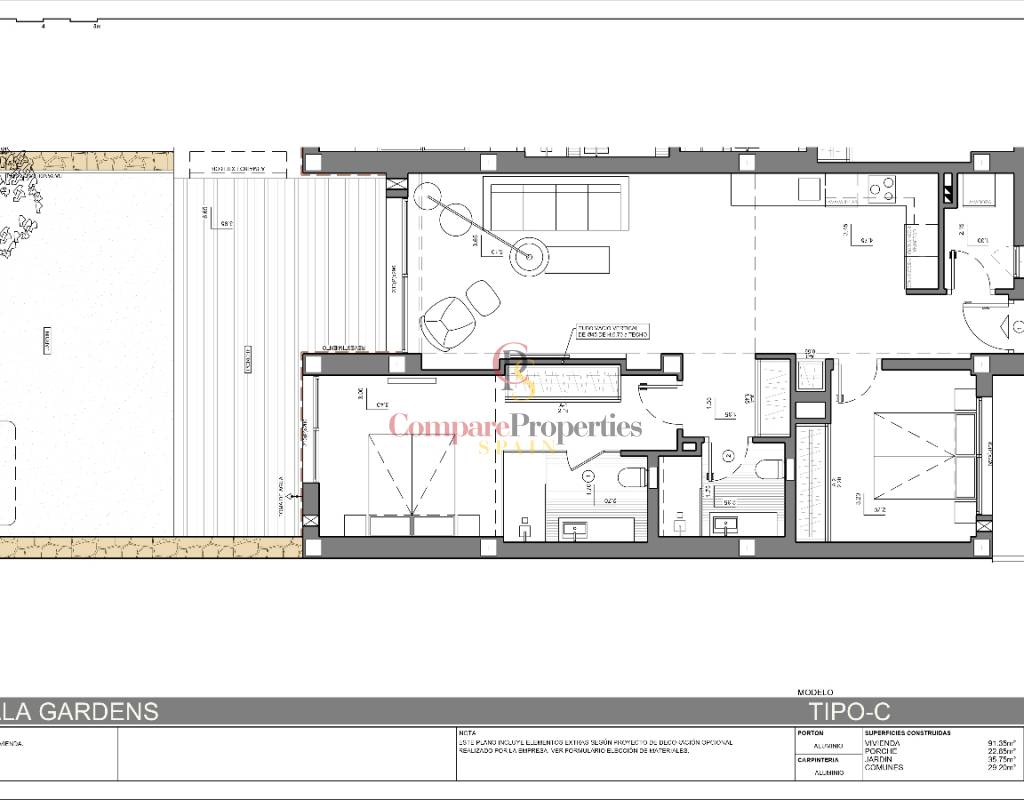 De woning bestaat uit 91 m² binnenruimte, 23 m² overdekt terras, 29 m² gemeenschappelijke ruimtes en een privétuin van 36 m², perfect om te ontspannen, tijd door te brengen met het gezin of een jacuzzi te installeren, waarvoor de woning al volledig is voorgeïnstalleerd.