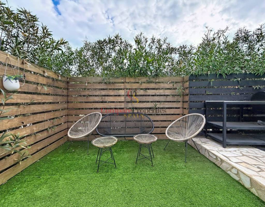 50 m² woonruimte, perfect benut.8 m² overdekt terras, ideaal voor buiten dineren of ontspannen.8 m² privéberging, perfect voor extra opslagruimte.Privé-tuin van 30 m², een groene ruimte die perfect is om te genieten van het mediterrane klimaat.De woning is ingedeeld in een lichte woon-eetkamer met directe toegang tot de tuin, een gerenoveerde en uitgeruste open keuken, twee tweepersoonsslaapkamers en een complete badkamer met douche.