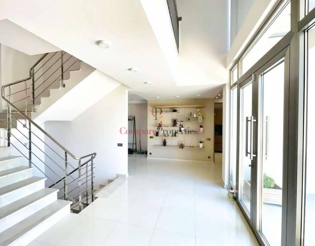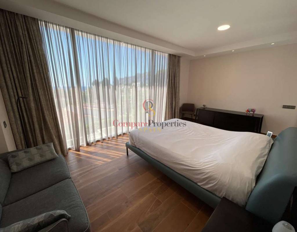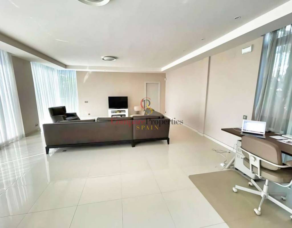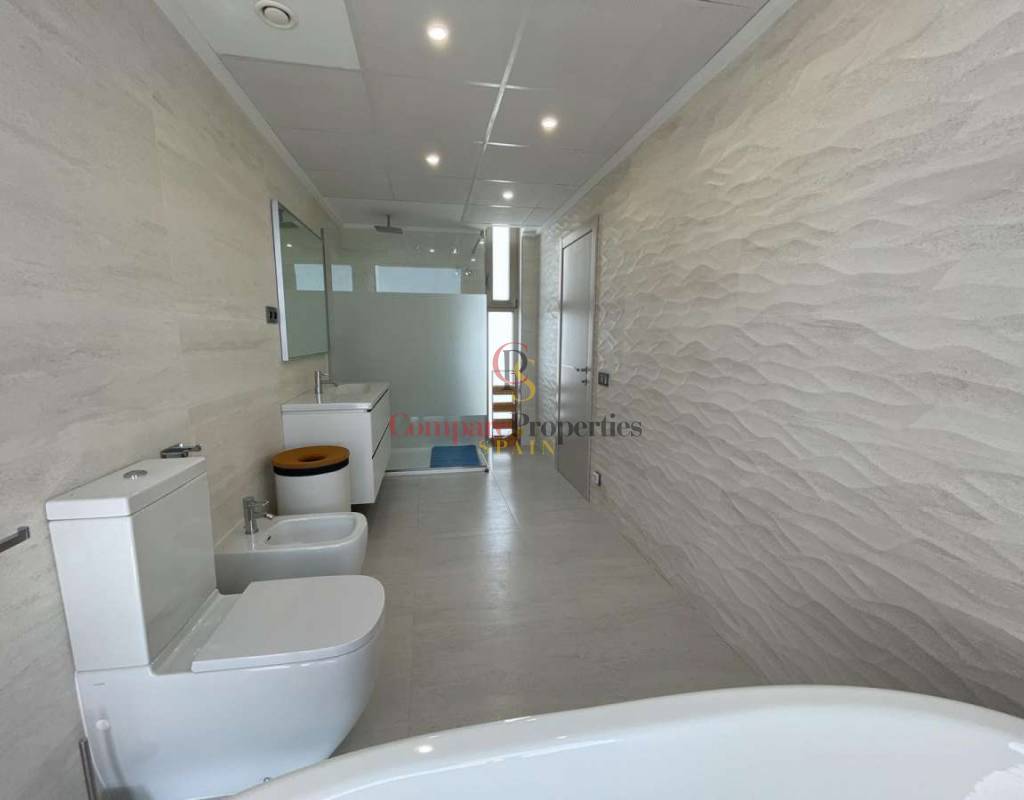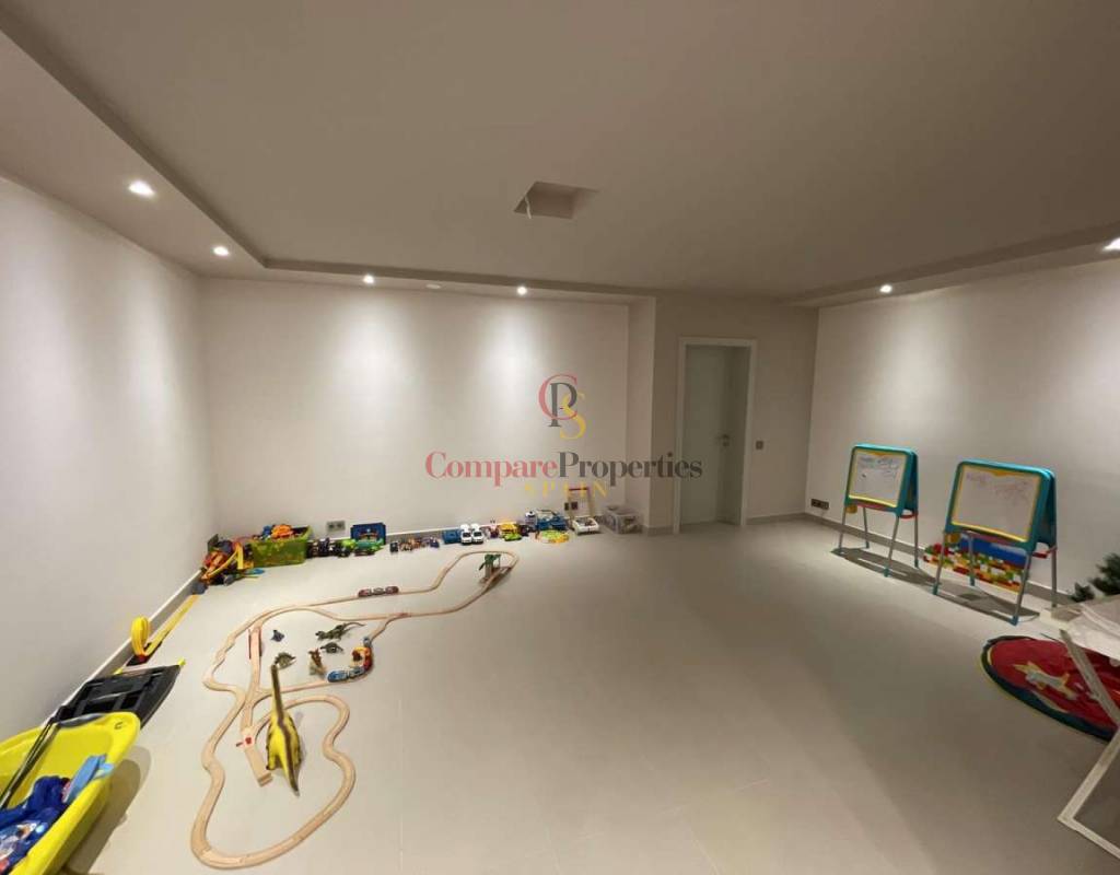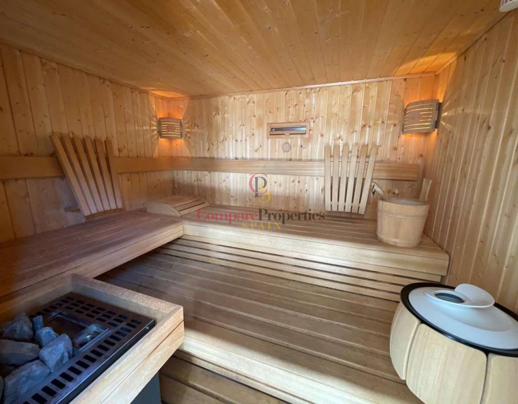Deze uitzonderlijke moderne villa is ideaal gelegen in een van de meest gewilde wijken van Calpe, op korte loopafstand van de zee en vlakbij de populaire stranden van La Fossa en La Fustera. De woning geniet van een bevoorrechte ligging op het zuiden, waardoor u de hele dag zon, privacy en een heerlijke mediterrane levensstijl ervaart – perfect zowel als vakantiehuis als voor permanente bewoning. De villa is gebouwd in 2019 op een perceel van 800 m² en biedt 395 m² bebouwde oppervlakte verdeeld over twee verdiepingen plus een souterrain. De woning onderscheidt zich door zijn eigentijdse architectuur, hoogwaardige materialen en adembenemende panoramische uitzichten op de zee en de iconische Peñón de Ifach. De begane grond beschikt over een elegante entreehal, een ruime slaapkamer met kleedruimte en en-suite badkamer, een gastentoilet en een stijlvolle open keuken met kookeiland, die verbonden is met een lichte eetruimte. De indrukwekkende woonkamer van 70 m² komt uit op een groot terras van 60 m² met automatische zonneschermen, waardoor een naadloze overgang tussen binnen en buiten ontstaat. De bovenverdieping biedt twee royale slaapkamers, beide met kleedruimte, en-suite badkamers (waarvan één met een vrijstaand bad) en privéterrassen met een prachtig uitzicht. De halfondergrondse verdieping biedt extra woonruimte, waaronder twee slaapkamers, een complete badkamer, een multifunctionele ruimte van 25 m² die ideaal is als thuisbioscoop, fitnessruimte of speelkamer, evenals een wasruimte en berging. Deze verdieping kan ook worden omgebouwd tot een zelfstandig gastenappartement met eigen ingang. De buitenruimte is ontworpen voor ultiem comfort en ontspanning en beschikt over een prachtig aangelegde tuin met automatische irrigatie, een groot terras met een aluminium pergola, een rechthoekig zoutwaterzwembad van 9,5 x 5 meter, een volledig uitgeruste zomerkeuken met barbecue en uitschuifbaar zonnescherm, en een privésauna voor maximaal vijf personen. Extra voorzieningen zijn onder andere vloerverwarming, airconditioning, een fotovoltaïsch systeem voor energiezuinigheid, hoogwaardig timmerwerk, designbadkamers, een volledig uitgeruste keuken, een alarmsysteem met camera's, ledverlichting en voldoende parkeerruimte met een pergola voor twee auto's. Deze villa combineert op perfecte wijze moderne luxe, comfort en een toplocatie – een uitstekende kans voor wie op zoek is naar een exclusieve woning aan de Costa Blanca.