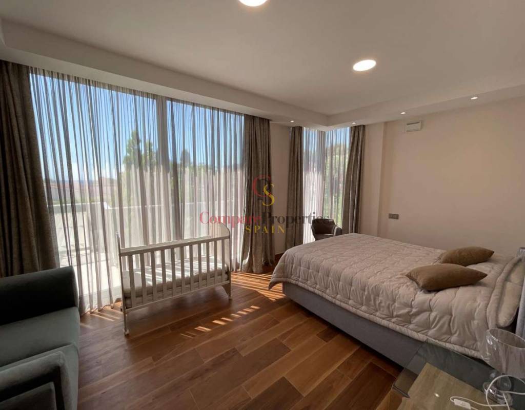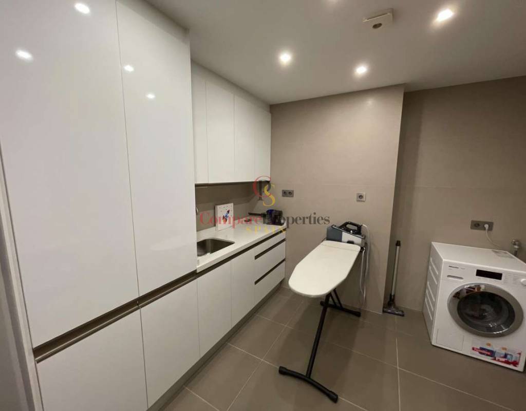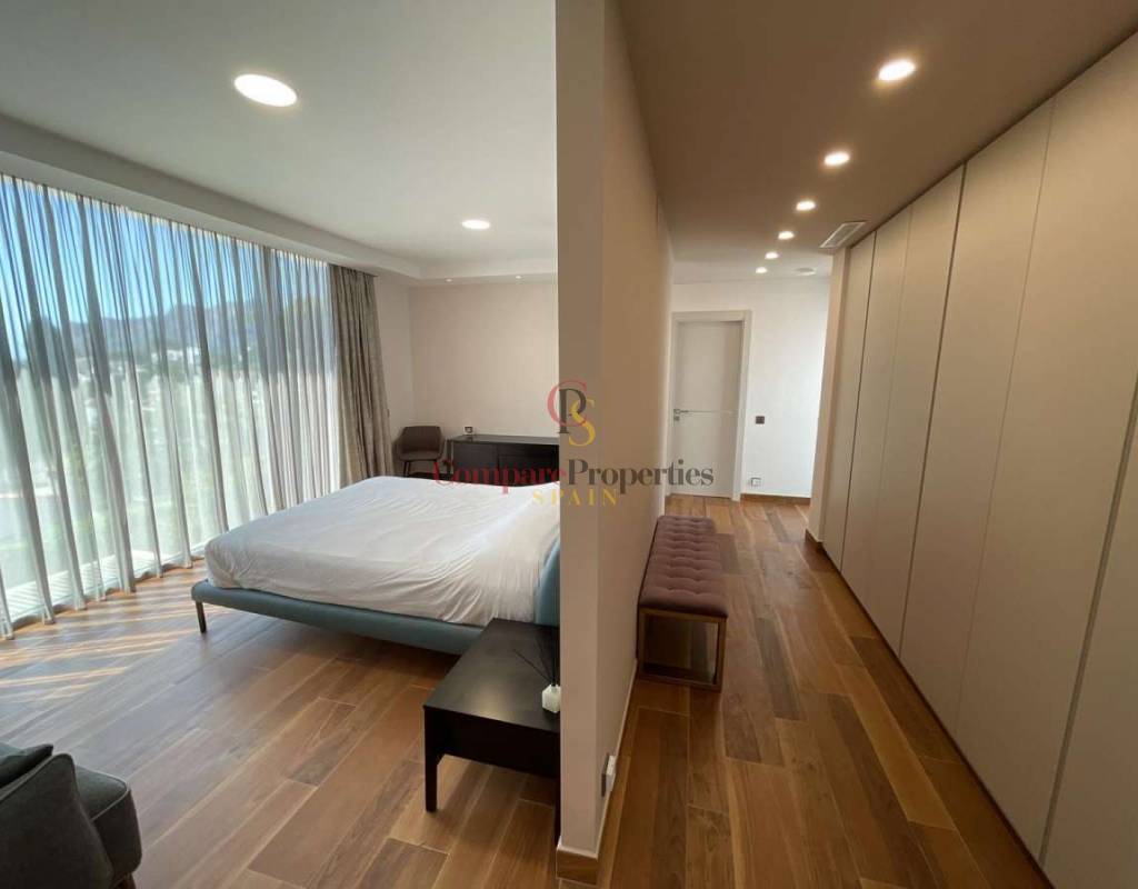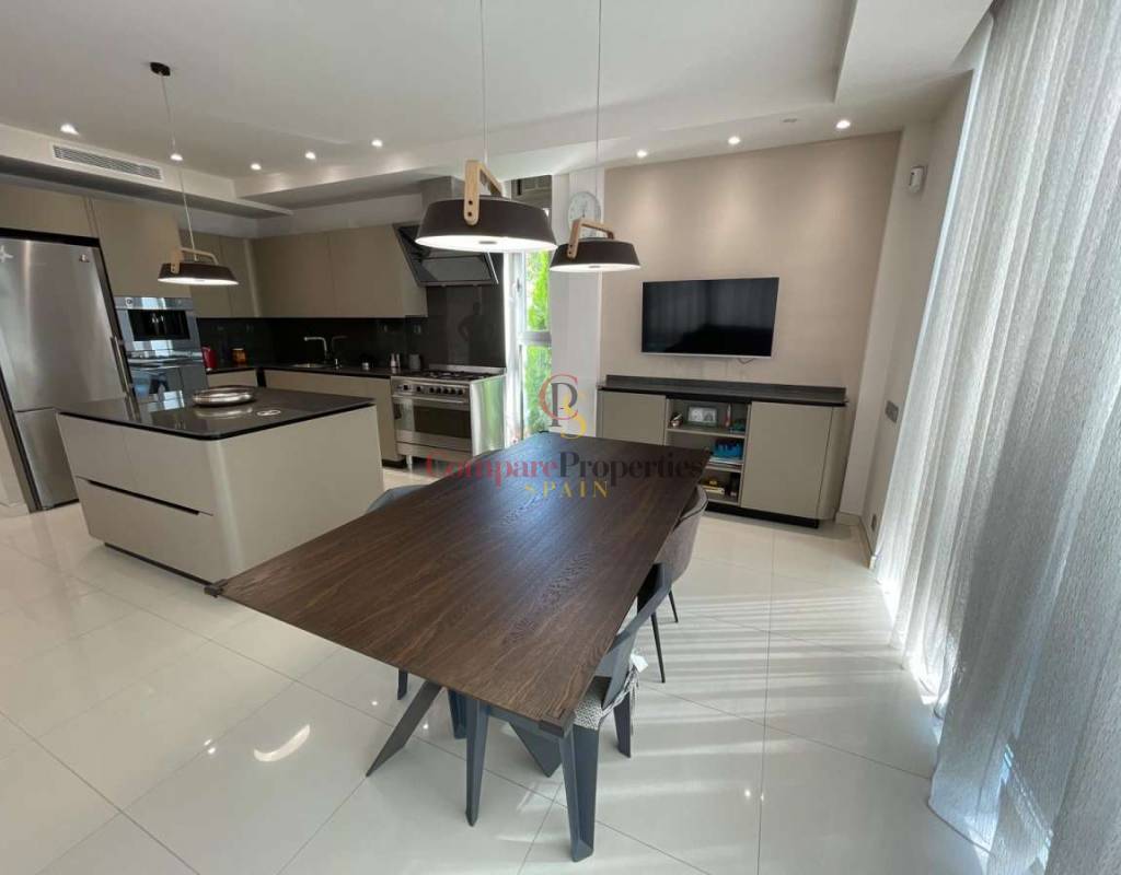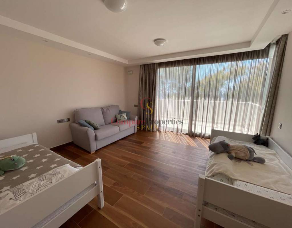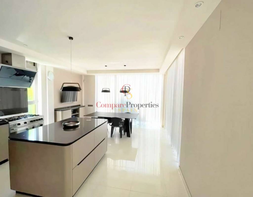 Deze uitzonderlijke moderne villa is ideaal gelegen in een van de meest gewilde wijken van Calpe, op korte loopafstand van de zee en vlakbij de populaire stranden van La Fossa en La Fustera. De woning geniet van een bevoorrechte ligging op het zuiden, waardoor u de hele dag zon, privacy en een heerlijke mediterrane levensstijl ervaart – perfect zowel als vakantiehuis als voor permanente bewoning. De villa is gebouwd in 2019 op een perceel van 800 m² en biedt 395 m² bebouwde oppervlakte verdeeld over twee verdiepingen plus een souterrain. De woning onderscheidt zich door zijn eigentijdse architectuur, hoogwaardige materialen en adembenemende panoramische uitzichten op de zee en de iconische Peñón de Ifach. De begane grond beschikt over een elegante entreehal, een ruime slaapkamer met kleedruimte en en-suite badkamer, een gastentoilet en een stijlvolle open keuken met kookeiland, die verbonden is met een lichte eetruimte. De indrukwekkende woonkamer van 70 m² komt uit op een groot terras van 60 m² met automatische zonneschermen, waardoor een naadloze overgang tussen binnen en buiten ontstaat. De bovenverdieping biedt twee royale slaapkamers, beide met kleedruimte, en-suite badkamers (waarvan één met een vrijstaand bad) en privéterrassen met een prachtig uitzicht. De halfondergrondse verdieping biedt extra woonruimte, waaronder twee slaapkamers, een complete badkamer, een multifunctionele ruimte van 25 m² die ideaal is als thuisbioscoop, fitnessruimte of speelkamer, evenals een wasruimte en berging. Deze verdieping kan ook worden omgebouwd tot een zelfstandig gastenappartement met eigen ingang. De buitenruimte is ontworpen voor ultiem comfort en ontspanning en beschikt over een prachtig aangelegde tuin met automatische irrigatie, een groot terras met een aluminium pergola, een rechthoekig zoutwaterzwembad van 9,5 x 5 meter, een volledig uitgeruste zomerkeuken met barbecue en uitschuifbaar zonnescherm, en een privésauna voor maximaal vijf personen. Extra voorzieningen zijn onder andere vloerverwarming, airconditioning, een fotovoltaïsch systeem voor energiezuinigheid, hoogwaardig timmerwerk, designbadkamers, een volledig uitgeruste keuken, een alarmsysteem met camera's, ledverlichting en voldoende parkeerruimte met een pergola voor twee auto's. Deze villa combineert op perfecte wijze moderne luxe, comfort en een toplocatie – een uitstekende kans voor wie op zoek is naar een exclusieve woning aan de Costa Blanca.