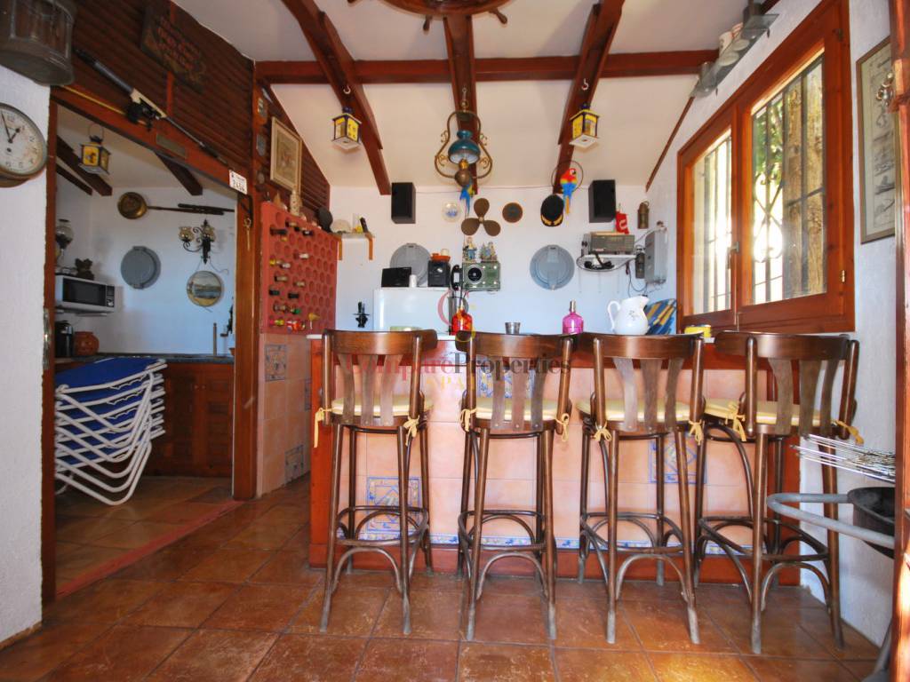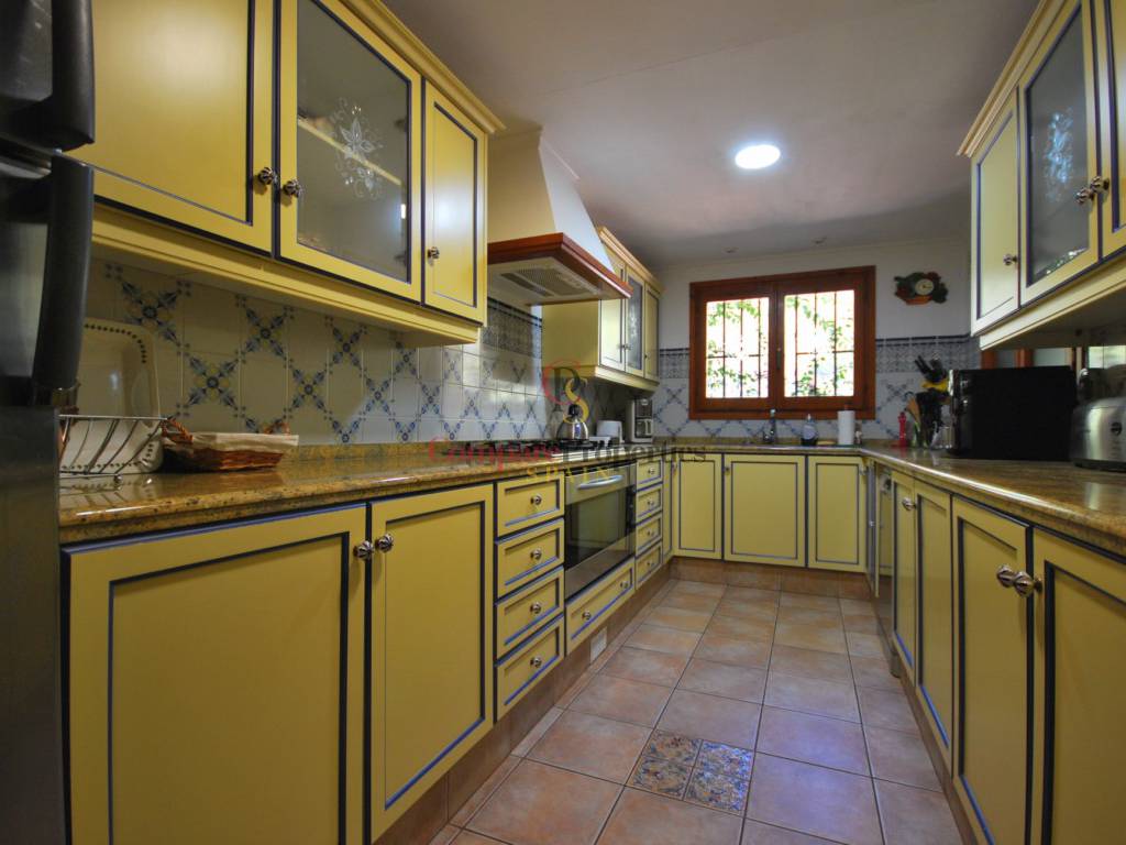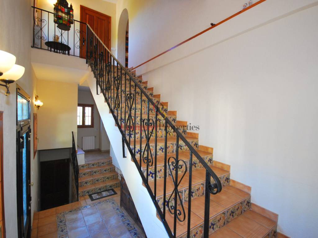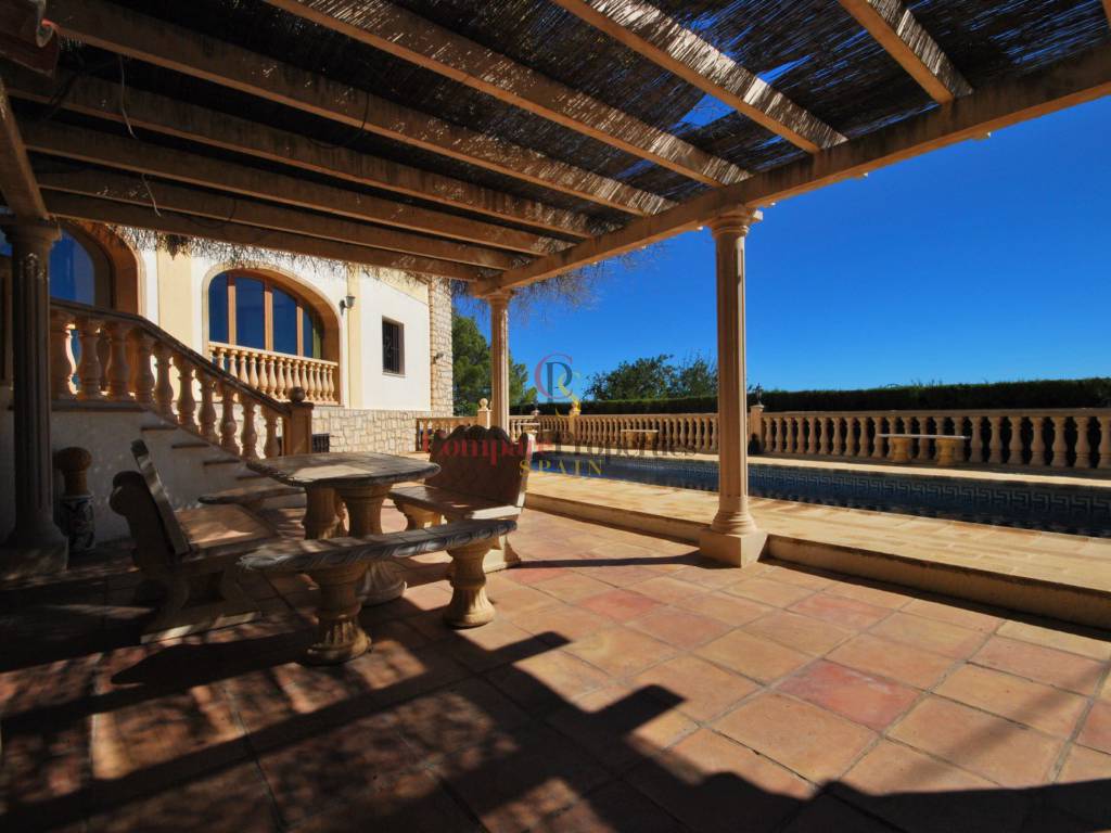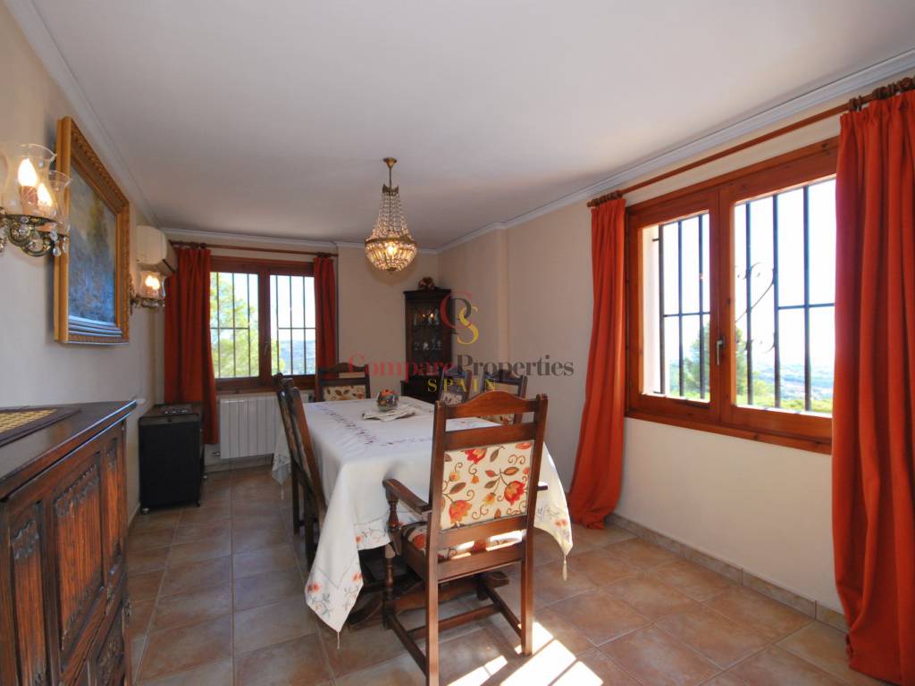 Spacious family villa located in a tranquil location and surrounded by nature, offering spectacular panoramic sea and mountain views. On 4 km from the town of Calpe and 12 km from the town of Benissa. The villa consists of the entry hall, living room, dining room (or possible 5th bedroom), kitchen, bedroom, bathroom, shower/toilet and covered terrace. Upstairs 3 large bedrooms, 3 bathrooms (2 en-suite), open study room and balcony. In the underbuild a garage and 2 large storage rooms. Outside a 12x4m pool, bar / summer kitchen, ample terracing, driveway and automatic gate. Central heating on gas and air conditioning.