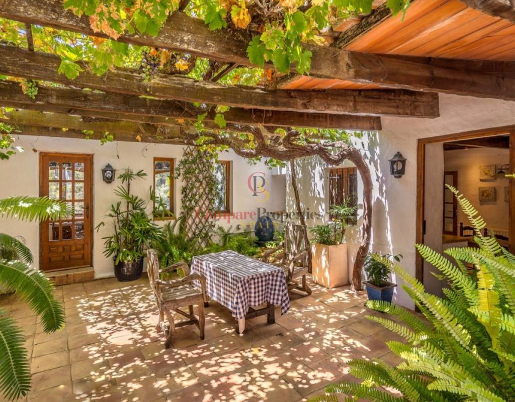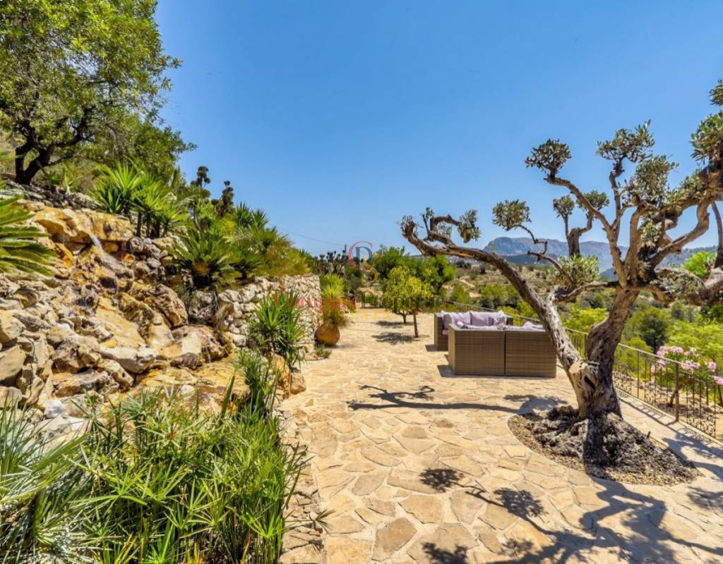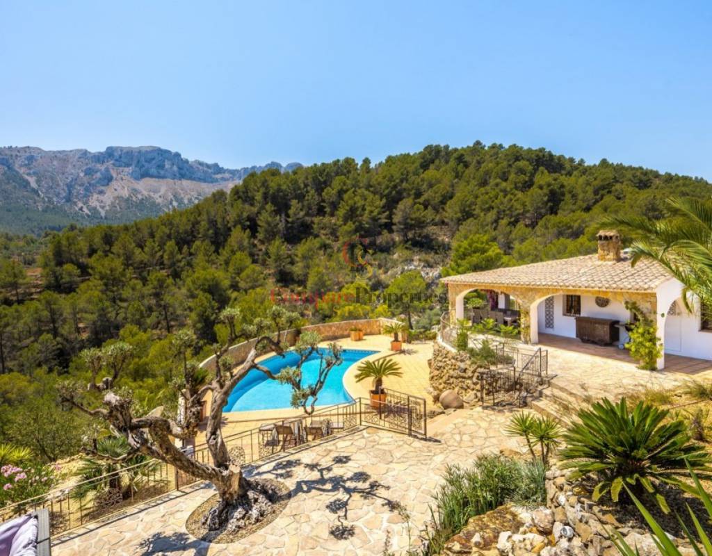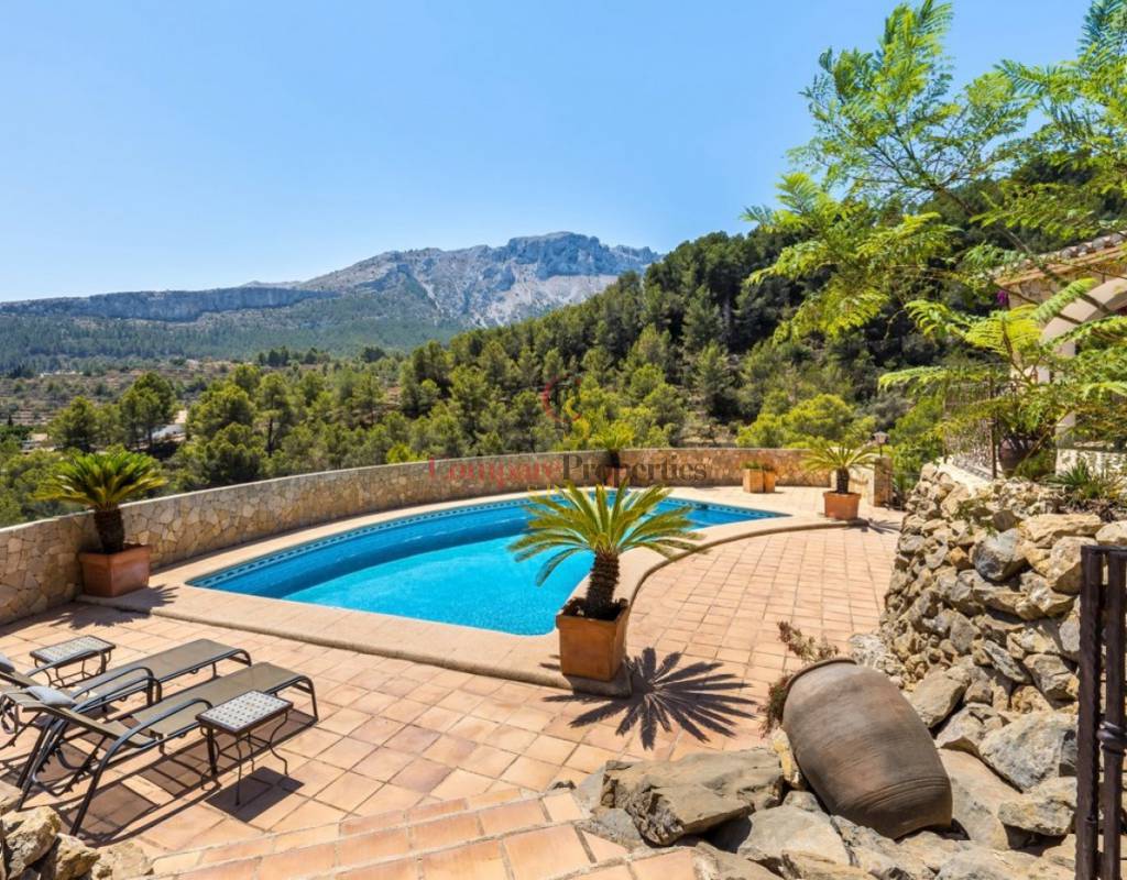 UTTERLY CHARMING COUNTRY HOUSE FOR SALE IN PINOS, TRADITIONAL FINCA BEAUTIFULLY RESTORED TO THE HIGHEST QUALITY AND TASTE.. . Ideal family residence that has been renovated into a stylish luxury property preserving many of the original features and using only the highest quality materials. Featuring the marble clad kitchen, a very large spacious lounge, glazed naya, totally private 10x5m curved shaped pool, five large double bedrooms and five bathrooms set on a rural plot of over 28 thousand square metres nestled in the valley beside the Sierra de Bernia mountain range. Landscaped gardens around the house with many different seating areas to enjoy the sun or shade all year round whilst taking in the breathtaking views that surround. There is also a separate outbuilding that would make an ideal office or studio with a large window also giving unrivalled views across the valley.. . The ground floor features the courtyard, the kitchen straight from a magazine, the generous lounge, separate dining room, three of the bedrooms two with en-suite bathrooms and one with separate door to another terrace, glazed naya and the large terrace looking out over the pool. A few steps down to the separate pool terrace below.. . On the upper floor is the master bedroom with own private terrace and the fifth bedroom, both with en-suite bathrooms and all 5 bedrooms have large fitted wardrobes. . . An ample area around the house has been very tastefully landscaped in keeping with the local area with mature native plants and trees, many seating areas and terraces, a log fired bread oven and a feature water-fall only adding to the beauty all around. Open and unrestricted views of the surrounding valleys and mountains can be enjoyed from all areas around the garden and in particular the terraces.. . The ideal getaway property for a discerning buyer seeking tranquility and a real feel of the countryside yet withing walking distance of several bars and restaurantes and only a short drive away from "civilisation!". . Viewing this property will leave you speechless.