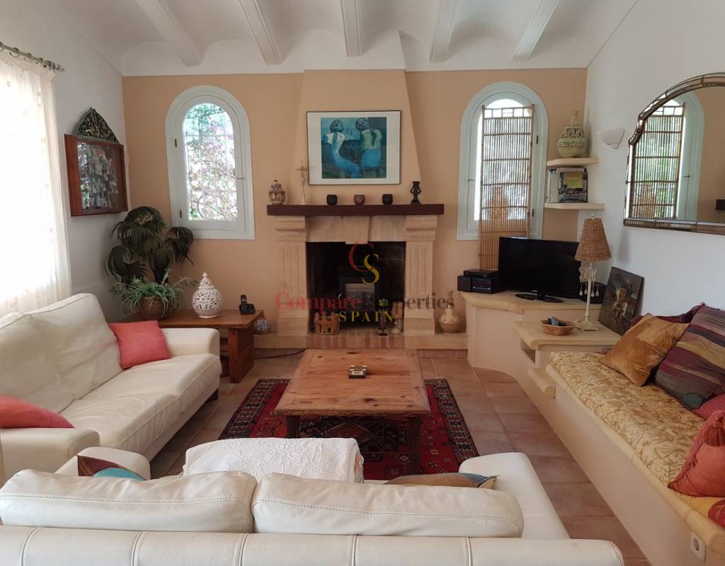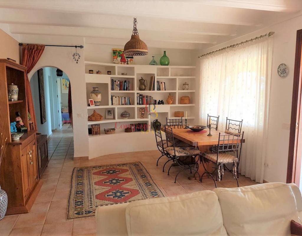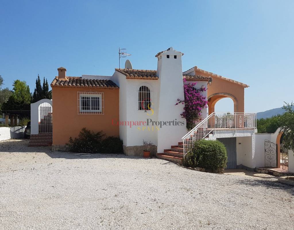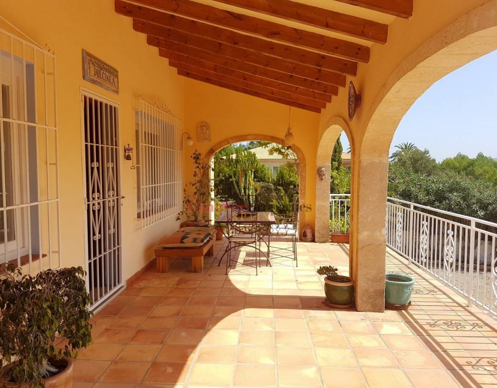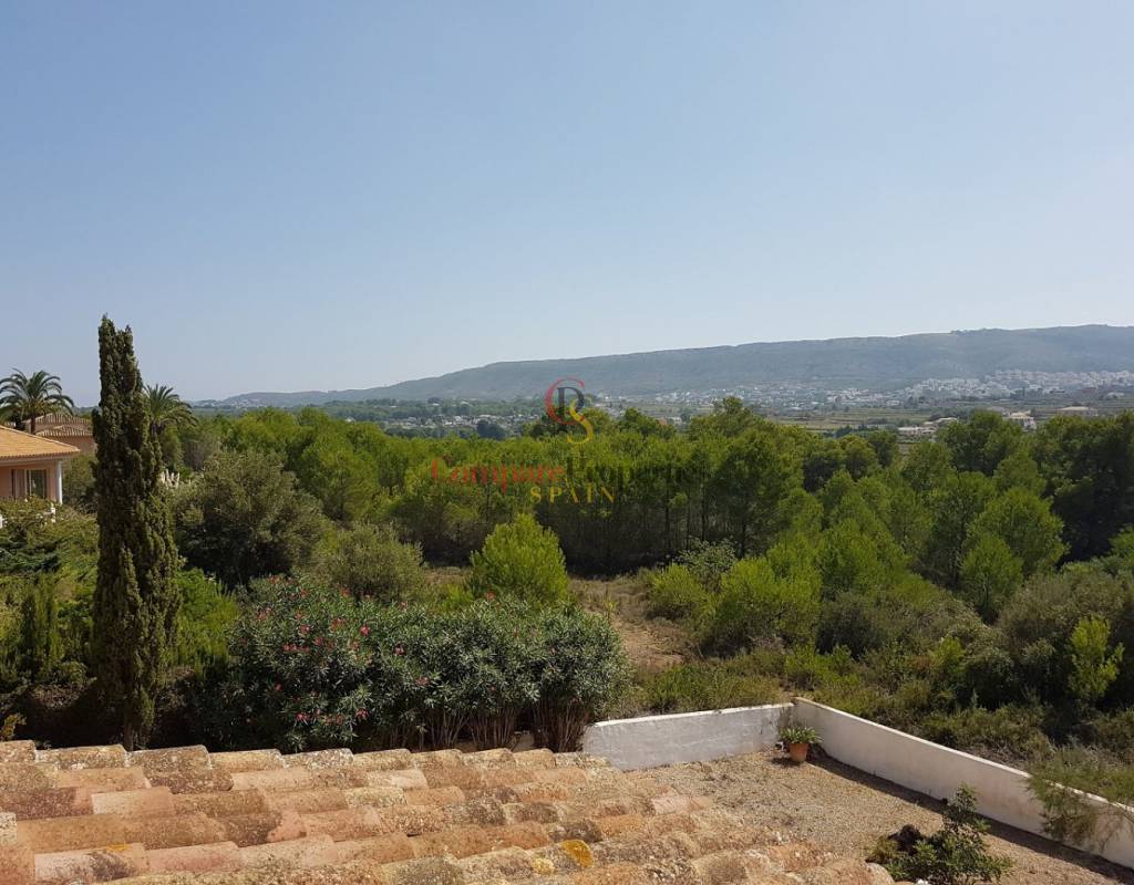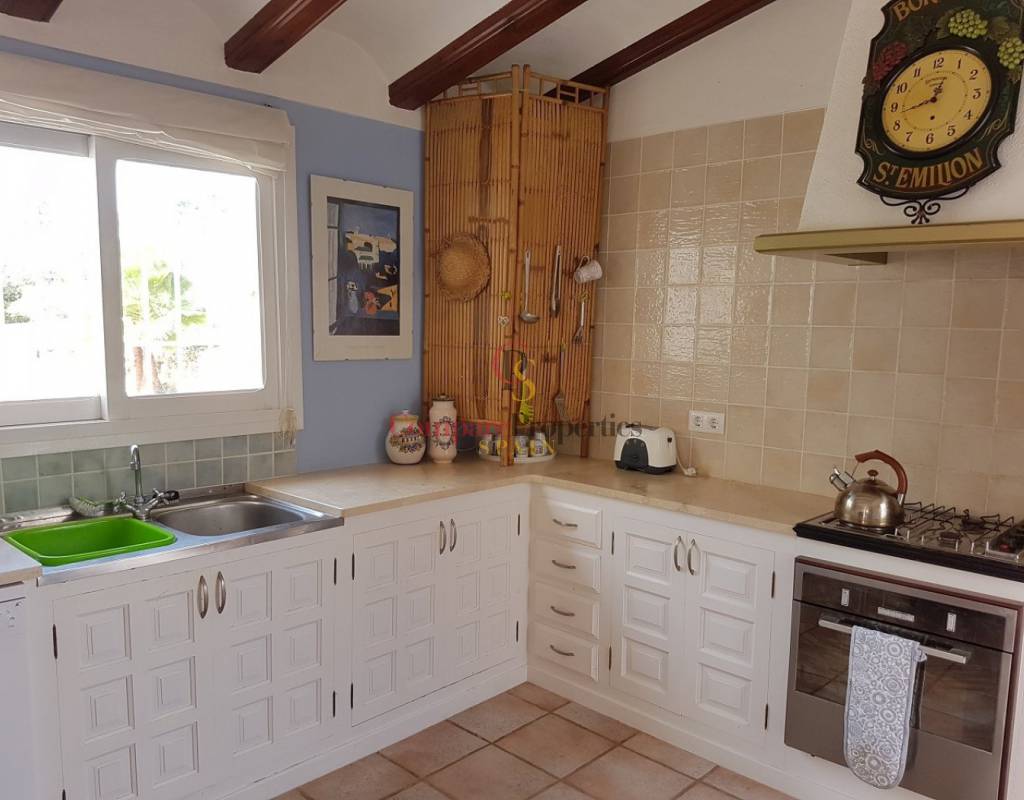 A charming, traditional style villa for sale in Javea Golf Course area, on one level, close to the Javea golf course, south facing, with lovely views over the valley and towards Benitachell village. A bright and sunny house in excellent condition, with wooden beamed ceilings throughout and lots of character, private and not overlooked. It is located in a cul de sac, in a quiet residential area and only 10 minutes by car to the Javea Arenal beach and Moraira beach and all of their amenities. Walking distance to Benitachell village and 5 minutes by car to nearby supermarkets and amenities.. . There is a spacious open naya (a covered terrace) with lovely south facing views over the valley, a cosy living room with an open fireplace (with a free-standing feature electric fire), a dining area next to the kitchen, a good sized fully fitted kitchen, three double bedrooms (the master bedroom has an en suite bathroom with a bathtub), plus a separate family shower room (with a walk-in shower).. . Outside there is a 10 metre x 5 metre swimming pool, with terracing around the pool, a pergola and an outside shower next to the pool, a garage for one car (or storage), a car port and a solarium roof terrace with lovely views over the valley.. . The large driveway has room for several cars. The garden is flat and on one level and is very easy to maintain.. . It is in an a quiet area of Javea where numerous neighbours are living all year round and where all of the neighbours have good sized gardens, giving a feeling of space between the houses and privacy. Ideal for full time living or for a holiday home which could be rented out to obtain a rental income.. . IBI / town hall tax (rates): 512 euros per year. Rubbish collection tax: 125 euros per year.. . For further information on the villa for sale Javea Golf Course, get in touch with us.