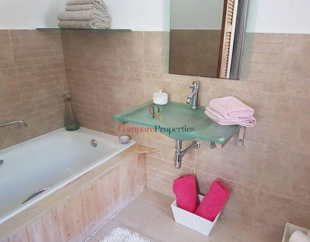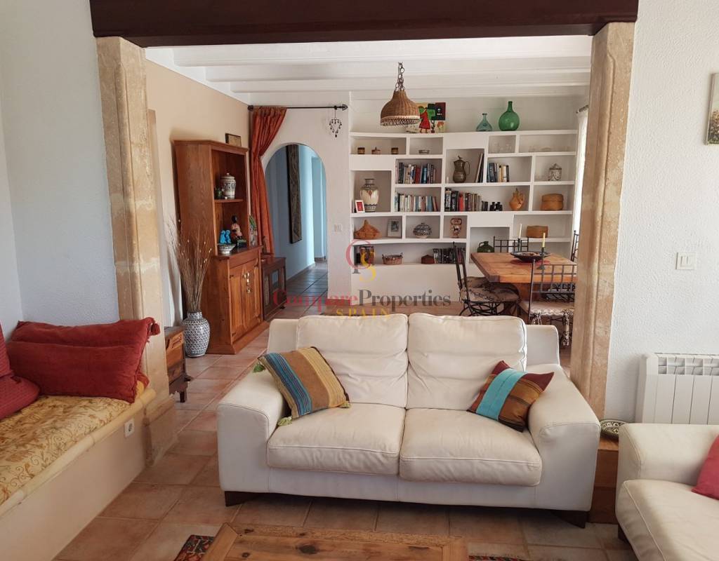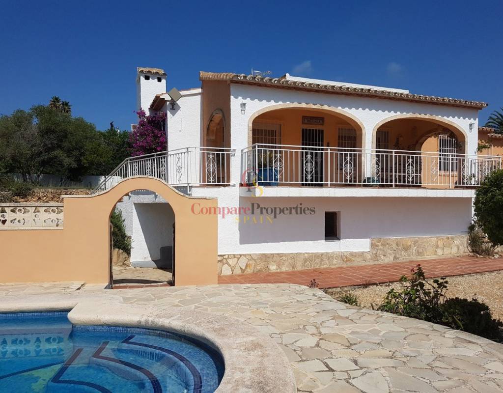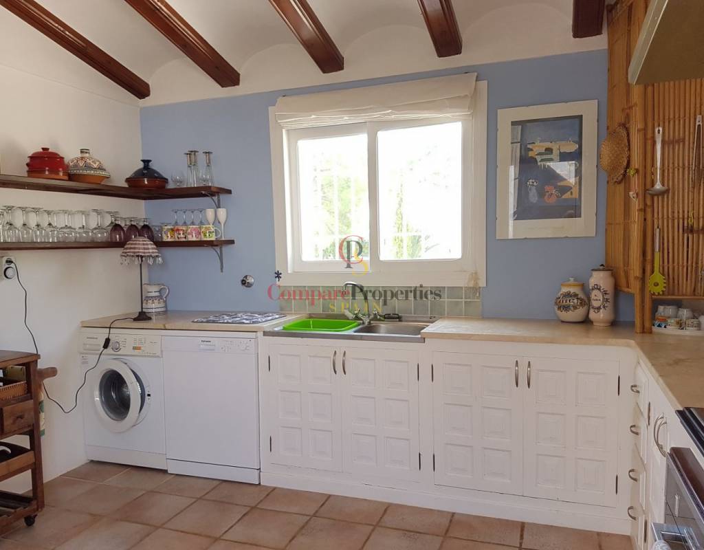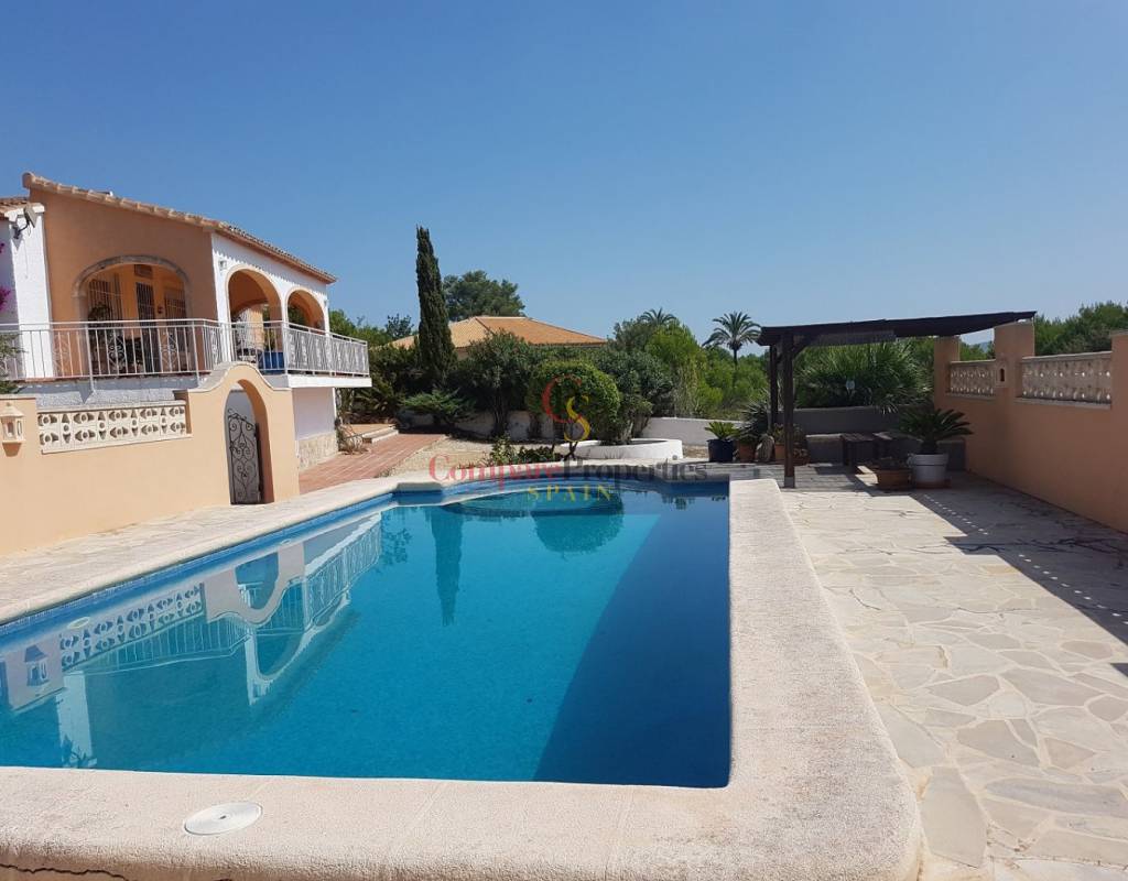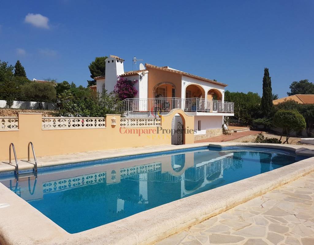 A charming, traditional style villa for sale in Javea Golf Course area, on one level, close to the Javea golf course, south facing, with lovely views over the valley and towards Benitachell village. A bright and sunny house in excellent condition, with wooden beamed ceilings throughout and lots of character, private and not overlooked. It is located in a cul de sac, in a quiet residential area and only 10 minutes by car to the Javea Arenal beach and Moraira beach and all of their amenities. Walking distance to Benitachell village and 5 minutes by car to nearby supermarkets and amenities.. . There is a spacious open naya (a covered terrace) with lovely south facing views over the valley, a cosy living room with an open fireplace (with a free-standing feature electric fire), a dining area next to the kitchen, a good sized fully fitted kitchen, three double bedrooms (the master bedroom has an en suite bathroom with a bathtub), plus a separate family shower room (with a walk-in shower).. . Outside there is a 10 metre x 5 metre swimming pool, with terracing around the pool, a pergola and an outside shower next to the pool, a garage for one car (or storage), a car port and a solarium roof terrace with lovely views over the valley.. . The large driveway has room for several cars. The garden is flat and on one level and is very easy to maintain.. . It is in an a quiet area of Javea where numerous neighbours are living all year round and where all of the neighbours have good sized gardens, giving a feeling of space between the houses and privacy. Ideal for full time living or for a holiday home which could be rented out to obtain a rental income.. . IBI / town hall tax (rates): 512 euros per year. Rubbish collection tax: 125 euros per year.. . For further information on the villa for sale Javea Golf Course, get in touch with us.