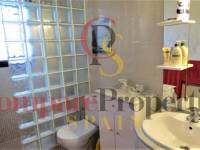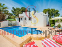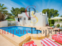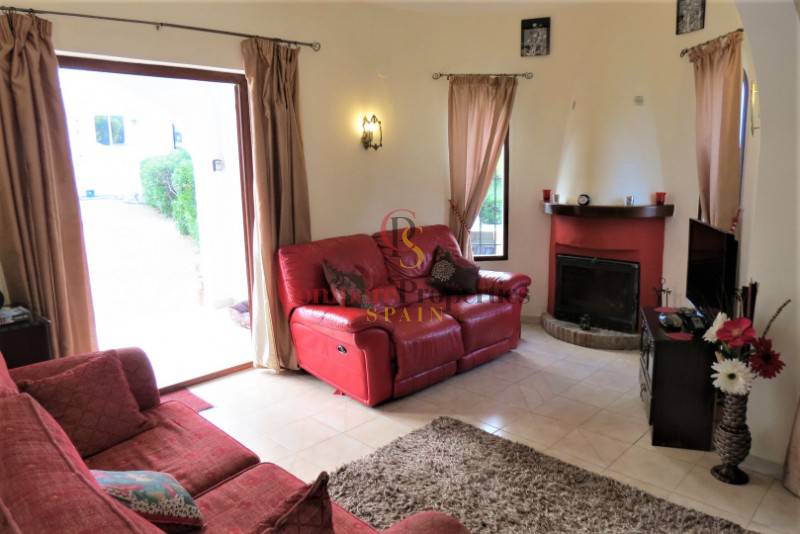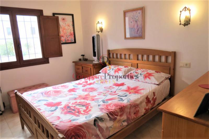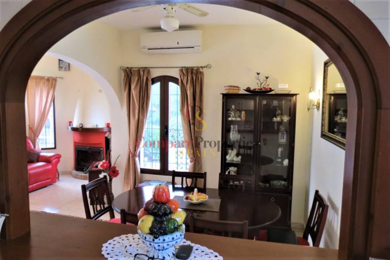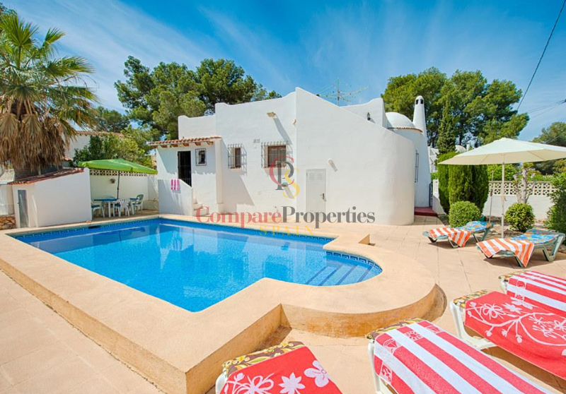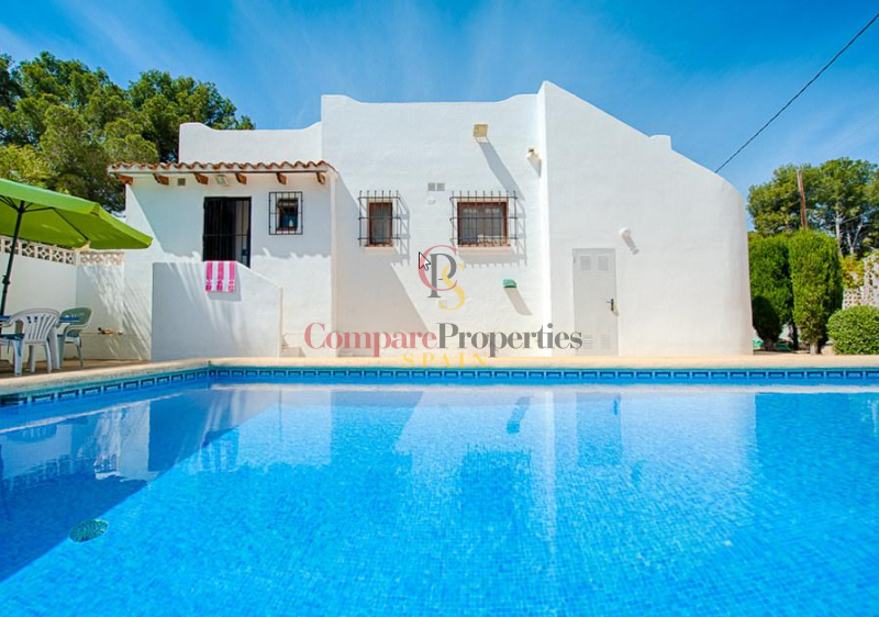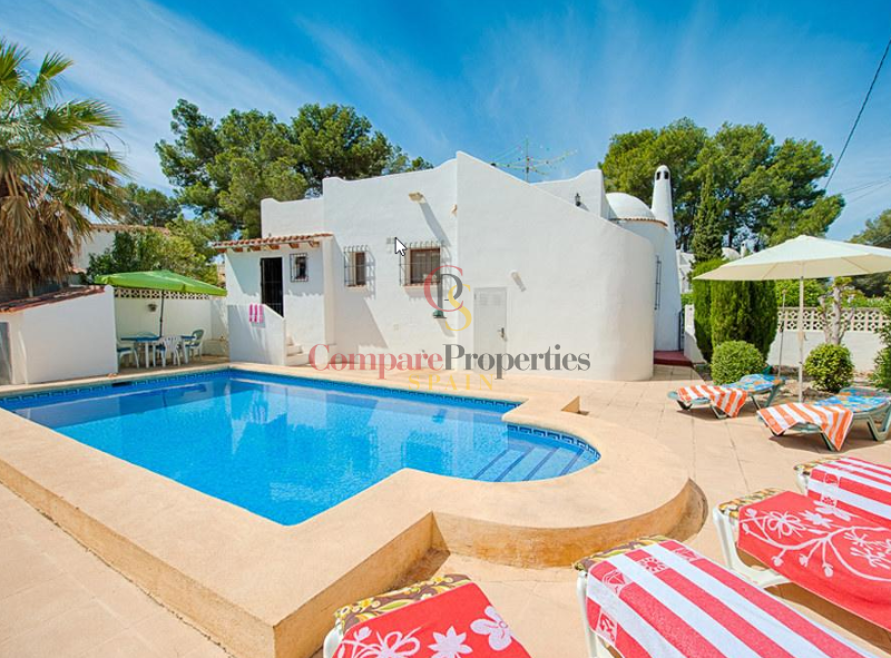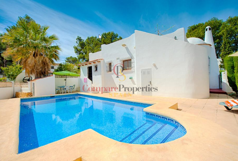 This lovely, cozy, Moorish style villa is conveniently located in the Cap Blanc area of Moraira, just a 250m walk by footpath to an international supermarket, bars and restaurants. You approach the property by a quiet residential street and there is an off-road parking place. From the parking you walk through a small communal garden and then you enter the villa through an ornate naya and then into the open plan living area. The living area has a feature fireplace with integrated wood-burner and an area of high ceiling under the domed roof. The dining area is located next to the kitchen with an arched serving opening between them. The kitchen was installed in 2017, and includes light coloured units, Blue Pearl granite worktops, oven, gas hob, extractor, integrated dishwasher and fridge/freezer. Next to the kitchen there is a hallway which includes the house bathroom with walk-in shower, two double bedrooms with built-in wardrobes and at the end of the hall the master bedroom which has an en-suite walk-in shower, toilet and basin, and a door which gives access to the pool terrace. The pool terrace includes a 8 x 4m pool and has ample space for alfresco dining and sun loungers, off the pool terrace there is a storage cupboard containing the water heater and washing machine, the pool pump house and a covered wood store. At the front of the house there is a barbecue area and the garden that surrounds the villa is easy maintenance. At the side of the villa there is an external staircase taking you up to a large roof terrace where there is sun all day.- Key points:- This villa is one of four villas sharing a large communal plot, three of these villas have a pool and the fourth has space for a pool- The pool area for this villa is gated- Quiet and green area- Built 1989- Well maintained- Air conditioning hot/cold in the living room- Wood-burner in the living room- Double glazed windows in the living room- Wooden shutters on the bedroom windows- Furniture included- Telephone, internet and satellite television all available- No community charges- Annual taxes 492€- 1.8km to the closest beach- 2.7km to the golf course- 3.6km to the town and beaches of Moraira- 14 minutes drive to the motorway access in Benissa town- Do not delay your visit to this property !
