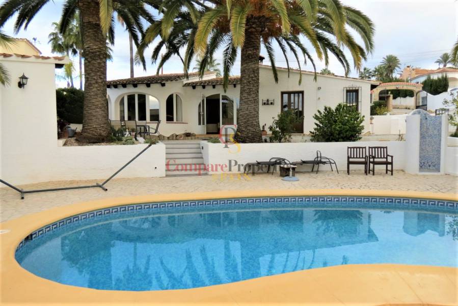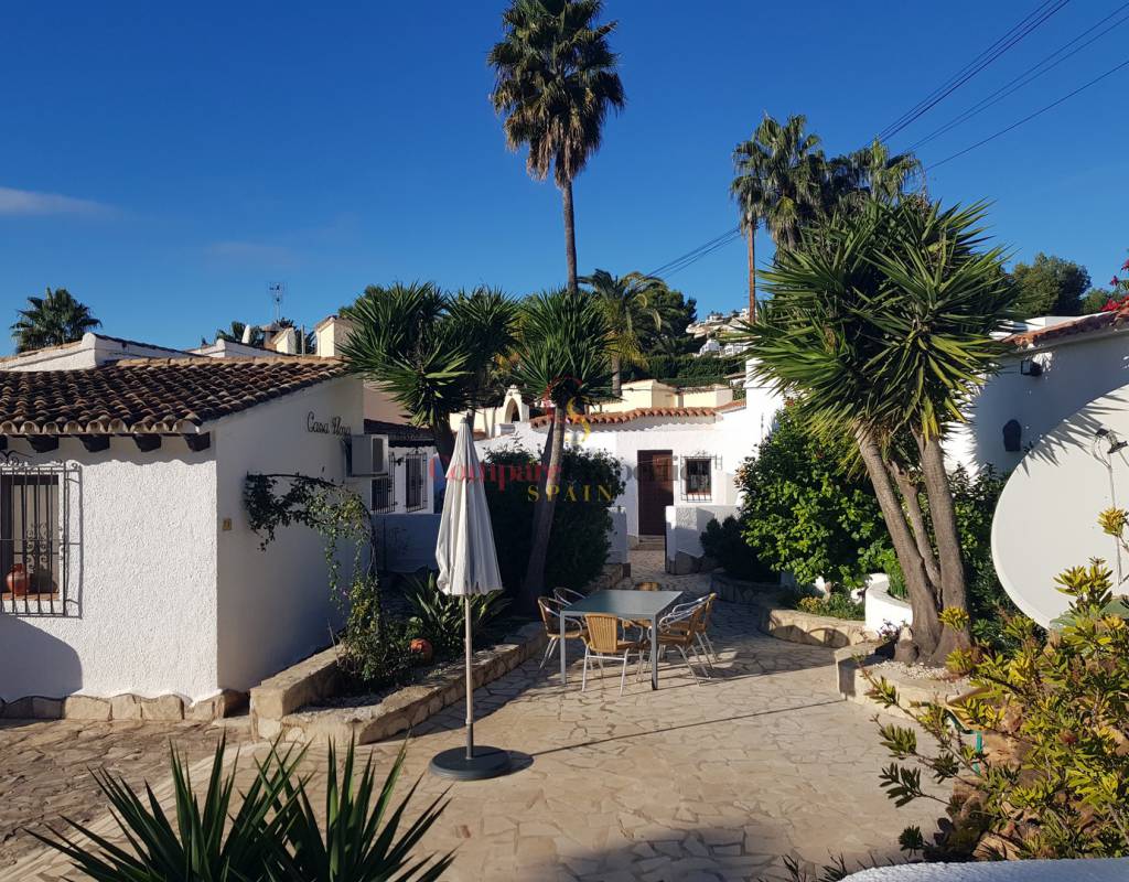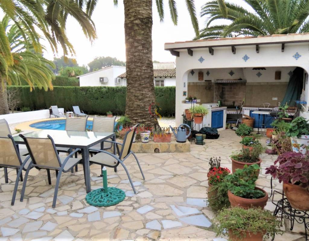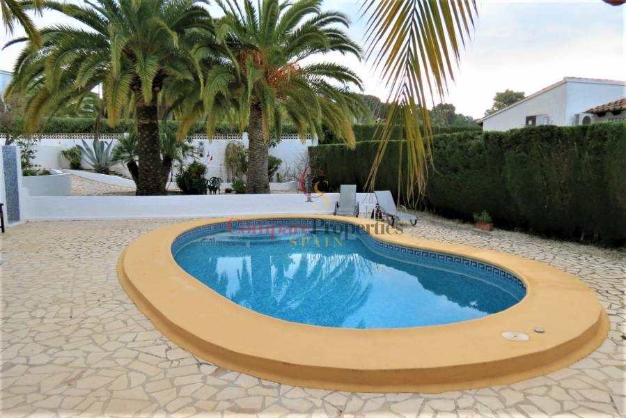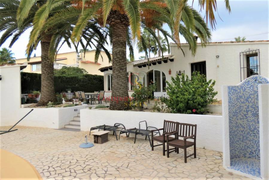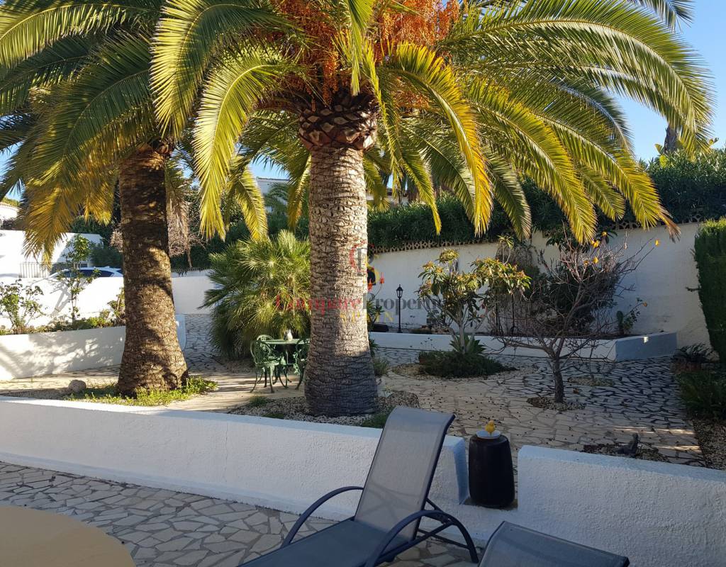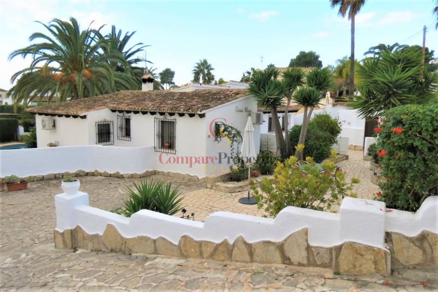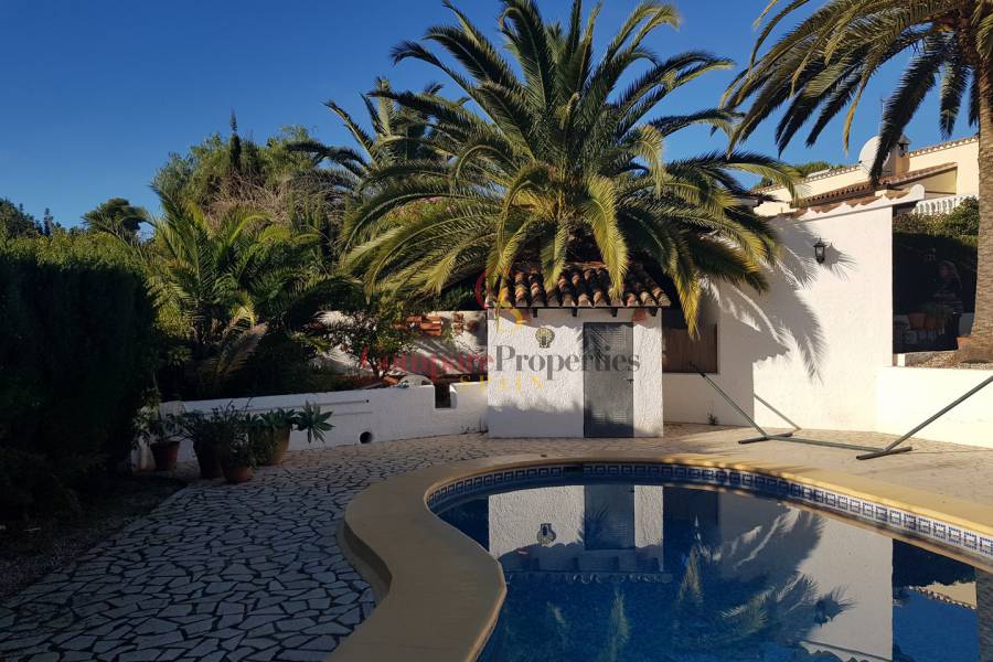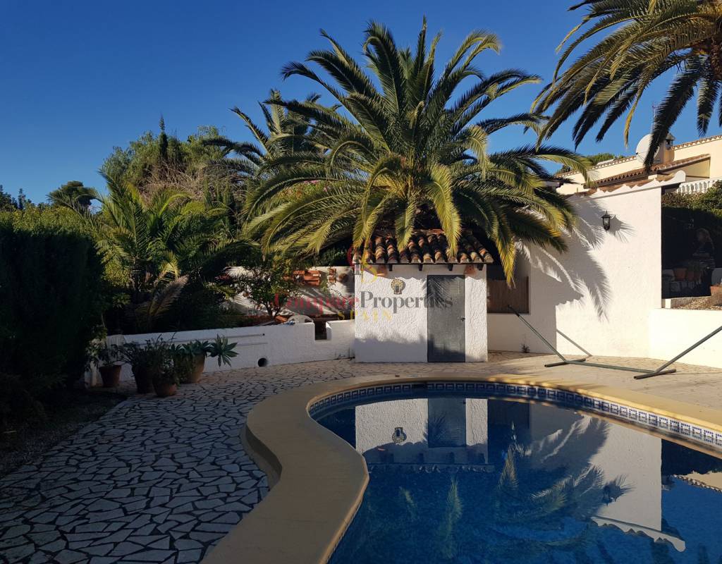 This lovely "all on one level" villa is for sale in La Sabatera, walking distance to a small shopping centre. This well maintained property is situated in a quiet residential street only 2.6km to the beaches, marina and town centre of Moraira. You enter the gated driveway into a parking area for 3-4 cars with a garage located underneath the off-road parking place at street level. The property has a beautiful mature garden with many seating areas around the villa. You enter the villa into a small glazed naya looking out over the garden and pool and then enter a spacious L-shaped living/dining room with a corner fireplace and integrated wood-burner in the dining area. At the back of the living room there is a superb fully fitted kitchen, four years old, with white units and black granite worktops, with a door leading into the garden. Off the dining area there is a small hallway, here you will find bedroom 3 which is the smallest with a freestanding wardrobe, bedroom 2 which has built-in wardrobes and the house bathroom which includes a vanity unit and a bath including shower attachment. At the end of the hallway is the large master bedroom which has freestanding wardrobes, a dressing area, an en-suite shower room with vanity unit and glass doors leading out into the terrace. Externally the property has a private pool terrace with pool shower, an easy maintenance garden with palms and fruit trees, a summer kitchen with alfresco dining area, a barbecue area with dining terrace, a large storeroom, a covered wood storage area under the gas bottle casita at street level and a boiler room. - Key points:- Built: 1978 and well maintained- Total construction: 154m2, to be confirmed- Plot: 1050m2- Orientation: South- Insulated roof- Double glazed windows- Gas central heating- Air conditioning in the living room, bedroom 2 and the master bedroom- Renovated bathrooms- Renovated kitchen includes gas hob, extractor, integrated dishwasher, integrated fridge/freezer, single oven, concealed microwave and lots of storage space- Internet and satellite television available- Furniture negotiable- Annual taxes to follow- This beautiful villa will sell fast, do not miss this opportunity!- There is also a Nissan car available to purchase