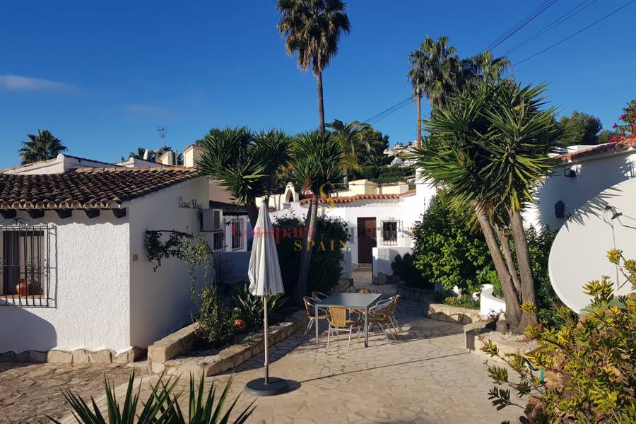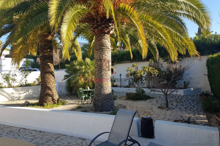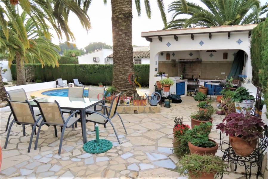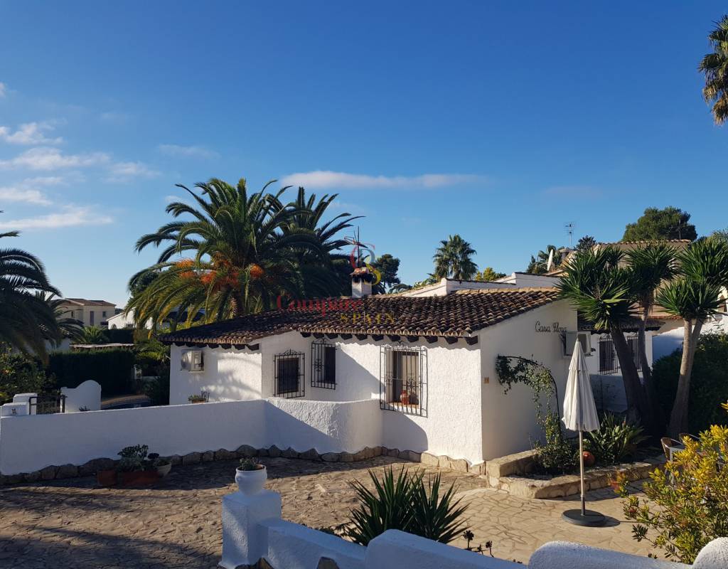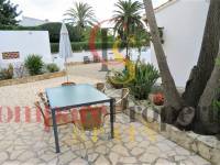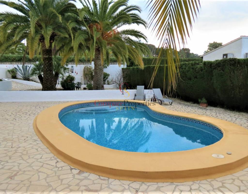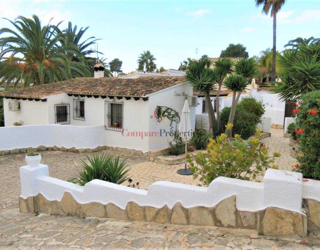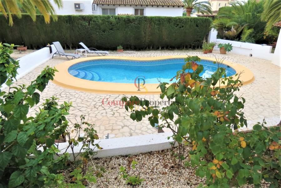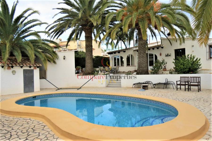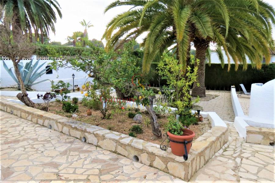 This lovely "all on one level" villa is for sale in La Sabatera, walking distance to a small shopping centre. This well maintained property is situated in a quiet residential street only 2.6km to the beaches, marina and town centre of Moraira. You enter the gated driveway into a parking area for 3-4 cars with a garage located underneath the off-road parking place at street level. The property has a beautiful mature garden with many seating areas around the villa. You enter the villa into a small glazed naya looking out over the garden and pool and then enter a spacious L-shaped living/dining room with a corner fireplace and integrated wood-burner in the dining area. At the back of the living room there is a superb fully fitted kitchen, four years old, with white units and black granite worktops, with a door leading into the garden. Off the dining area there is a small hallway, here you will find bedroom 3 which is the smallest with a freestanding wardrobe, bedroom 2 which has built-in wardrobes and the house bathroom which includes a vanity unit and a bath including shower attachment. At the end of the hallway is the large master bedroom which has freestanding wardrobes, a dressing area, an en-suite shower room with vanity unit and glass doors leading out into the terrace. Externally the property has a private pool terrace with pool shower, an easy maintenance garden with palms and fruit trees, a summer kitchen with alfresco dining area, a barbecue area with dining terrace, a large storeroom, a covered wood storage area under the gas bottle casita at street level and a boiler room. - Key points:- Built: 1978 and well maintained- Total construction: 154m2, to be confirmed- Plot: 1050m2- Orientation: South- Insulated roof- Double glazed windows- Gas central heating- Air conditioning in the living room, bedroom 2 and the master bedroom- Renovated bathrooms- Renovated kitchen includes gas hob, extractor, integrated dishwasher, integrated fridge/freezer, single oven, concealed microwave and lots of storage space- Internet and satellite television available- Furniture negotiable- Annual taxes to follow- This beautiful villa will sell fast, do not miss this opportunity!- There is also a Nissan car available to purchase