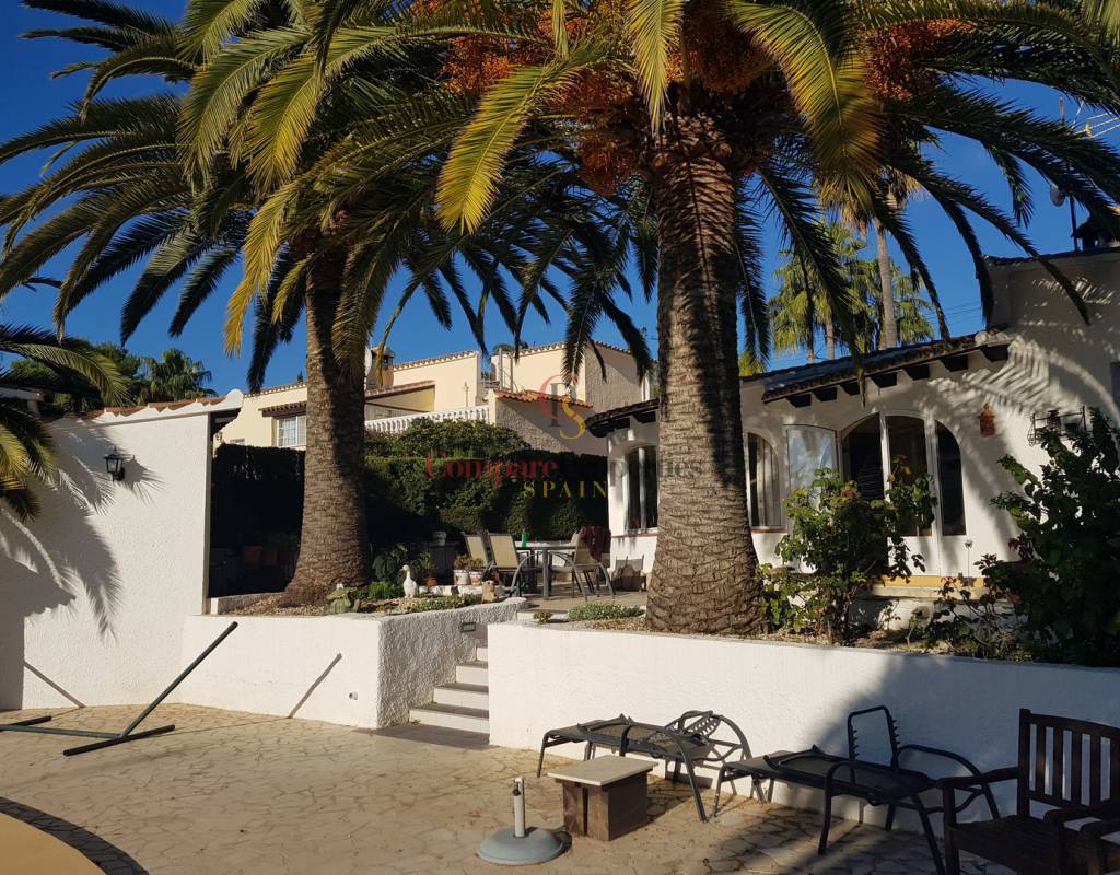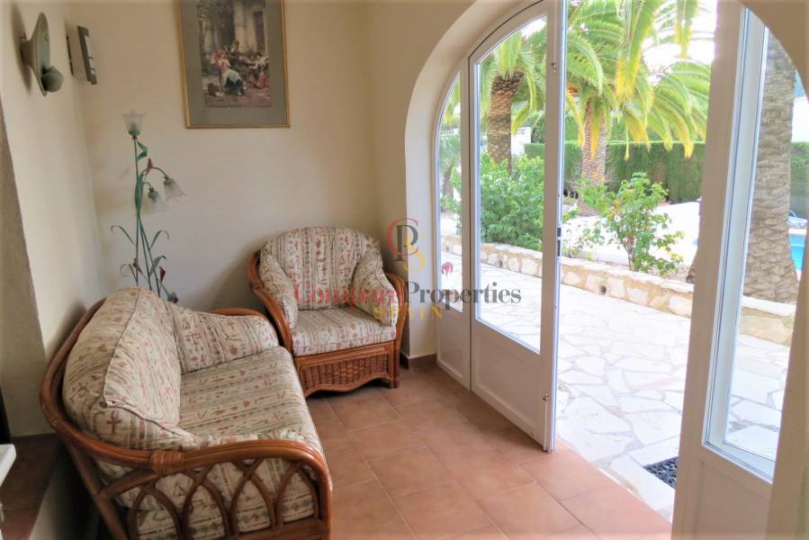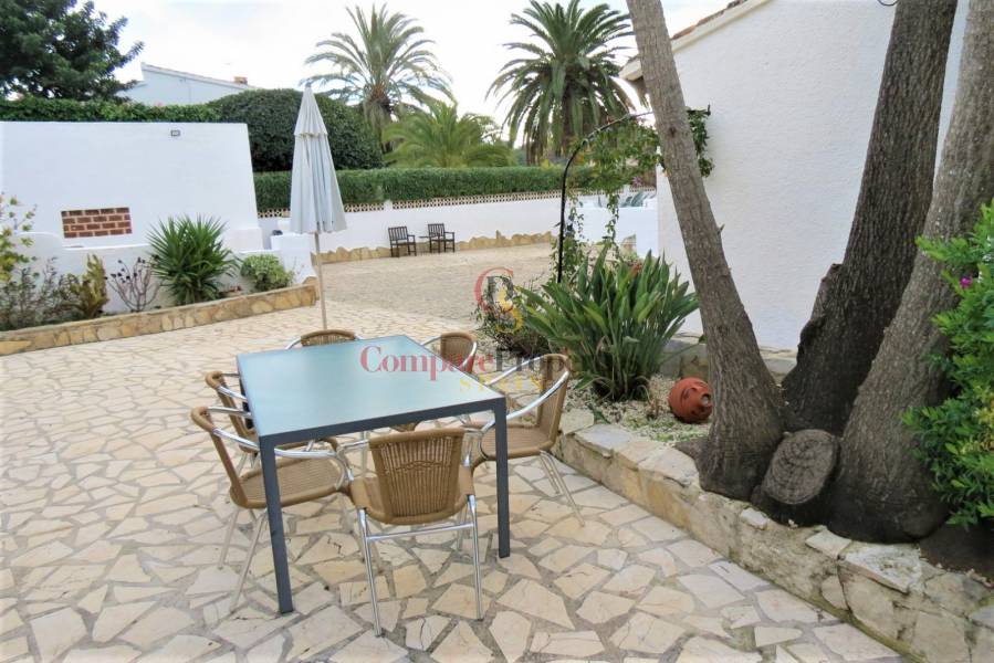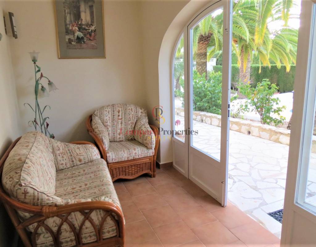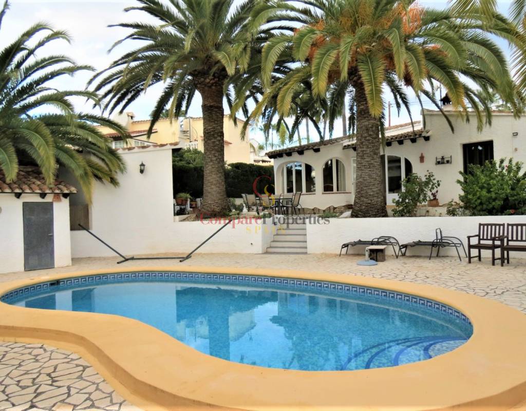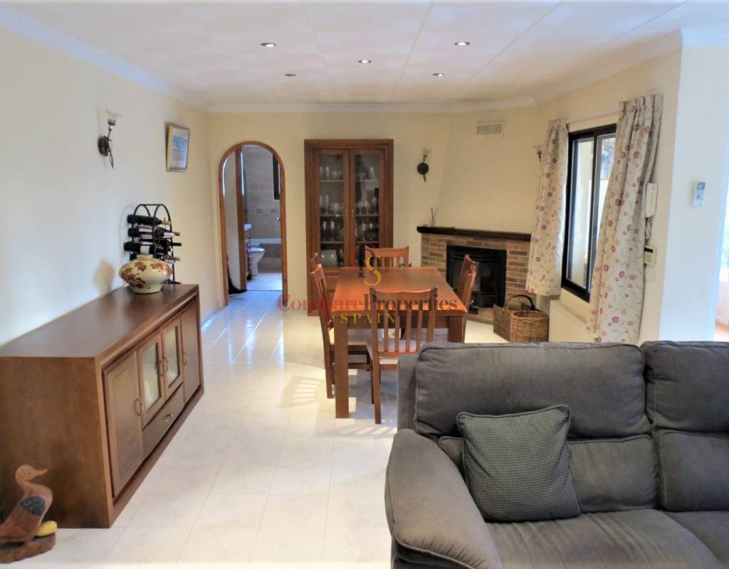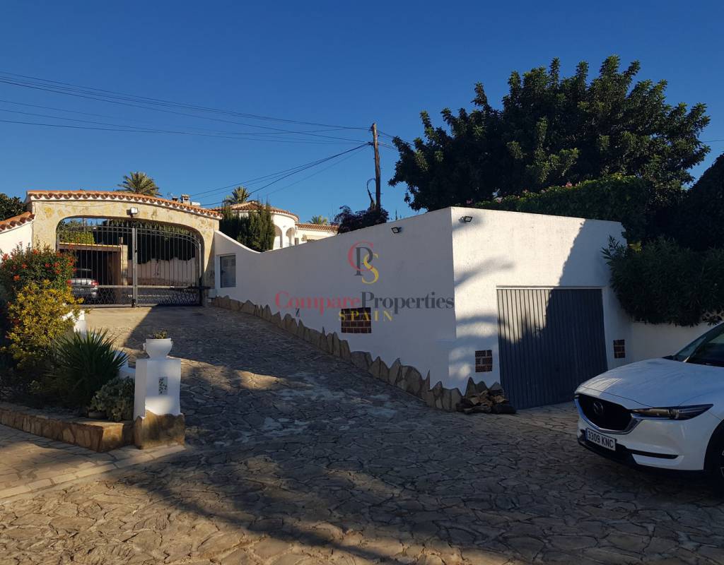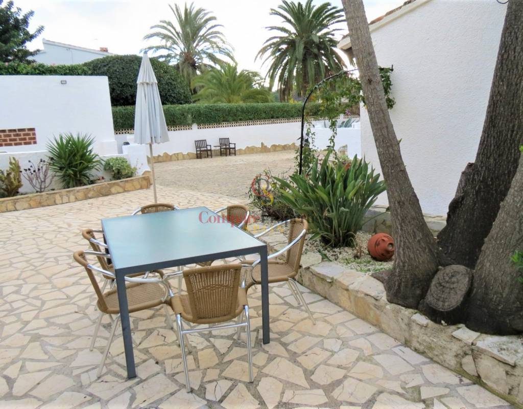 This lovely "all on one level" villa is for sale in La Sabatera, walking distance to a small shopping centre. This well maintained property is situated in a quiet residential street only 2.6km to the beaches, marina and town centre of Moraira. You enter the gated driveway into a parking area for 3-4 cars with a garage located underneath the off-road parking place at street level. The property has a beautiful mature garden with many seating areas around the villa. You enter the villa into a small glazed naya looking out over the garden and pool and then enter a spacious L-shaped living/dining room with a corner fireplace and integrated wood-burner in the dining area. At the back of the living room there is a superb fully fitted kitchen, four years old, with white units and black granite worktops, with a door leading into the garden. Off the dining area there is a small hallway, here you will find bedroom 3 which is the smallest with a freestanding wardrobe, bedroom 2 which has built-in wardrobes and the house bathroom which includes a vanity unit and a bath including shower attachment. At the end of the hallway is the large master bedroom which has freestanding wardrobes, a dressing area, an en-suite shower room with vanity unit and glass doors leading out into the terrace. Externally the property has a private pool terrace with pool shower, an easy maintenance garden with palms and fruit trees, a summer kitchen with alfresco dining area, a barbecue area with dining terrace, a large storeroom, a covered wood storage area under the gas bottle casita at street level and a boiler room. - Key points:- Built: 1978 and well maintained- Total construction: 154m2, to be confirmed- Plot: 1050m2- Orientation: South- Insulated roof- Double glazed windows- Gas central heating- Air conditioning in the living room, bedroom 2 and the master bedroom- Renovated bathrooms- Renovated kitchen includes gas hob, extractor, integrated dishwasher, integrated fridge/freezer, single oven, concealed microwave and lots of storage space- Internet and satellite television available- Furniture negotiable- Annual taxes to follow- This beautiful villa will sell fast, do not miss this opportunity!- There is also a Nissan car available to purchase
