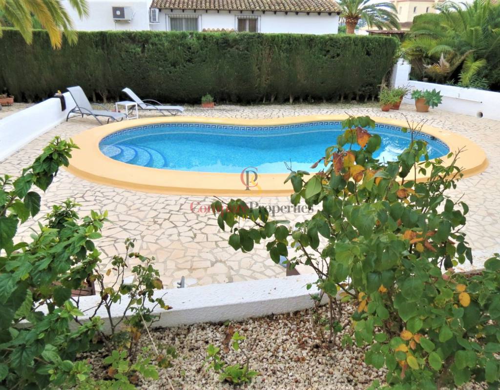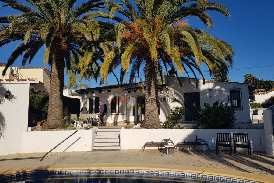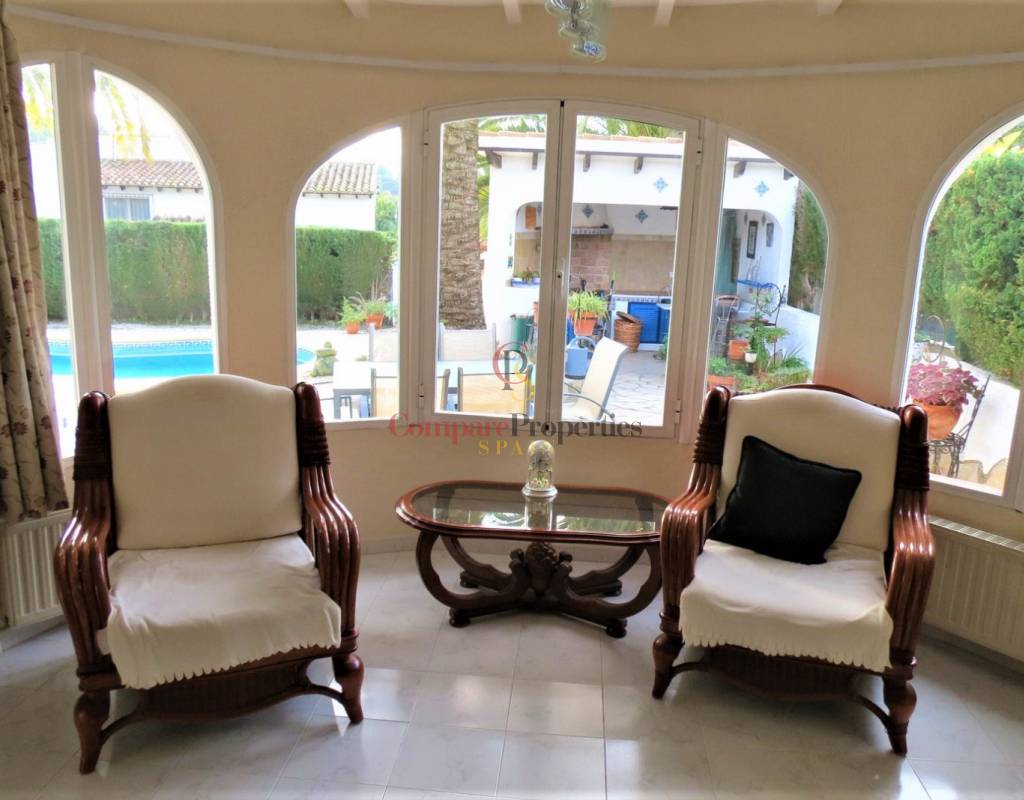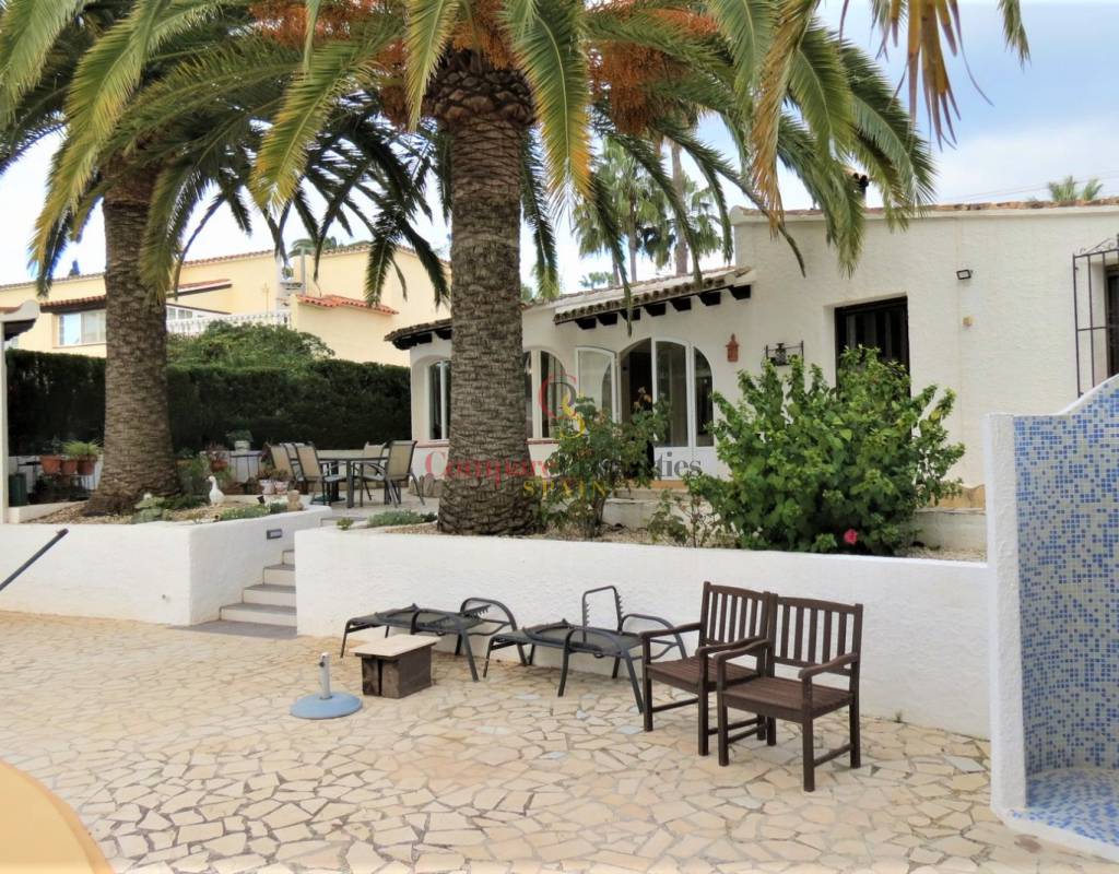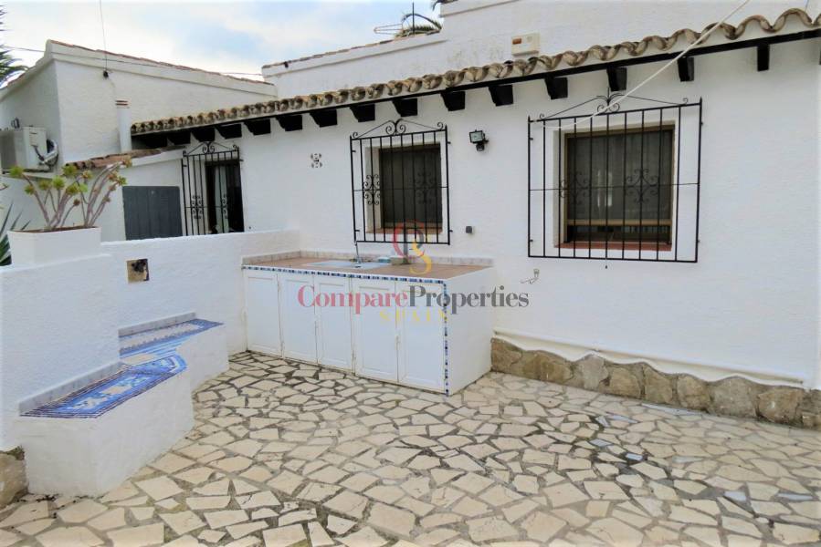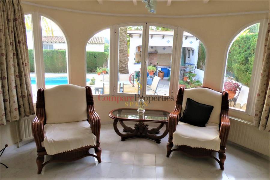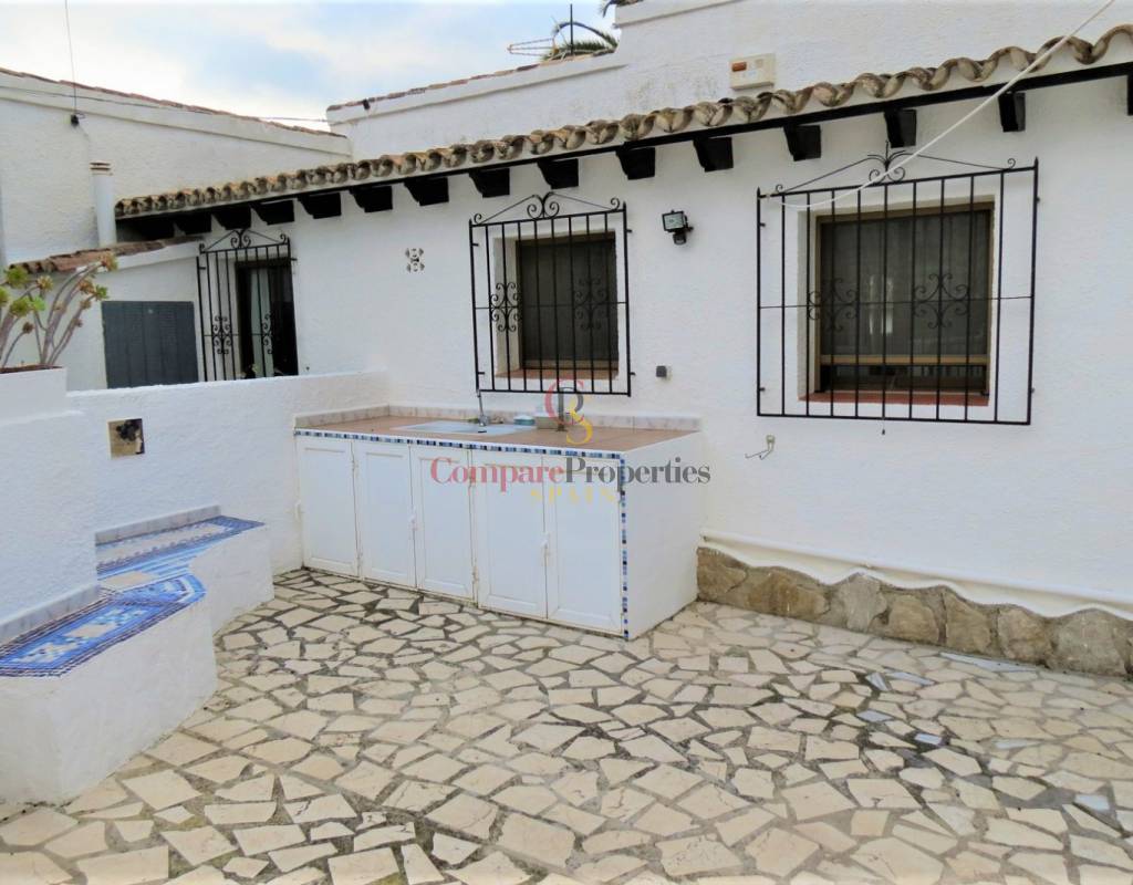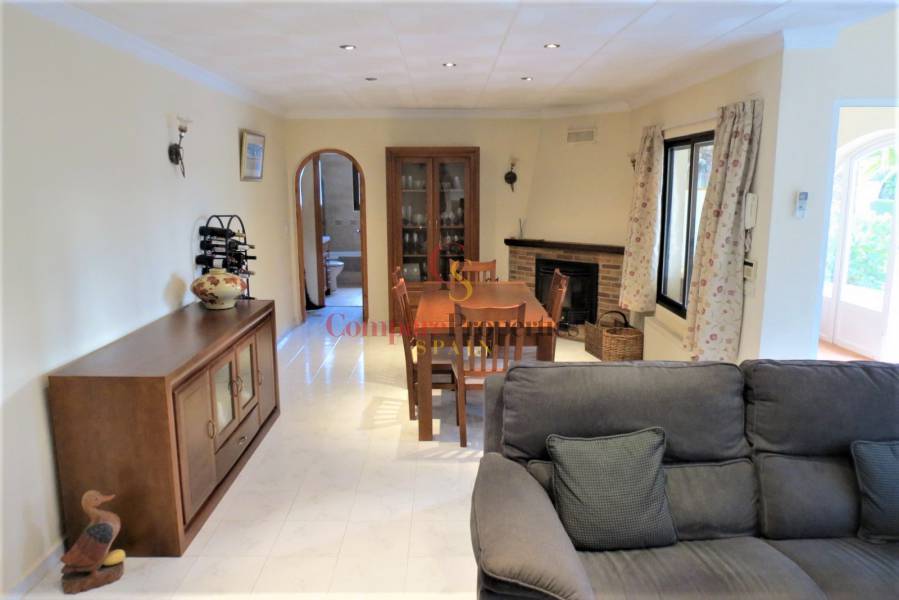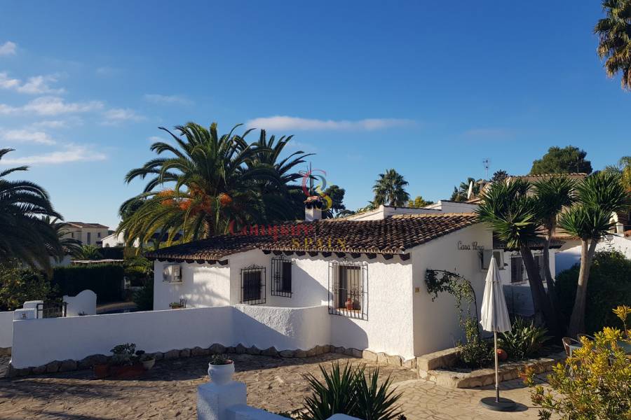 This lovely "all on one level" villa is for sale in La Sabatera, walking distance to a small shopping centre. This well maintained property is situated in a quiet residential street only 2.6km to the beaches, marina and town centre of Moraira. You enter the gated driveway into a parking area for 3-4 cars with a garage located underneath the off-road parking place at street level. The property has a beautiful mature garden with many seating areas around the villa. You enter the villa into a small glazed naya looking out over the garden and pool and then enter a spacious L-shaped living/dining room with a corner fireplace and integrated wood-burner in the dining area. At the back of the living room there is a superb fully fitted kitchen, four years old, with white units and black granite worktops, with a door leading into the garden. Off the dining area there is a small hallway, here you will find bedroom 3 which is the smallest with a freestanding wardrobe, bedroom 2 which has built-in wardrobes and the house bathroom which includes a vanity unit and a bath including shower attachment. At the end of the hallway is the large master bedroom which has freestanding wardrobes, a dressing area, an en-suite shower room with vanity unit and glass doors leading out into the terrace. Externally the property has a private pool terrace with pool shower, an easy maintenance garden with palms and fruit trees, a summer kitchen with alfresco dining area, a barbecue area with dining terrace, a large storeroom, a covered wood storage area under the gas bottle casita at street level and a boiler room. - Key points:- Built: 1978 and well maintained- Total construction: 154m2, to be confirmed- Plot: 1050m2- Orientation: South- Insulated roof- Double glazed windows- Gas central heating- Air conditioning in the living room, bedroom 2 and the master bedroom- Renovated bathrooms- Renovated kitchen includes gas hob, extractor, integrated dishwasher, integrated fridge/freezer, single oven, concealed microwave and lots of storage space- Internet and satellite television available- Furniture negotiable- Annual taxes to follow- This beautiful villa will sell fast, do not miss this opportunity!- There is also a Nissan car available to purchase