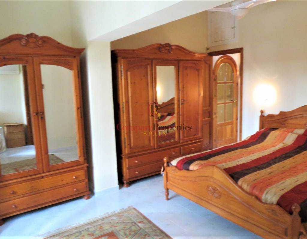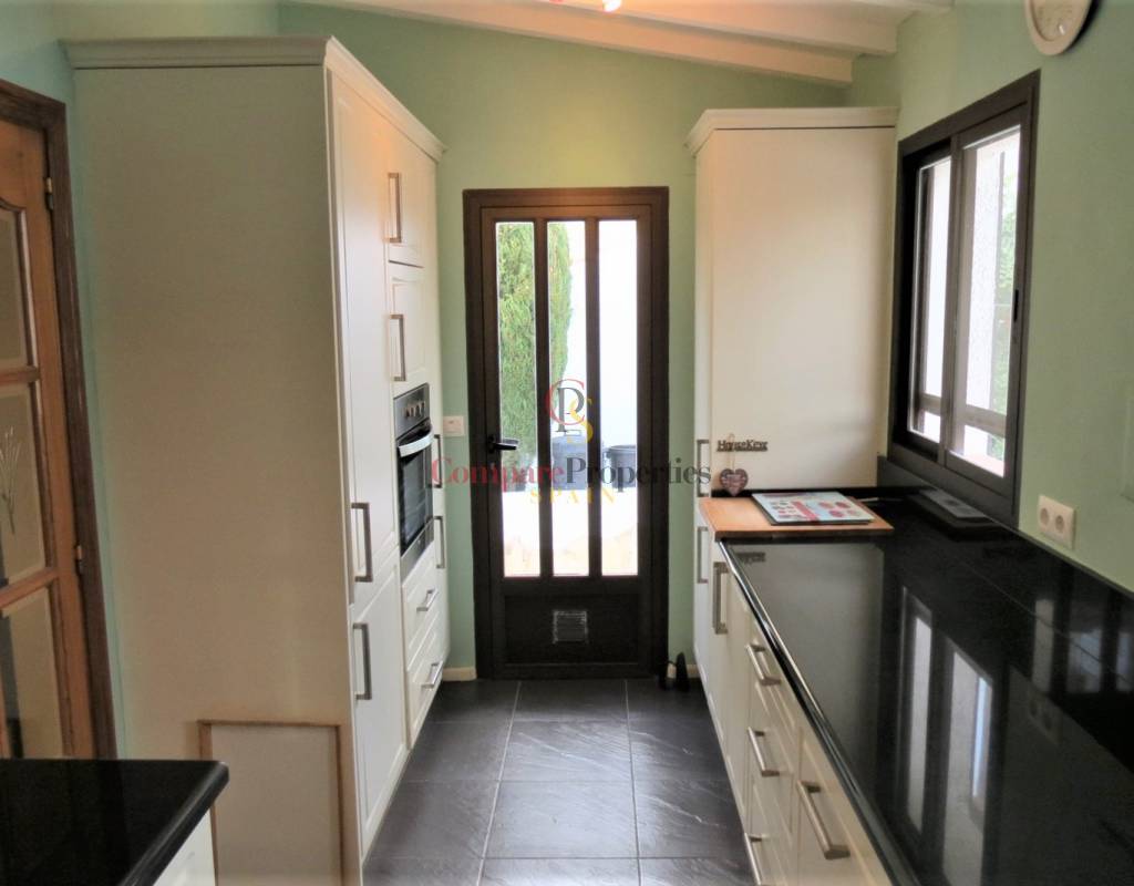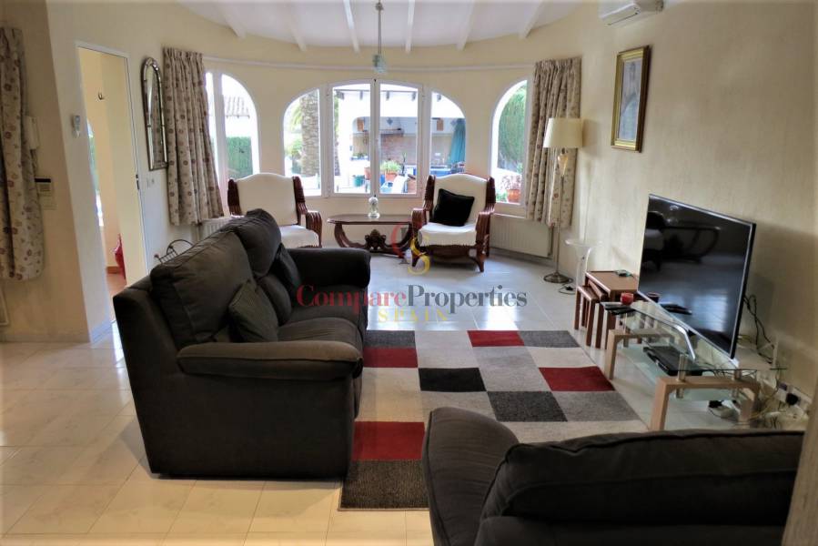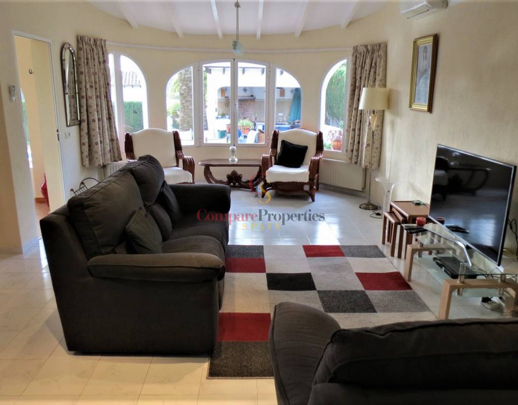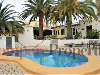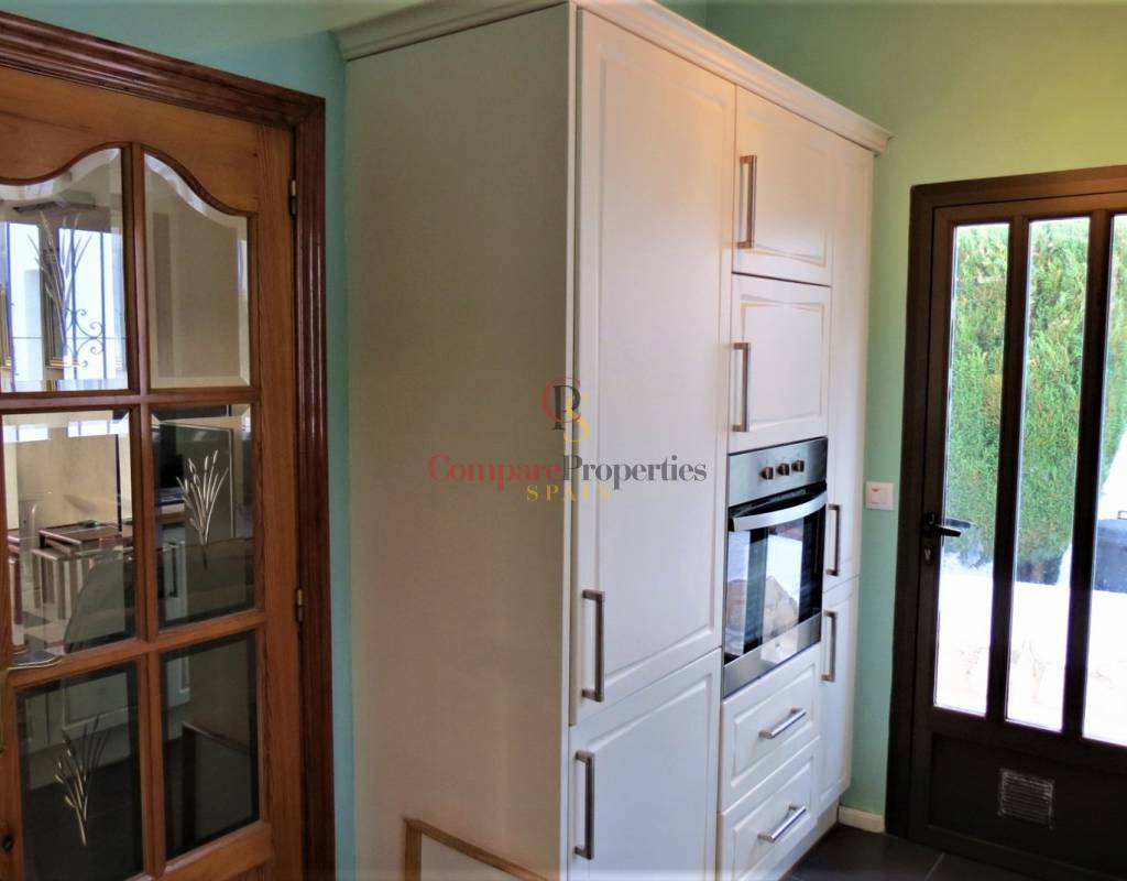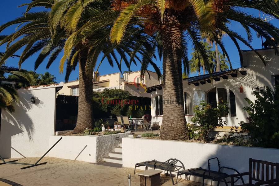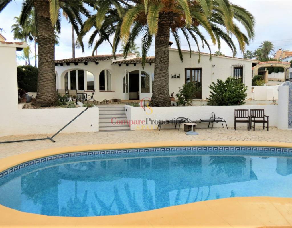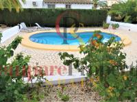 This lovely "all on one level" villa is for sale in La Sabatera, walking distance to a small shopping centre. This well maintained property is situated in a quiet residential street only 2.6km to the beaches, marina and town centre of Moraira. You enter the gated driveway into a parking area for 3-4 cars with a garage located underneath the off-road parking place at street level. The property has a beautiful mature garden with many seating areas around the villa. You enter the villa into a small glazed naya looking out over the garden and pool and then enter a spacious L-shaped living/dining room with a corner fireplace and integrated wood-burner in the dining area. At the back of the living room there is a superb fully fitted kitchen, four years old, with white units and black granite worktops, with a door leading into the garden. Off the dining area there is a small hallway, here you will find bedroom 3 which is the smallest with a freestanding wardrobe, bedroom 2 which has built-in wardrobes and the house bathroom which includes a vanity unit and a bath including shower attachment. At the end of the hallway is the large master bedroom which has freestanding wardrobes, a dressing area, an en-suite shower room with vanity unit and glass doors leading out into the terrace. Externally the property has a private pool terrace with pool shower, an easy maintenance garden with palms and fruit trees, a summer kitchen with alfresco dining area, a barbecue area with dining terrace, a large storeroom, a covered wood storage area under the gas bottle casita at street level and a boiler room. - Key points:- Built: 1978 and well maintained- Total construction: 154m2, to be confirmed- Plot: 1050m2- Orientation: South- Insulated roof- Double glazed windows- Gas central heating- Air conditioning in the living room, bedroom 2 and the master bedroom- Renovated bathrooms- Renovated kitchen includes gas hob, extractor, integrated dishwasher, integrated fridge/freezer, single oven, concealed microwave and lots of storage space- Internet and satellite television available- Furniture negotiable- Annual taxes to follow- This beautiful villa will sell fast, do not miss this opportunity!- There is also a Nissan car available to purchase