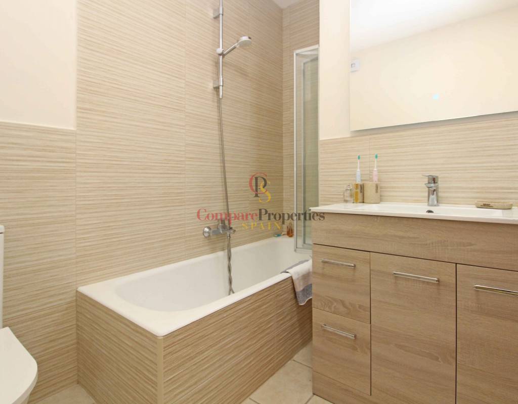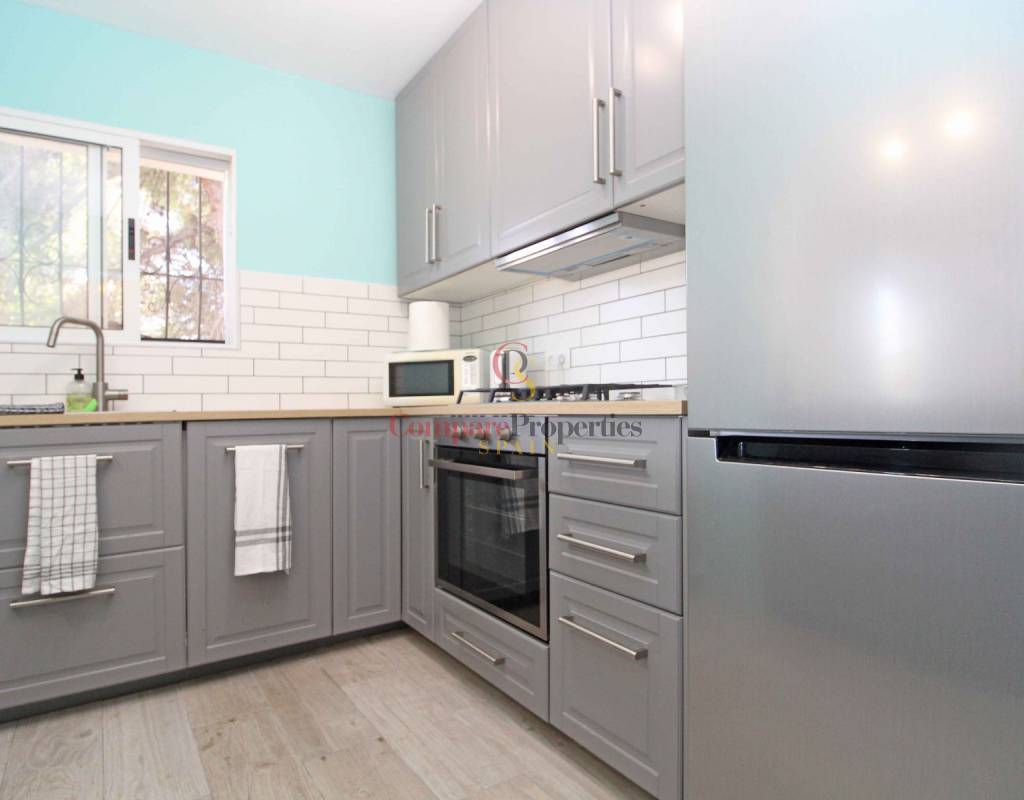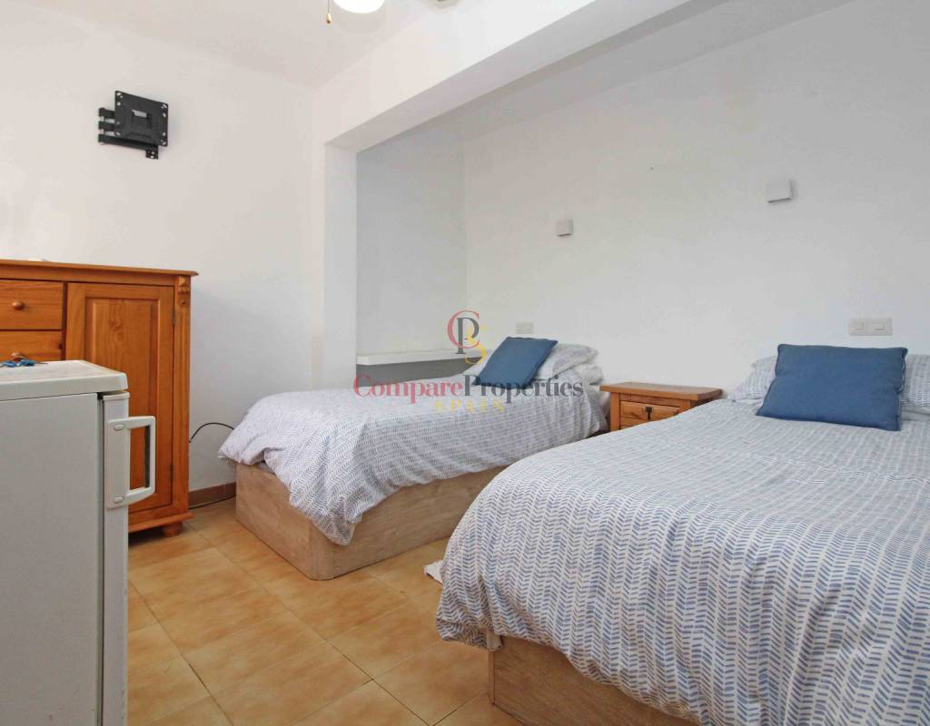 The living area with access from street level has a hall, new modern kitchen with breakfast bar, open lounge, dining room and glazed-in terrace with glass curtains, 2 bedrooms with built-in wardrobes and bathroom. This floor has been renovated qualitatively and tastefully. An external staircase leads to a guest bedroom and bathroom. This guest room has a separate terrace. In the lower floor there is a room with bathroom, kitchenette and space for a single bed.The main house has double glazing, mosquito windows, shutters, air conditioning and a parking space in front of the house.