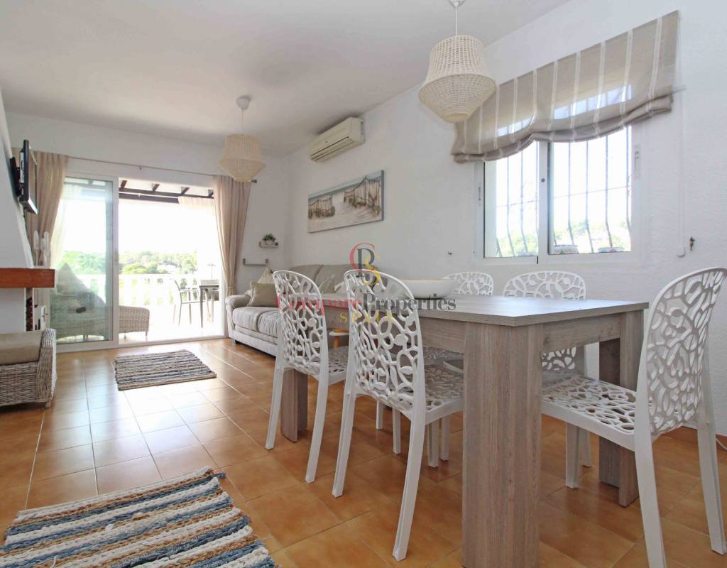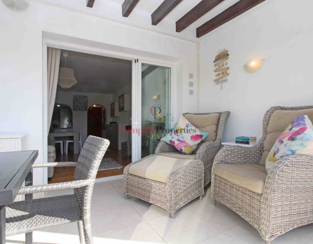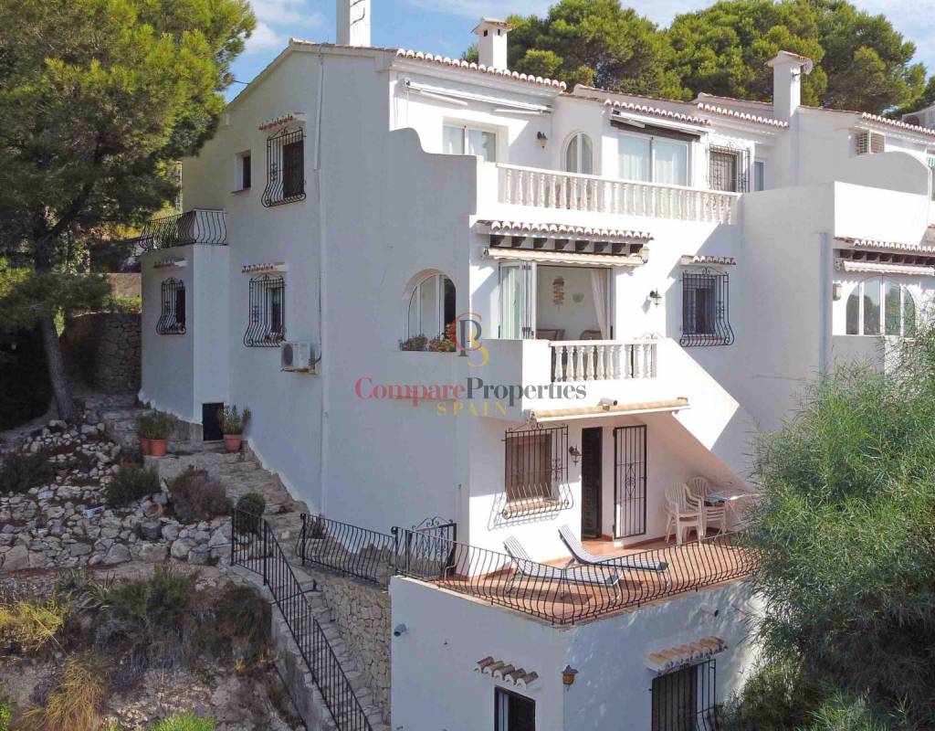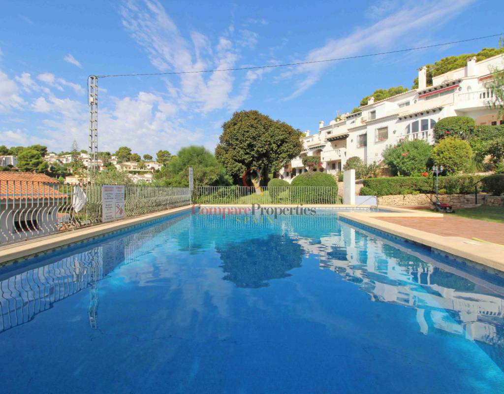 Immaculate corner house for sale in Moraira. Located in Pinar de l'Advocat in a very well-maintained complex with communal pool and beautiful Mediterranean gardens.