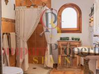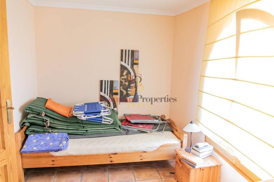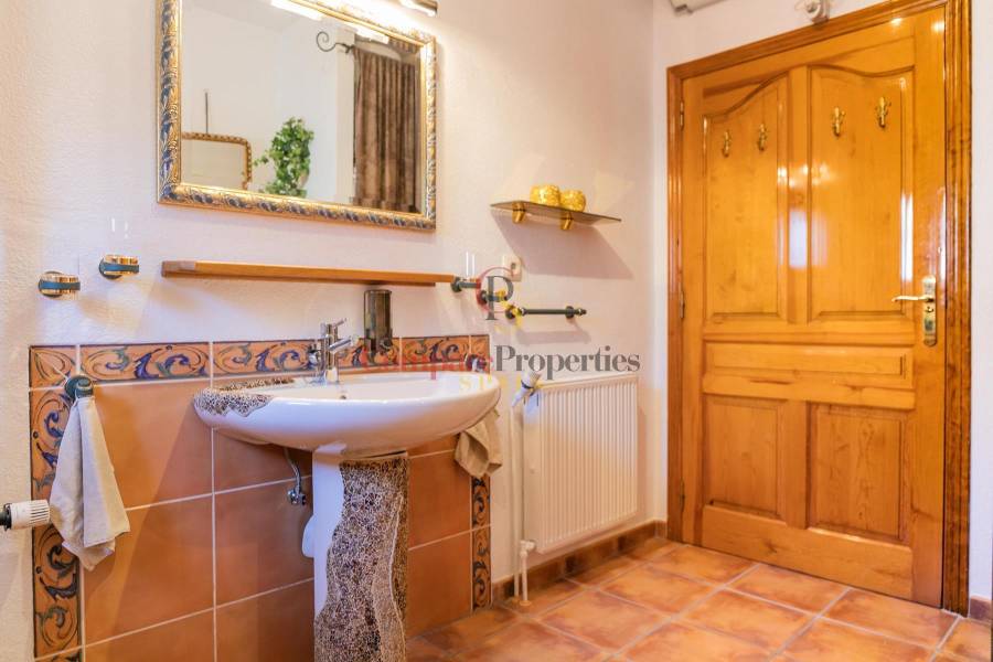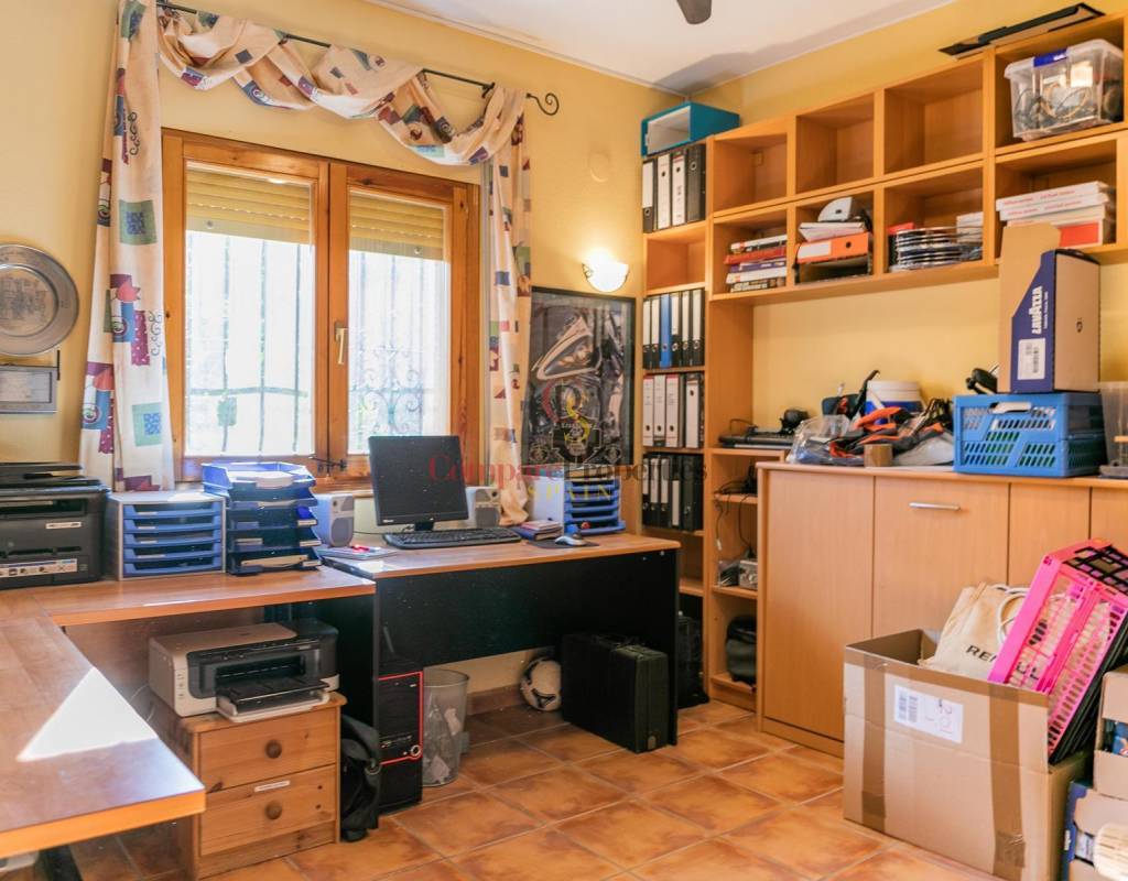 Through a path surrounding the villa we go down to the ground floor which has two bedrooms, a bathroom and access to a partially covered terrace. On this floor we also have access to the laundry room and a huge storage room.
