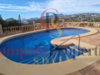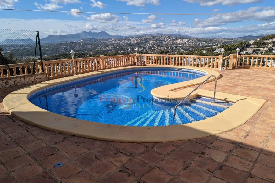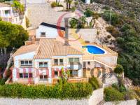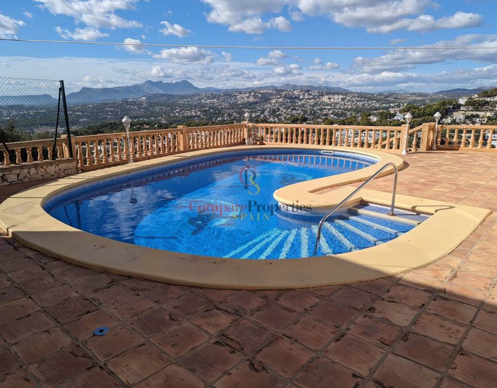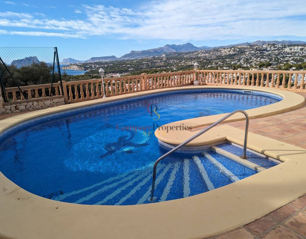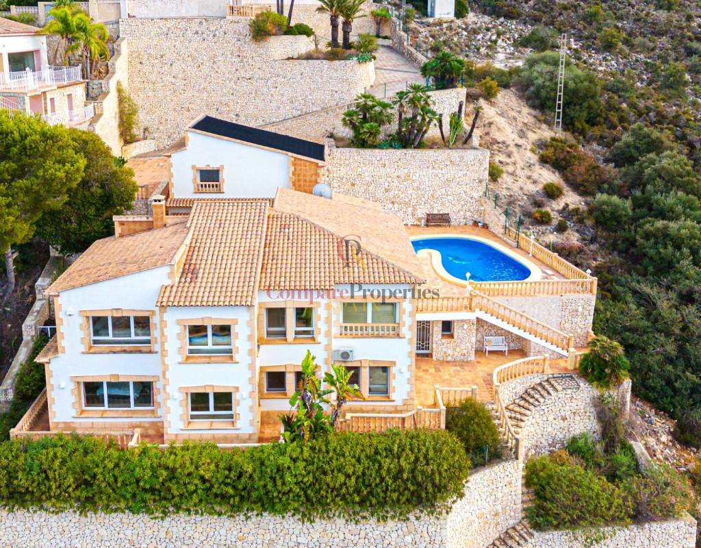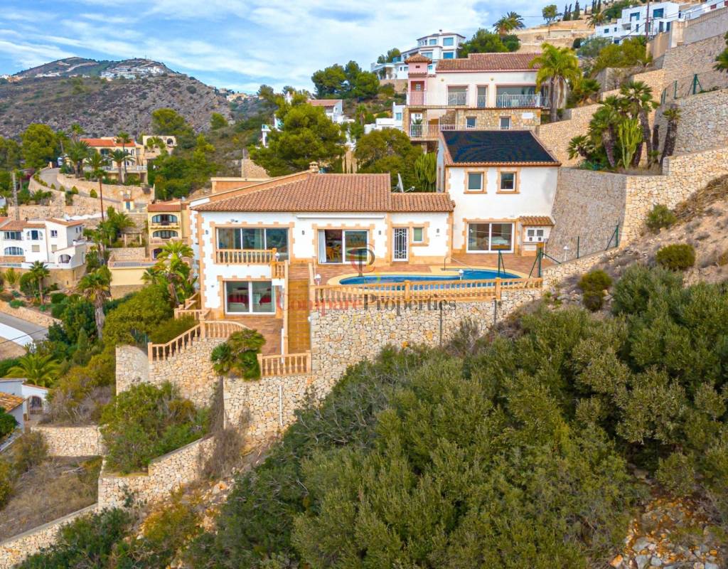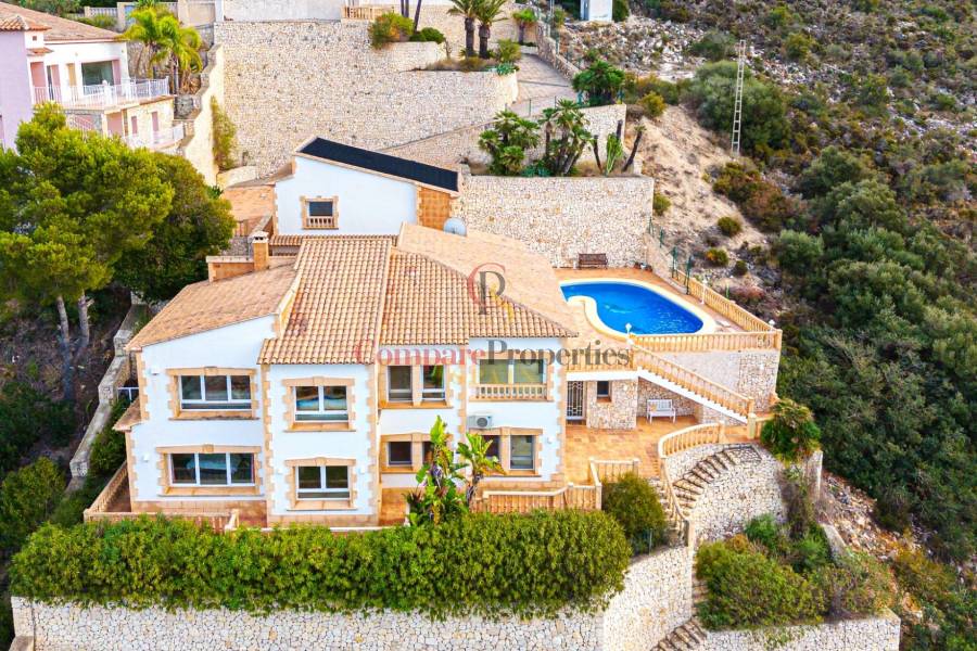 This luxury villa is located just 7 minutes from El Portet beach and restaurants. It is situated in an elevated position next to a green zone,&.;meaning it enjoys total privacy and magnificent views from El Portet to the Penon de Ifach in Calpe and then along the hillsides and montains all the way to the Montgo in Javea. The villa is distributed over two floors connected by an internal staircase. The entrance to the property is located on a hill which is a cul-de-sac, you can enter by an electric vehicle door or by a pedestrian door. You drive down the driveway to a large double garage with ample open parking nearby, from the garage there is a lift down to the courtyard outside the front door, perfect for shopping days. You enter the villa into a spacious entrance hall, to the left is a storeroom/cloakroom and the guest toilet, to the right is the entrance to the kitchen where there is a large storage cupboard. The kitchen has been renovated with gloss cream units and includes washing machine, integrated diswasher, oven, ceramic hob, extractor and an American style fridge/freezer. From the kitchen there are large glass sliding doors to the pool terrace and wonderful views. Next to the entrance to the kitchen there is the entrance to the wonderful living/dining room, a superb large room with views from every window and a feature marble fireplace with integrated wood-burner. Off the dining area is a glazed naya where you can relax and enjoy the extraordinary views. Down a staircase in the entrance hallway you arrive at a storage area with top quality doors, through one of the cupboards you can access the under-build beneath the first floor. Down a further two steps you arrive at the entrance hall for the&.;lower level, Straight ahead is a room with glass doors that could be used as an office or as a fourth bedroom. To the right is bedroom 2, a spacious room with built-in wardrobes and windows and views on two sides, next to the bedroom is a spacious bathroom with both bath and shower. To the left of the entrance hall is a small hallway, firstly you find a large bathroom with both bath and shower, ample storage and a dressing table. At the end of the hall is bedroom 1, wake up in this room and you will enjoy superb sea views through the glass sliding doors that lead out to a small terrace. From the lift in the garage you can access a guest bedroom which has a kitchenette, built-in wardrobes and glass sliding doors leading out to the pool terrace, next to this room, with access from the pool terrace is a large shower room.- Key points:- Built: 1996- 3/4 bedrooms- 3 bathrooms plus guest toilet- Marble floors throughout- Tosca arches throughout- Good quality finishing throughout- Double glazed windows- Underfloor heating- Air conditioning- Solar heated custom design pool- Furniture negotiable- Annual taxes 1396.22€- Distances:- 6 minutes drive to the town centre, beach and marina in Moraira- 6 minutes drive to an international supermarket- 7 minutes drive to El Portet beach and restaurants- 14&.; minutes drive to the golf course- 16 minutes drive to the motorway access in Benissa- Do not miss this opportunity to purchase this wonderful villa- Drone photos of the villa coming soon