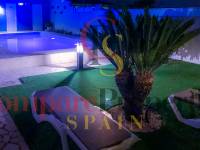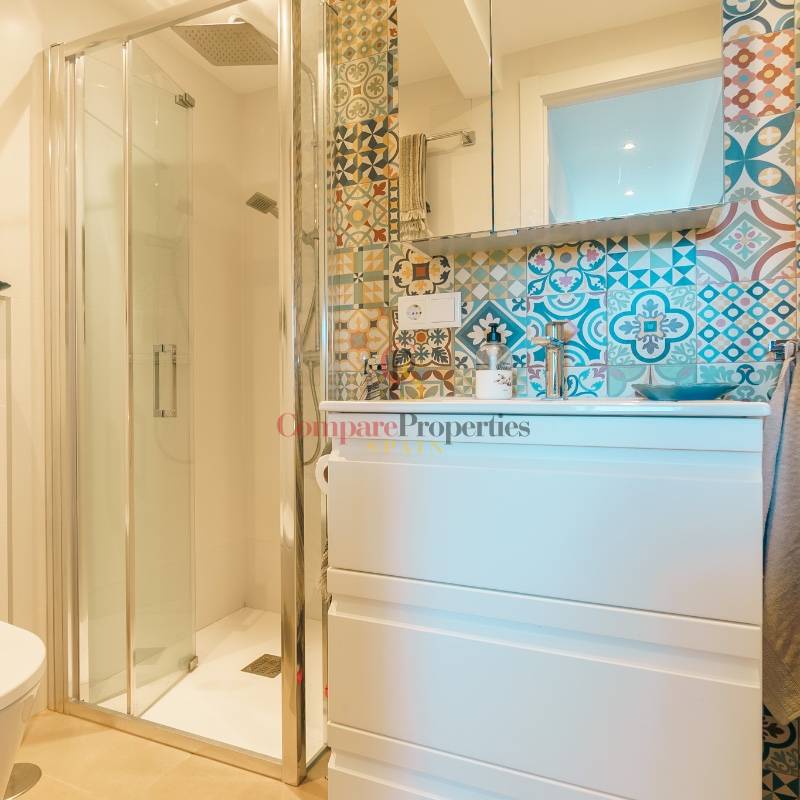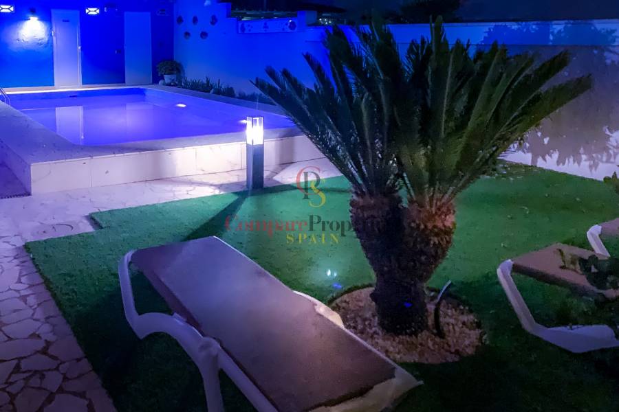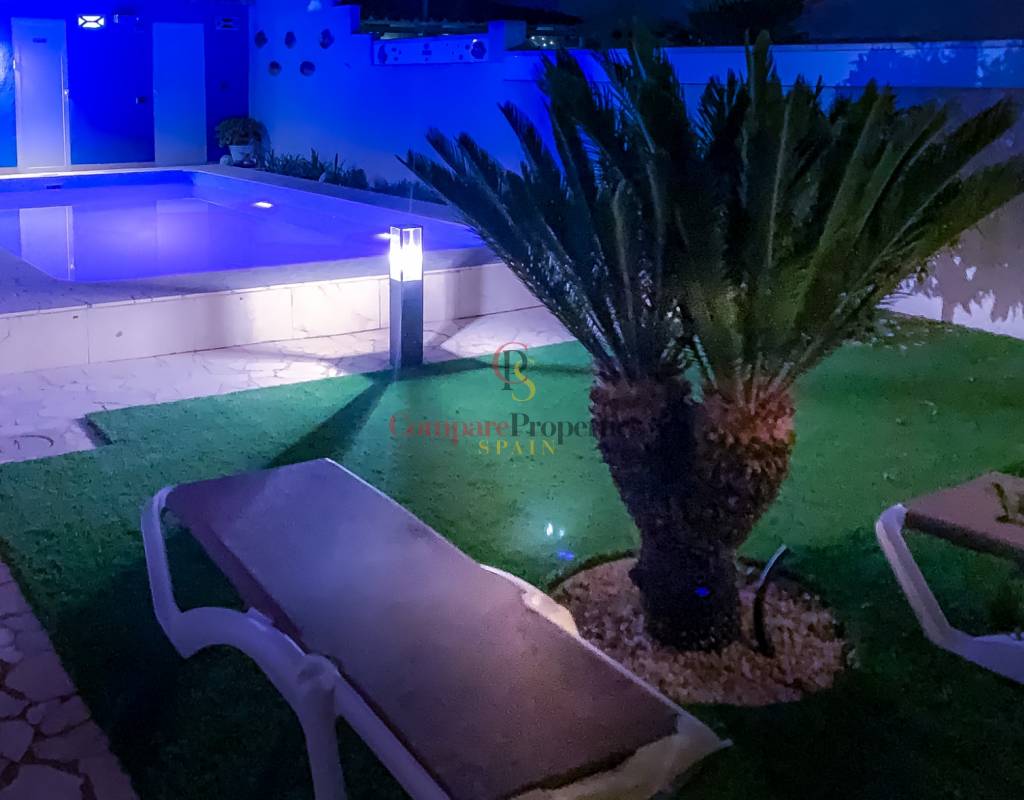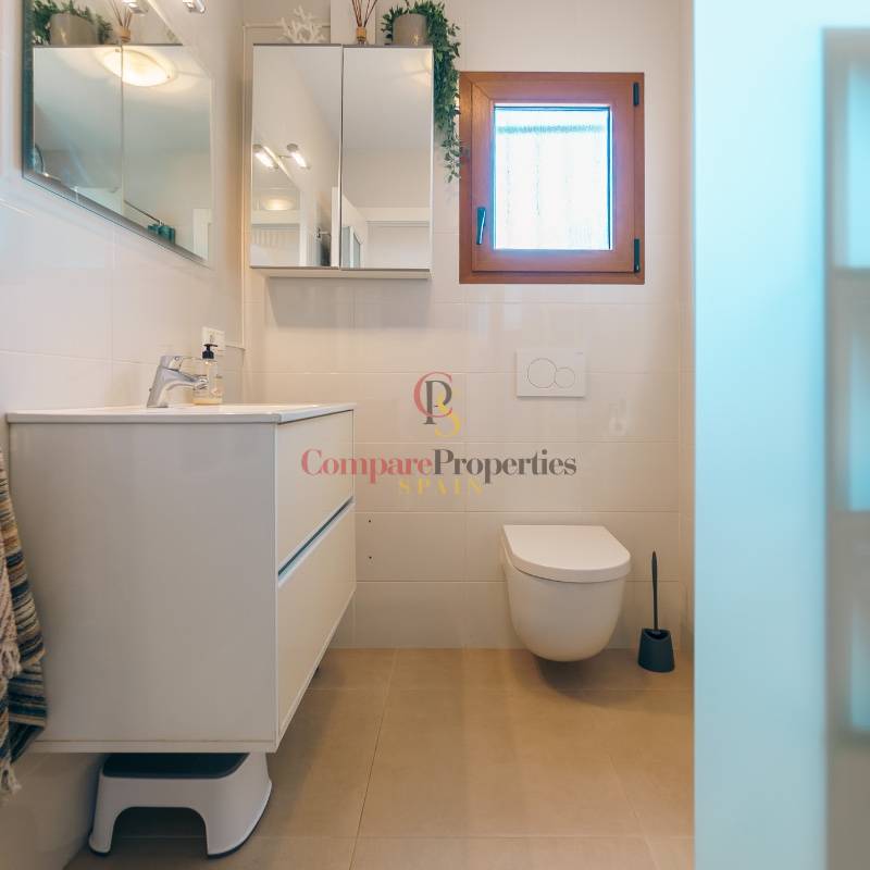 Outside, the garden boasts a beautiful pool with night lighting, an outdoor shower, a summer kitchen with a dining area, and a small annex with a toilet and washing machine. The rooftop terrace offers spectacular mountain views surrounding Albir.