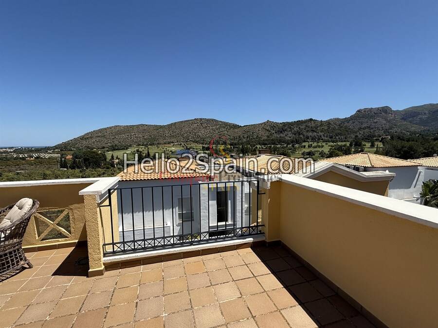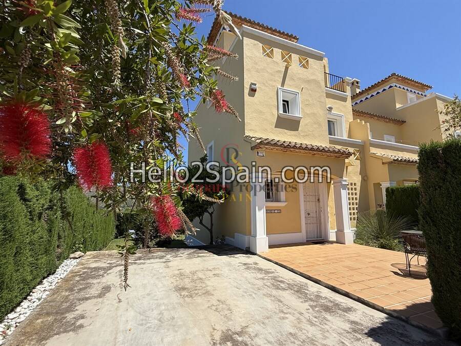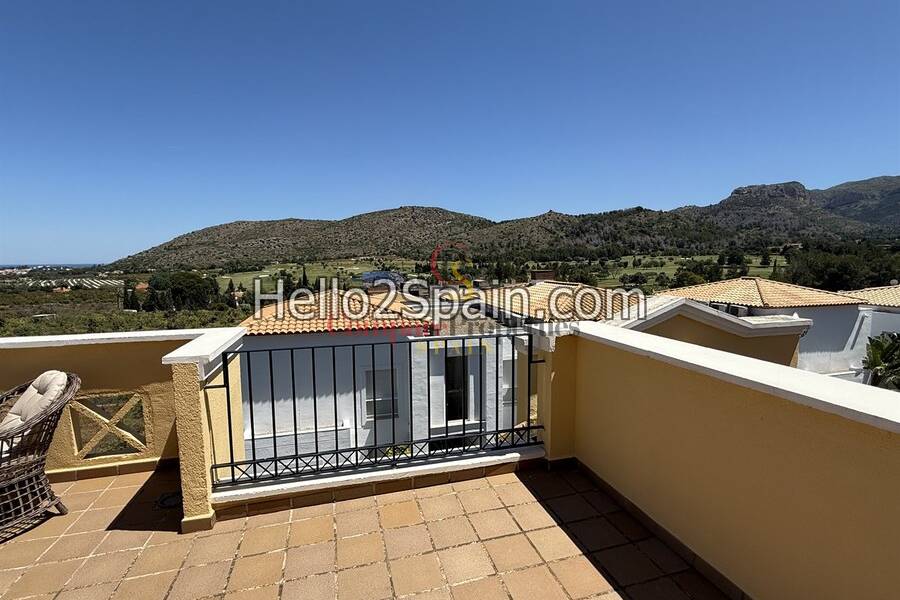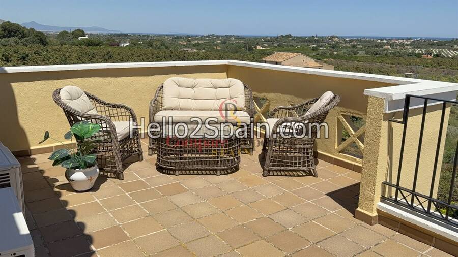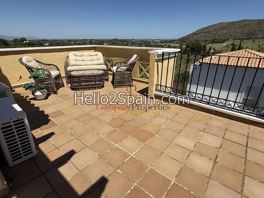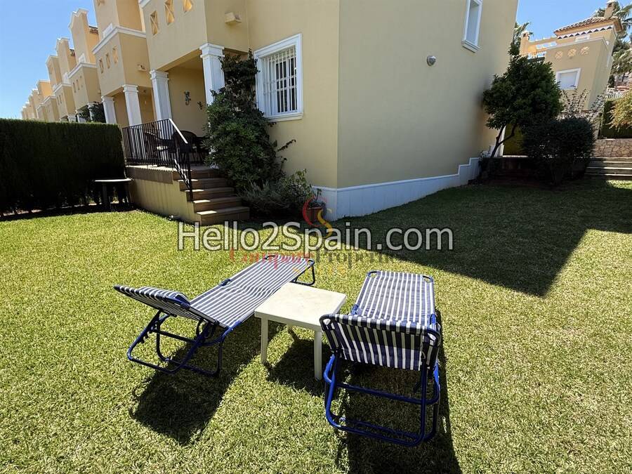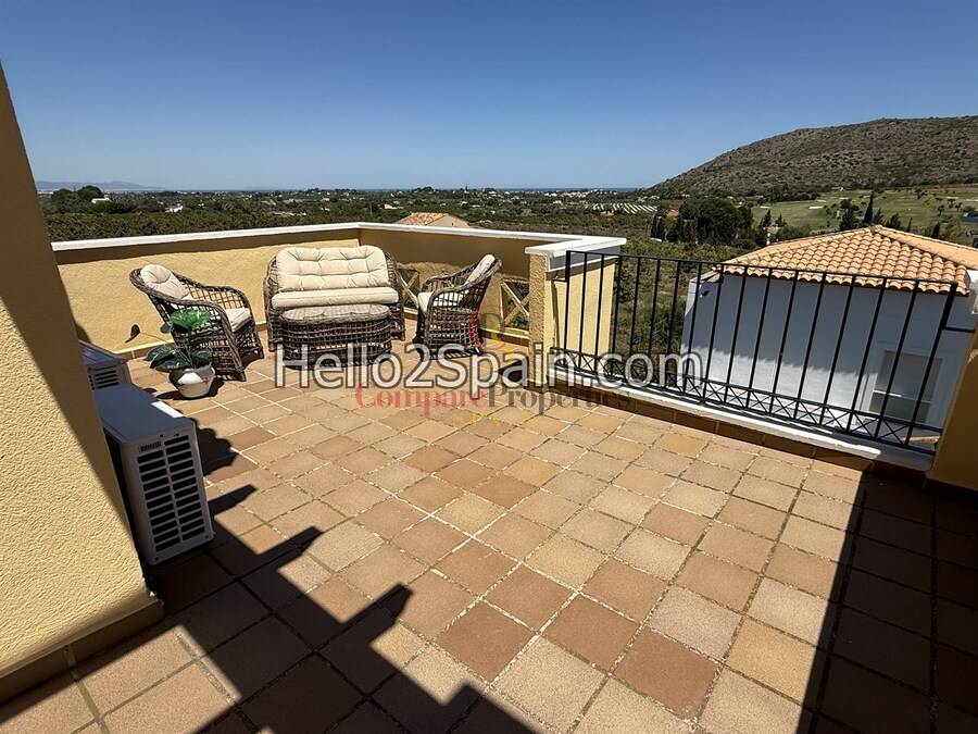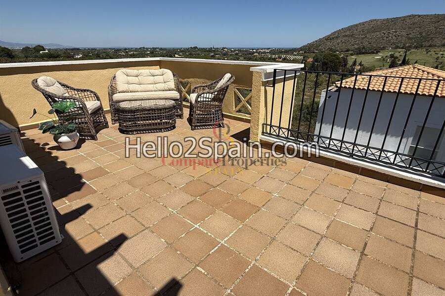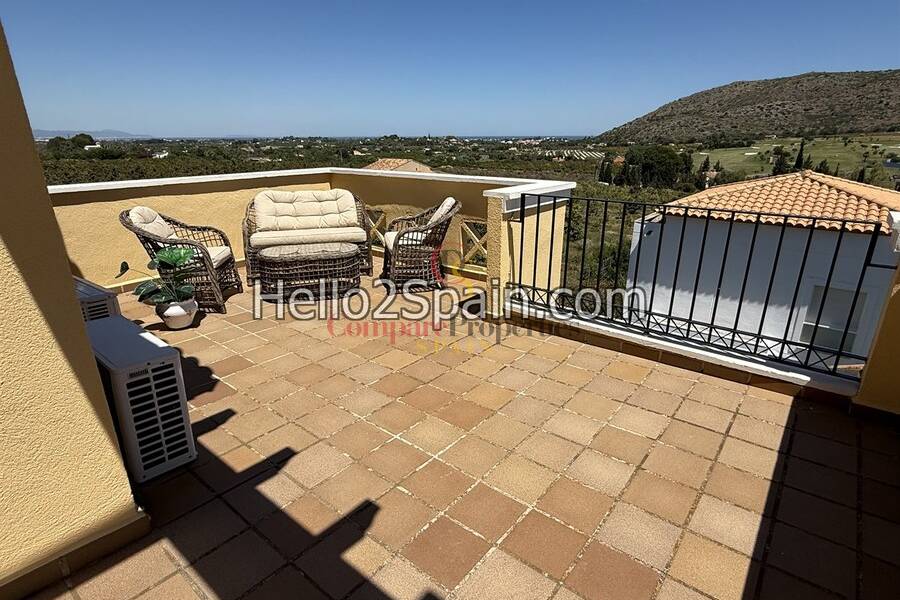 They say that location is everything when you are buying a property. I agree, this end of terrace town has a fabulous corner private garden, Sea, golf and mountain views. Private roof terrace with views towards Valencia, 3 bedrooms, 2 bathrooms, open plan lounge kitchen dining room, off road parking and 2 communal swimming pools.The approach is via a cul de sac and this house is at the end. With off road parking, front and rear terraces, lawned rear and side garden. Canopied porch with lighting leading into the reception hall.Reception hall with a very useful store cupboard, ideal for gold clubs, tennis rackets or just general storage. Lighting and door to downstairs shower room.Shower room with a walk in shower, wash basin, W.C, window and lighting.Open plan American style lounge kitchen dining room.Kitchen with a range of base and wall units, double sink with mixer tap over, fitted oven, hob and extractor, dishwasher, upright fridge freezer, lighting, breakfast bar and door to the utility room.Utility room with washing machine, scrub sink, hot water cylinder and lighting.Lounge dining room with hot and cold air conditioning unit, wall mounted radiator, sliding patio doors leading to the rear terrace, open fireplace, window to the rear, lighting and stairs to the first floor.Terrace with space for dining and entertaining, lighting and steps to the rear garden.1st floor with windows to the side elevation making this house very light and airy. Linen cupboard, stairs to the roof terrace and doors off to:Bedroom 1 with built in double wardrobe, hot and cold air conditioning unit, lighting and sliding patio doors leading to a terrace. Terrace has space for a table and chairs to enjoy the views over the avocado grove and down to the sea and over the golf course.Bedroom 2 with a built-in double wardrobe, window with sea and golf course views and lighting.Bedroom 3 with built in double wardrobe, sliding patio doors to the front elevation and lighting.Family bathroom with a full-length bath and shower over, vanity unit, W.C, window and lighting.2nd floor roof terrace. Landing with space for a kitchenette or garden furniture storage. Double opening patio doors to the roof terrace.Roof terrace, has in my opinion the best views of the area. Sea, golf and mountain views, very sunny position including winter sun which is very important when you have a property in Spain.Gardens the rear and side are lawned with various places to sit either in the sun or shade. The best of both worlds.There are two communal swimming pools both which are always clean and maintained. The communal fees include the maintenance of the gardens, hedges and lawns.The house is being sold furnished apart from some personal possessions.
