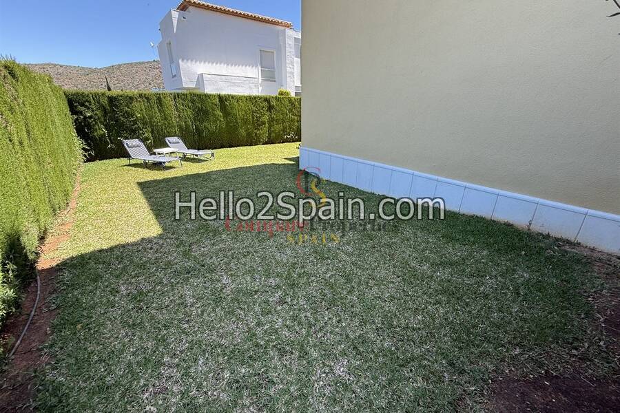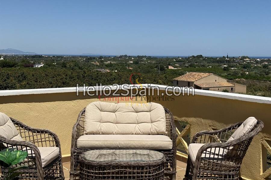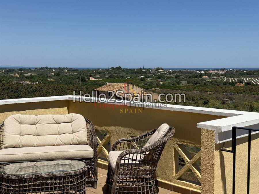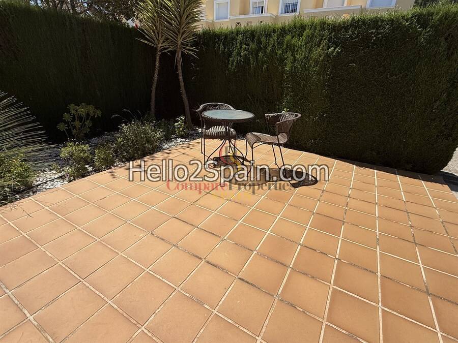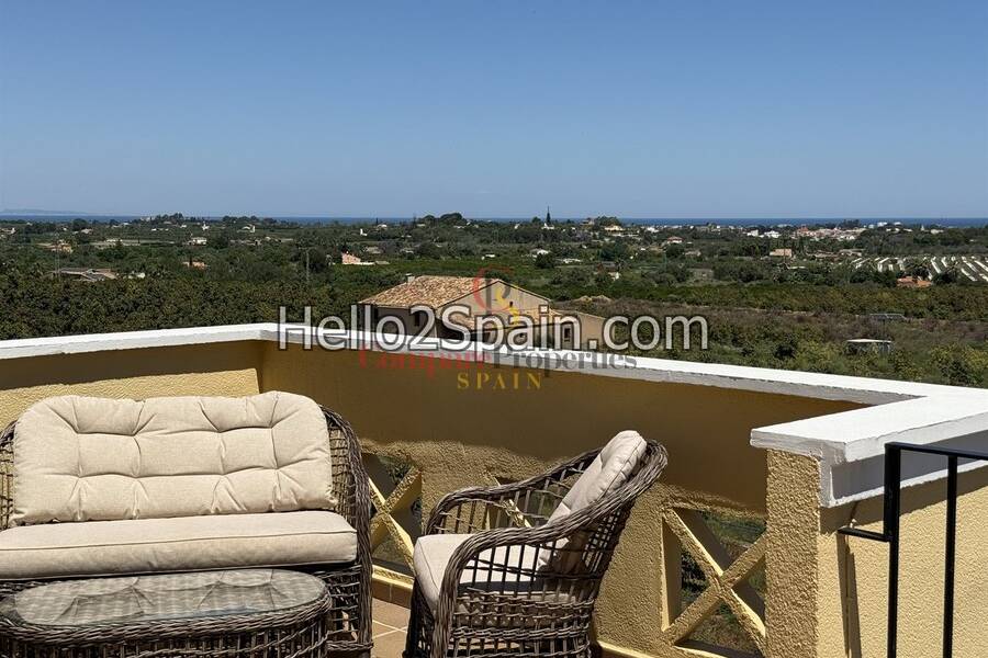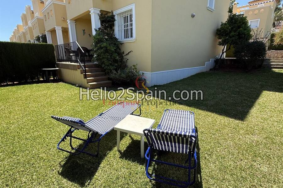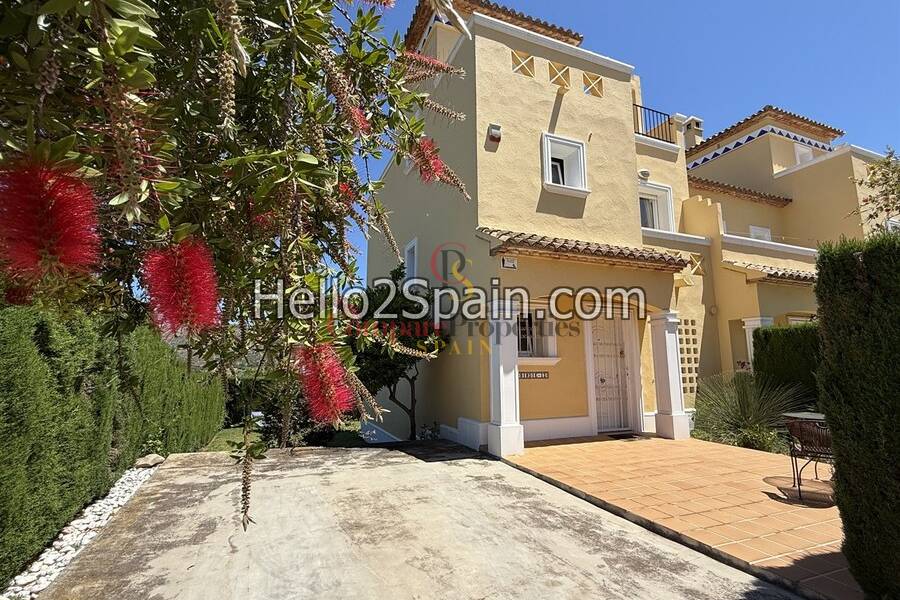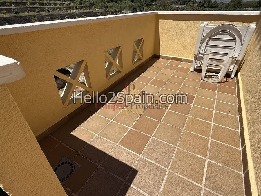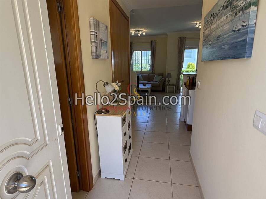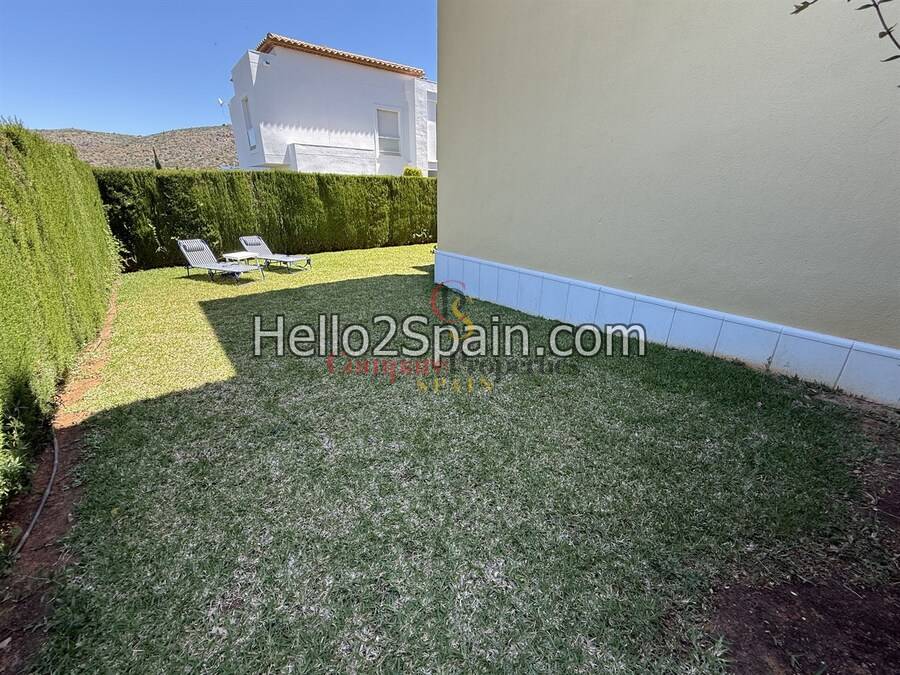They say that location is everything when you are buying a property. I agree, this end of terrace town has a fabulous corner private garden, Sea, golf and mountain views. Private roof terrace with views towards Valencia, 3 bedrooms, 2 bathrooms, open plan lounge kitchen dining room, off road parking and 2 communal swimming pools.The approach is via a cul de sac and this house is at the end. With off road parking, front and rear terraces, lawned rear and side garden. Canopied porch with lighting leading into the reception hall.Reception hall with a very useful store cupboard, ideal for gold clubs, tennis rackets or just general storage. Lighting and door to downstairs shower room.Shower room with a walk in shower, wash basin, W.C, window and lighting.Open plan American style lounge kitchen dining room.Kitchen with a range of base and wall units, double sink with mixer tap over, fitted oven, hob and extractor, dishwasher, upright fridge freezer, lighting, breakfast bar and door to the utility room.Utility room with washing machine, scrub sink, hot water cylinder and lighting.Lounge dining room with hot and cold air conditioning unit, wall mounted radiator, sliding patio doors leading to the rear terrace, open fireplace, window to the rear, lighting and stairs to the first floor.Terrace with space for dining and entertaining, lighting and steps to the rear garden.1st floor with windows to the side elevation making this house very light and airy. Linen cupboard, stairs to the roof terrace and doors off to:Bedroom 1 with built in double wardrobe, hot and cold air conditioning unit, lighting and sliding patio doors leading to a terrace. Terrace has space for a table and chairs to enjoy the views over the avocado grove and down to the sea and over the golf course.Bedroom 2 with a built-in double wardrobe, window with sea and golf course views and lighting.Bedroom 3 with built in double wardrobe, sliding patio doors to the front elevation and lighting.Family bathroom with a full-length bath and shower over, vanity unit, W.C, window and lighting.2nd floor roof terrace. Landing with space for a kitchenette or garden furniture storage. Double opening patio doors to the roof terrace.Roof terrace, has in my opinion the best views of the area. Sea, golf and mountain views, very sunny position including winter sun which is very important when you have a property in Spain.Gardens the rear and side are lawned with various places to sit either in the sun or shade. The best of both worlds.There are two communal swimming pools both which are always clean and maintained. The communal fees include the maintenance of the gardens, hedges and lawns.The house is being sold furnished apart from some personal possessions.