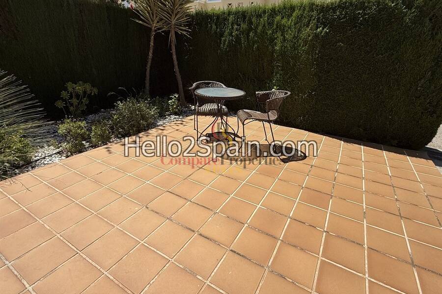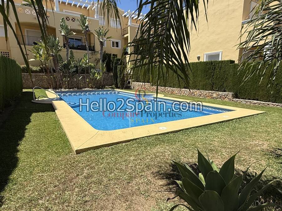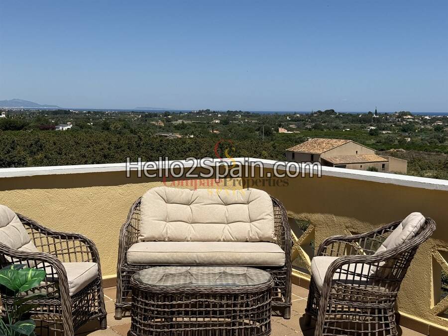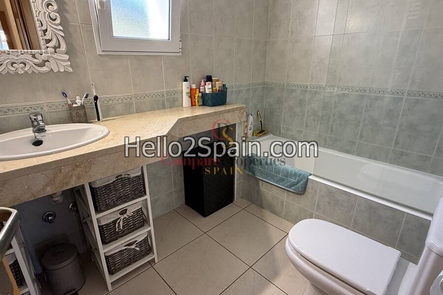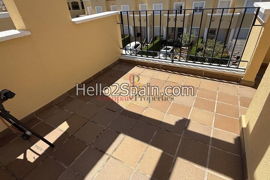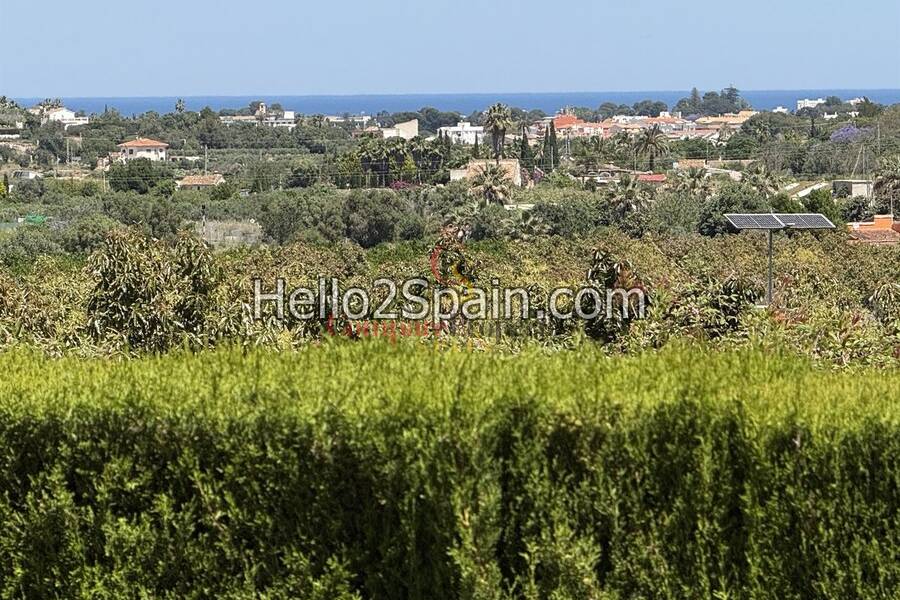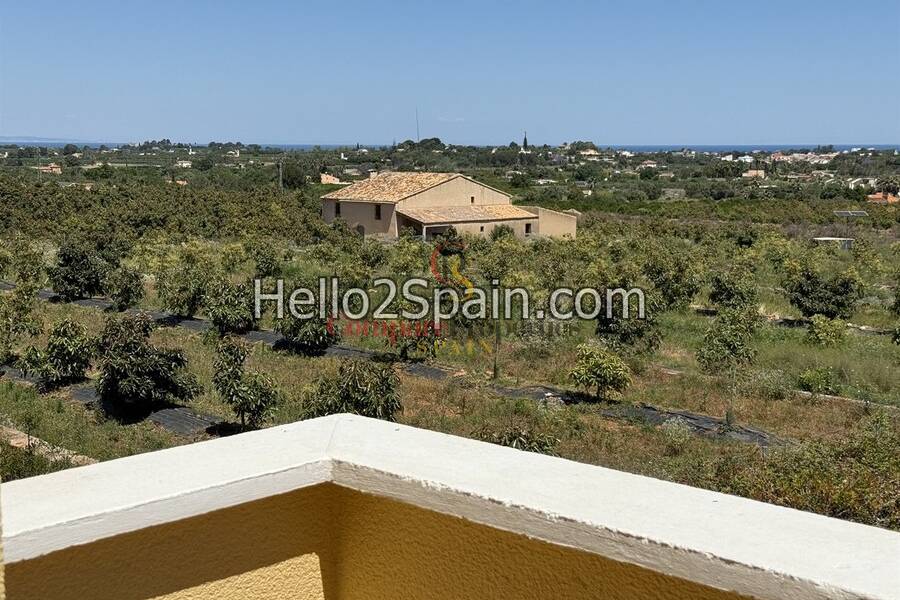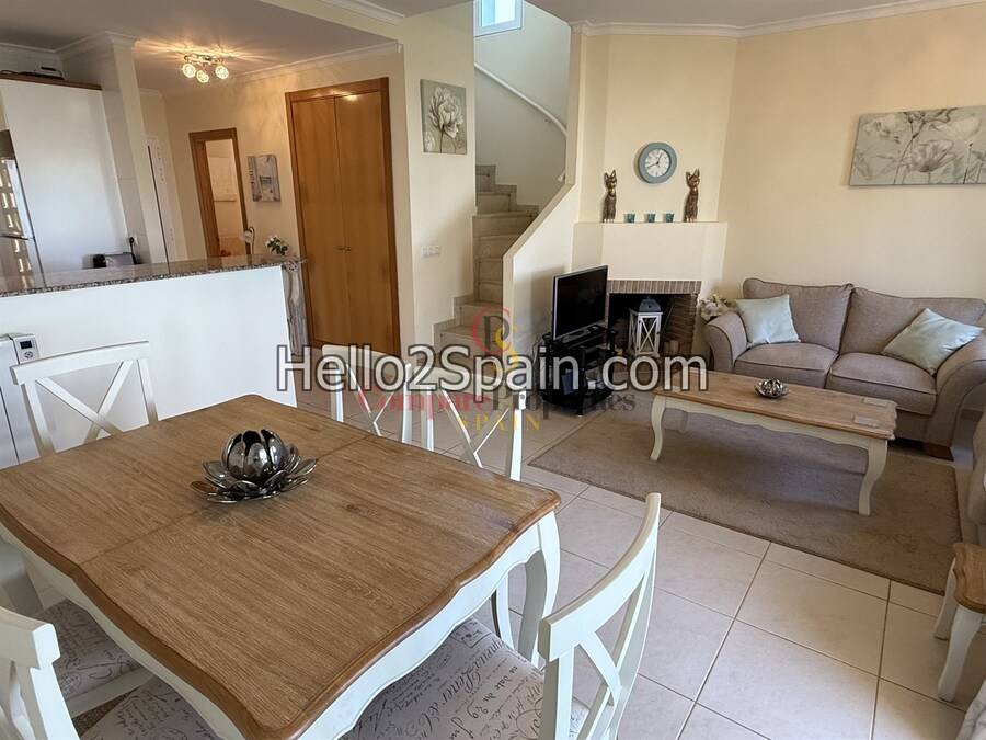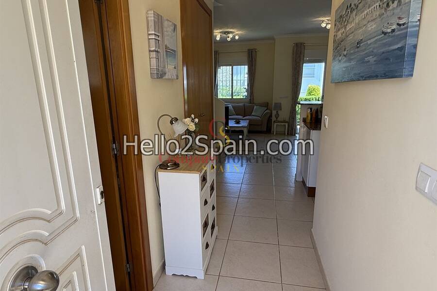 They say that location is everything when you are buying a property. I agree, this end of terrace town has a fabulous corner private garden, Sea, golf and mountain views. Private roof terrace with views towards Valencia, 3 bedrooms, 2 bathrooms, open plan lounge kitchen dining room, off road parking and 2 communal swimming pools.The approach is via a cul de sac and this house is at the end. With off road parking, front and rear terraces, lawned rear and side garden. Canopied porch with lighting leading into the reception hall.Reception hall with a very useful store cupboard, ideal for gold clubs, tennis rackets or just general storage. Lighting and door to downstairs shower room.Shower room with a walk in shower, wash basin, W.C, window and lighting.Open plan American style lounge kitchen dining room.Kitchen with a range of base and wall units, double sink with mixer tap over, fitted oven, hob and extractor, dishwasher, upright fridge freezer, lighting, breakfast bar and door to the utility room.Utility room with washing machine, scrub sink, hot water cylinder and lighting.Lounge dining room with hot and cold air conditioning unit, wall mounted radiator, sliding patio doors leading to the rear terrace, open fireplace, window to the rear, lighting and stairs to the first floor.Terrace with space for dining and entertaining, lighting and steps to the rear garden.1st floor with windows to the side elevation making this house very light and airy. Linen cupboard, stairs to the roof terrace and doors off to:Bedroom 1 with built in double wardrobe, hot and cold air conditioning unit, lighting and sliding patio doors leading to a terrace. Terrace has space for a table and chairs to enjoy the views over the avocado grove and down to the sea and over the golf course.Bedroom 2 with a built-in double wardrobe, window with sea and golf course views and lighting.Bedroom 3 with built in double wardrobe, sliding patio doors to the front elevation and lighting.Family bathroom with a full-length bath and shower over, vanity unit, W.C, window and lighting.2nd floor roof terrace. Landing with space for a kitchenette or garden furniture storage. Double opening patio doors to the roof terrace.Roof terrace, has in my opinion the best views of the area. Sea, golf and mountain views, very sunny position including winter sun which is very important when you have a property in Spain.Gardens the rear and side are lawned with various places to sit either in the sun or shade. The best of both worlds.There are two communal swimming pools both which are always clean and maintained. The communal fees include the maintenance of the gardens, hedges and lawns.The house is being sold furnished apart from some personal possessions.