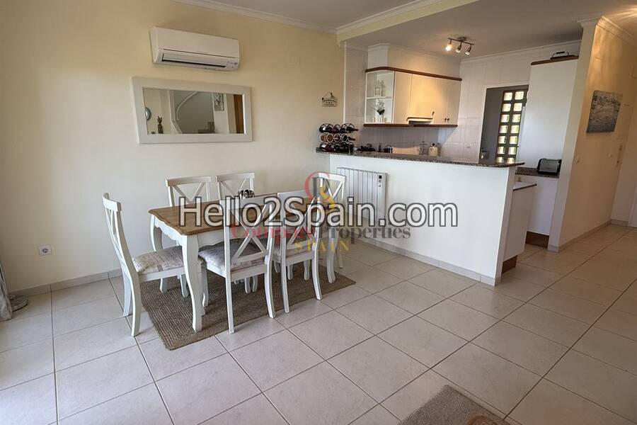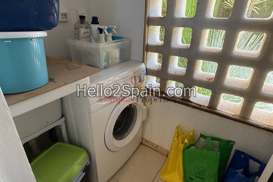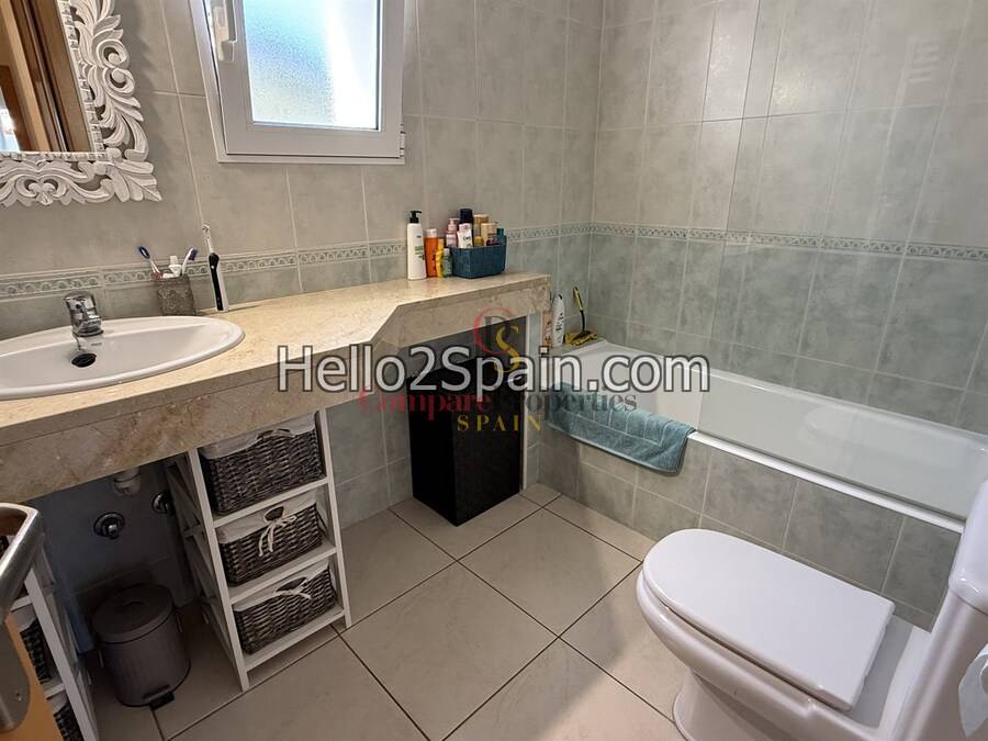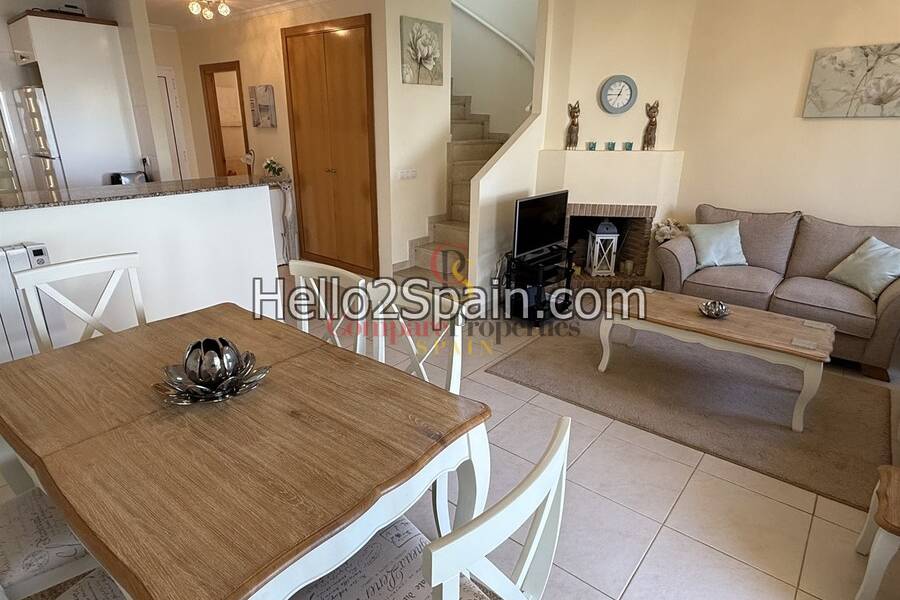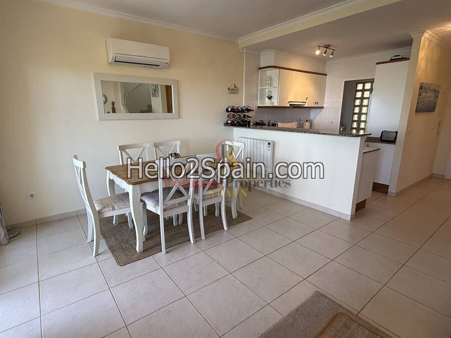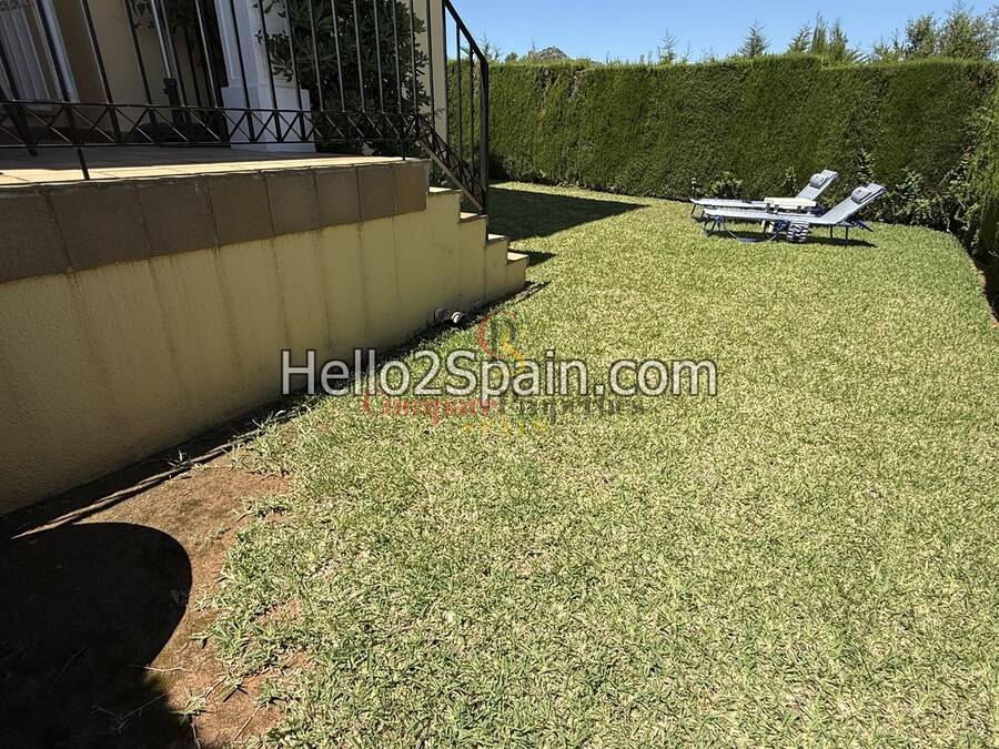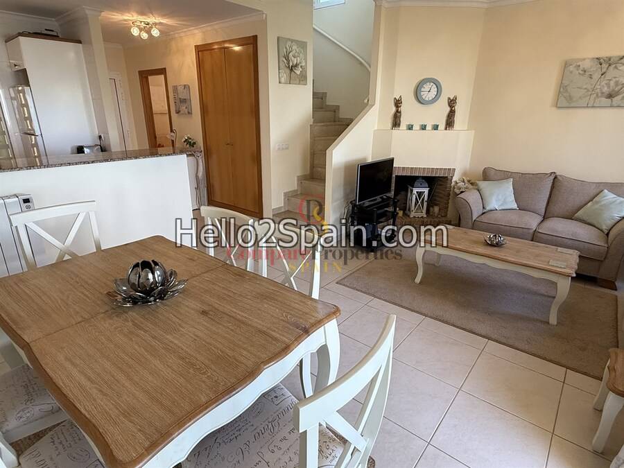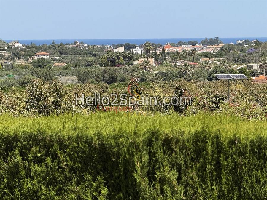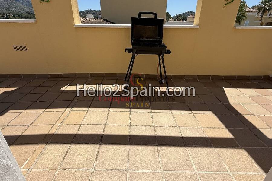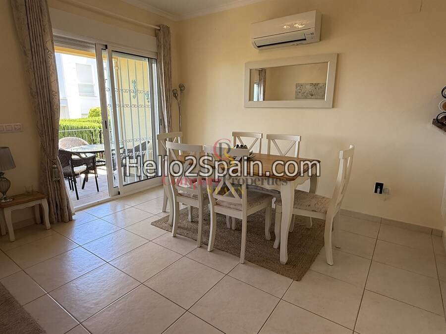 They say that location is everything when you are buying a property. I agree, this end of terrace town has a fabulous corner private garden, Sea, golf and mountain views. Private roof terrace with views towards Valencia, 3 bedrooms, 2 bathrooms, open plan lounge kitchen dining room, off road parking and 2 communal swimming pools.The approach is via a cul de sac and this house is at the end. With off road parking, front and rear terraces, lawned rear and side garden. Canopied porch with lighting leading into the reception hall.Reception hall with a very useful store cupboard, ideal for gold clubs, tennis rackets or just general storage. Lighting and door to downstairs shower room.Shower room with a walk in shower, wash basin, W.C, window and lighting.Open plan American style lounge kitchen dining room.Kitchen with a range of base and wall units, double sink with mixer tap over, fitted oven, hob and extractor, dishwasher, upright fridge freezer, lighting, breakfast bar and door to the utility room.Utility room with washing machine, scrub sink, hot water cylinder and lighting.Lounge dining room with hot and cold air conditioning unit, wall mounted radiator, sliding patio doors leading to the rear terrace, open fireplace, window to the rear, lighting and stairs to the first floor.Terrace with space for dining and entertaining, lighting and steps to the rear garden.1st floor with windows to the side elevation making this house very light and airy. Linen cupboard, stairs to the roof terrace and doors off to:Bedroom 1 with built in double wardrobe, hot and cold air conditioning unit, lighting and sliding patio doors leading to a terrace. Terrace has space for a table and chairs to enjoy the views over the avocado grove and down to the sea and over the golf course.Bedroom 2 with a built-in double wardrobe, window with sea and golf course views and lighting.Bedroom 3 with built in double wardrobe, sliding patio doors to the front elevation and lighting.Family bathroom with a full-length bath and shower over, vanity unit, W.C, window and lighting.2nd floor roof terrace. Landing with space for a kitchenette or garden furniture storage. Double opening patio doors to the roof terrace.Roof terrace, has in my opinion the best views of the area. Sea, golf and mountain views, very sunny position including winter sun which is very important when you have a property in Spain.Gardens the rear and side are lawned with various places to sit either in the sun or shade. The best of both worlds.There are two communal swimming pools both which are always clean and maintained. The communal fees include the maintenance of the gardens, hedges and lawns.The house is being sold furnished apart from some personal possessions.