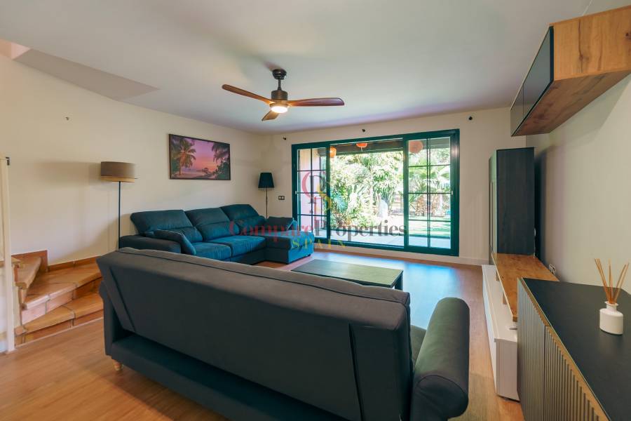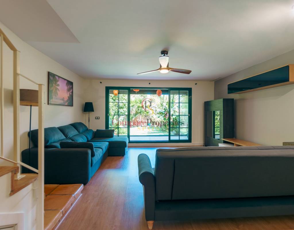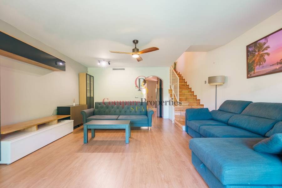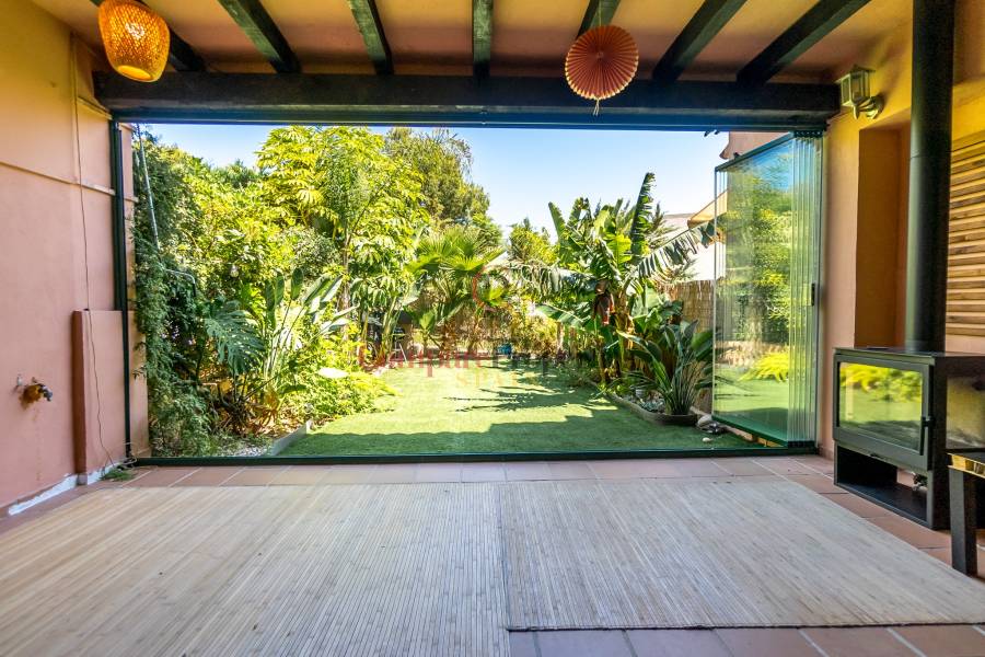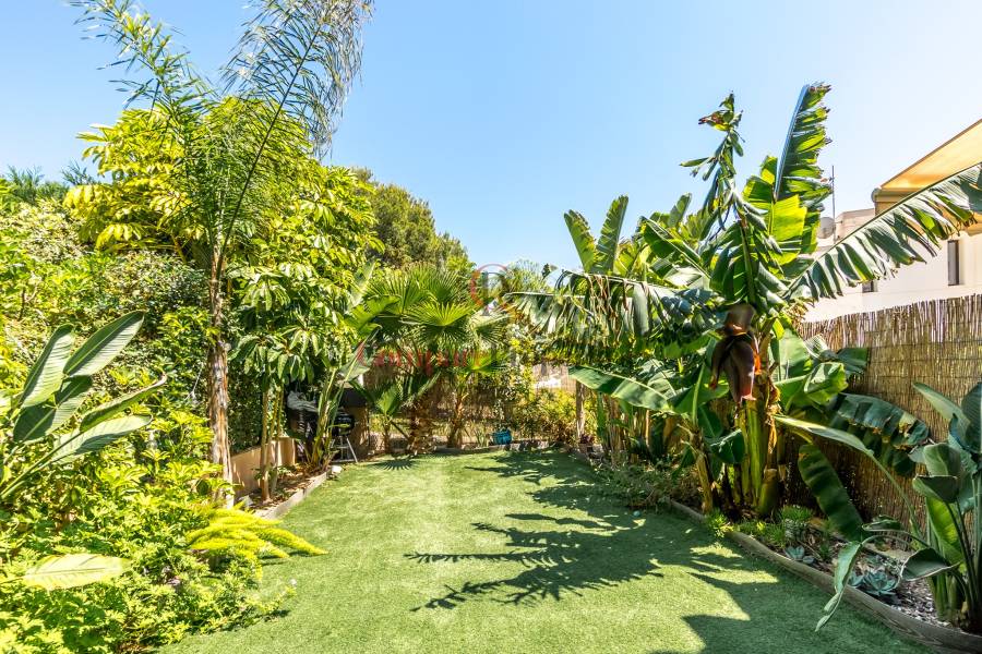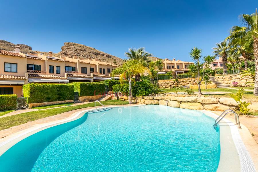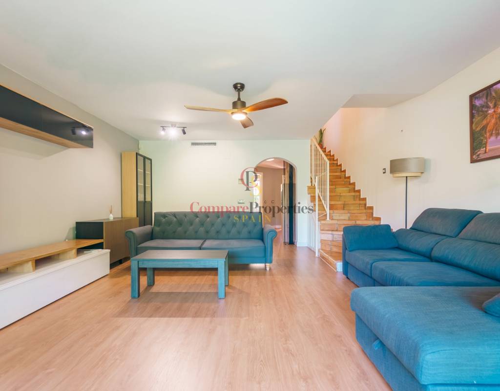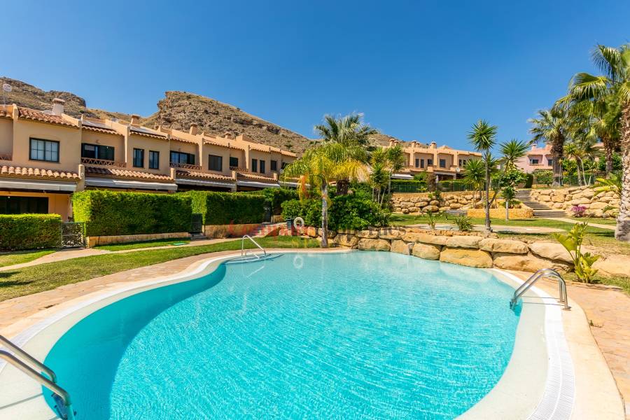 Wonderful townhouse with private garden in Sierra Cortina, FinestratLocated in an exclusive gated community with 24h security, this charming townhouse offers the perfect combination of tranquility, comfort and safety, just 5 minutes by car from Poniente beach and Cala de Finestrat.Very close to the La Marina Finestrat Shopping Centre, Carrefour, Mercadona and other services – all accessible by car or a pleasant 20-minute walk. The setting is privileged: surrounded by green areas, bike lanes, wide pedestrian paths, the Asia Gardens hotel and Villaitana golf course. Excellent connection to the AP-7 motorway, just 2 km away.Highlighted features:- Possibility to build a basement of approximately 60 m² under the house.- Well-maintained development with maintenance staff, concierge and gardening services.- 4 communal swimming pools, landscaped areas with grass and palm trees, some with sea views.- Direct access from the private garden to the pool, ensuring both privacy and convenience.Private gardens:- Front garden with storage shed.- Spacious rear garden beautifully landscaped with orange tree, coconut palm, banana tree, lemon tree, palm trees and other tropical plants, with automatic irrigation included in the community fee.Interiors:- Ducted air conditioning (hot/cold) with independent control per floor, and ceiling fans in the living room and master bedroom.- Renovated kitchen with high-quality materials, large window and all appliances included (fridge, hob, oven, dishwasher, washing machine and dining table).- Guest toilet on the ground floor and large furnished living room with sofa beds, opening onto a fully retractable frameless glazed porch terrace, with a modern wood or pellet fireplace.Upper floor:- 3 bedrooms with built-in wardrobes and 2 full bathrooms (one with a shower and one with a bathtub).- Master bedroom with walk-in wardrobe, en-suite bathroom renovated with high-quality materials, and access to a balcony with garden and sea views.- Double glazed Climalit windows in the sunniest and windiest areas for better insulation.- Mosquito screens on all windows.- Included: storage beds, nearly-new mattresses and all bedroom furniture.Extras:- Parking space included. Additional communal parking area in front of the house with space for multiple vehicles.- Negotiable price.A unique opportunity to live or holiday in a privileged area, surrounded by nature, with all services nearby and excellent quality of life.Don’t miss out on this home that has it all!