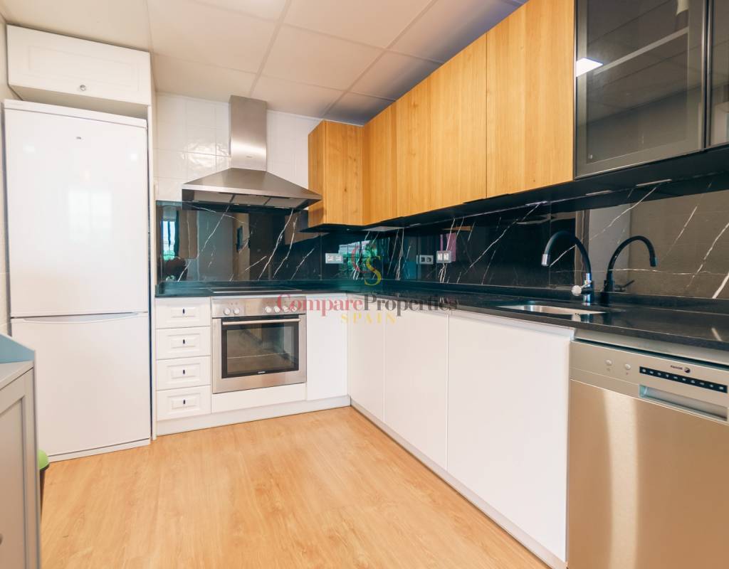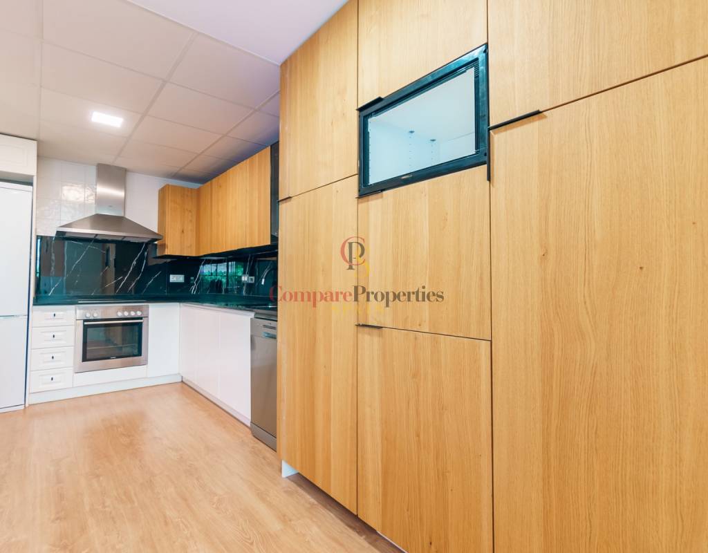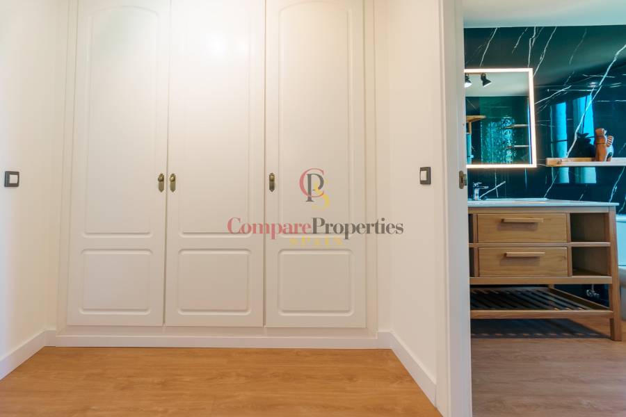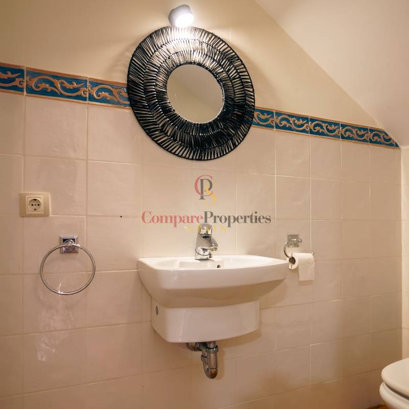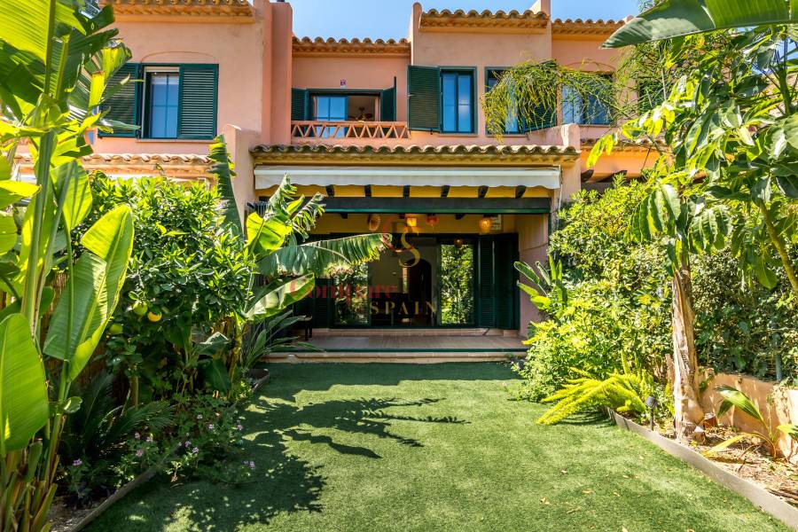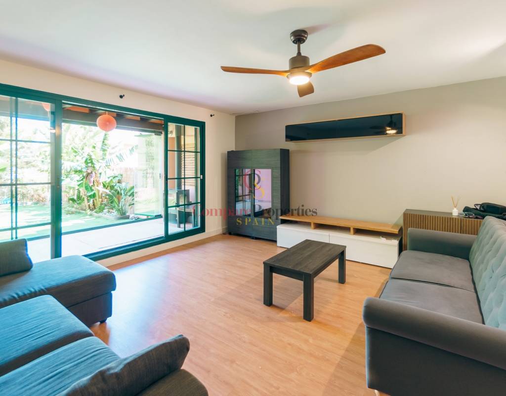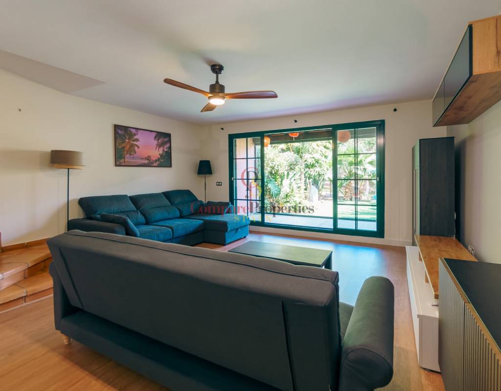 Wonderful townhouse with private garden in Sierra Cortina, FinestratLocated in an exclusive gated community with 24h security, this charming townhouse offers the perfect combination of tranquility, comfort and safety, just 5 minutes by car from Poniente beach and Cala de Finestrat.Very close to the La Marina Finestrat Shopping Centre, Carrefour, Mercadona and other services – all accessible by car or a pleasant 20-minute walk. The setting is privileged: surrounded by green areas, bike lanes, wide pedestrian paths, the Asia Gardens hotel and Villaitana golf course. Excellent connection to the AP-7 motorway, just 2 km away.Highlighted features:- Possibility to build a basement of approximately 60 m² under the house.- Well-maintained development with maintenance staff, concierge and gardening services.- 4 communal swimming pools, landscaped areas with grass and palm trees, some with sea views.- Direct access from the private garden to the pool, ensuring both privacy and convenience.Private gardens:- Front garden with storage shed.- Spacious rear garden beautifully landscaped with orange tree, coconut palm, banana tree, lemon tree, palm trees and other tropical plants, with automatic irrigation included in the community fee.Interiors:- Ducted air conditioning (hot/cold) with independent control per floor, and ceiling fans in the living room and master bedroom.- Renovated kitchen with high-quality materials, large window and all appliances included (fridge, hob, oven, dishwasher, washing machine and dining table).- Guest toilet on the ground floor and large furnished living room with sofa beds, opening onto a fully retractable frameless glazed porch terrace, with a modern wood or pellet fireplace.Upper floor:- 3 bedrooms with built-in wardrobes and 2 full bathrooms (one with a shower and one with a bathtub).- Master bedroom with walk-in wardrobe, en-suite bathroom renovated with high-quality materials, and access to a balcony with garden and sea views.- Double glazed Climalit windows in the sunniest and windiest areas for better insulation.- Mosquito screens on all windows.- Included: storage beds, nearly-new mattresses and all bedroom furniture.Extras:- Parking space included. Additional communal parking area in front of the house with space for multiple vehicles.- Negotiable price.A unique opportunity to live or holiday in a privileged area, surrounded by nature, with all services nearby and excellent quality of life.Don’t miss out on this home that has it all!