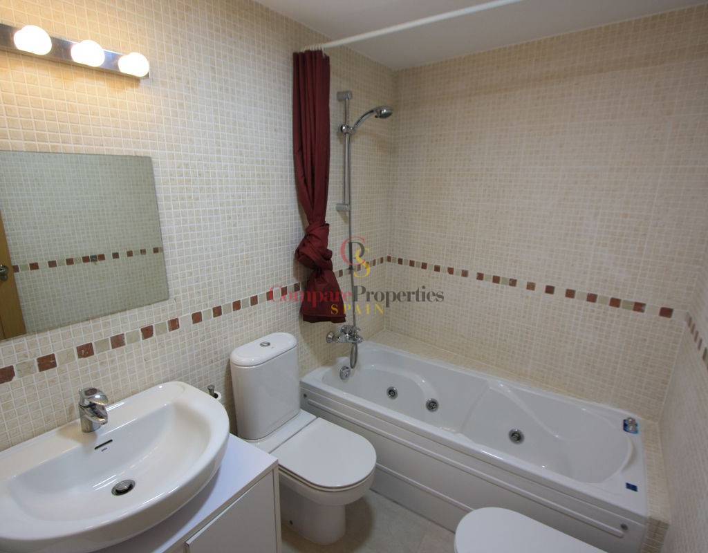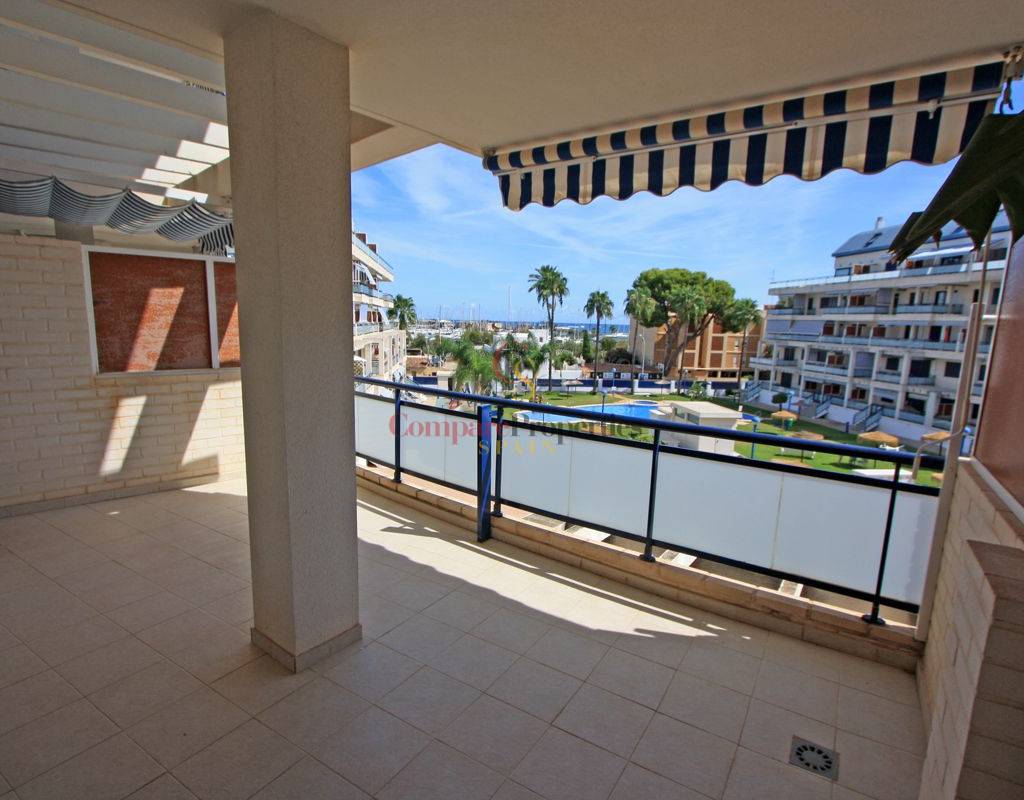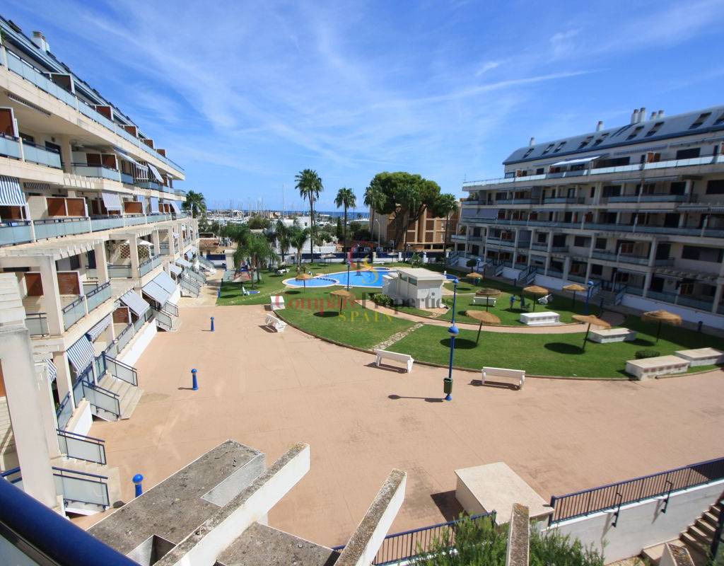 For sale, this magnificent second-floor apartment with elevator, sea views and views of the Dénia yacht club. Living-dining room with access to a covered terrace overlooking the communal area and the sea, independent kitchen with gallery-laundry, 2 double bedrooms with fitted wardrobes, one of which has an en-suite bathroom in addition to another full bathroom with a hydromassage bathtub. Good finishes: Ceramic flooring, aluminum windows with double glazing and mosquito nets, ducted air conditioning (compressor replaced 2 years ago), equipped kitchen, washing machine, etc. The apartment is unfurnished and newly painted, and included in the sales price is a double closed parking space (box) in the communal garage. Fantastic holiday urbanization with garden, swimming pool, playground, and communal gym just 100 m from Marineta Cassiana beach and near all services.