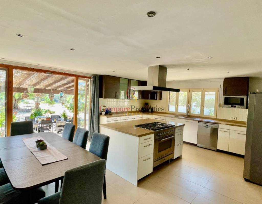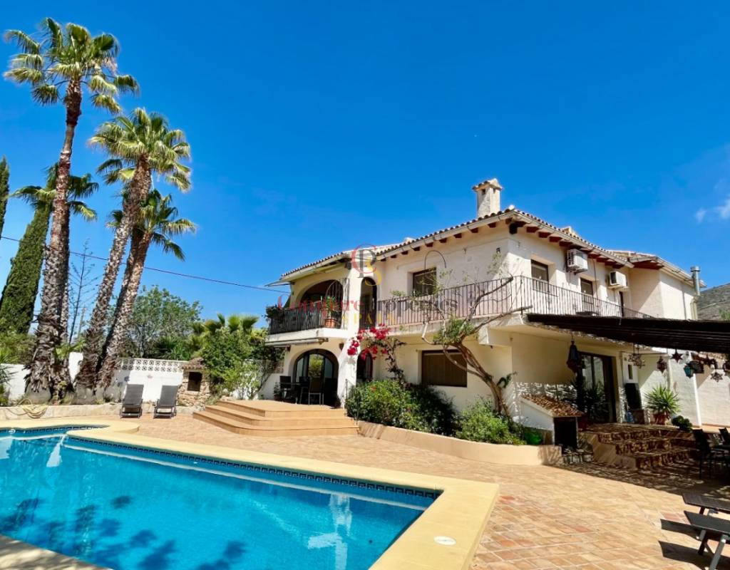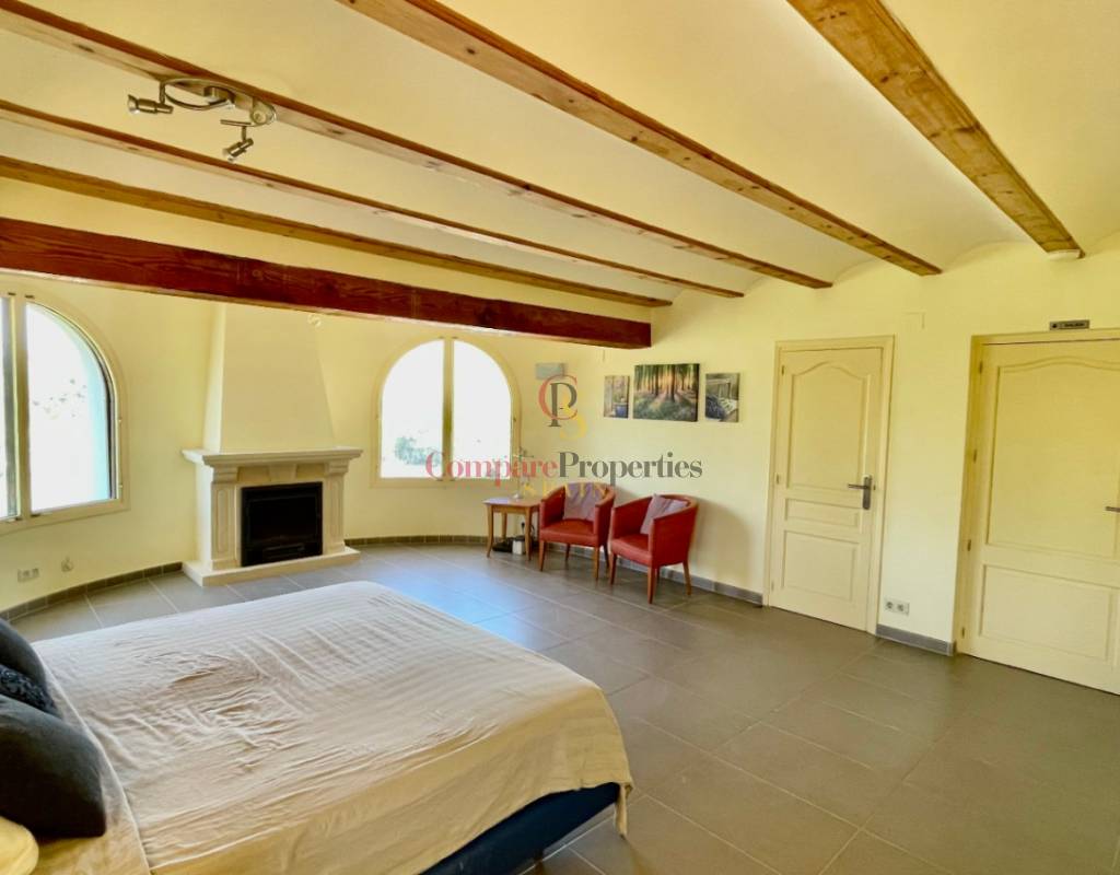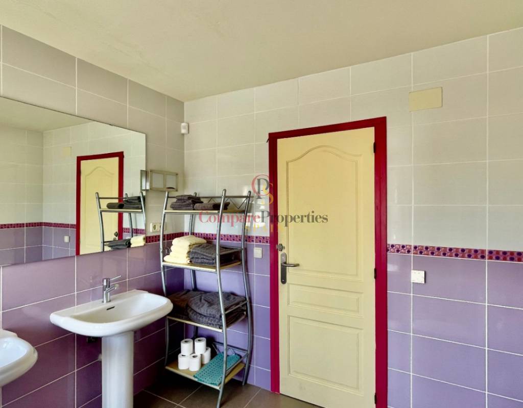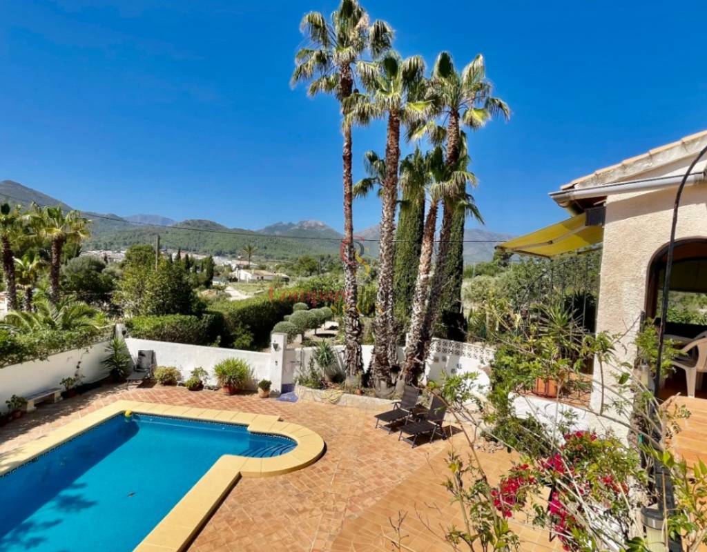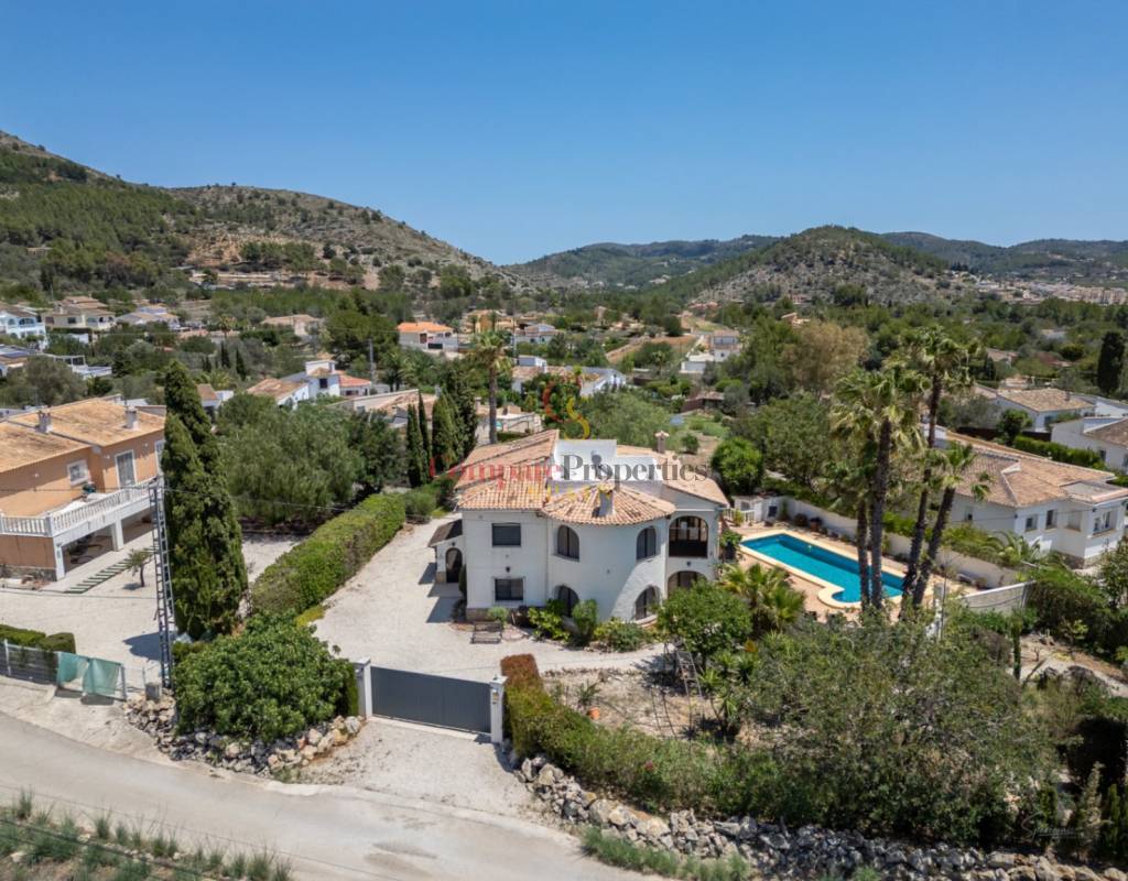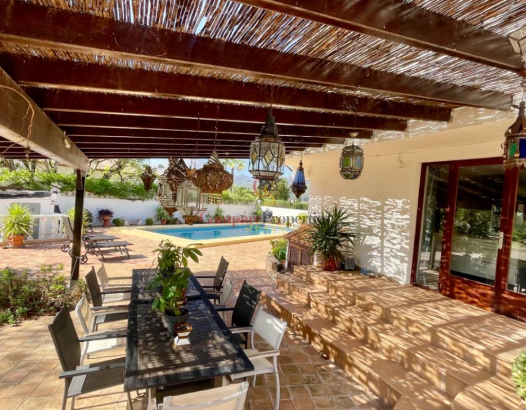 A fabulous, substantial detached family residence situated on a flat south-facing plot within easy walking distance to the town of Jalon. This spacious accommodation comprises an entrance porch leading to a large reception area, an open plan light & airy 80m2 lounge dining kitchen area with featured tosca fireplace, two separate hot and cold air conditioning units, patio doors to open covered naya, a fully fitted luxury kitchen with central cooking island and double patio doors to private wooden pergola perfect for al fresco dining / chill out area. On this level, you will also find a guest double bedroom with fitted wardrobes, a guest toilet, and an additional large utility kitchen room with an external door leading to a private terrace area, which could be converted into another bedroom with an ensuite bathroom. A beautiful marble staircase leads to an upstairs landing, a large master bedroom suite with a featured tosca fireplace and wood-beamed gallery ceiling, patio doors to a private open covered naya with fabulous panoramic views, and a large ensuite bathroom with a separate walk-in shower. There are two further large double bedrooms and a family bathroom with a separate walk-in shower. Outside you will find a large 12m x 6m pool with a private 150m2 sun terrace and a stone-built 25m2 storage casita. The property is fully secured with six cameras, an alarm system, and sensors on all doors and windows. It is on a flat plot with automatic gates and ample off-street parking for cars and campervans. The villa has an established Mediterranean garden with featured palm trees and various fruit trees and has an additional adjacent building plot, which currently has 23 solar panels installed for energy efficiency, but could have a separate private access road from the main entrance with outlined planning permission to build an additional dwelling. This property benefits from partial double glazing, electric wall heaters, and many special features and must be viewed to appreciate its private flat plot and easy access to the town of Jalon with its array of amenities.