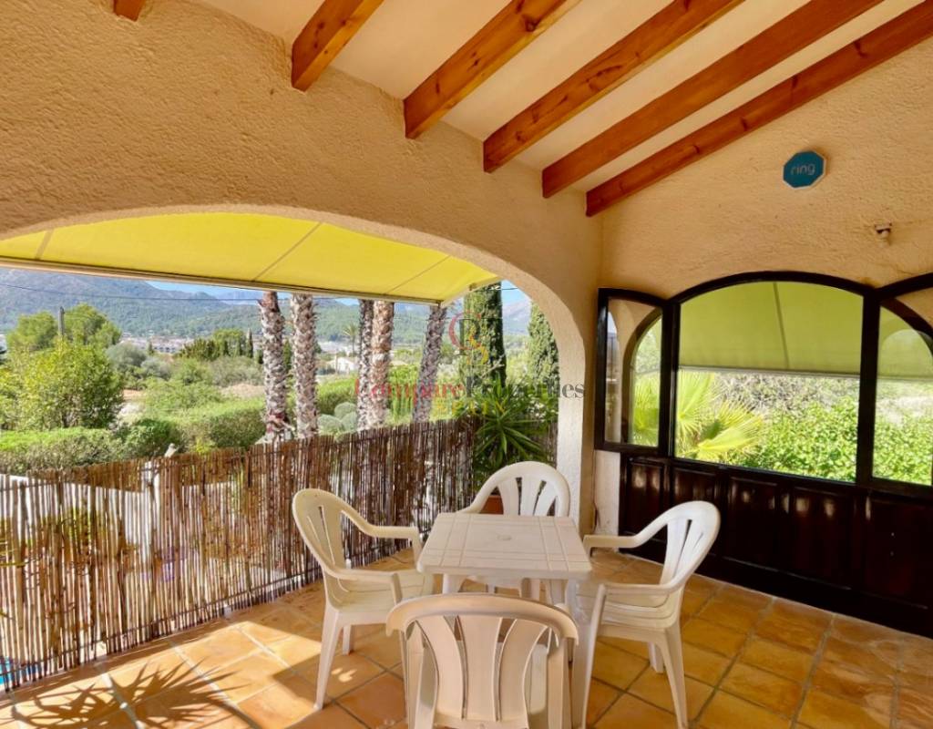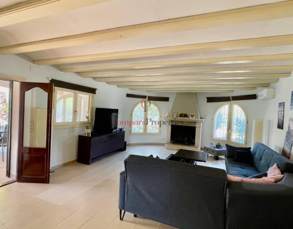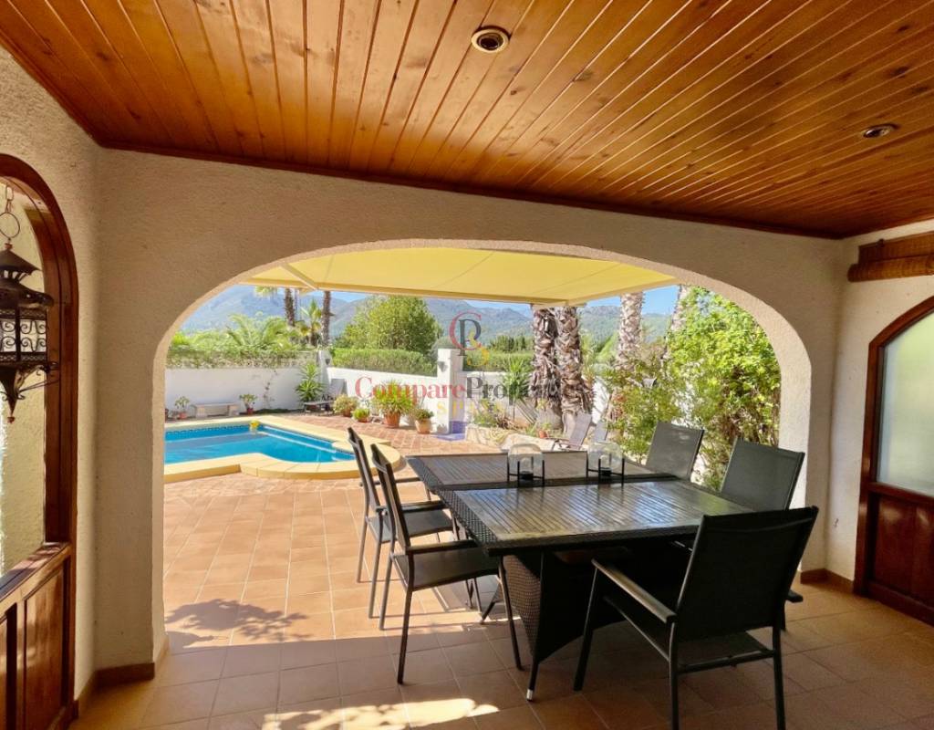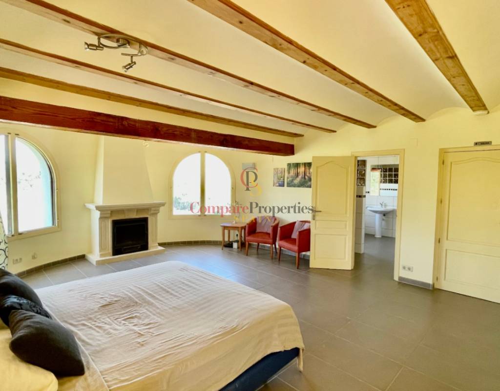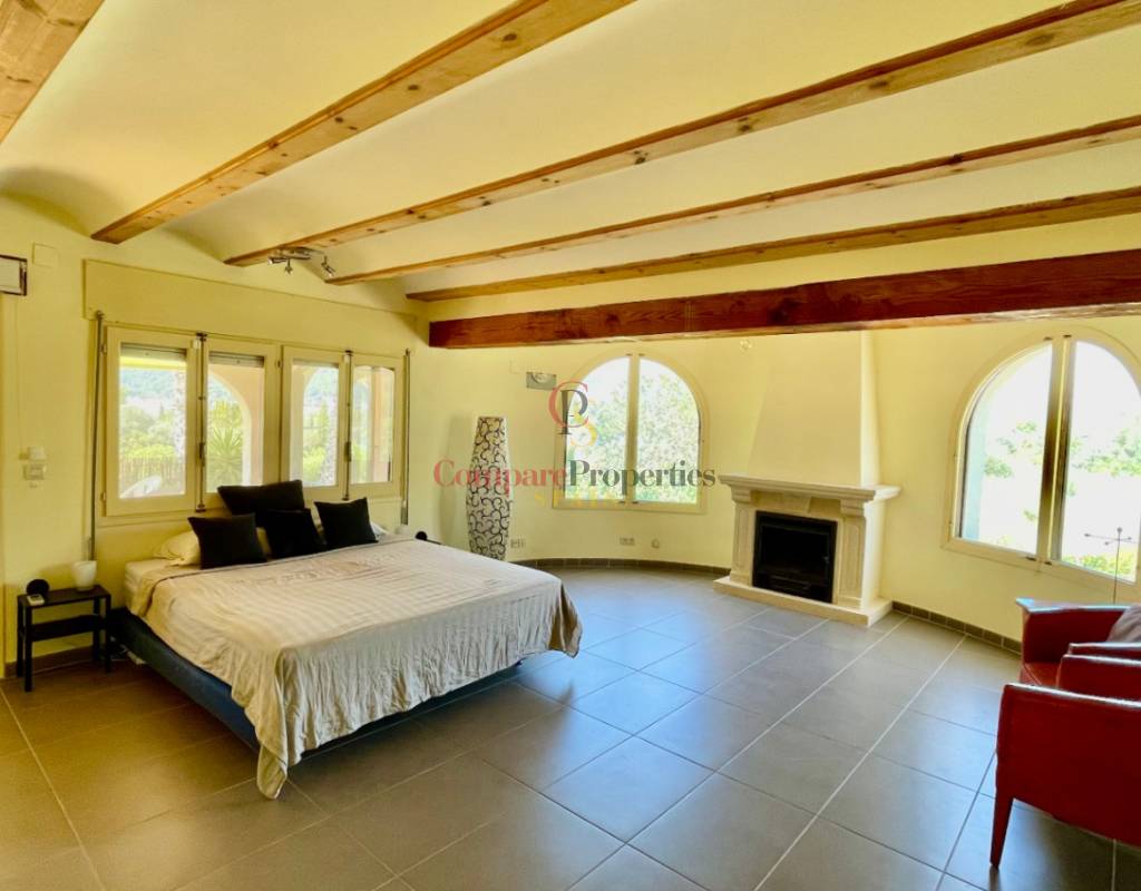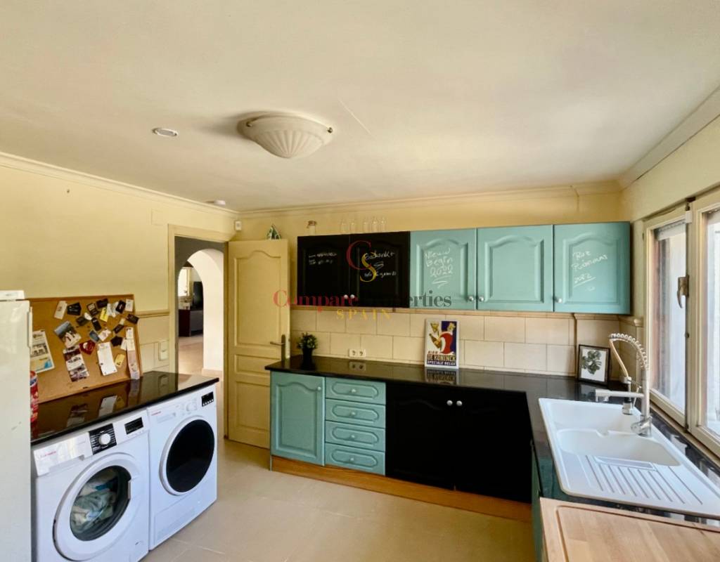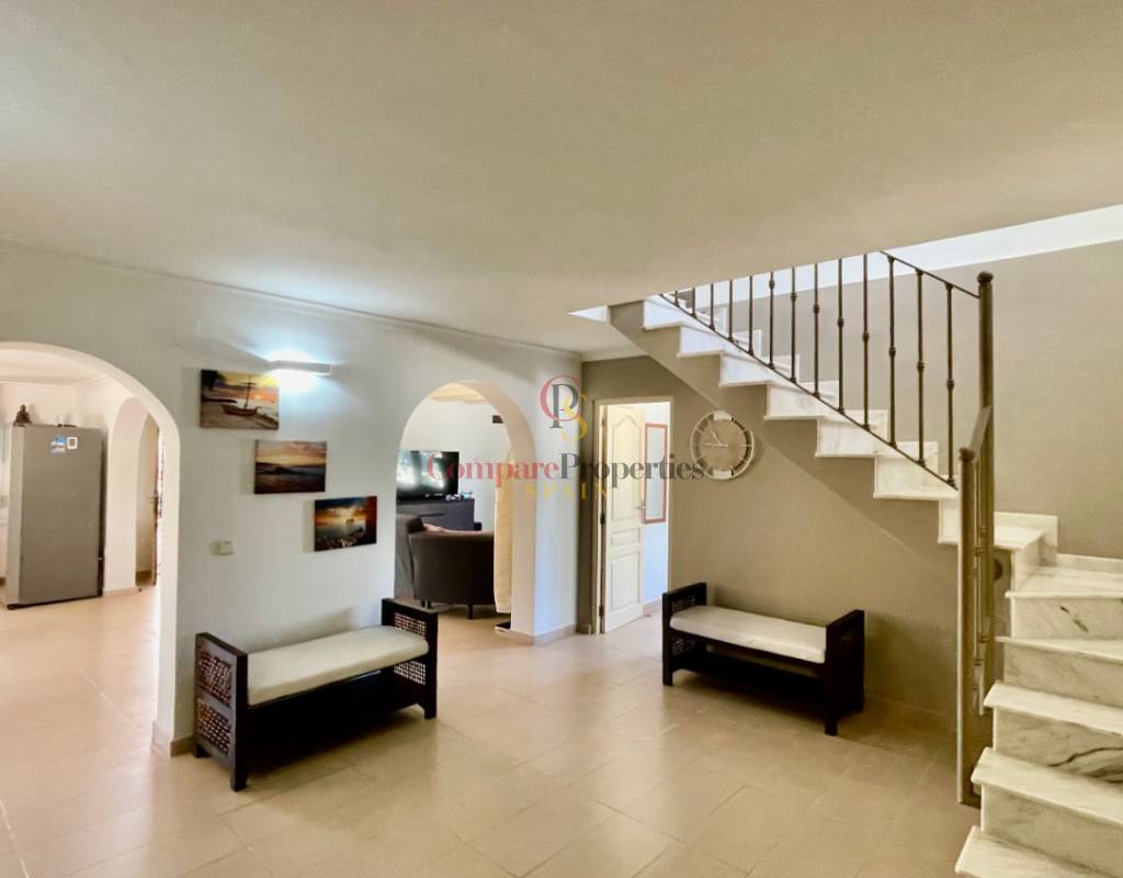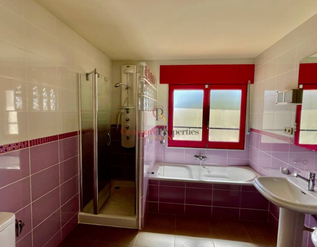 A fabulous, substantial detached family residence situated on a flat south-facing plot within easy walking distance to the town of Jalon. This spacious accommodation comprises an entrance porch leading to a large reception area, an open plan light & airy 80m2 lounge dining kitchen area with featured tosca fireplace, two separate hot and cold air conditioning units, patio doors to open covered naya, a fully fitted luxury kitchen with central cooking island and double patio doors to private wooden pergola perfect for al fresco dining / chill out area. On this level, you will also find a guest double bedroom with fitted wardrobes, a guest toilet, and an additional large utility kitchen room with an external door leading to a private terrace area, which could be converted into another bedroom with an ensuite bathroom. A beautiful marble staircase leads to an upstairs landing, a large master bedroom suite with a featured tosca fireplace and wood-beamed gallery ceiling, patio doors to a private open covered naya with fabulous panoramic views, and a large ensuite bathroom with a separate walk-in shower. There are two further large double bedrooms and a family bathroom with a separate walk-in shower. Outside you will find a large 12m x 6m pool with a private 150m2 sun terrace and a stone-built 25m2 storage casita. The property is fully secured with six cameras, an alarm system, and sensors on all doors and windows. It is on a flat plot with automatic gates and ample off-street parking for cars and campervans. The villa has an established Mediterranean garden with featured palm trees and various fruit trees and has an additional adjacent building plot, which currently has 23 solar panels installed for energy efficiency, but could have a separate private access road from the main entrance with outlined planning permission to build an additional dwelling. This property benefits from partial double glazing, electric wall heaters, and many special features and must be viewed to appreciate its private flat plot and easy access to the town of Jalon with its array of amenities.