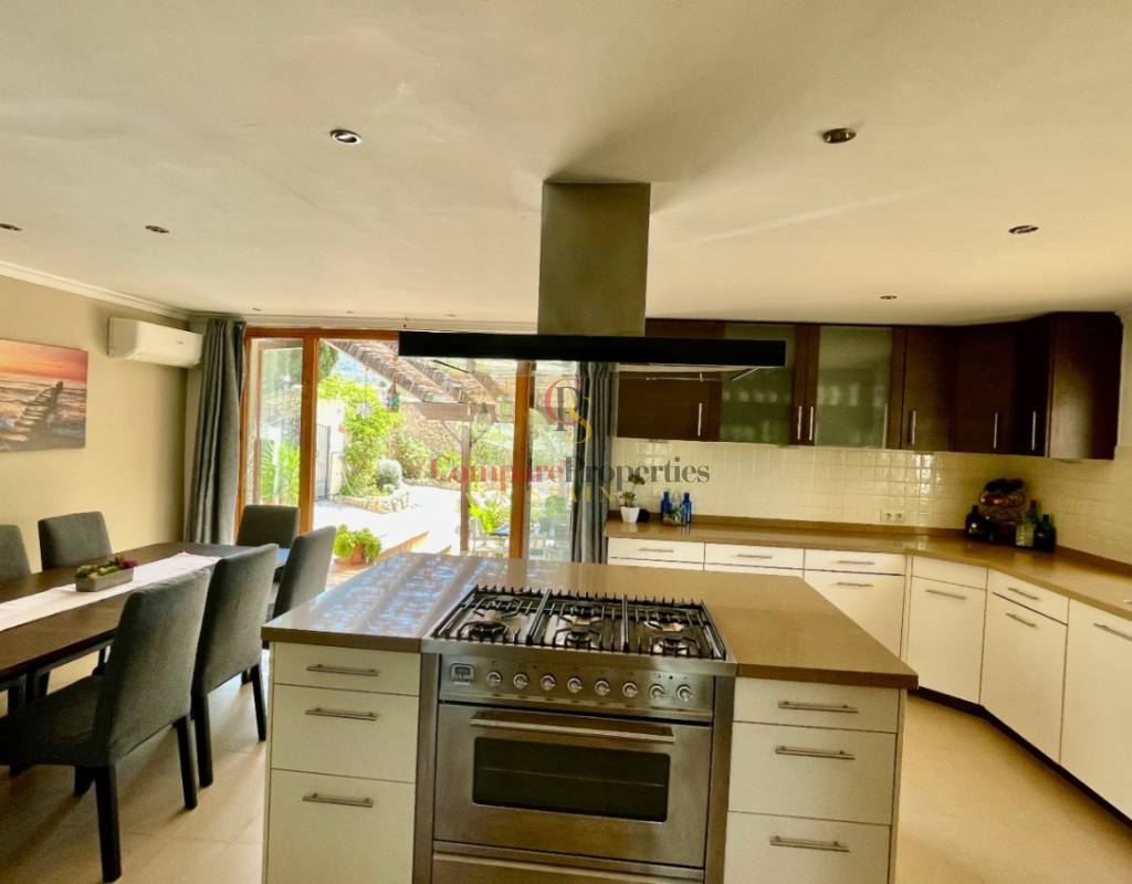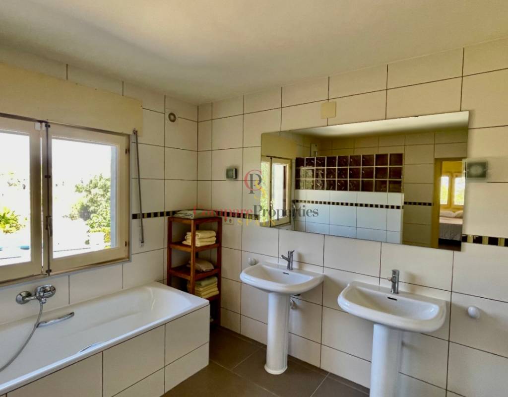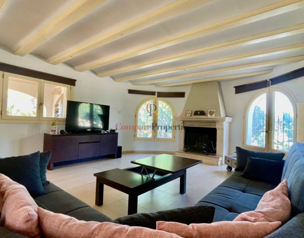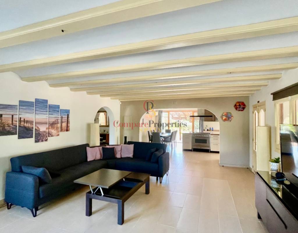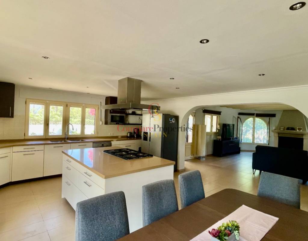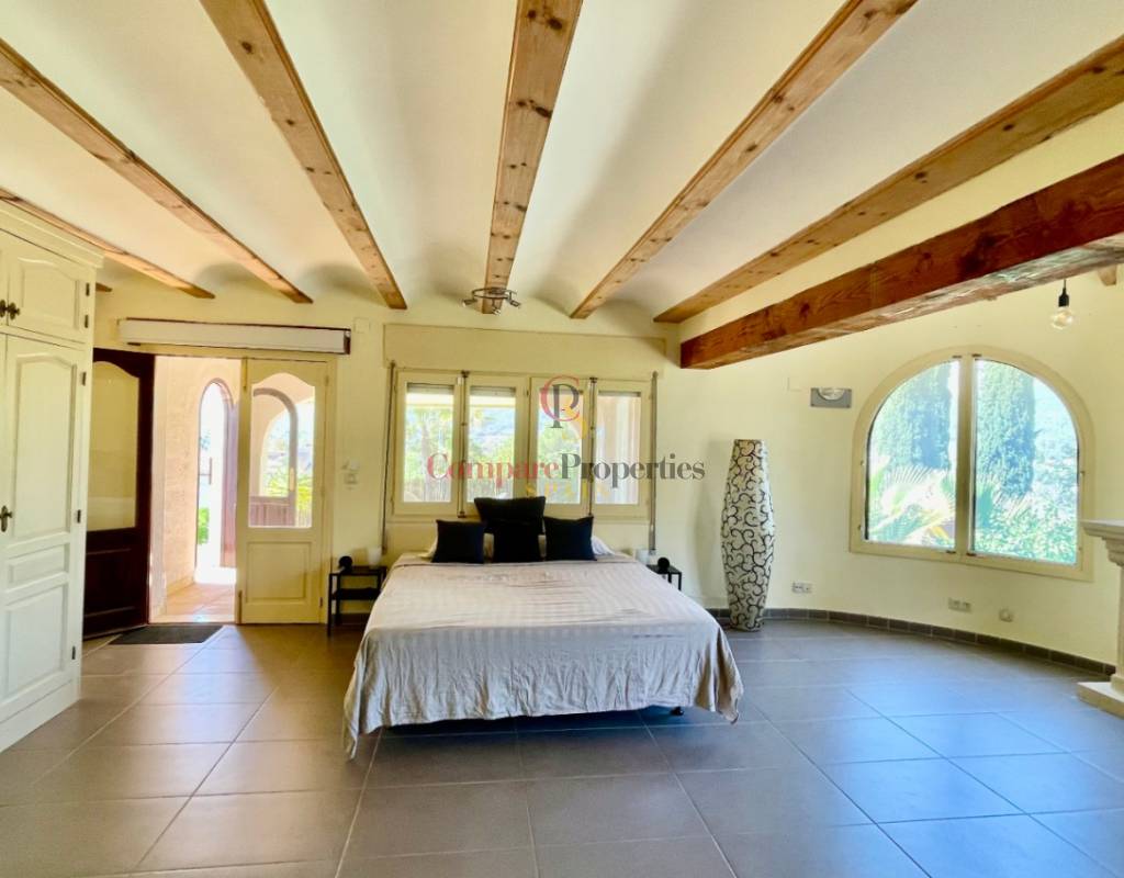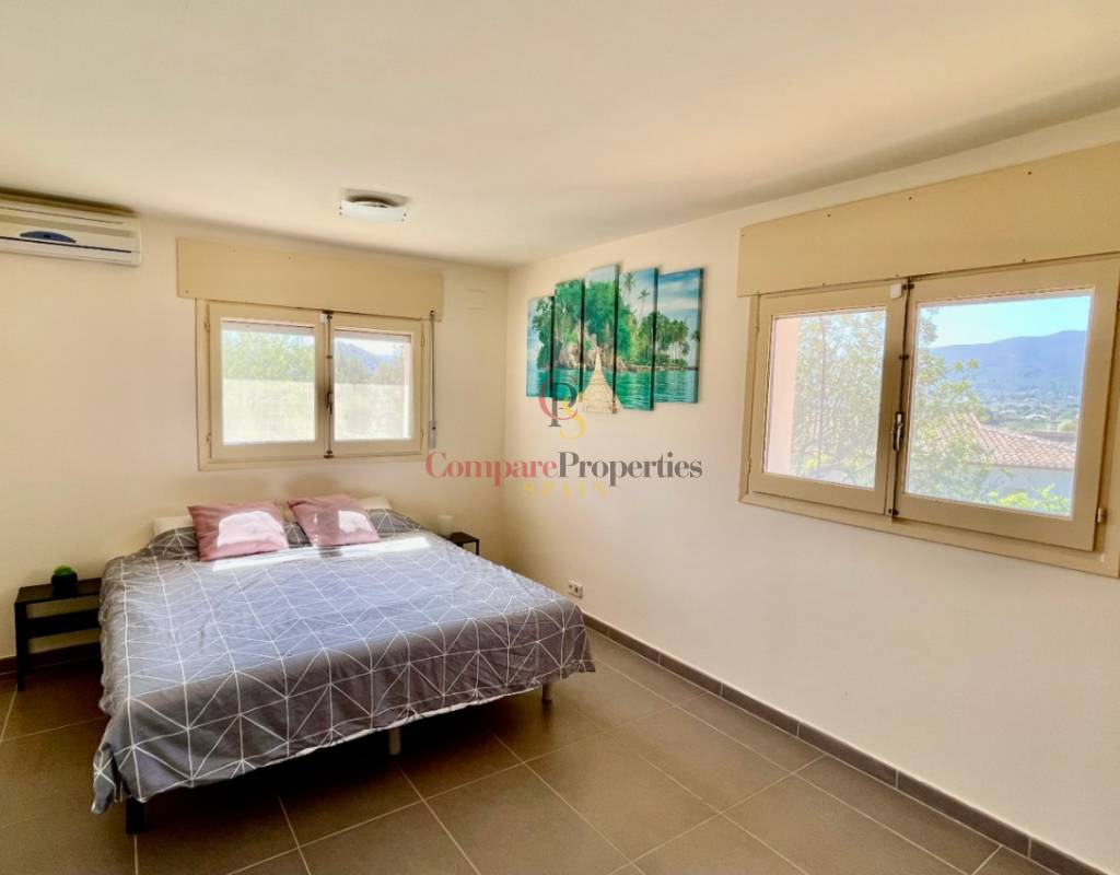 A fabulous, substantial detached family residence situated on a flat south-facing plot within easy walking distance to the town of Jalon. This spacious accommodation comprises an entrance porch leading to a large reception area, an open plan light & airy 80m2 lounge dining kitchen area with featured tosca fireplace, two separate hot and cold air conditioning units, patio doors to open covered naya, a fully fitted luxury kitchen with central cooking island and double patio doors to private wooden pergola perfect for al fresco dining / chill out area. On this level, you will also find a guest double bedroom with fitted wardrobes, a guest toilet, and an additional large utility kitchen room with an external door leading to a private terrace area, which could be converted into another bedroom with an ensuite bathroom. A beautiful marble staircase leads to an upstairs landing, a large master bedroom suite with a featured tosca fireplace and wood-beamed gallery ceiling, patio doors to a private open covered naya with fabulous panoramic views, and a large ensuite bathroom with a separate walk-in shower. There are two further large double bedrooms and a family bathroom with a separate walk-in shower. Outside you will find a large 12m x 6m pool with a private 150m2 sun terrace and a stone-built 25m2 storage casita. The property is fully secured with six cameras, an alarm system, and sensors on all doors and windows. It is on a flat plot with automatic gates and ample off-street parking for cars and campervans. The villa has an established Mediterranean garden with featured palm trees and various fruit trees and has an additional adjacent building plot, which currently has 23 solar panels installed for energy efficiency, but could have a separate private access road from the main entrance with outlined planning permission to build an additional dwelling. This property benefits from partial double glazing, electric wall heaters, and many special features and must be viewed to appreciate its private flat plot and easy access to the town of Jalon with its array of amenities.