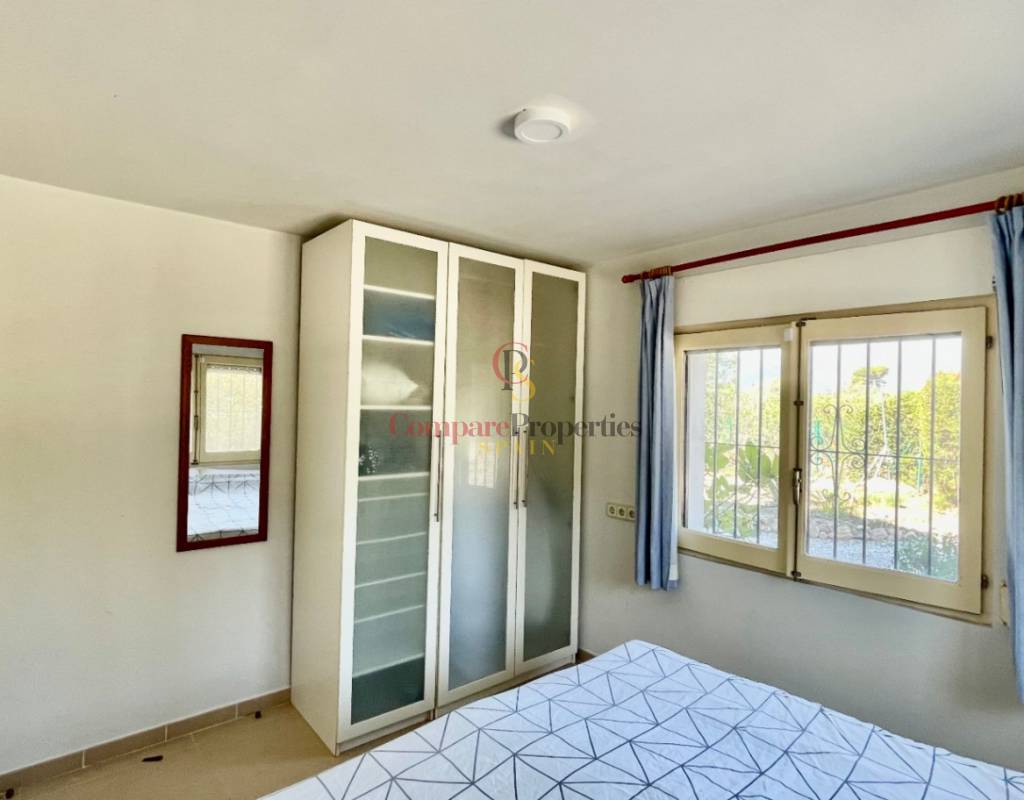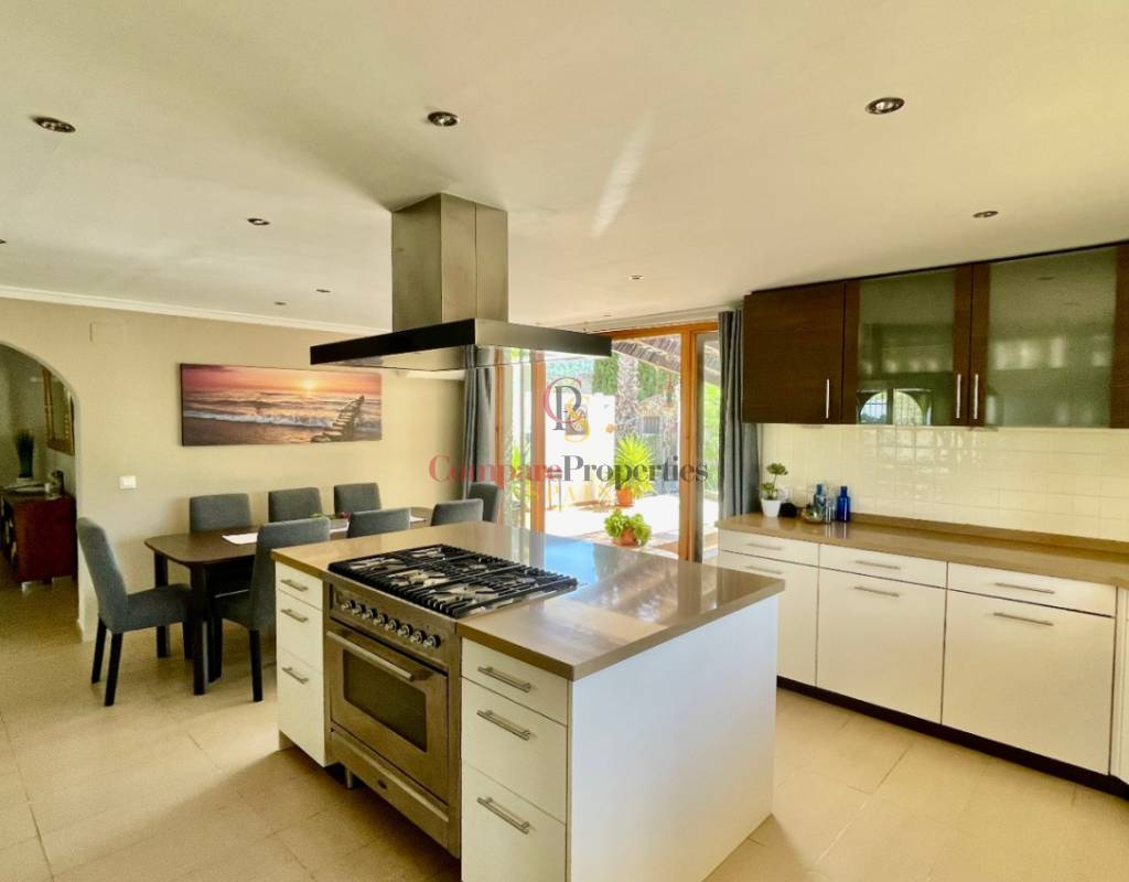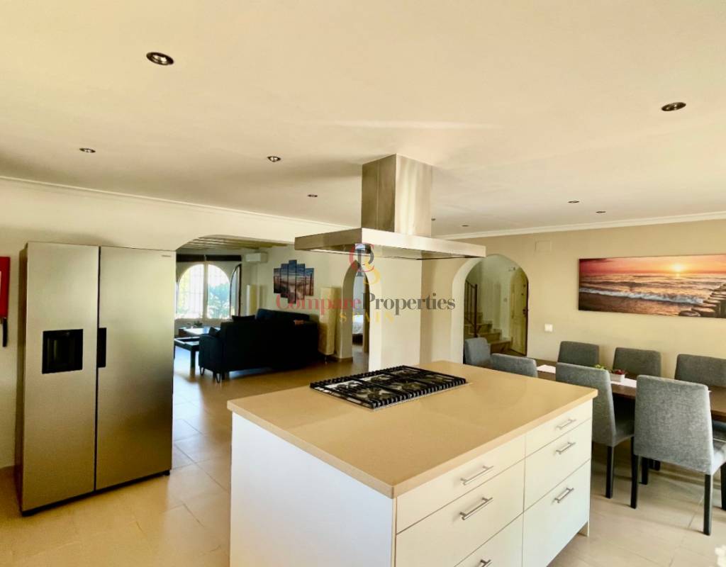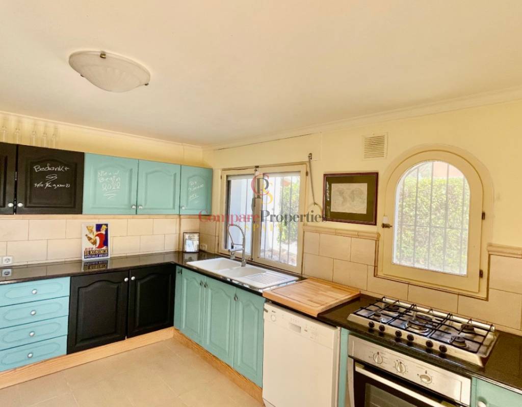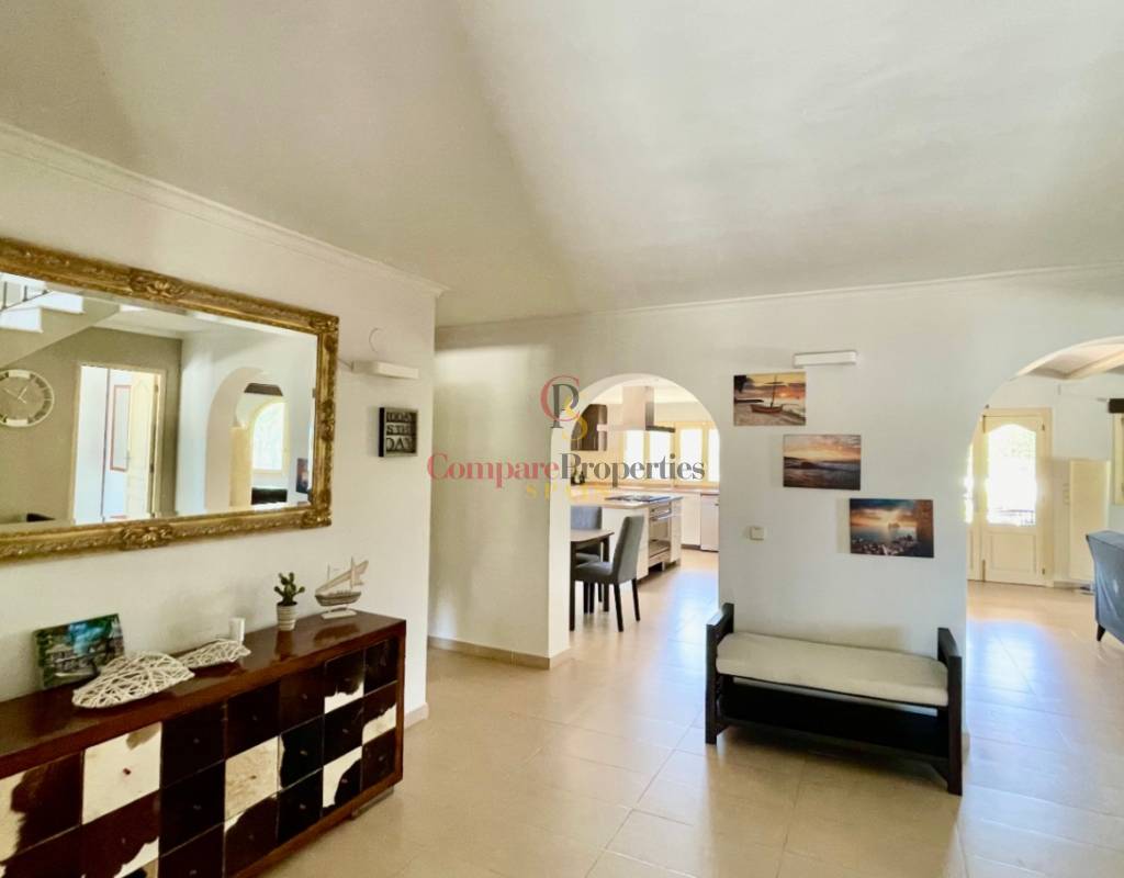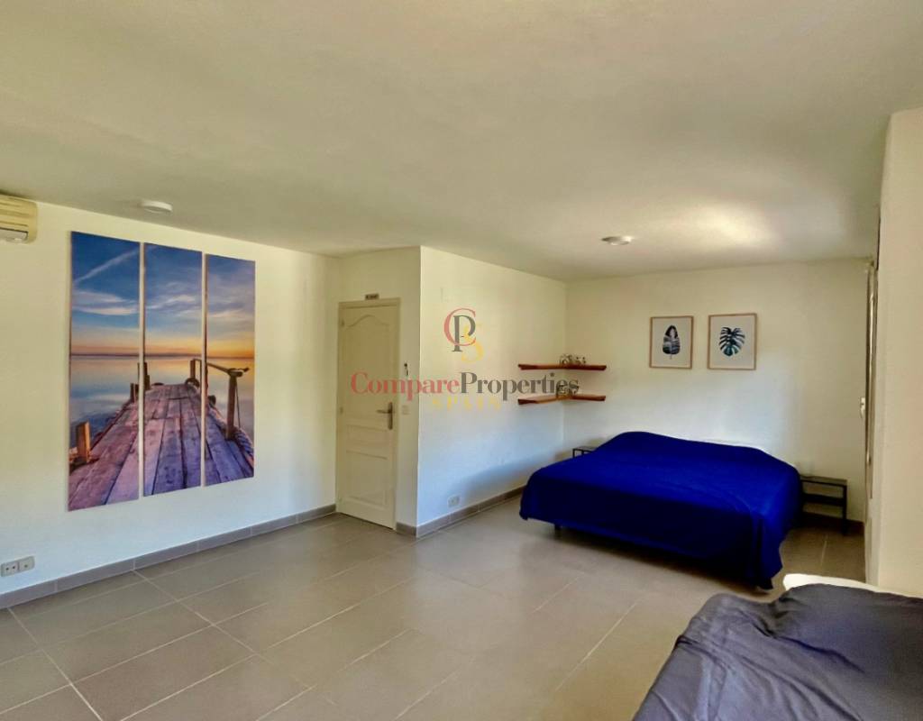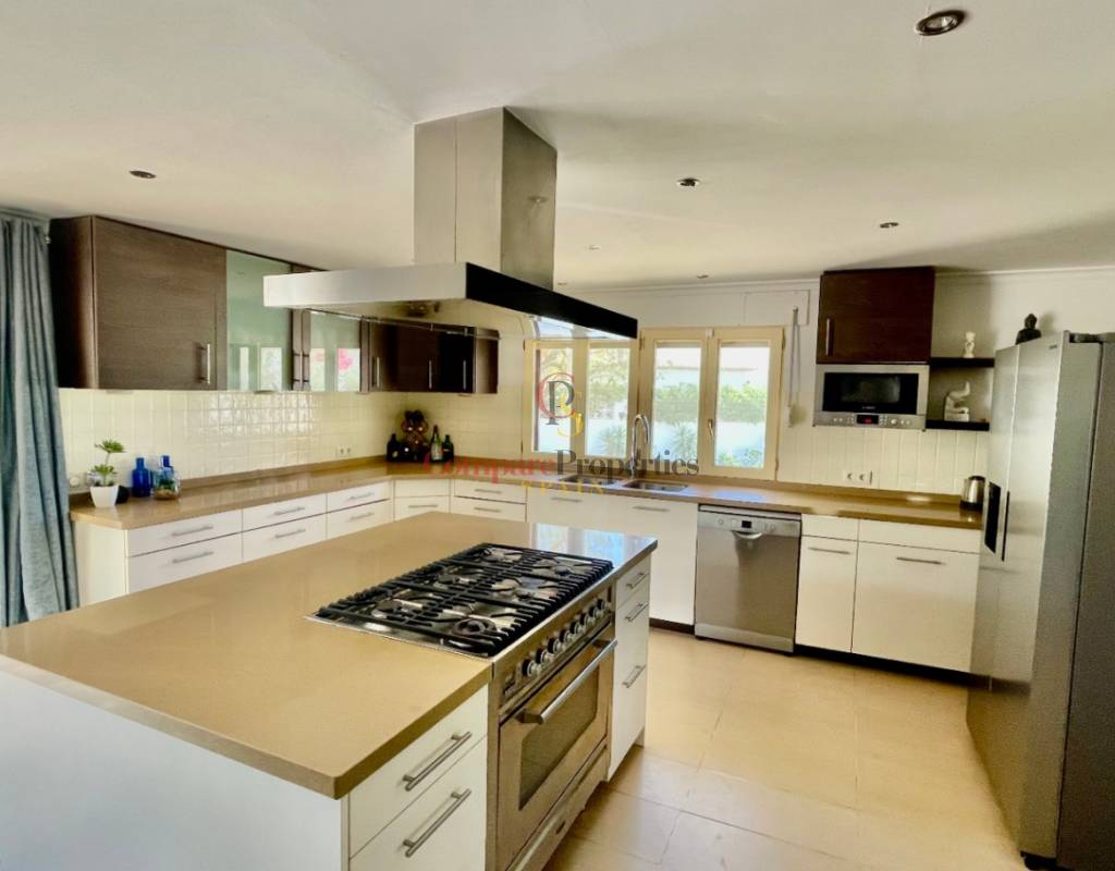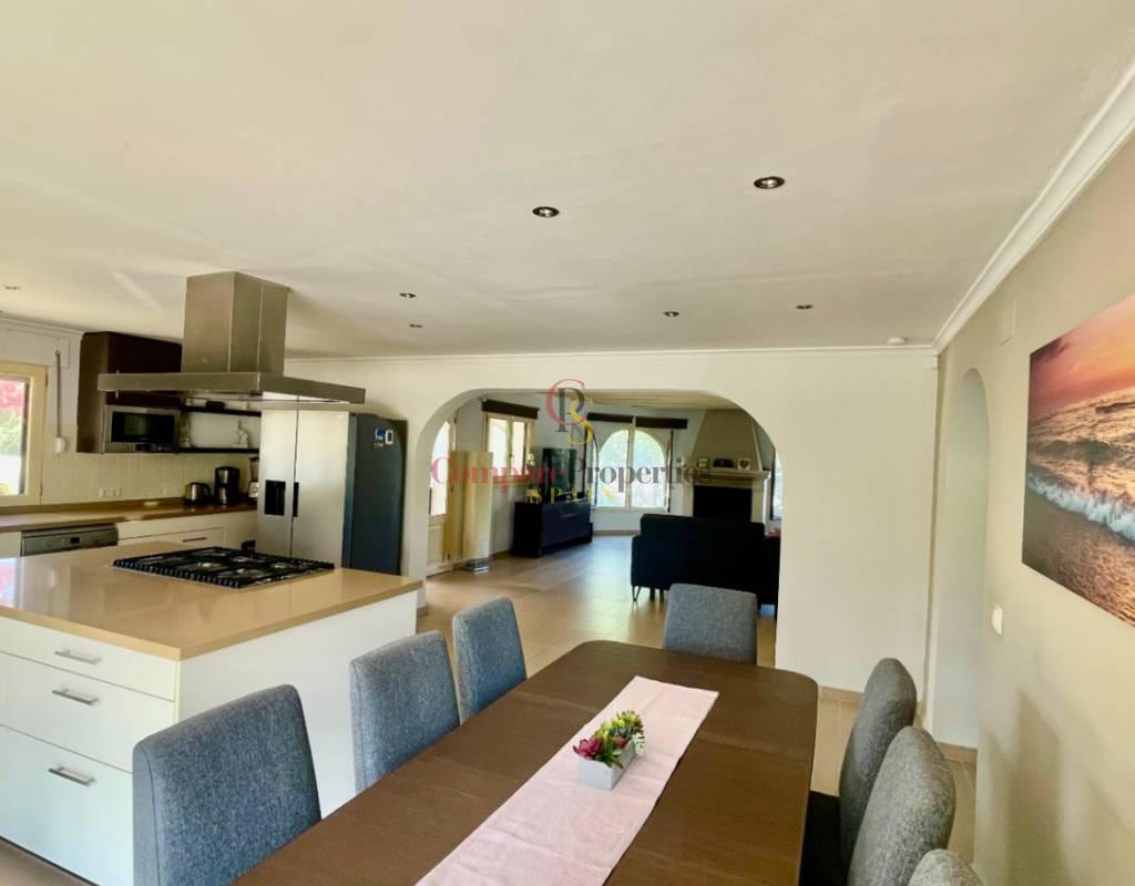 A fabulous, substantial detached family residence situated on a flat south-facing plot within easy walking distance to the town of Jalon. This spacious accommodation comprises an entrance porch leading to a large reception area, an open plan light & airy 80m2 lounge dining kitchen area with featured tosca fireplace, two separate hot and cold air conditioning units, patio doors to open covered naya, a fully fitted luxury kitchen with central cooking island and double patio doors to private wooden pergola perfect for al fresco dining / chill out area. On this level, you will also find a guest double bedroom with fitted wardrobes, a guest toilet, and an additional large utility kitchen room with an external door leading to a private terrace area, which could be converted into another bedroom with an ensuite bathroom. A beautiful marble staircase leads to an upstairs landing, a large master bedroom suite with a featured tosca fireplace and wood-beamed gallery ceiling, patio doors to a private open covered naya with fabulous panoramic views, and a large ensuite bathroom with a separate walk-in shower. There are two further large double bedrooms and a family bathroom with a separate walk-in shower. Outside you will find a large 12m x 6m pool with a private 150m2 sun terrace and a stone-built 25m2 storage casita. The property is fully secured with six cameras, an alarm system, and sensors on all doors and windows. It is on a flat plot with automatic gates and ample off-street parking for cars and campervans. The villa has an established Mediterranean garden with featured palm trees and various fruit trees and has an additional adjacent building plot, which currently has 23 solar panels installed for energy efficiency, but could have a separate private access road from the main entrance with outlined planning permission to build an additional dwelling. This property benefits from partial double glazing, electric wall heaters, and many special features and must be viewed to appreciate its private flat plot and easy access to the town of Jalon with its array of amenities.