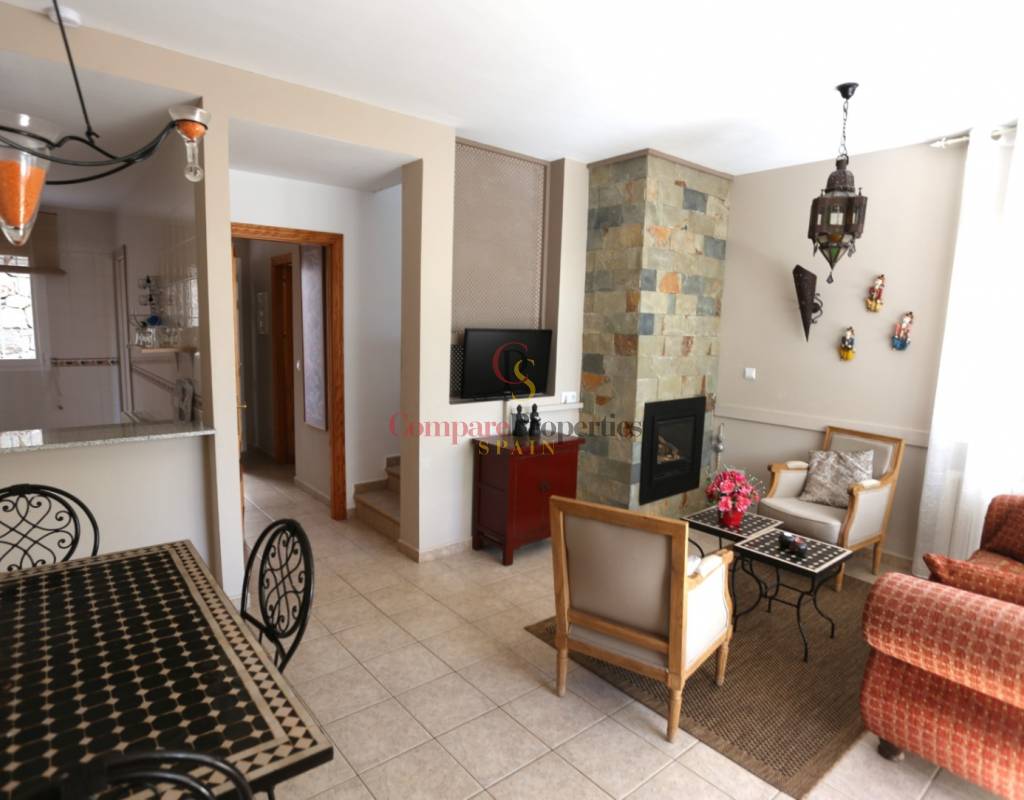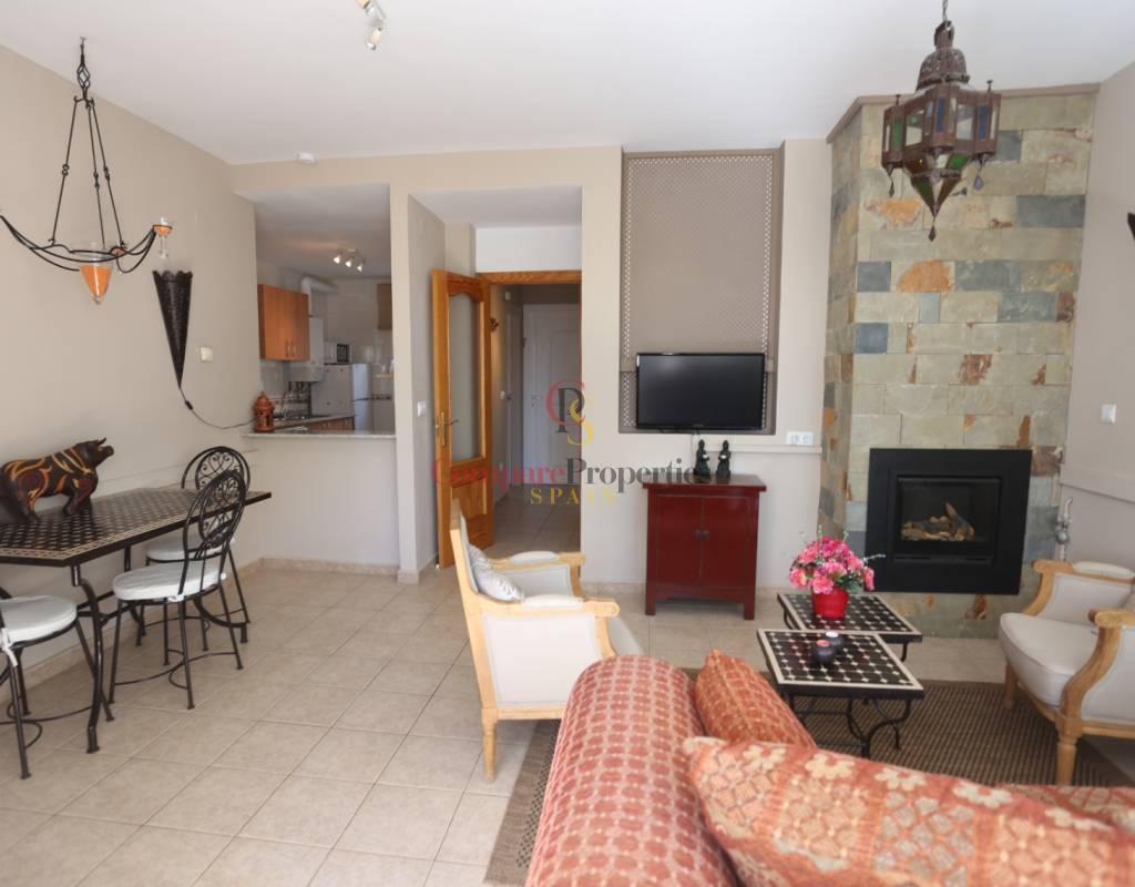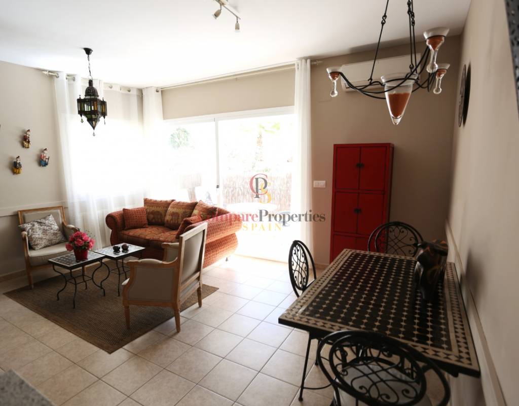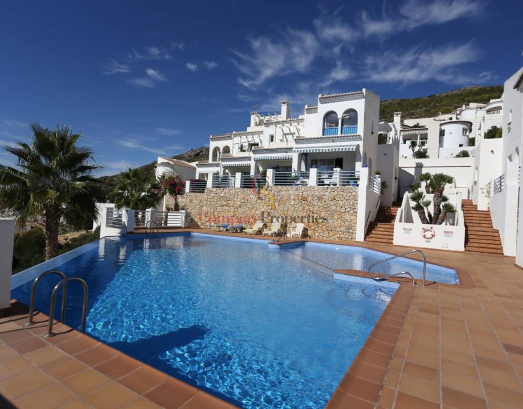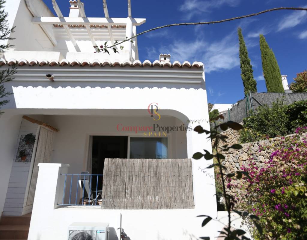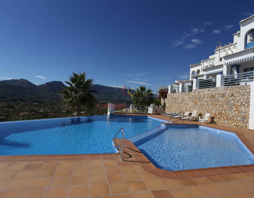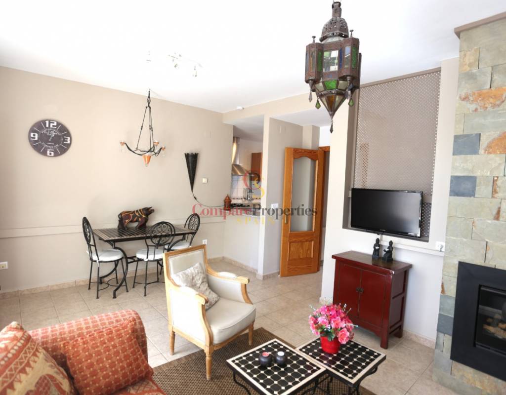 Located on an exclusive development just a short distance from the charming town of Jalon, this beautifully presented south-facing linked townhouse offers modern, light-filled living with stunning views across the valley. The property features a spacious open-plan lounge and dining area with a stylish log-effect gas fire, hot and cold air conditioning, and sliding patio doors that lead to a covered naya and a private enclosed sun terrace, perfect for relaxing or entertaining. The fully fitted kitchen includes a convenient hatch/breakfast bar, and there is also a guest toilet on the ground floor. Upstairs comprises a bright master bedroom with fitted wardrobes, air conditioning, and direct access to a private sun terrace, a second double bedroom with fitted wardrobes and a ceiling fan, and a generous family walk-in shower room. Additional benefits include metered gas central heating, double glazing throughout, and off-street parking within the complex. The small, well-maintained development boasts a fabulous infinity communal pool with poolside shower and sun terrace areas, all enjoying breathtaking panoramic views of the Jalon Valley. Ideal as a permanent residence, lock-up-and-leave holiday home, or rental investment, this stylish property is presented in excellent condition and must be seen to be fully appreciated.