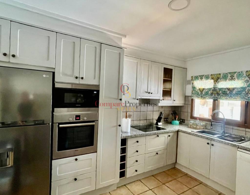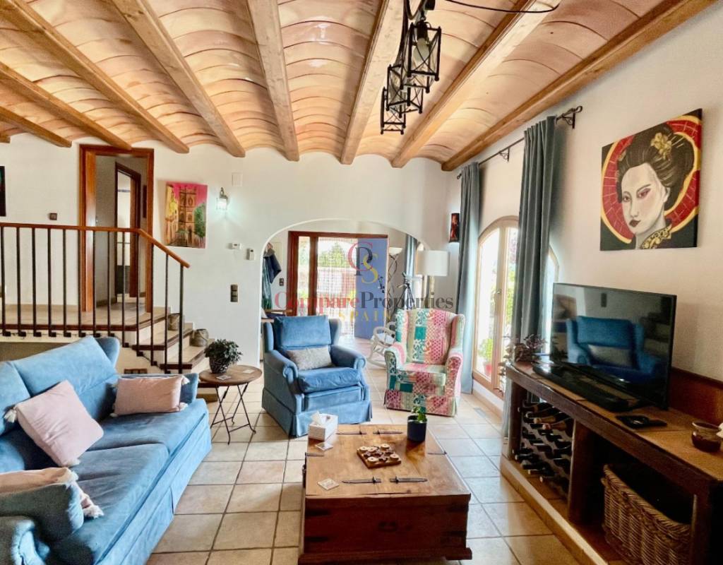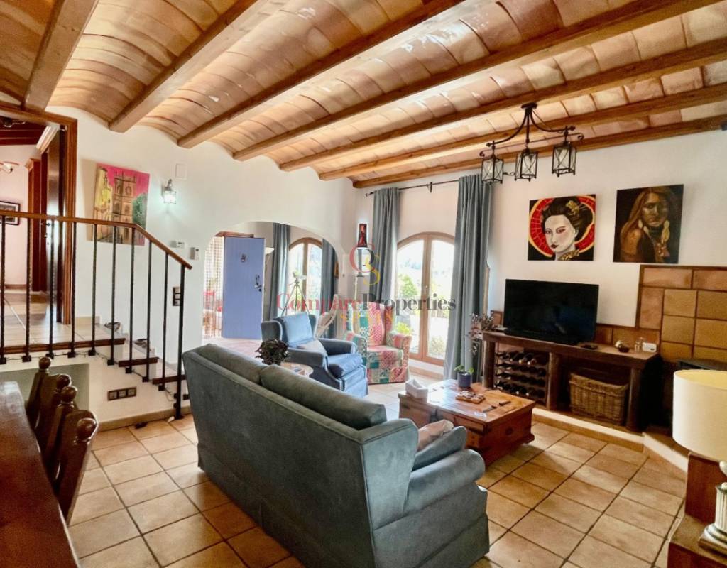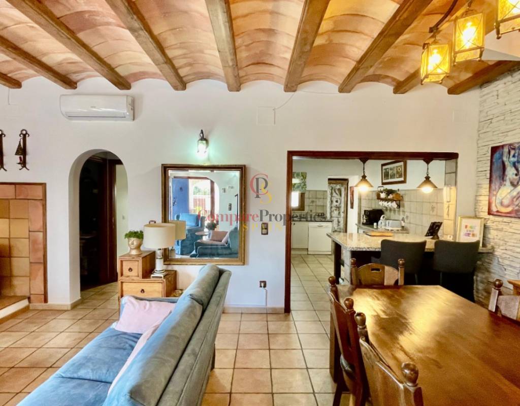 A modern Spanish village home that beautifully preserves its traditional charm while offering a unique contemporary ambience. Set on a prime, private, south-facing frontline flat plot with breathtaking panoramic views, this exceptional property is just a 3-minute walk from the centre of Alcalalí and includes a separate two-bedroom guesthouse.