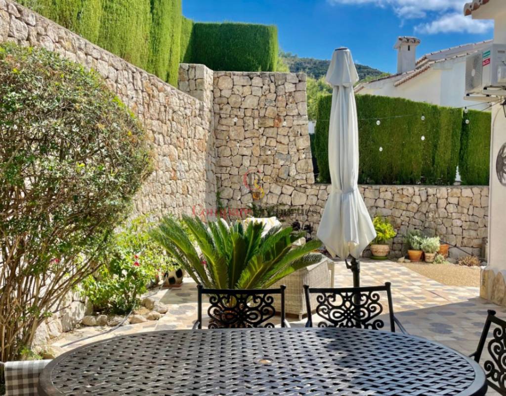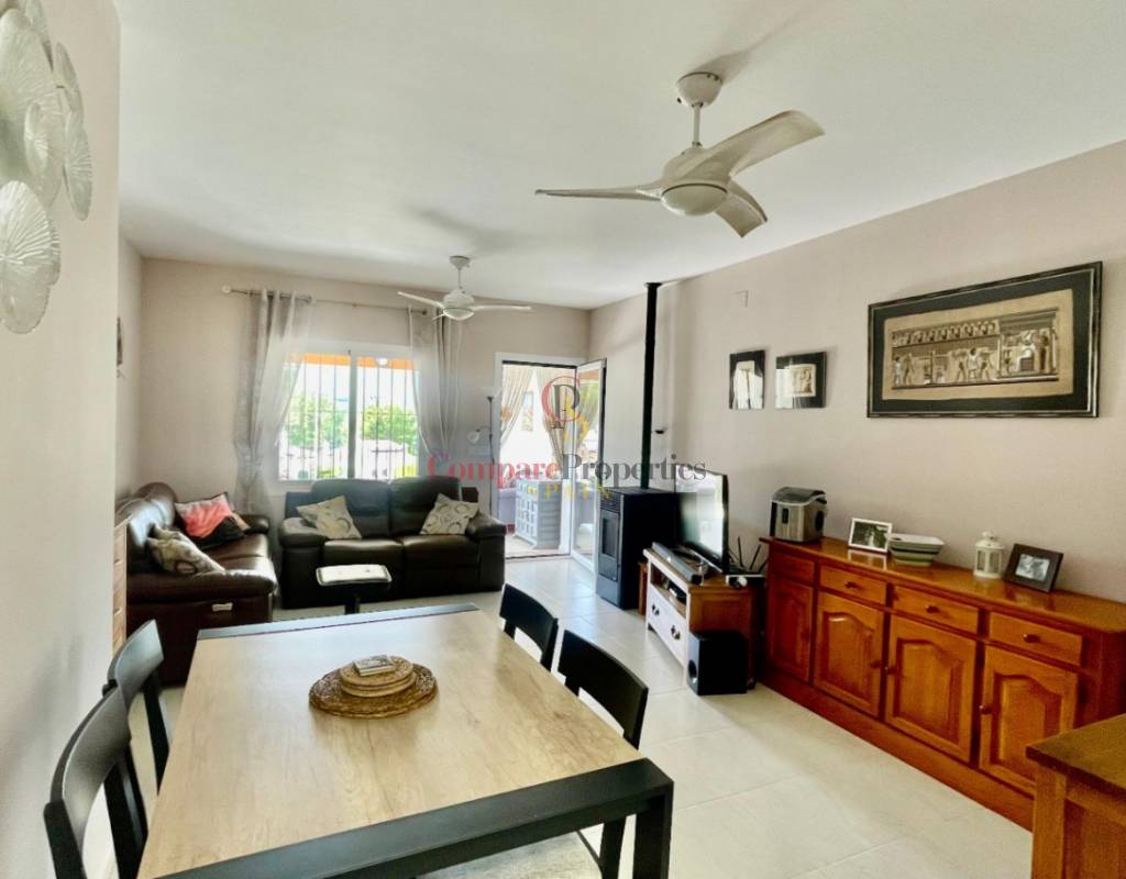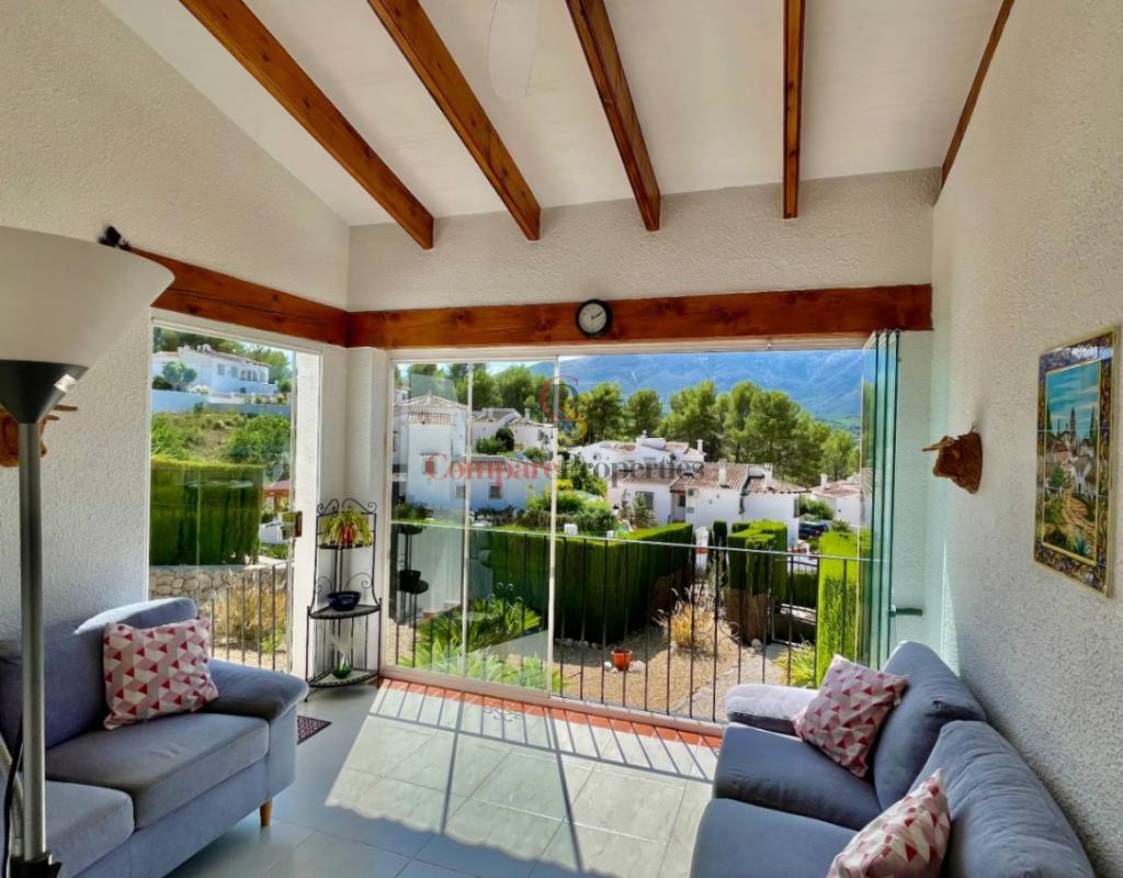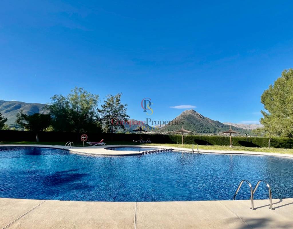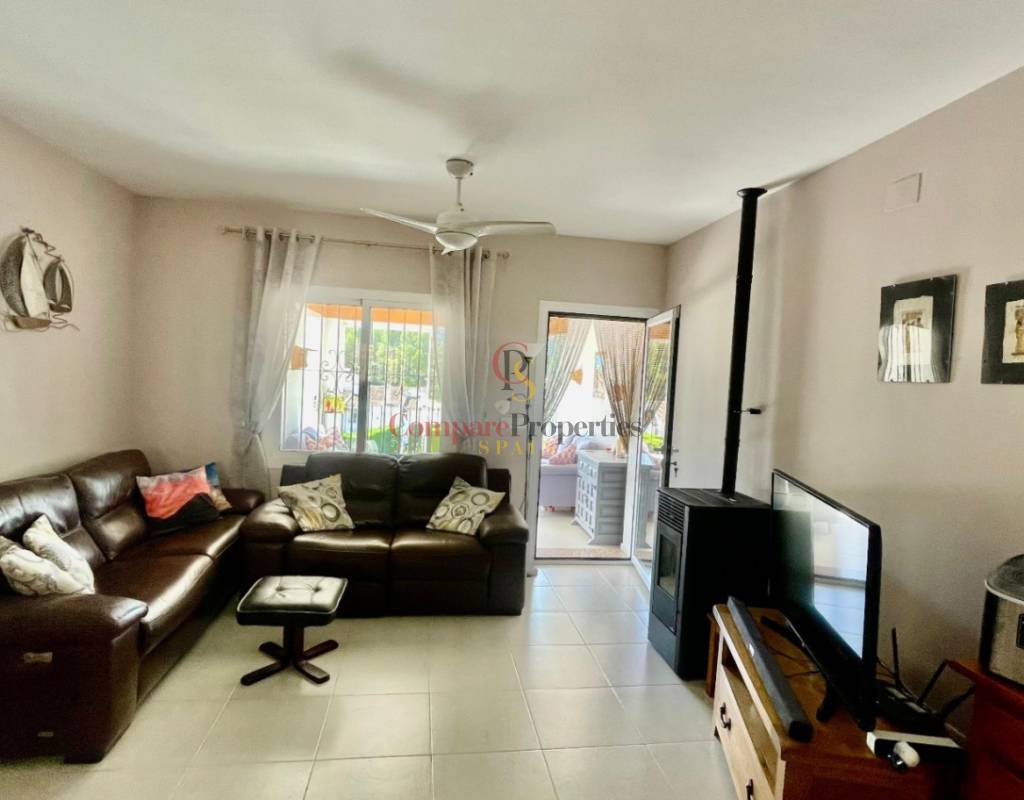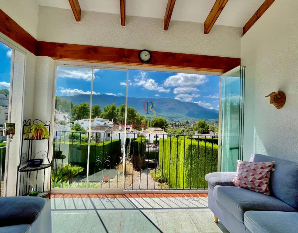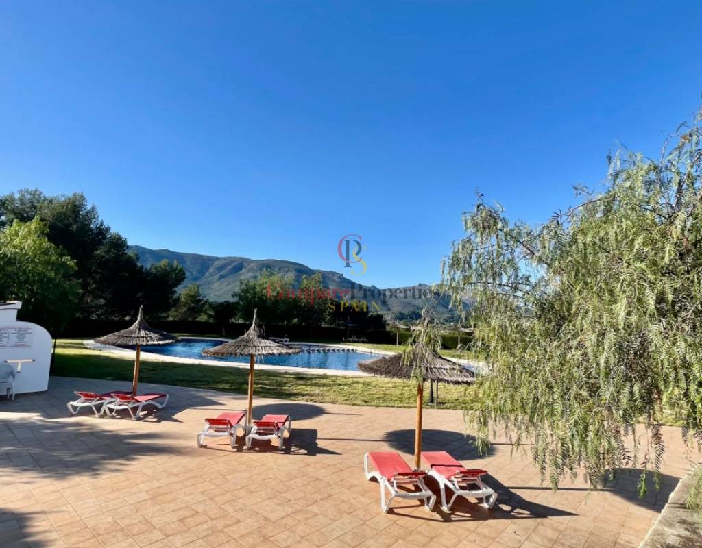 An immaculate, south-facing luxury semi-detached villa offering spectacular mountain and valley views, located on a sought-after, well-maintained urbanisation. Recently reformed, the home features a bright glass-curtained naya with high wood-beamed ceilings, a spacious open-plan lounge and dining area with pellet stove, air conditioning, and ceiling fans, plus a fully fitted luxury kitchen opening onto a private al fresco dining terrace with wood pergola, feature dry-stone walls – perfect for entertaining. The villa includes two double bedrooms with fitted wardrobes, air conditioning, ceiling fans, and a stylish walk-in shower room. Additional highlights include new double-glazed windows, energy-efficient solar hot water, an underbuild storage room, a secure low-maintenance south-facing garden, and off-street parking. There is fibre internet on the urbanisation. Residents enjoy access to a beautifully maintained communal pool with facilities, and the property is within walking distance of a popular restaurant, just minutes from Orba, Jalon, and Murla, and a short drive to Denia’s beaches, Javea, Moraira, and Calpe. This easy-access home must be viewed to appreciate its many special features and stunning views across the Jalon Valley.