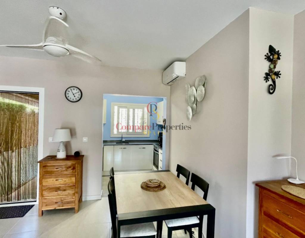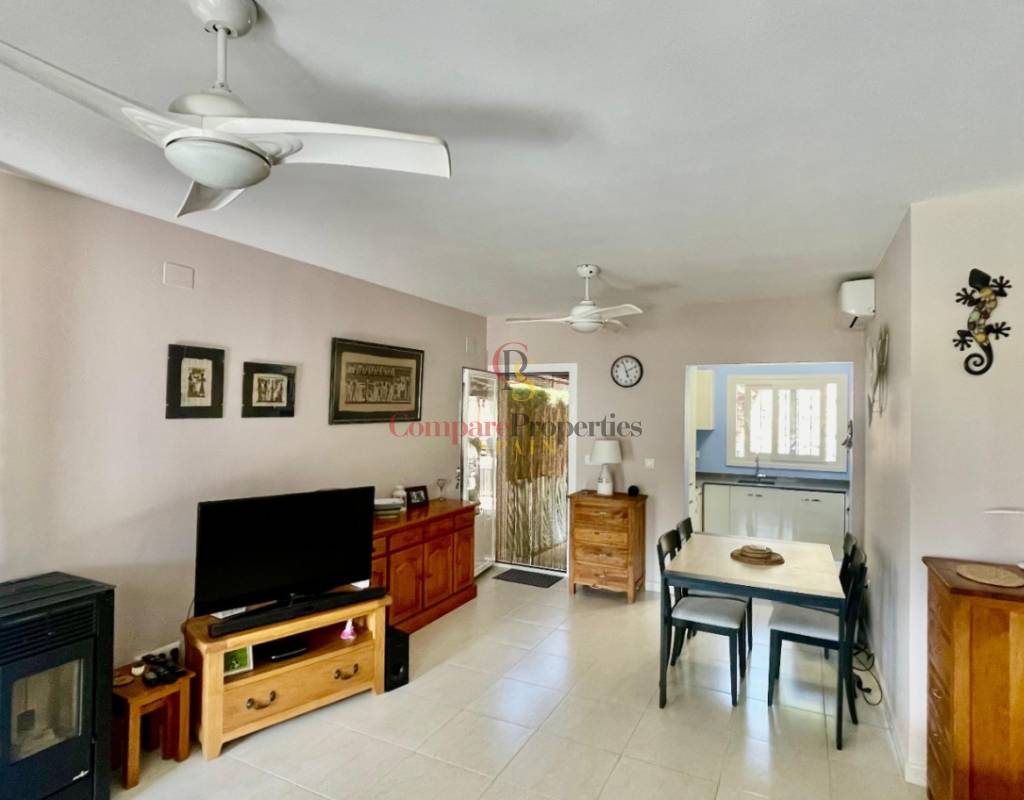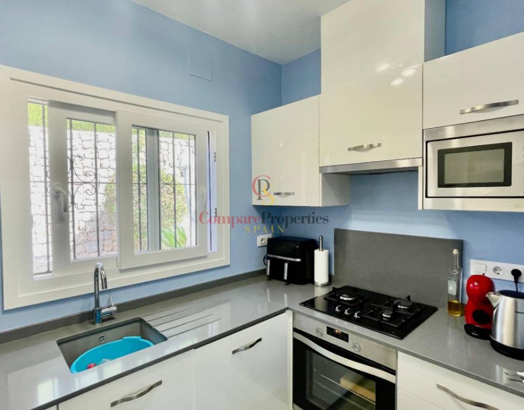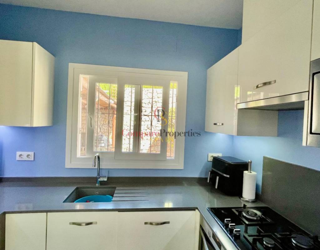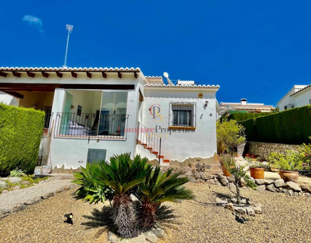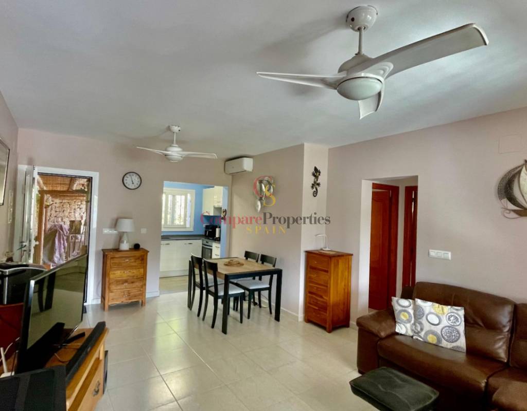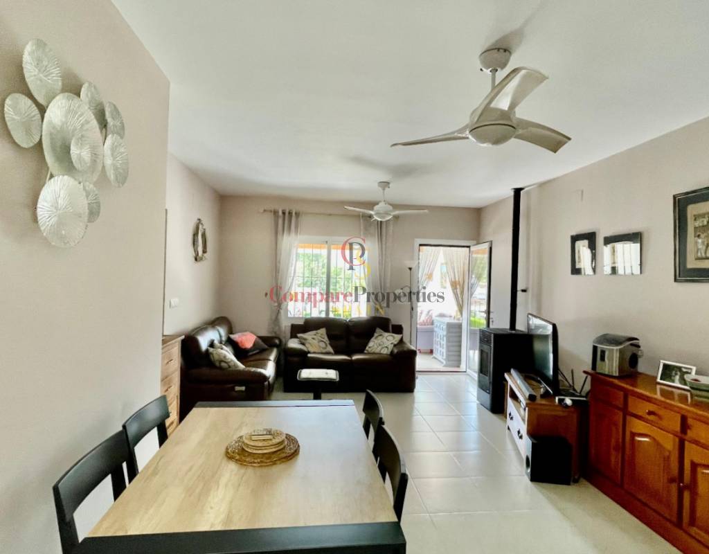 An immaculate, south-facing luxury semi-detached villa offering spectacular mountain and valley views, located on a sought-after, well-maintained urbanisation. Recently reformed, the home features a bright glass-curtained naya with high wood-beamed ceilings, a spacious open-plan lounge and dining area with pellet stove, air conditioning, and ceiling fans, plus a fully fitted luxury kitchen opening onto a private al fresco dining terrace with wood pergola, feature dry-stone walls – perfect for entertaining. The villa includes two double bedrooms with fitted wardrobes, air conditioning, ceiling fans, and a stylish walk-in shower room. Additional highlights include new double-glazed windows, energy-efficient solar hot water, an underbuild storage room, a secure low-maintenance south-facing garden, and off-street parking. There is fibre internet on the urbanisation. Residents enjoy access to a beautifully maintained communal pool with facilities, and the property is within walking distance of a popular restaurant, just minutes from Orba, Jalon, and Murla, and a short drive to Denia’s beaches, Javea, Moraira, and Calpe. This easy-access home must be viewed to appreciate its many special features and stunning views across the Jalon Valley.