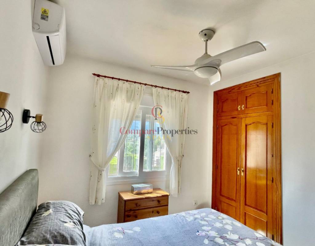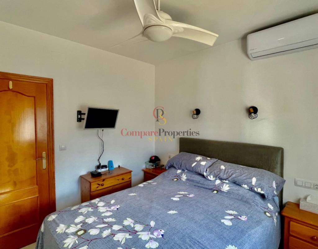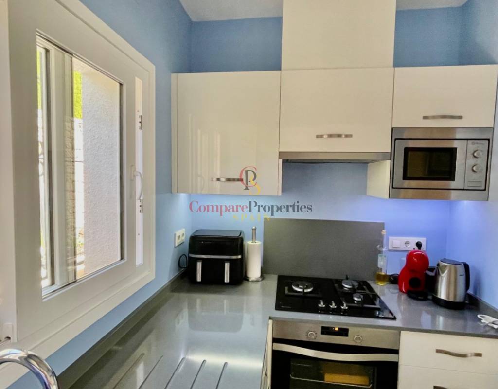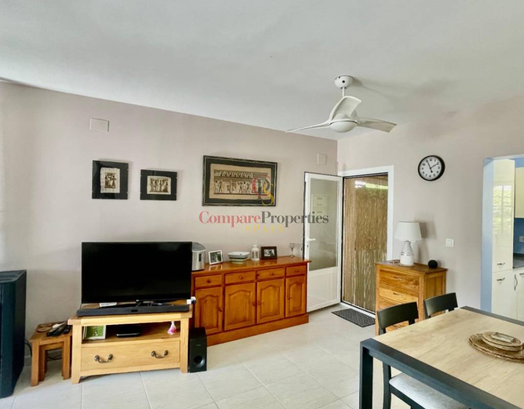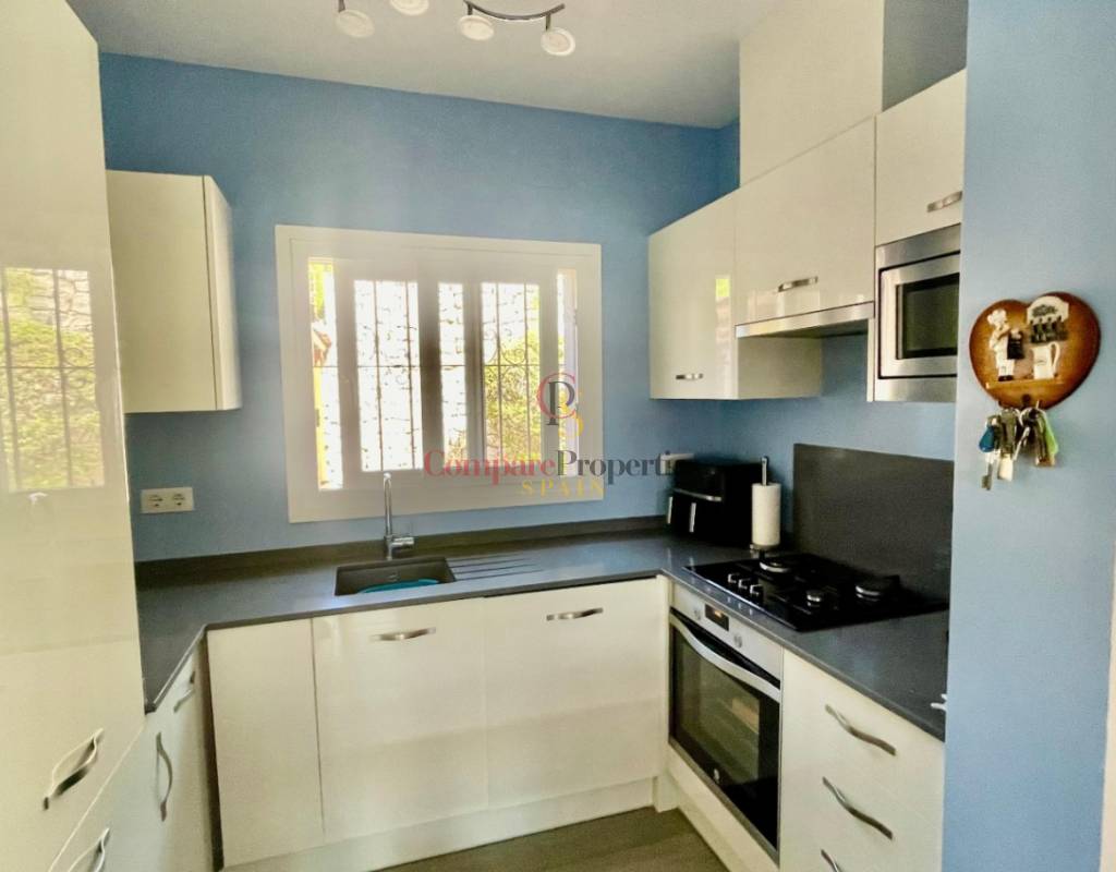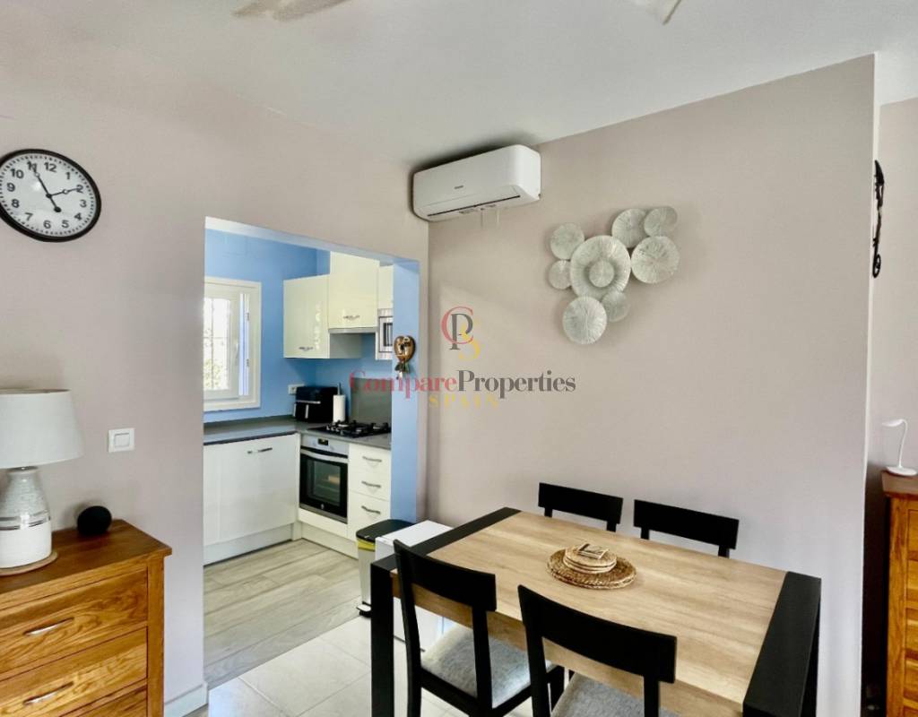 An immaculate, south-facing luxury semi-detached villa offering spectacular mountain and valley views, located on a sought-after, well-maintained urbanisation. Recently reformed, the home features a bright glass-curtained naya with high wood-beamed ceilings, a spacious open-plan lounge and dining area with pellet stove, air conditioning, and ceiling fans, plus a fully fitted luxury kitchen opening onto a private al fresco dining terrace with wood pergola, feature dry-stone walls – perfect for entertaining. The villa includes two double bedrooms with fitted wardrobes, air conditioning, ceiling fans, and a stylish walk-in shower room. Additional highlights include new double-glazed windows, energy-efficient solar hot water, an underbuild storage room, a secure low-maintenance south-facing garden, and off-street parking. There is fibre internet on the urbanisation. Residents enjoy access to a beautifully maintained communal pool with facilities, and the property is within walking distance of a popular restaurant, just minutes from Orba, Jalon, and Murla, and a short drive to Denia’s beaches, Javea, Moraira, and Calpe. This easy-access home must be viewed to appreciate its many special features and stunning views across the Jalon Valley.