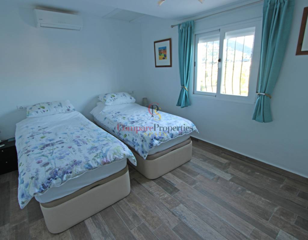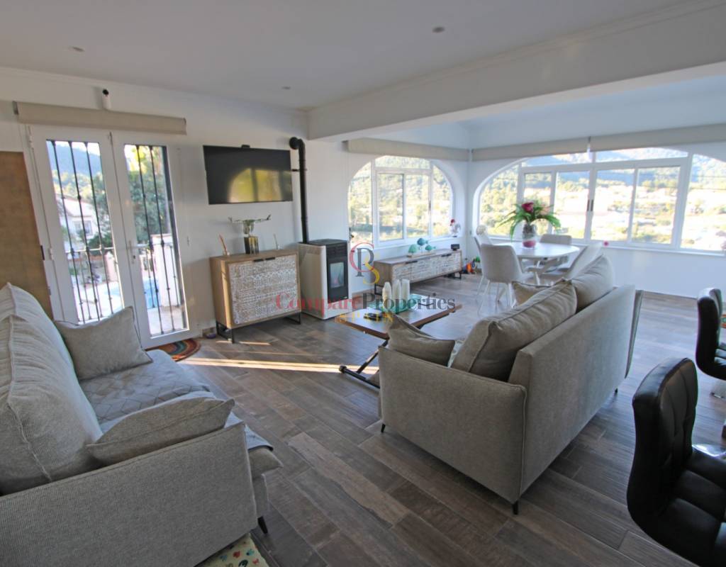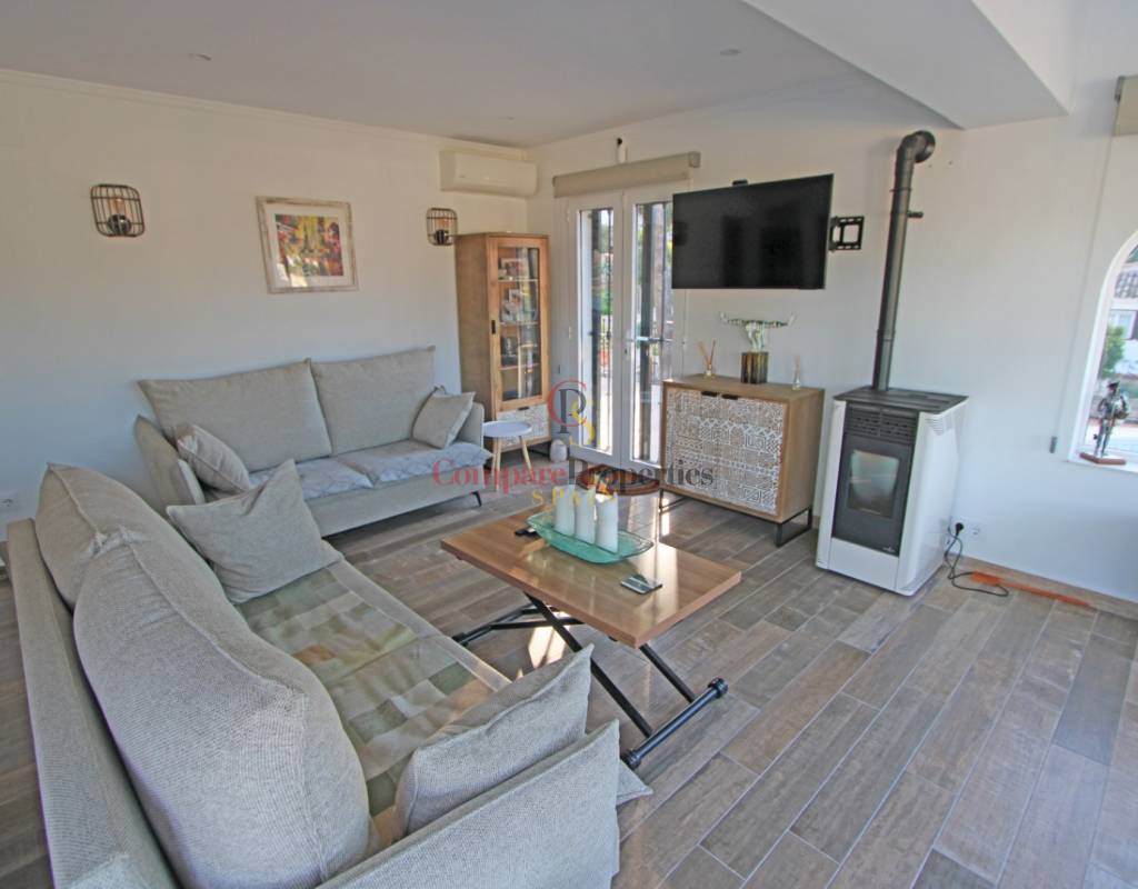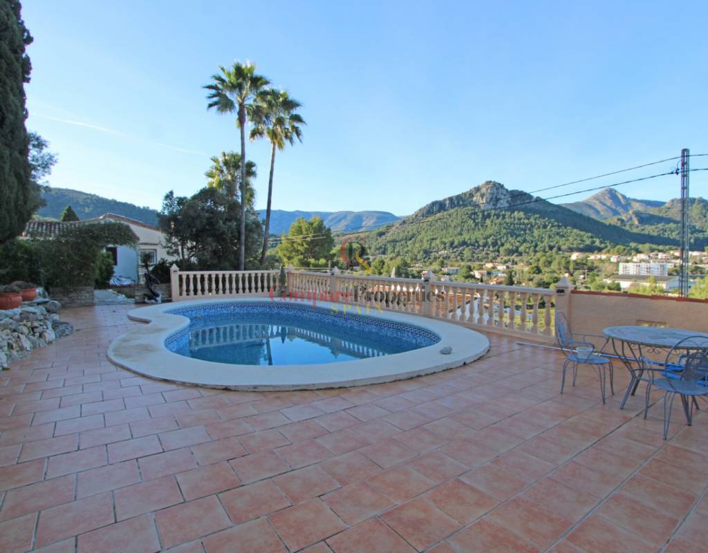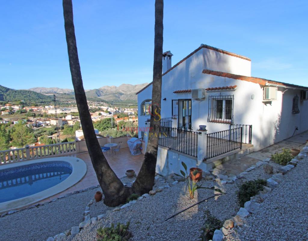 Villa with pool for sale in Orba (Costa Blanca). It consists of two floors with the following layout: The first floor is distributed into a living-dining room, an open kitchen, an open terrace, two bedrooms with built-in wardrobes and a bathroom. On the ground floor, there is an apartment with a living-dining room, an independent kitchen, a bedroom and a bathroom. Additionally, it features air conditioning, a pellet fireplace, TV/Sat, double glazing, a laundry room, an alarm system and an 8 x 4 m pool. The property is located very close to all services such as supermarkets and restaurants. The nearest beaches are 15 minutes away. The largest shopping center in the area is in Ondara, about 10 minutes by car, as well as the highway to Valencia (1h) and Alicante (1h).