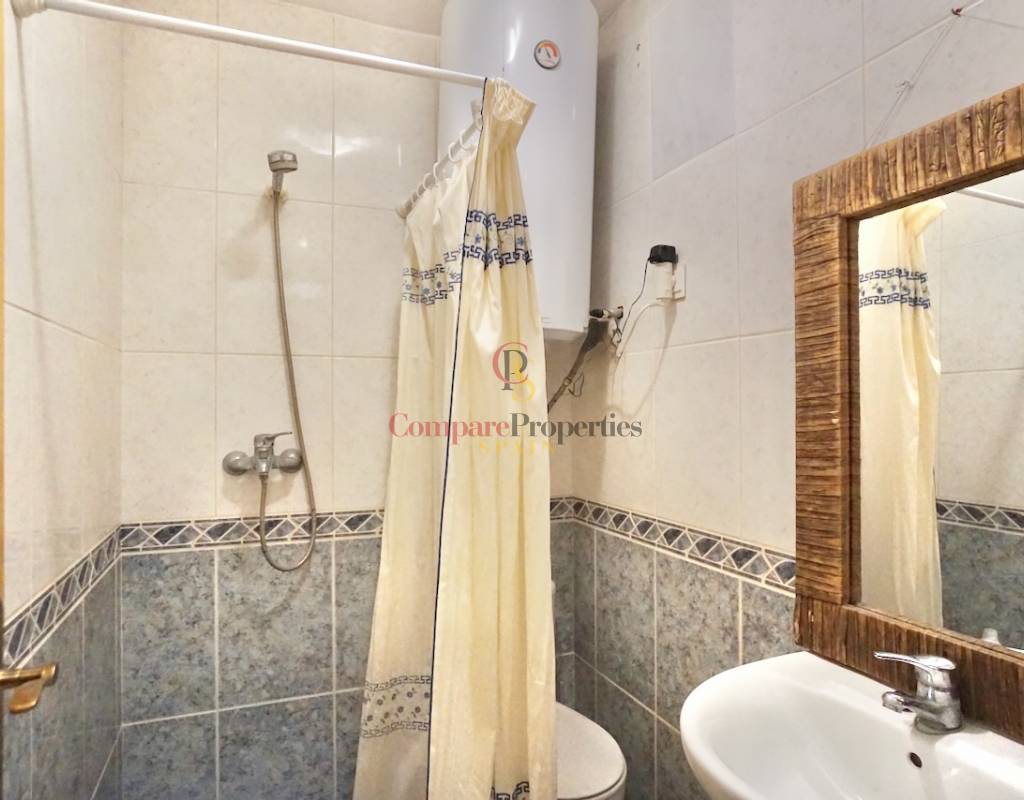 From the living area, a staircase leads to the lower level, where you will find two comfortable bedrooms. One bedroom features opening doors with direct access to the communal terrace, allowing you to step outside and enjoy the outdoor space and nearby communal swimming pool. The second bedroom is fitted with a built-in wardrobe.